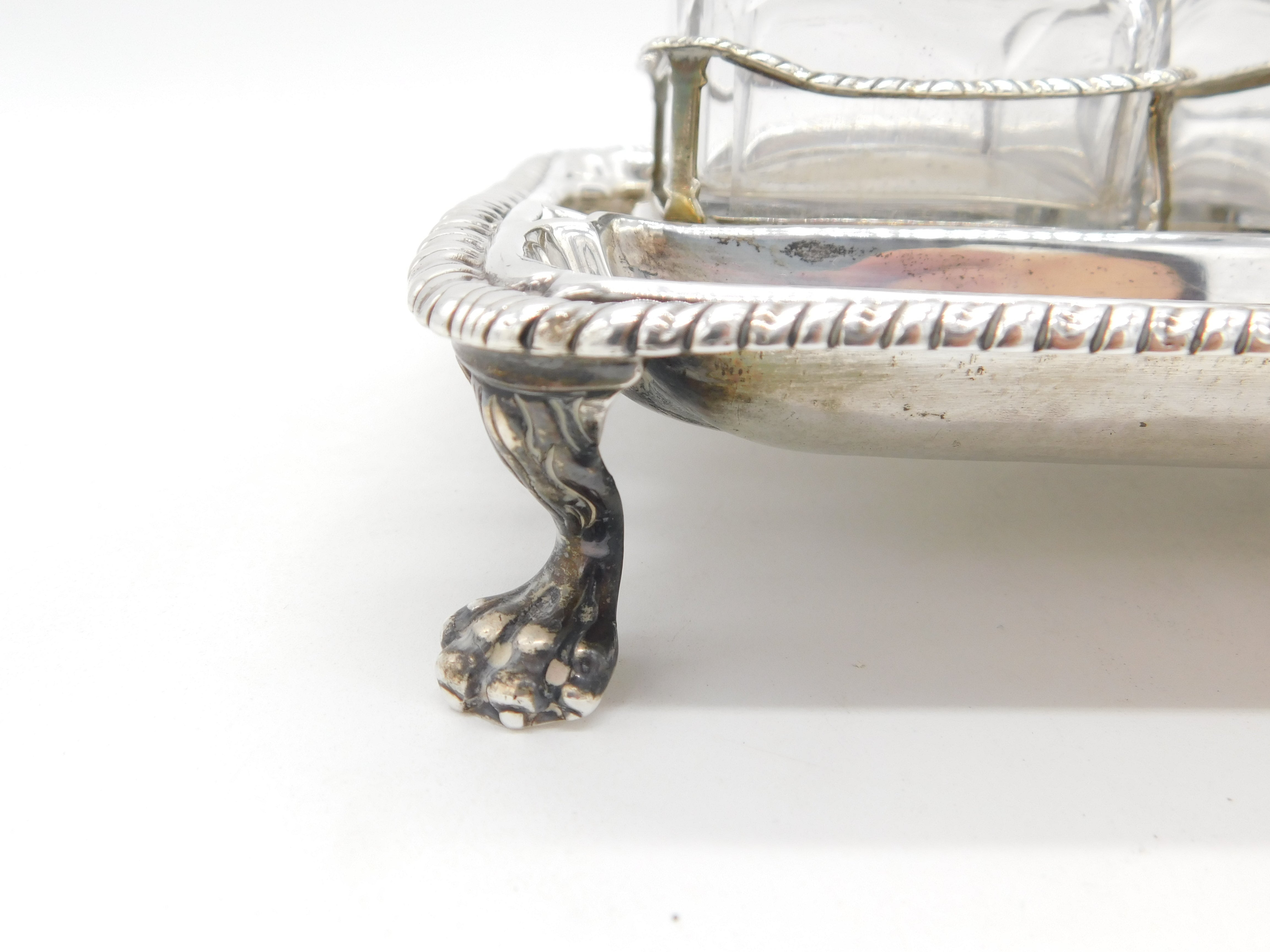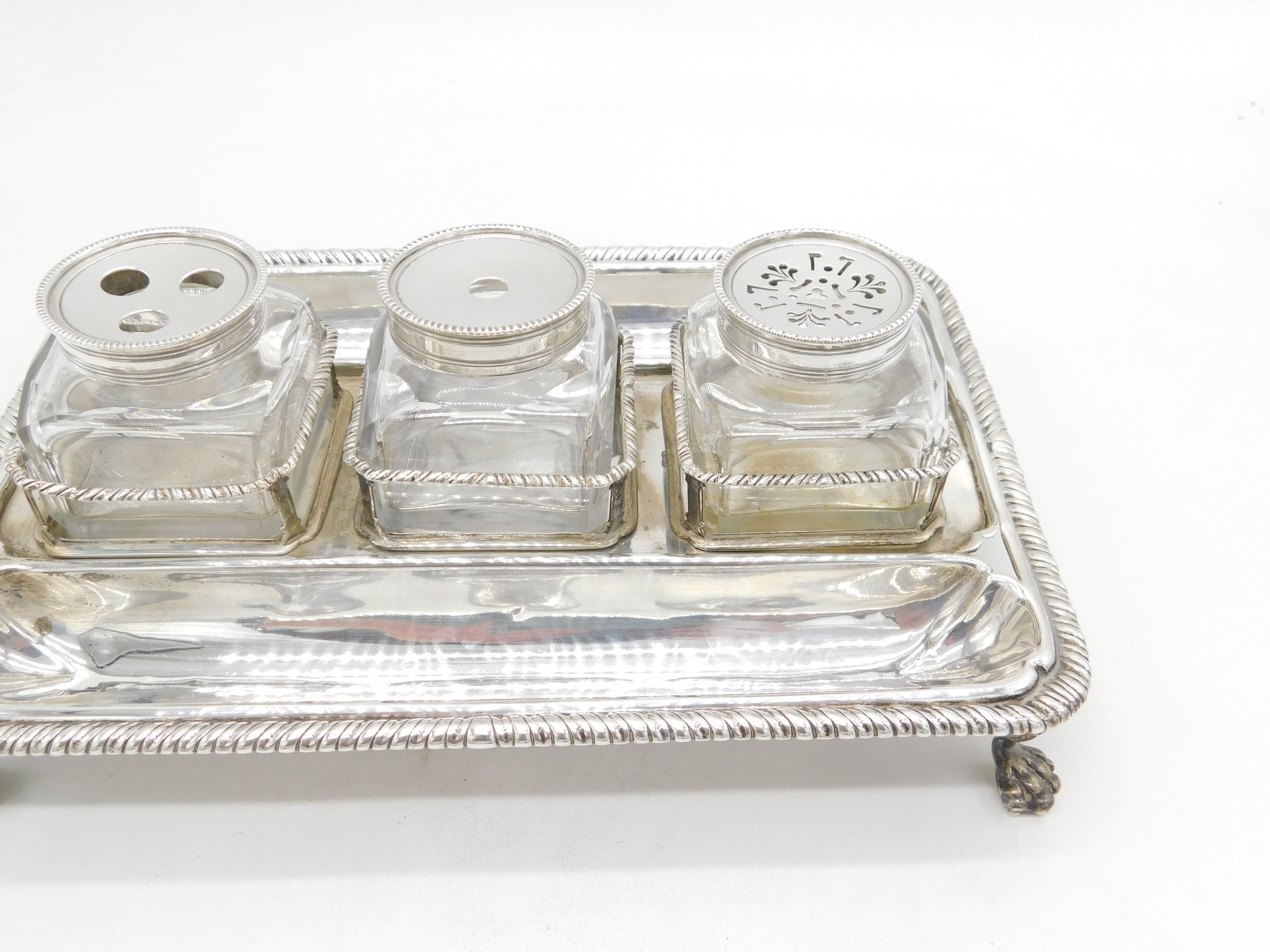 Details: A fantastic and wonderfully designed antique early-Georgian sterling silver three-piece ornate desk stand set on regal claw feet with scrolled decoration throughout, included with the three original moulded glass ink pots each with sterling silver lids and mounts, hallmarked to the base London 1767 by Edward Aldridge II. This is a wonderful item that would make a perfect gift or addition to any collection.