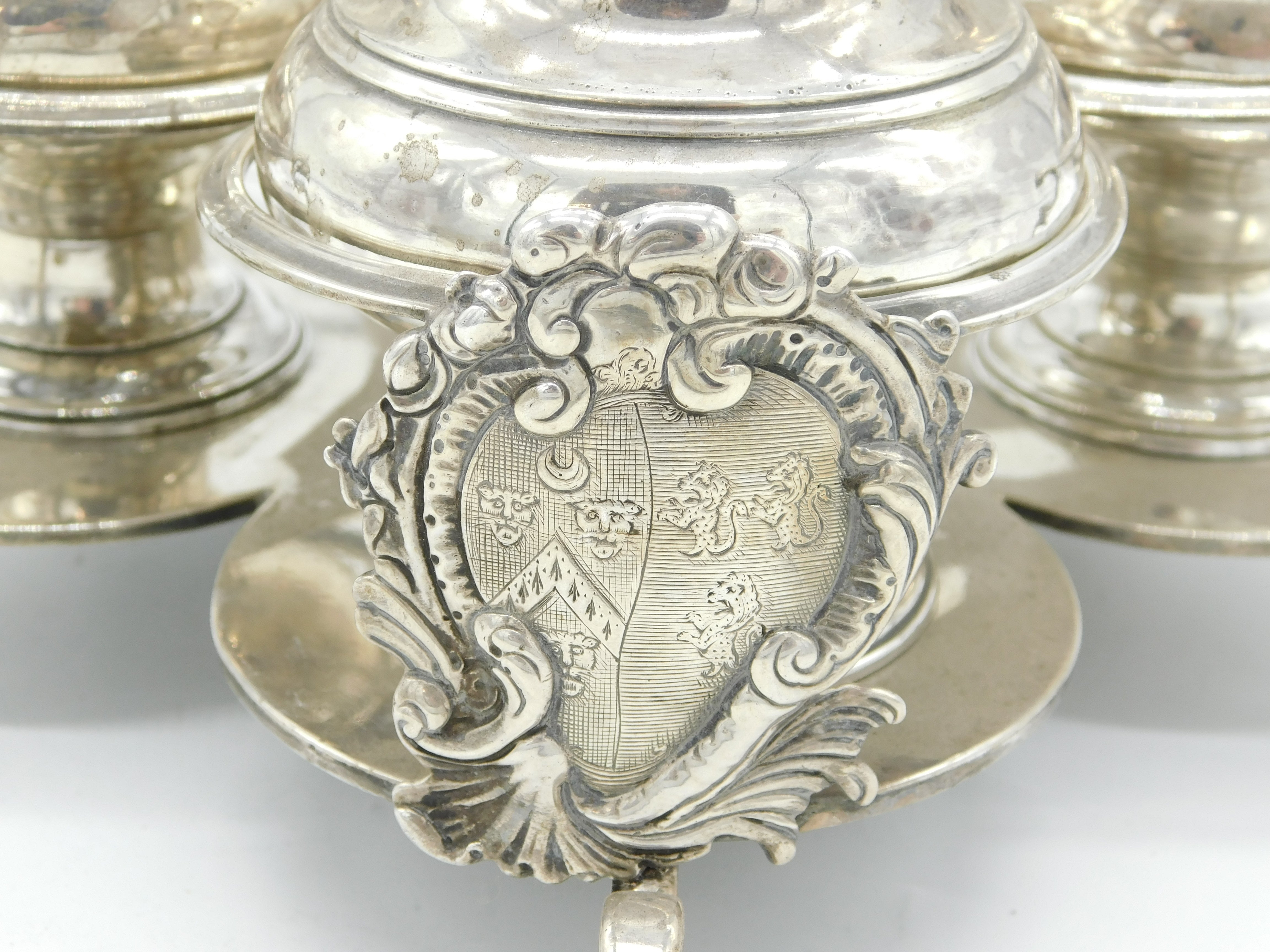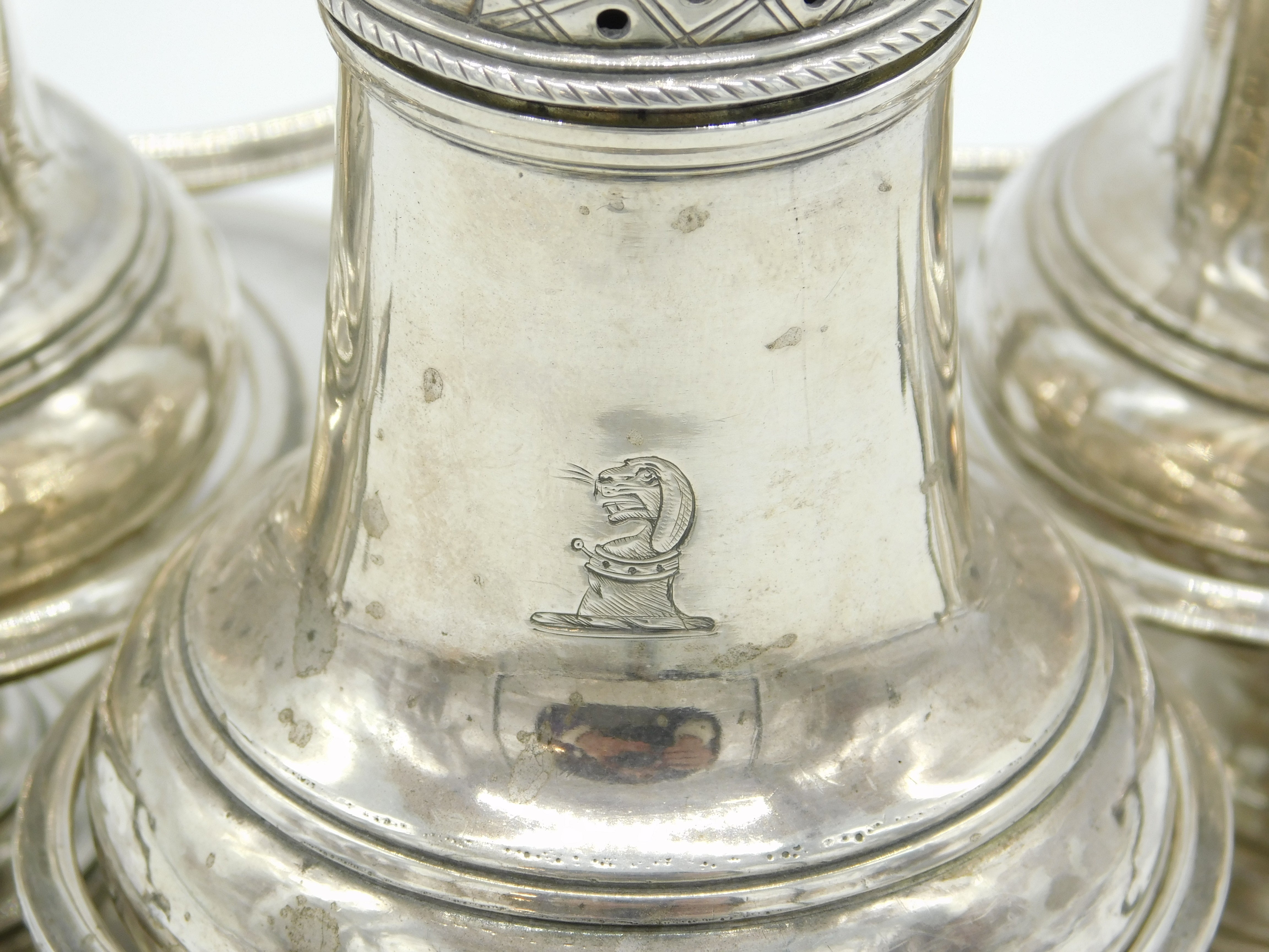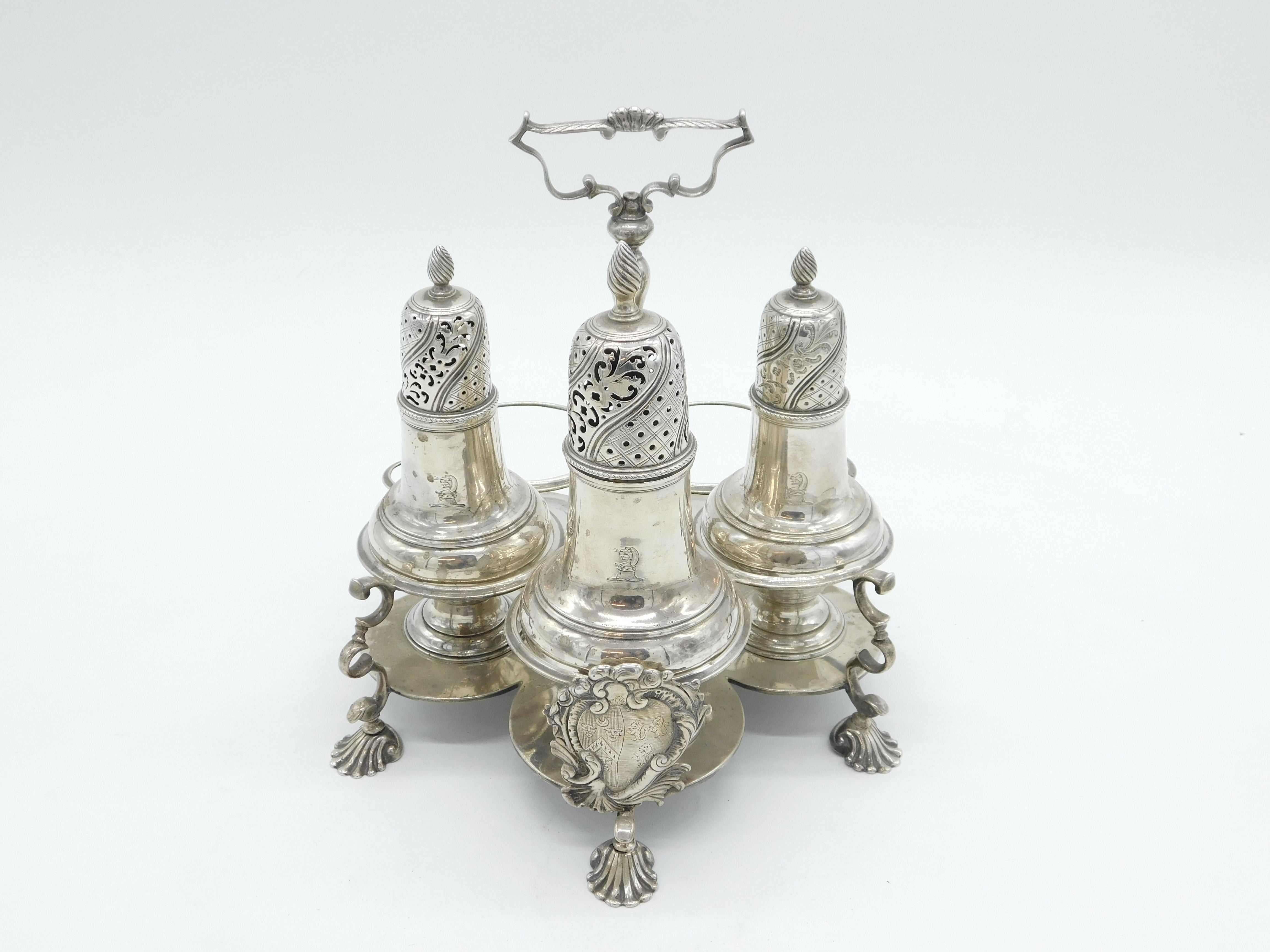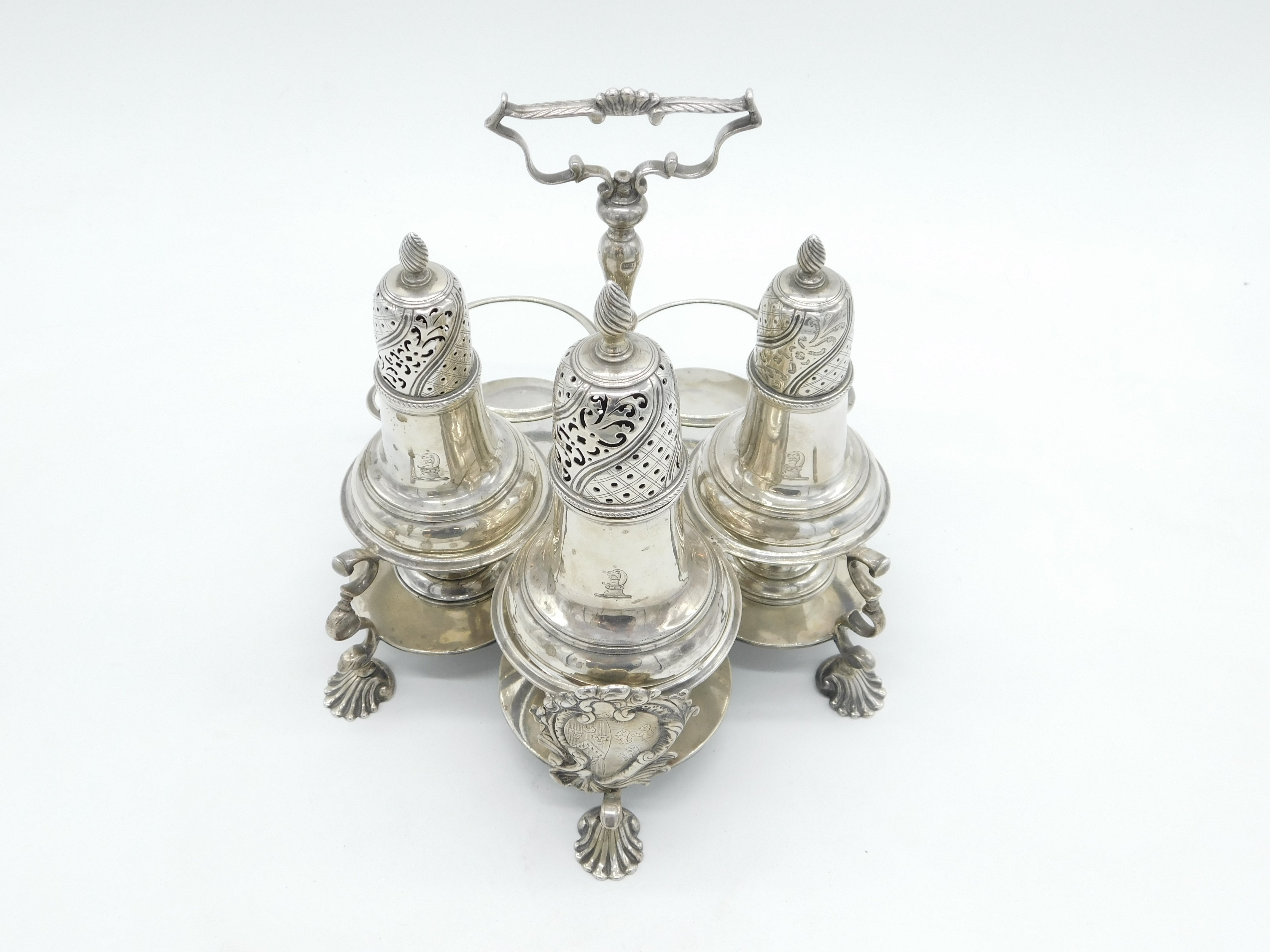 Details: A fantastic and wonderfully designed antique early georgian large sterling silver 'warwick' cruet set to include three muffinneers or pepperettes all hallmarked London 1767 by William Tuite and engraved with charming dog heraldic crests, superb heraldic crest to the central stand cartouche, nice clear hallmarks to the front. This stand has Rococo influences with the asymmetric scroll cartouche and four shell shaped feet. The central handle can be unscrewed for easier cleaning if necessary. The three silver casters are in the standard baluster form for the period and each one has a really hefty weight in the hand. This is a wonderful item that would make a perfect gift or addition to any collection. The BOX pictured is for PRESENTATION ONLY and is NOT included in the listings but used to frame the pictures unless specifically stated otherwise.
