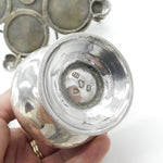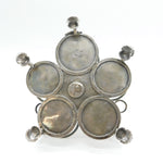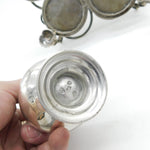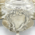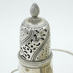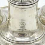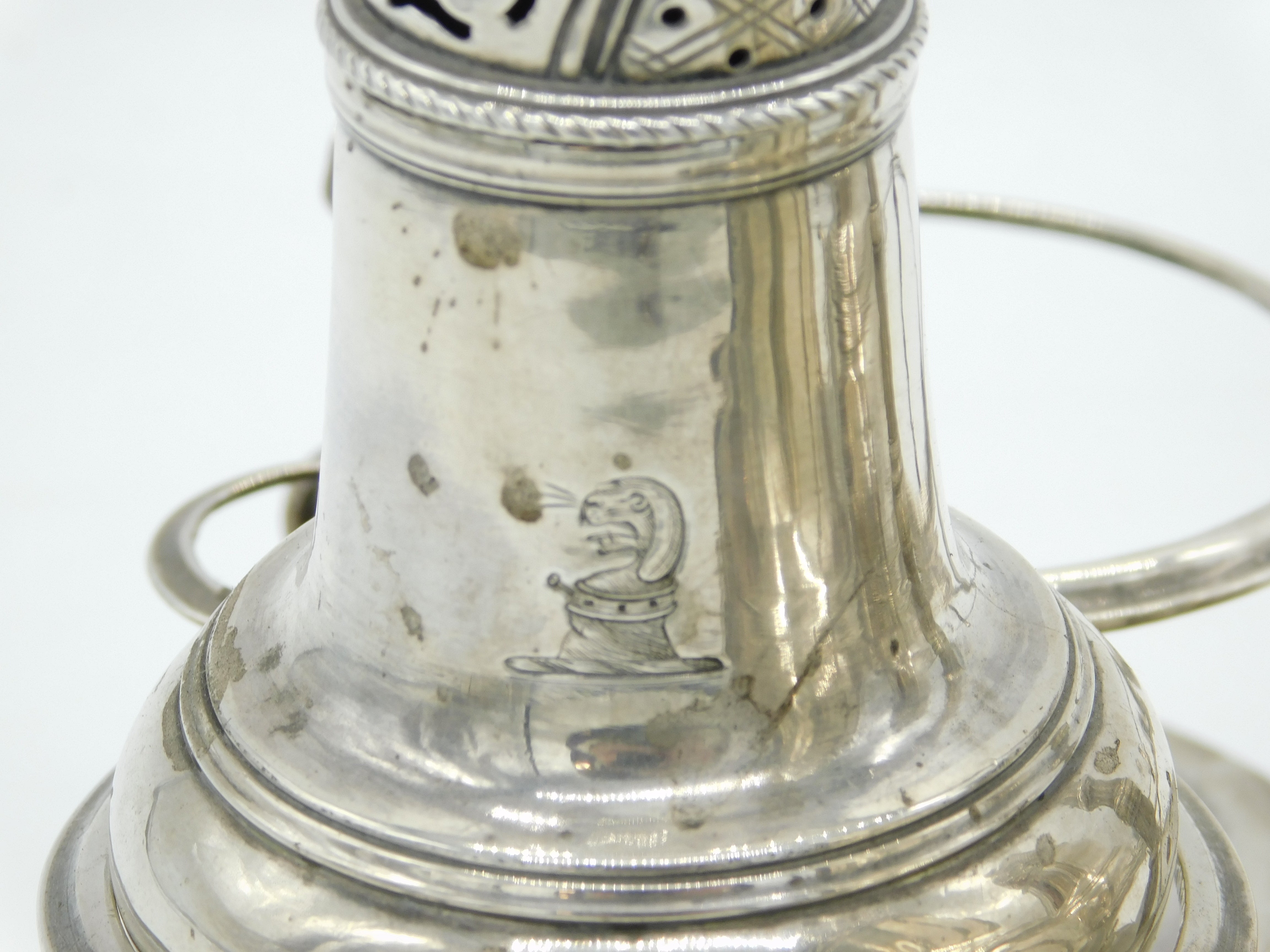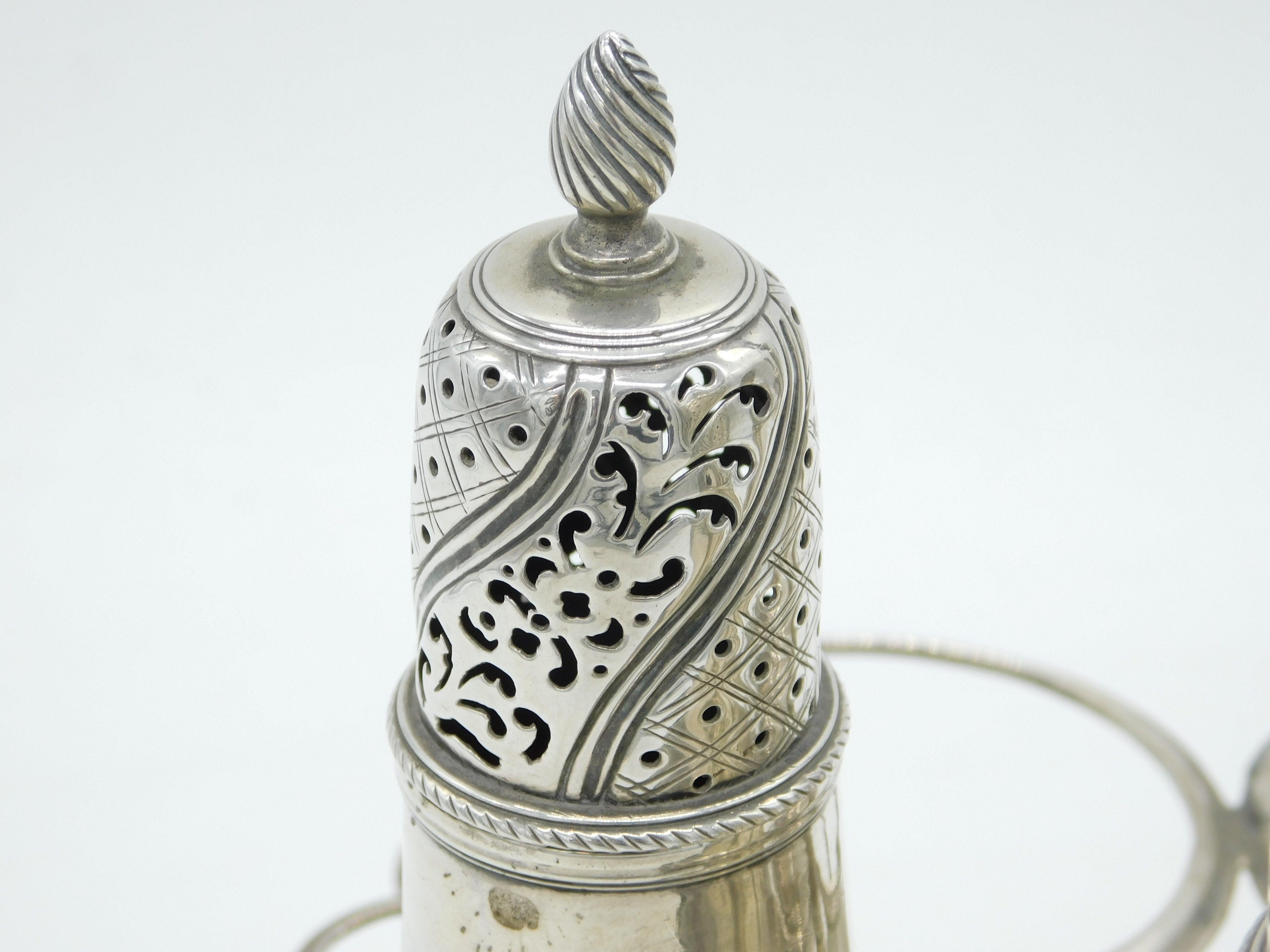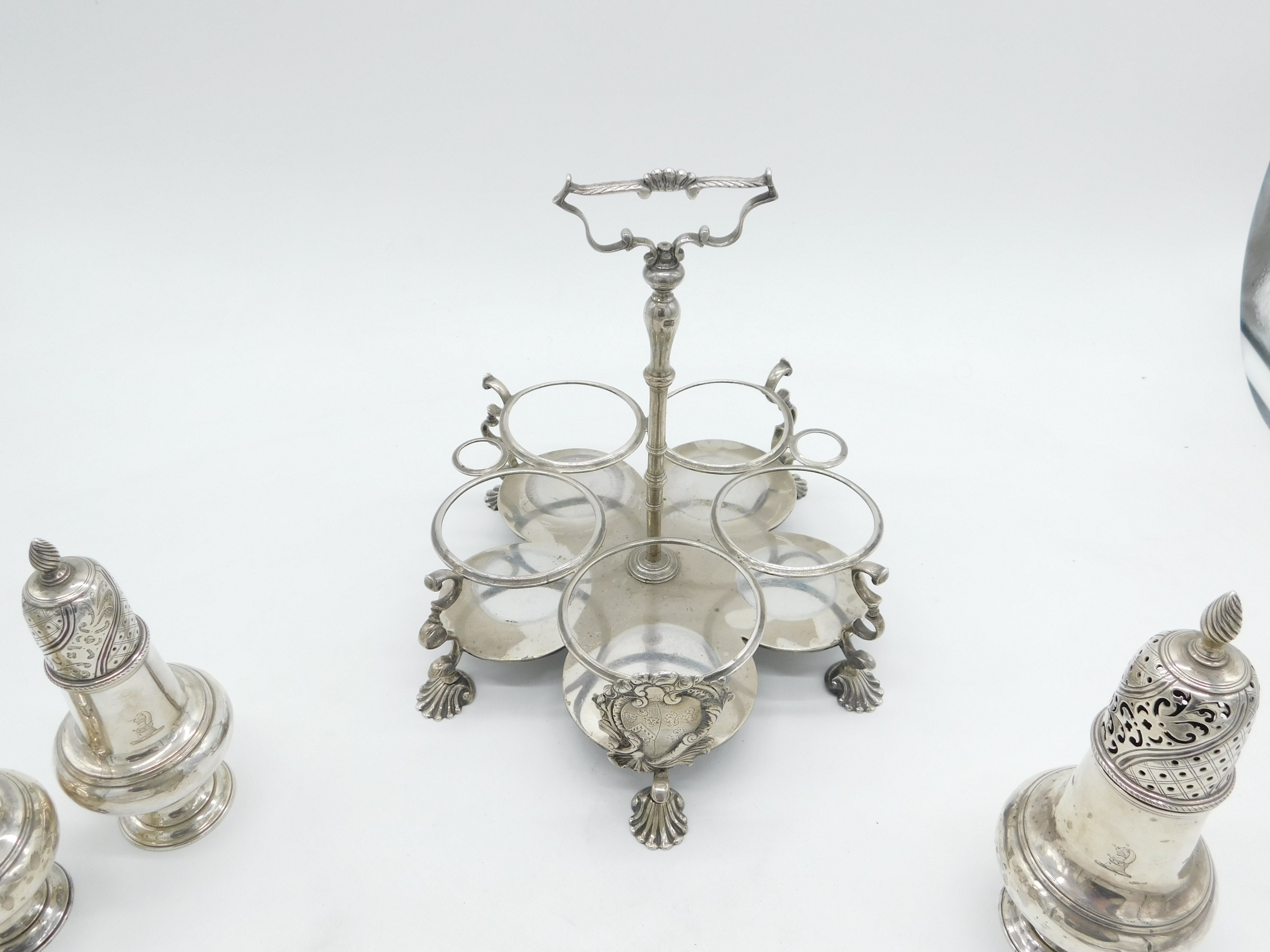 Details: A fantastic and wonderfully designed antique early georgian large sterling silver 'warwick' cruet set to include three muffinneers or pepperettes all hallmarked London 1767 by William Tuite and engraved with charming dog heraldic crests, superb heraldic crest to the central stand cartouche, nice clear hallmarks to the front. This stand has Rococo influences with the asymmetric scroll cartouche and four shell shaped feet. The central handle can be unscrewed for easier cleaning if necessary. The three silver casters are in the standard baluster form for the period and each one has a really hefty weight in the hand. This is a wonderful item that would make a perfect gift or addition to any collection. The BOX pictured is for PRESENTATION ONLY and is NOT included in the listings but used to frame the pictures unless specifically stated otherwise.