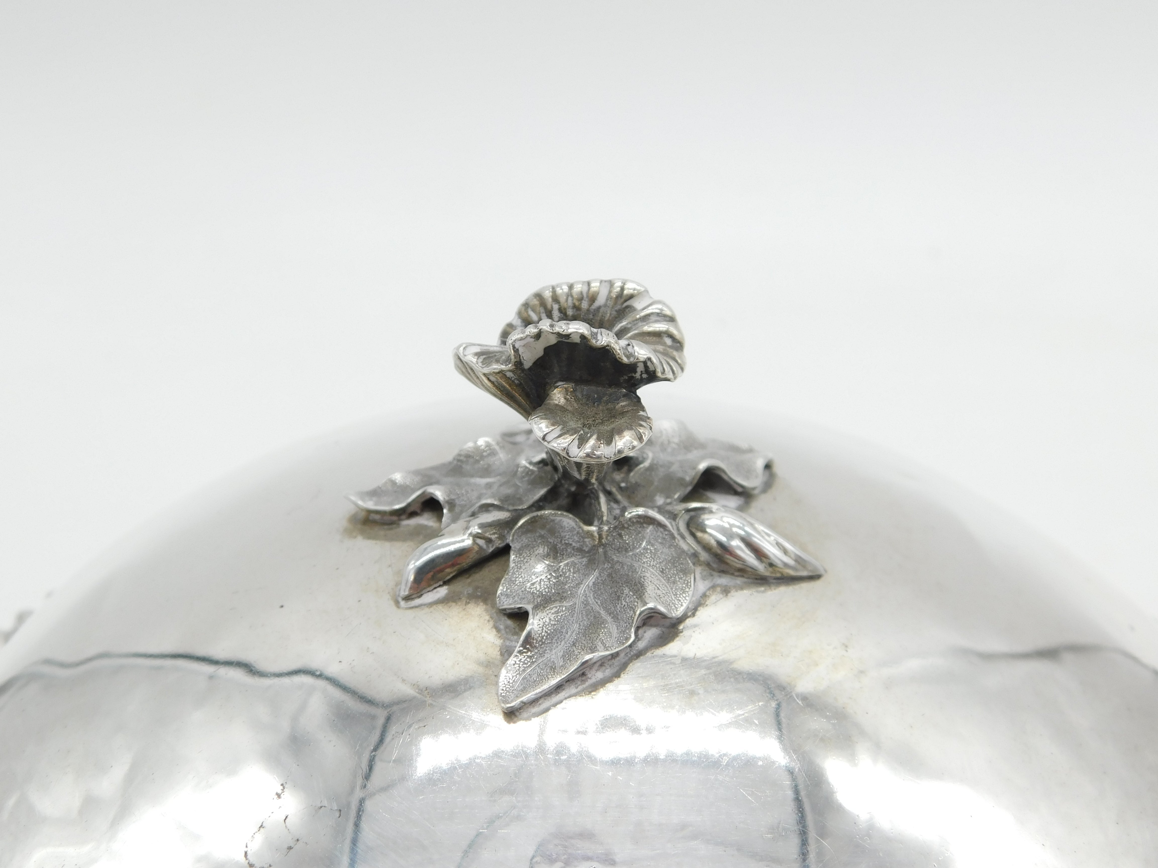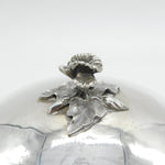 Details: A fantastic and wonderfully designed antique georgian sterling silver muffin dish and cover with charming feathered edges, floral finial, heraldic crests hallmarked London 1830 by Edward Barnard & Sons. This is a wonderful item that would make a perfect gift or addition to any collection.