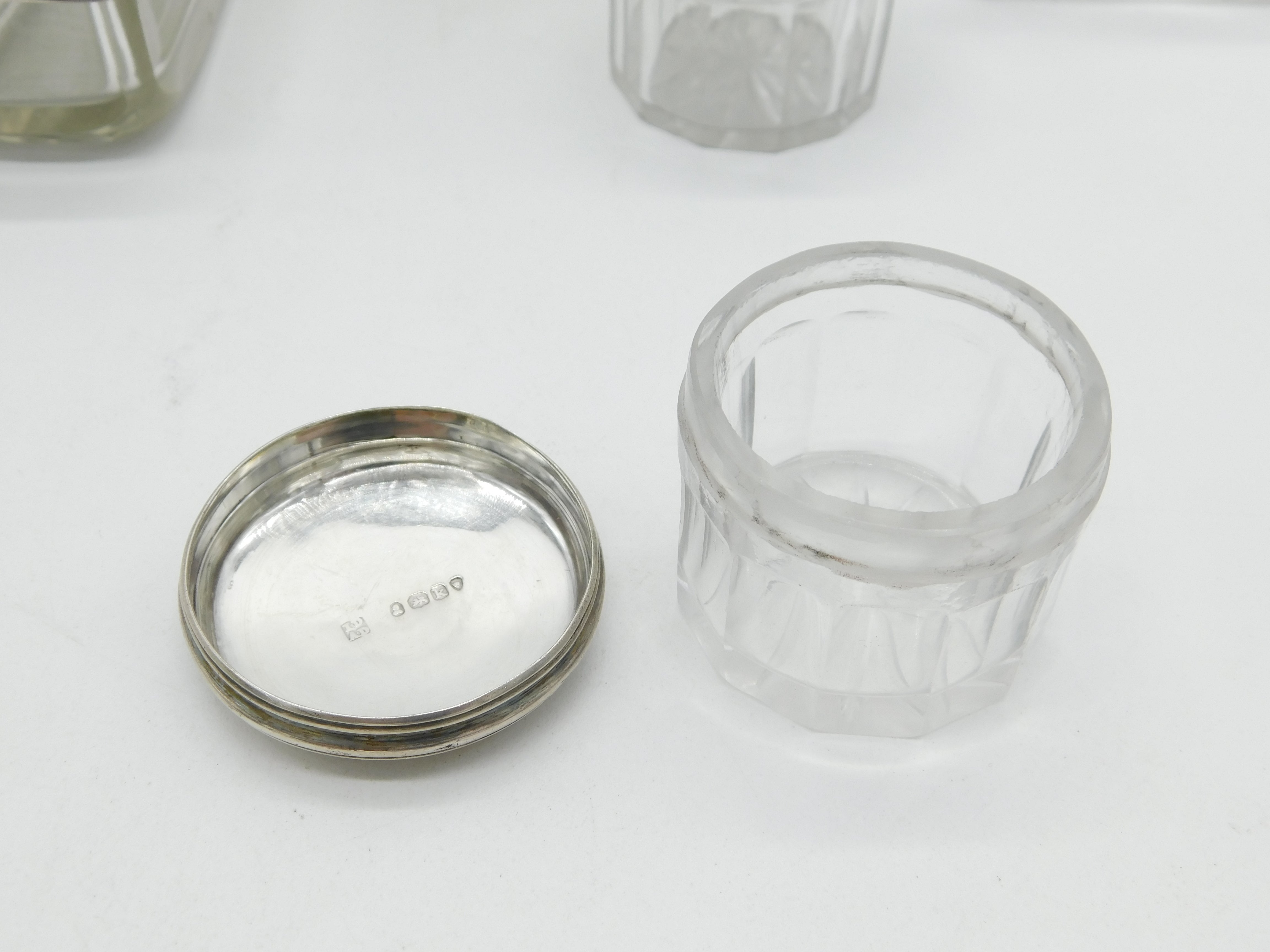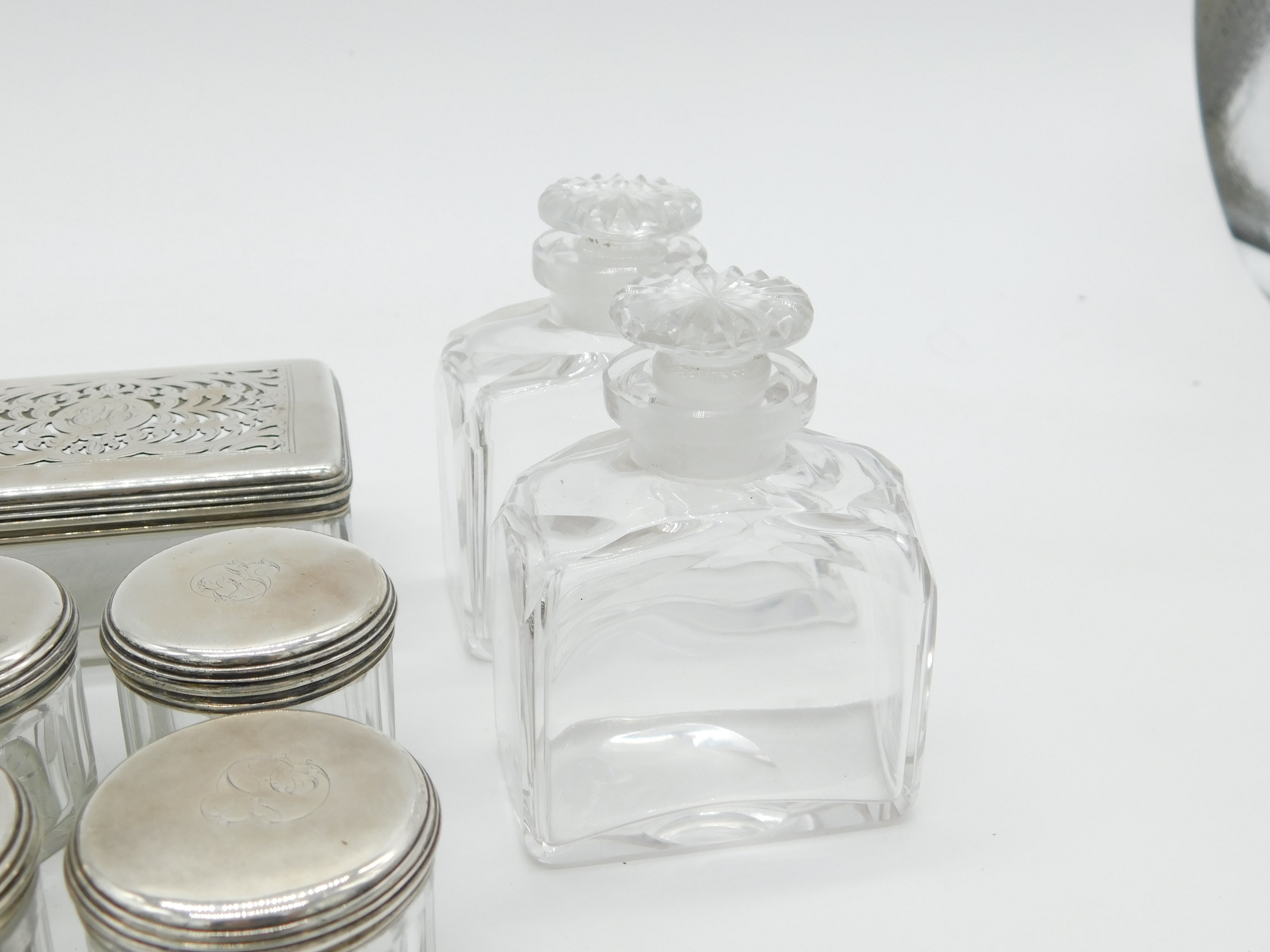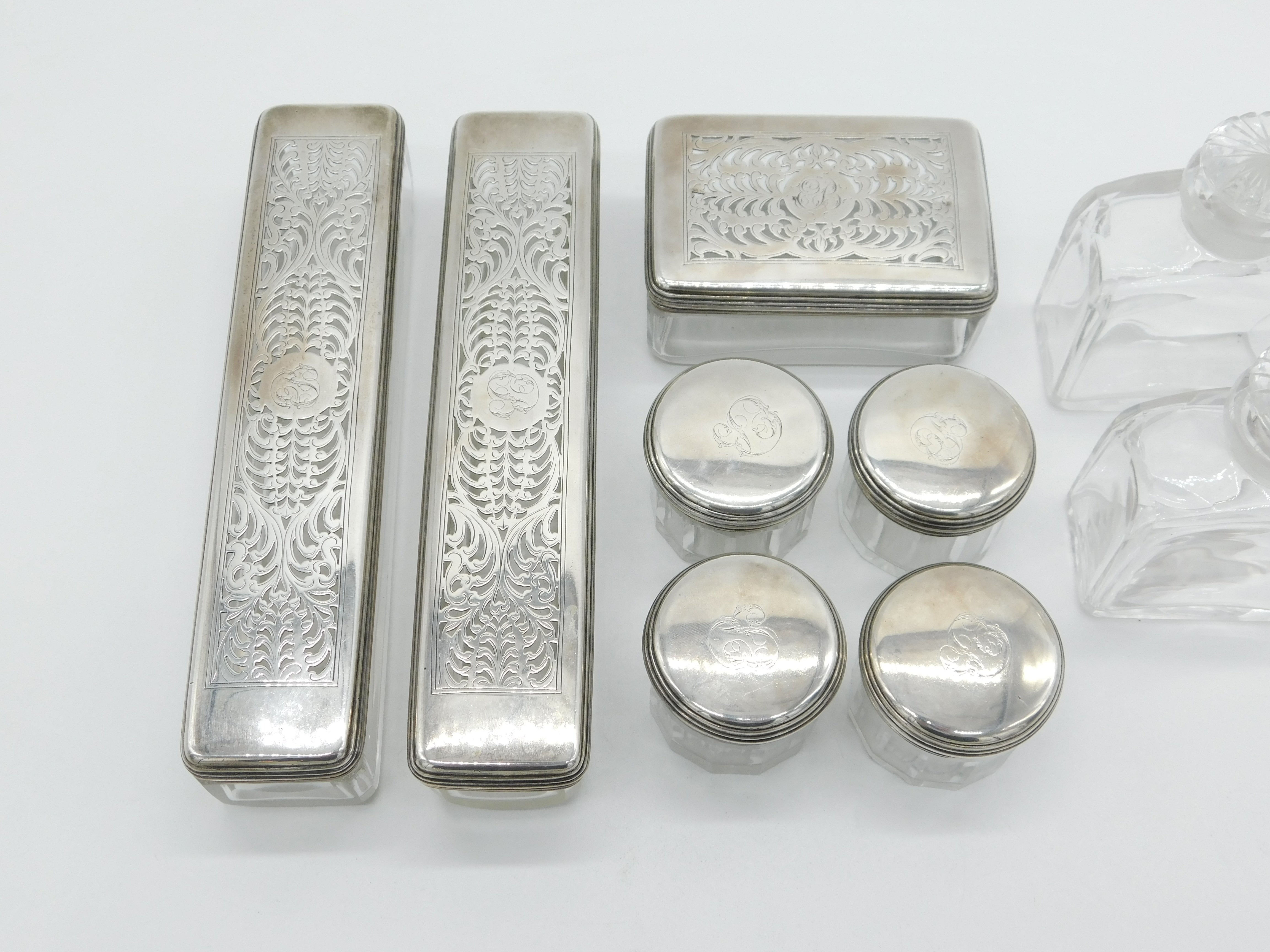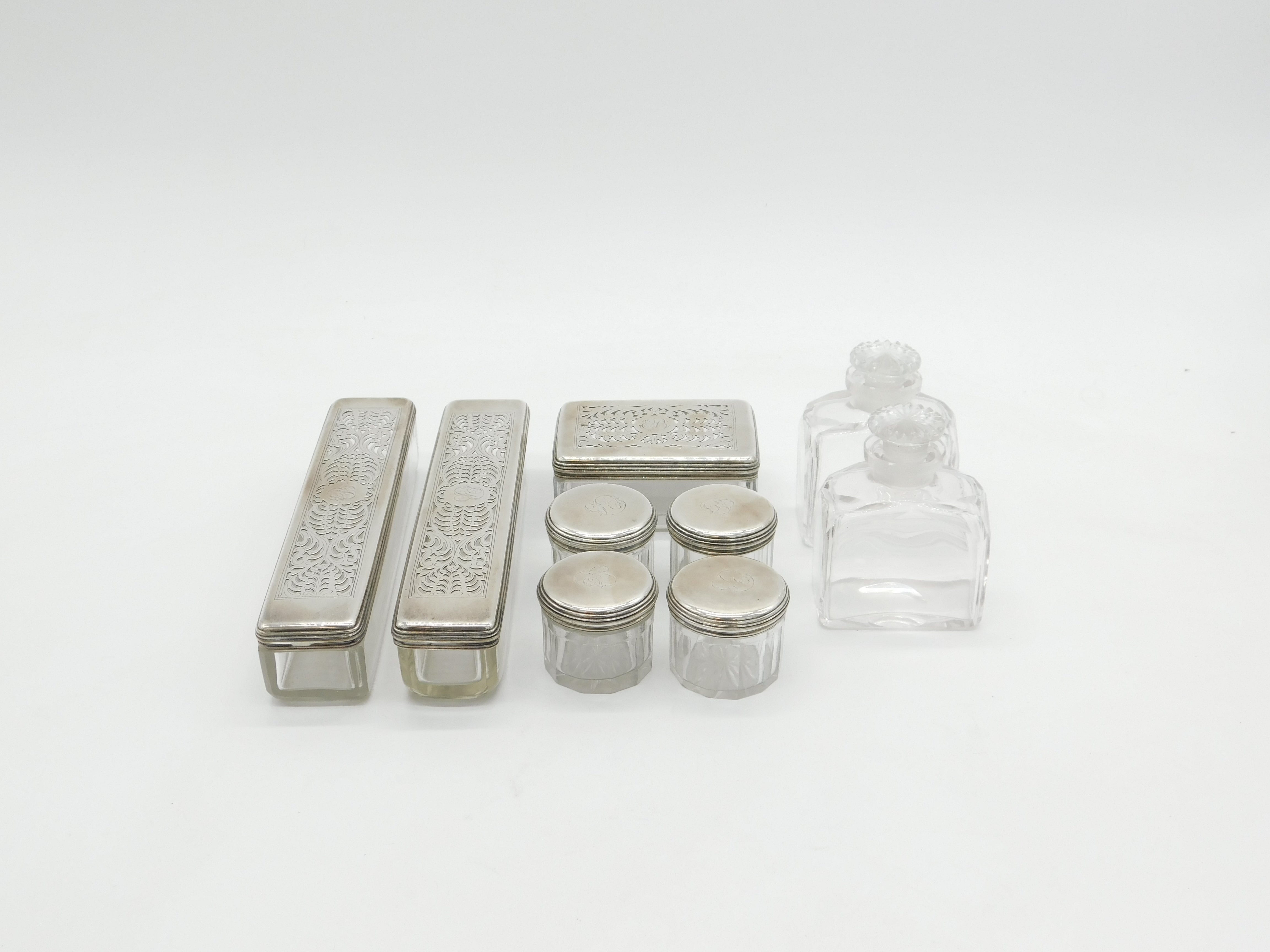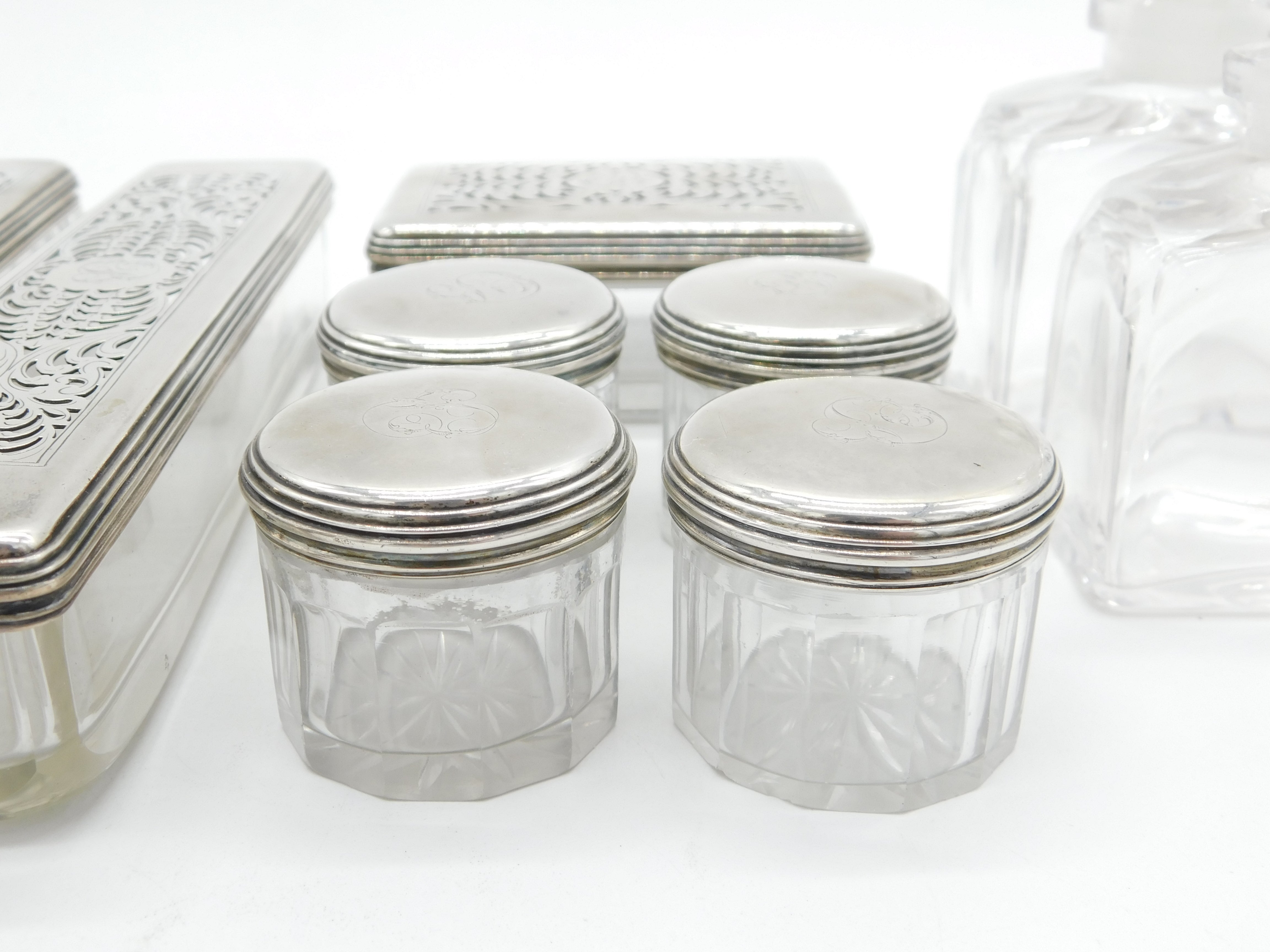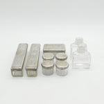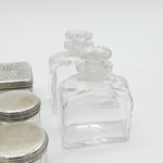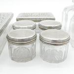 Details: A fantastic and wonderfully designed antique georgian sterling silver topped and glass set nine-part vanity set to include four circular trinket pots, two long vanity boxes, a rectangular trinket box and two cut glass perfume bottles all hallmarked London 1825 by John & Archibald Douglas. This is a wonderful item that would make a perfect gift or addition to any collection.