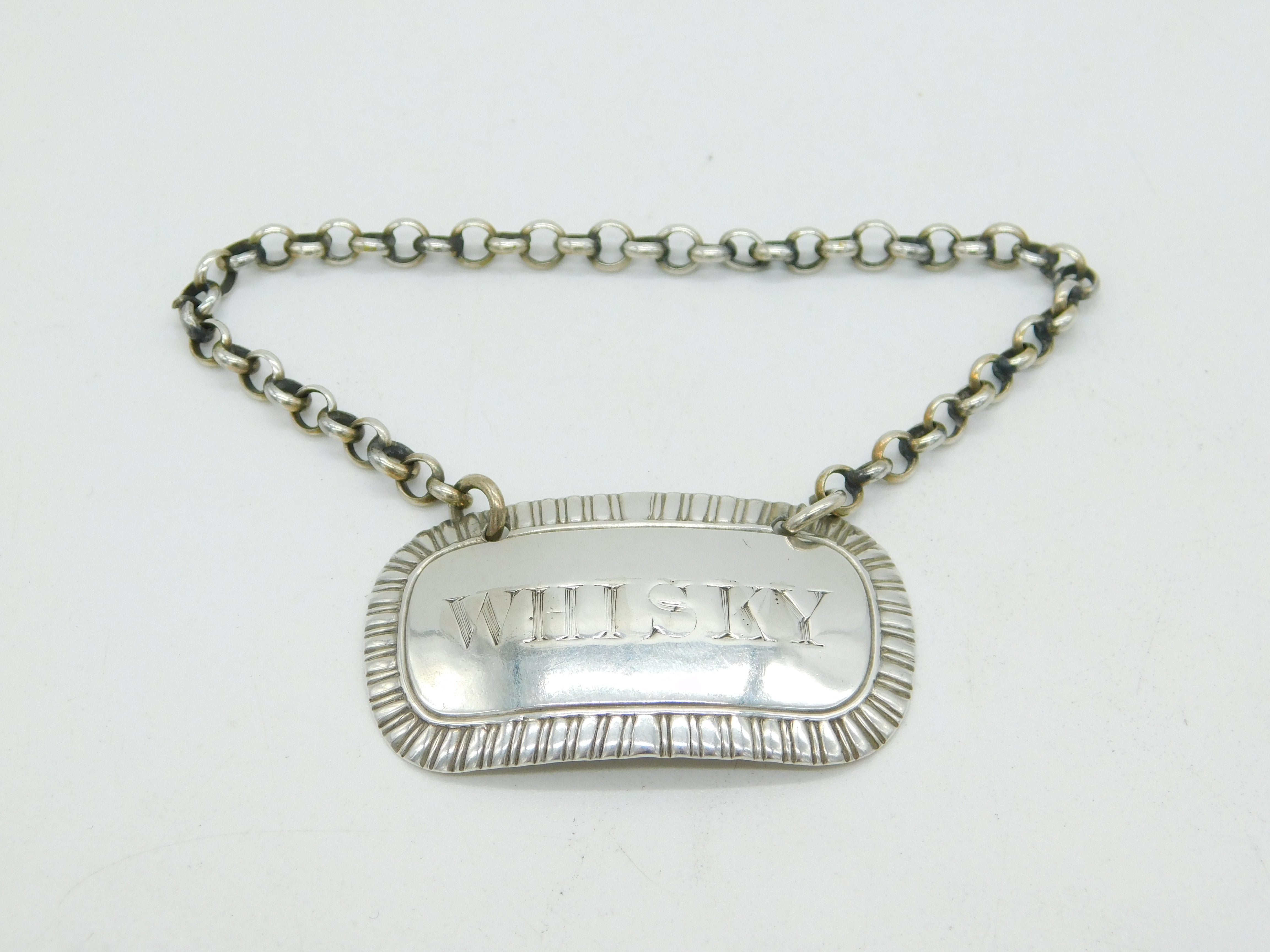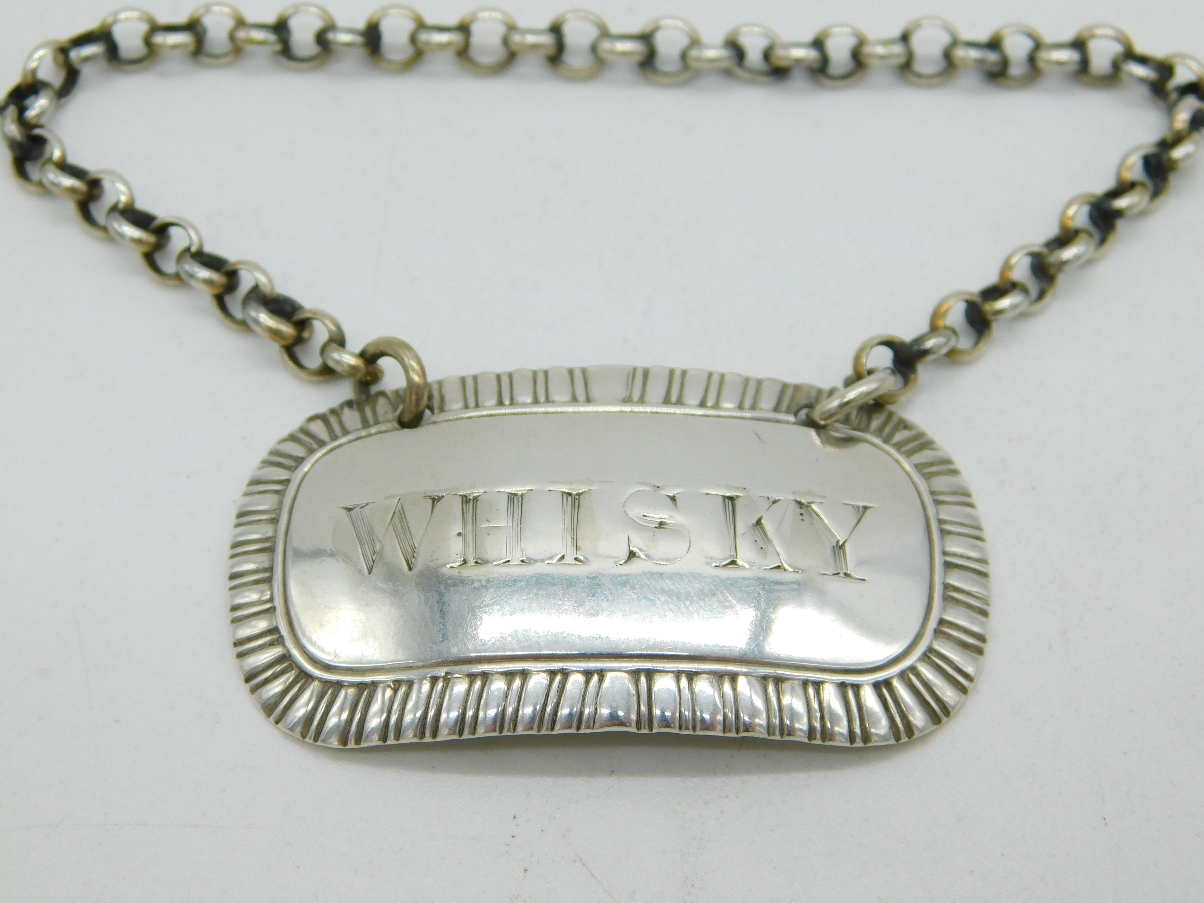 George IV Sterling Silver Lined Pattern Whisky Decanter Label Antique 1823 London