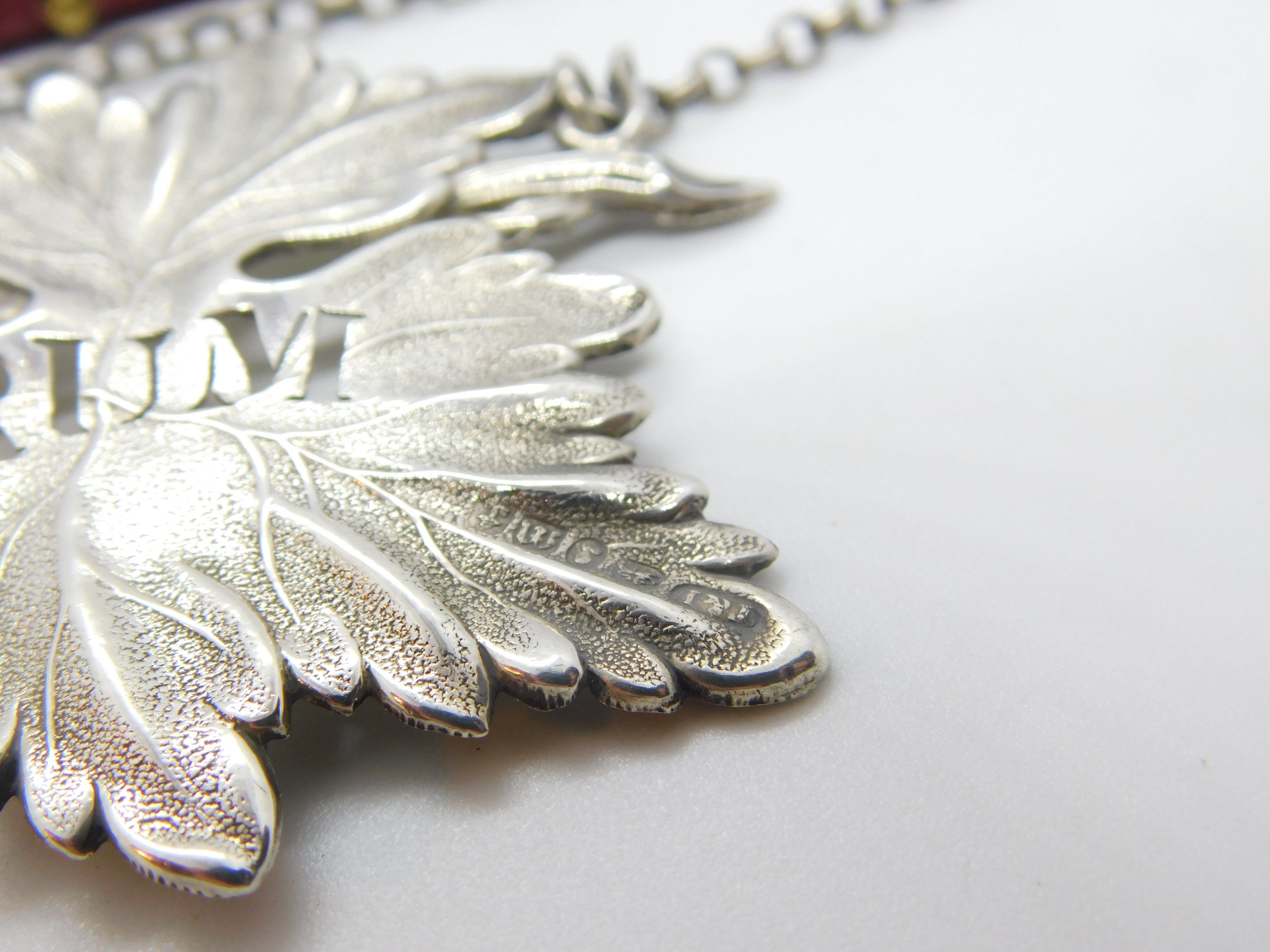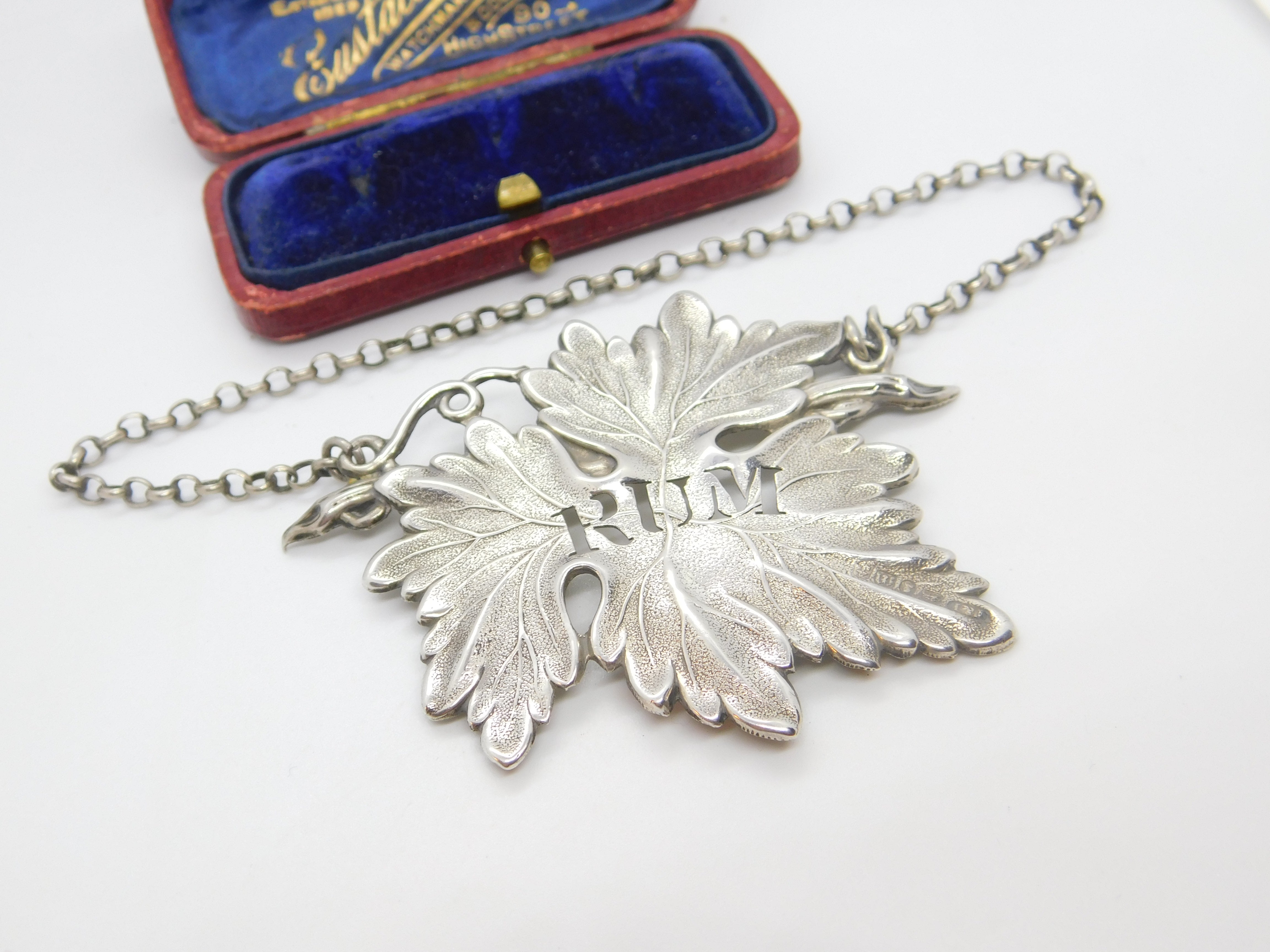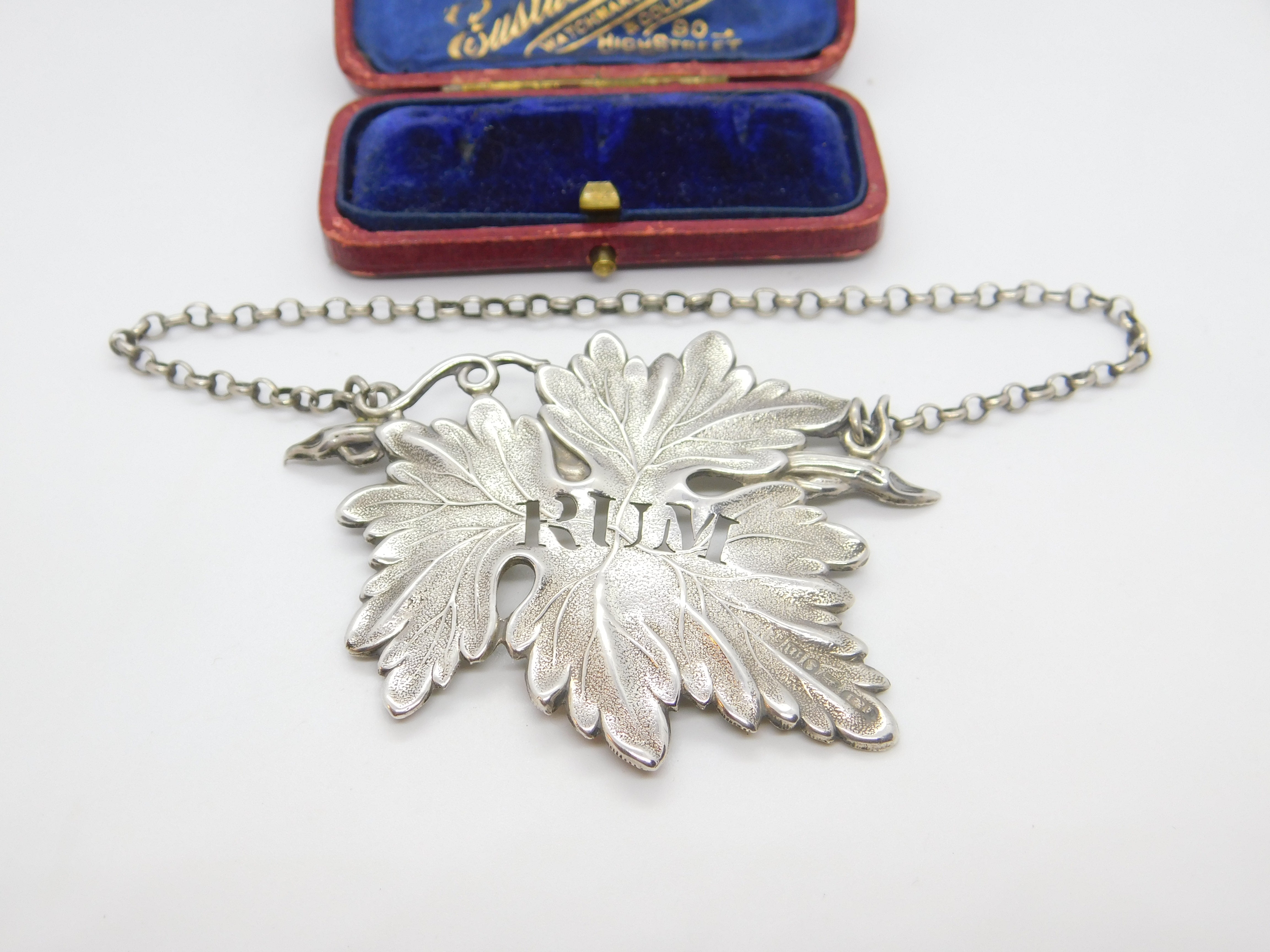 Details: A fantastic and wonderfully designed antique Georgian sterling silver leaf form Rum decanter or bottle label with lovely detail hallmarked Birmingham 1835 by Taylor & Perry. This is a wonderful item that would make a perfect gift or addition to any collection. The BOX pictured is for PRESENTATION ONLY and is NOT included in the listings but used to frame the pictures unless specifically stated otherwise.