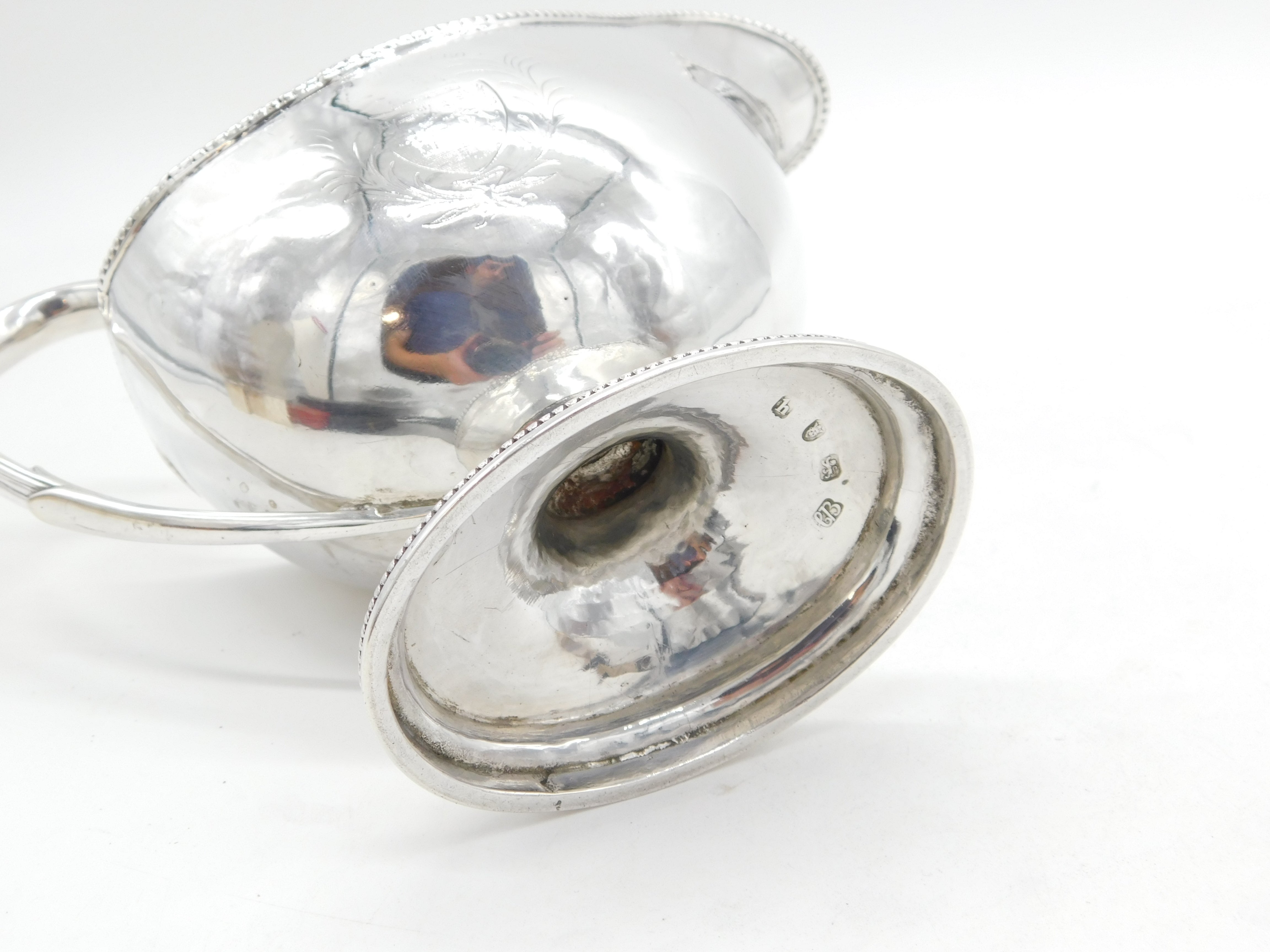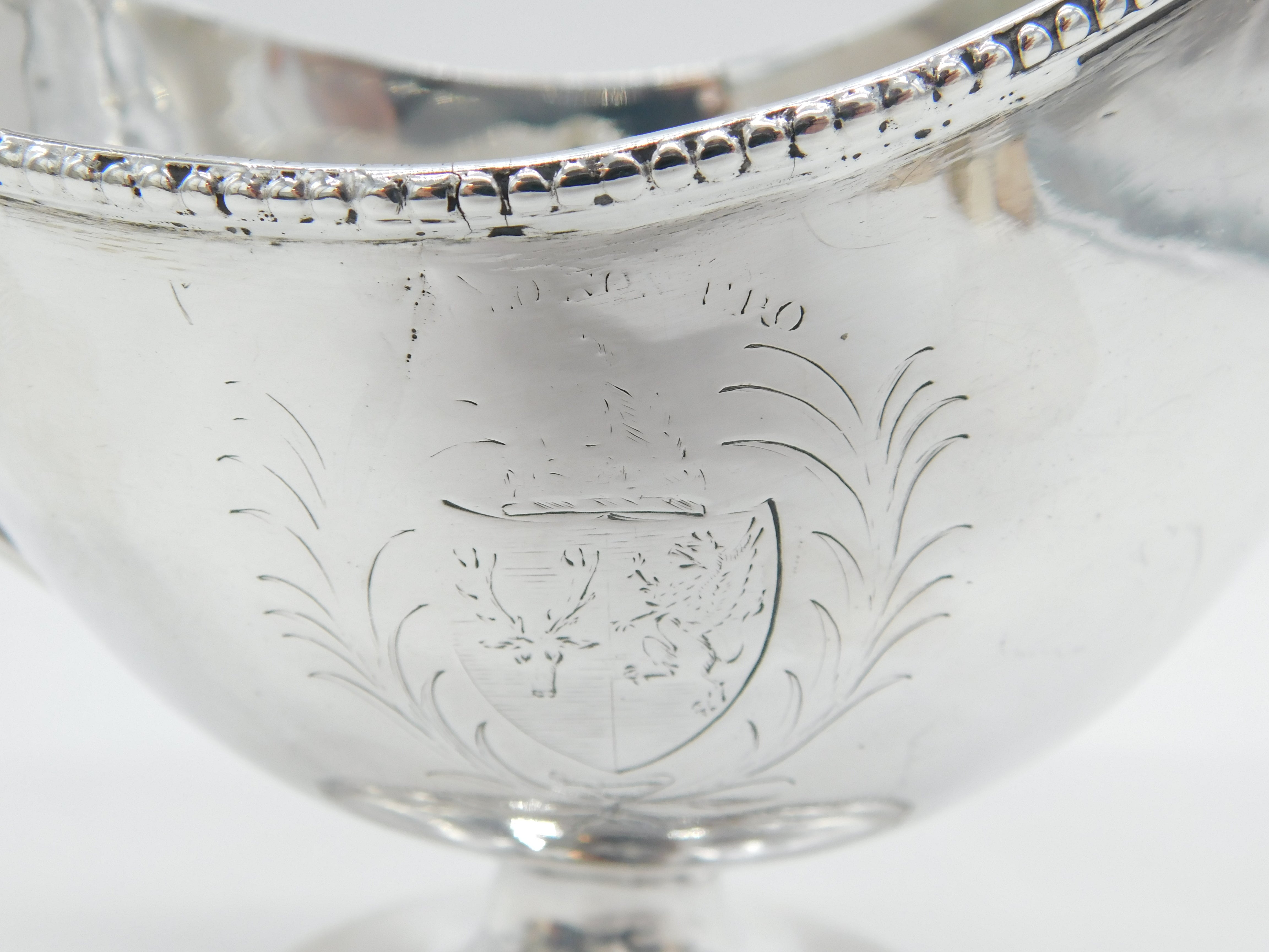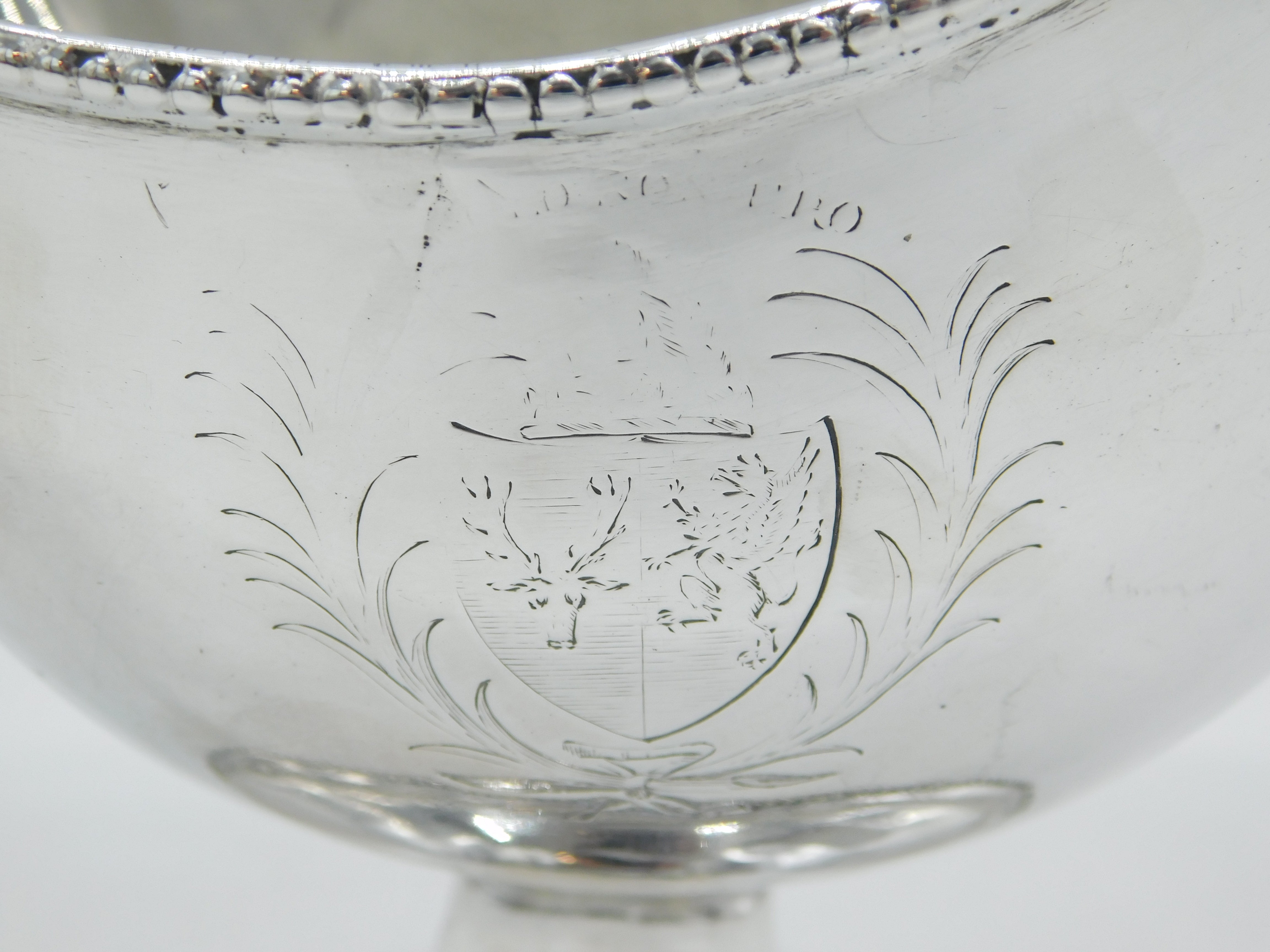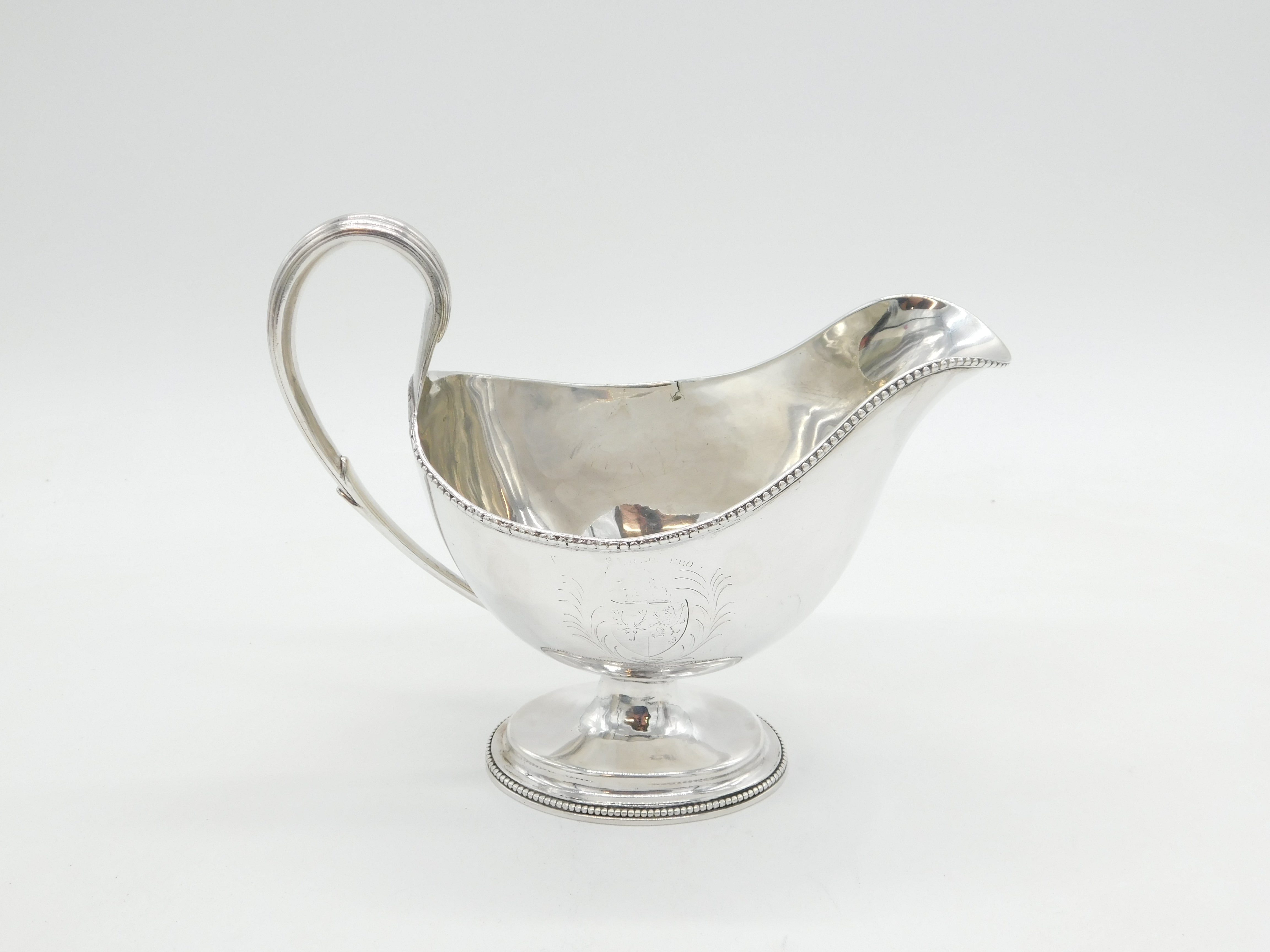 Details: A fantastic and wonderfully designed antique georgian large sterling silver pedestal cream jug with charming heraldic crest to the front edge, lovely scrolled handled and beaded rim, hallmarked London 1783 by prestigious silversmith Hester Bateman. Repair to where the handle meets the main body, small split in the silver to the reverse edge. This is a wonderful item that would make a perfect gift or addition to any collection.