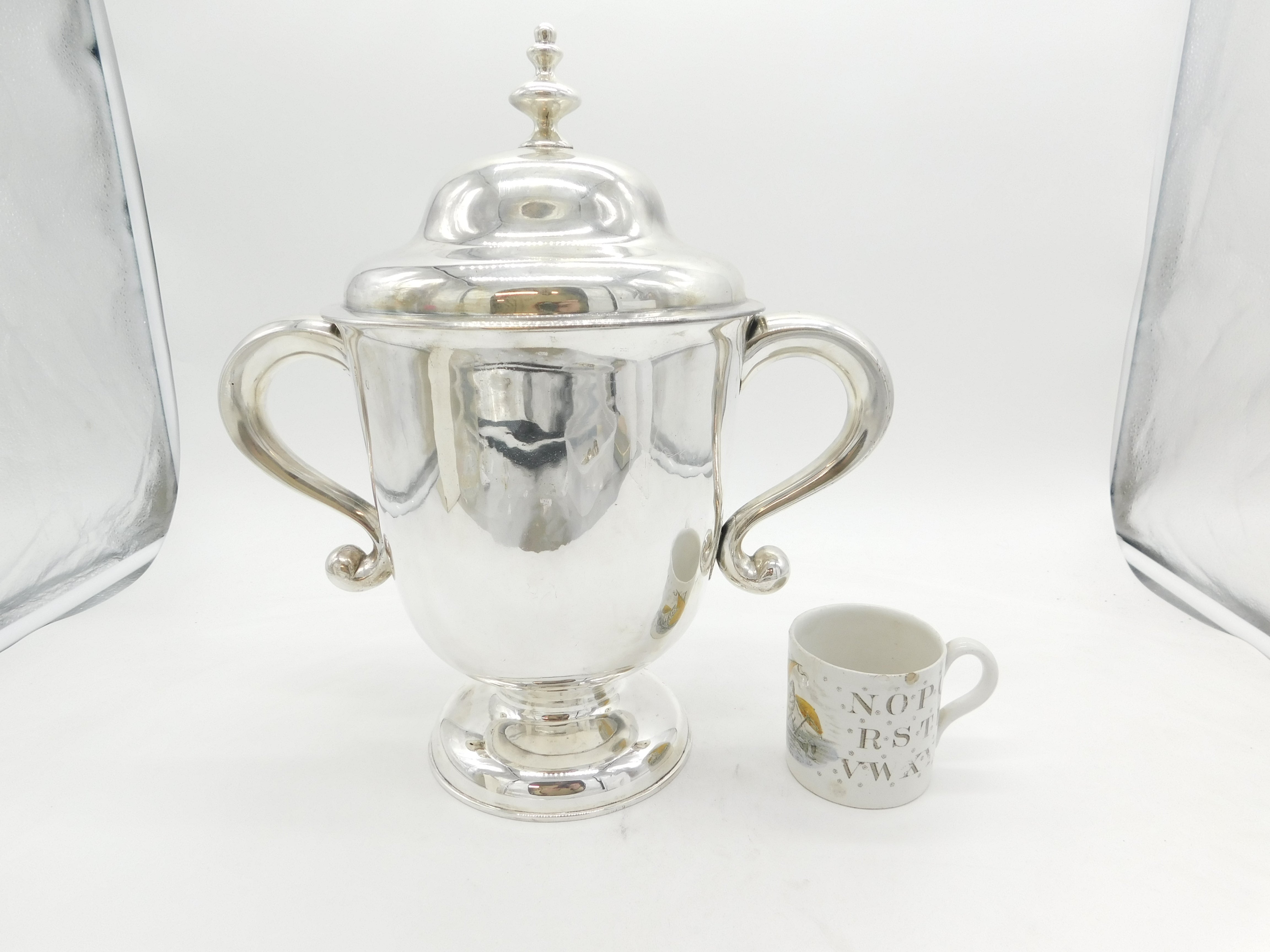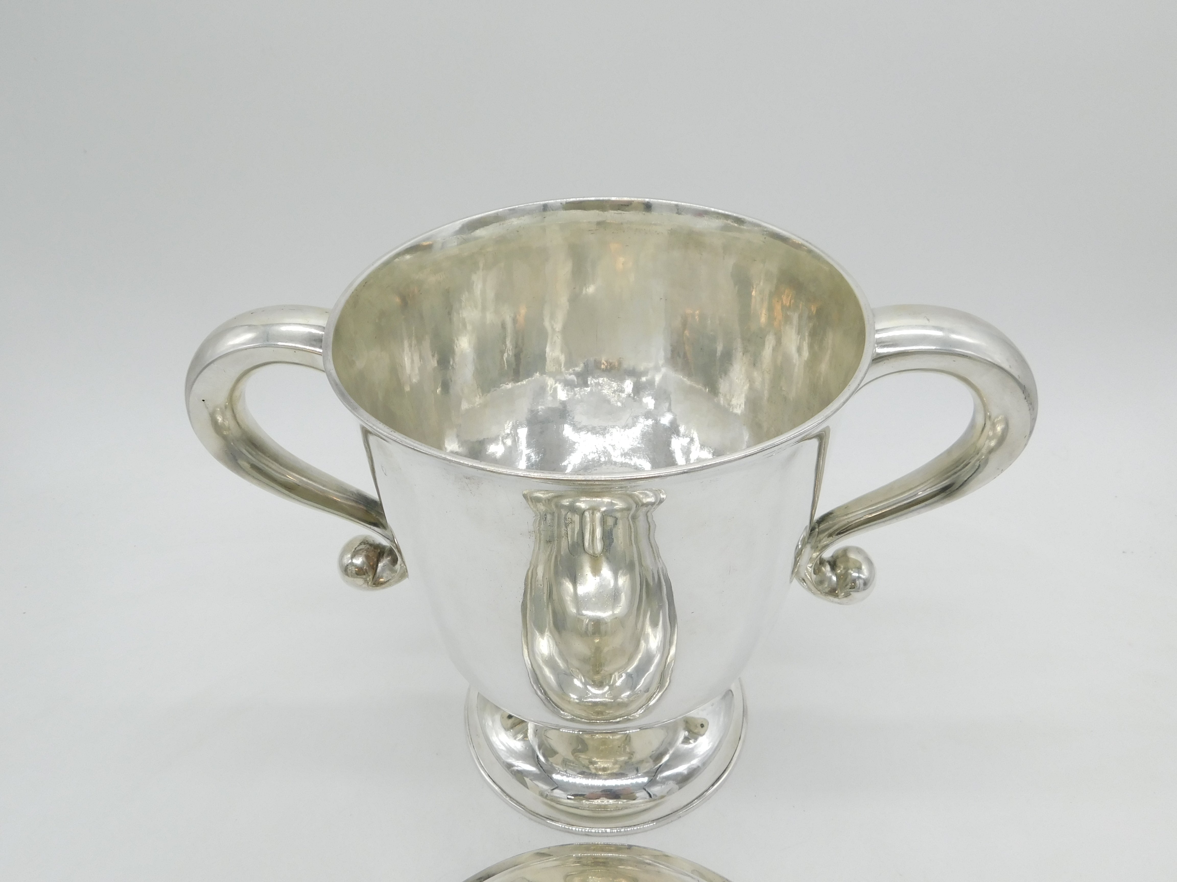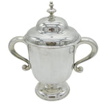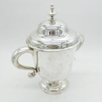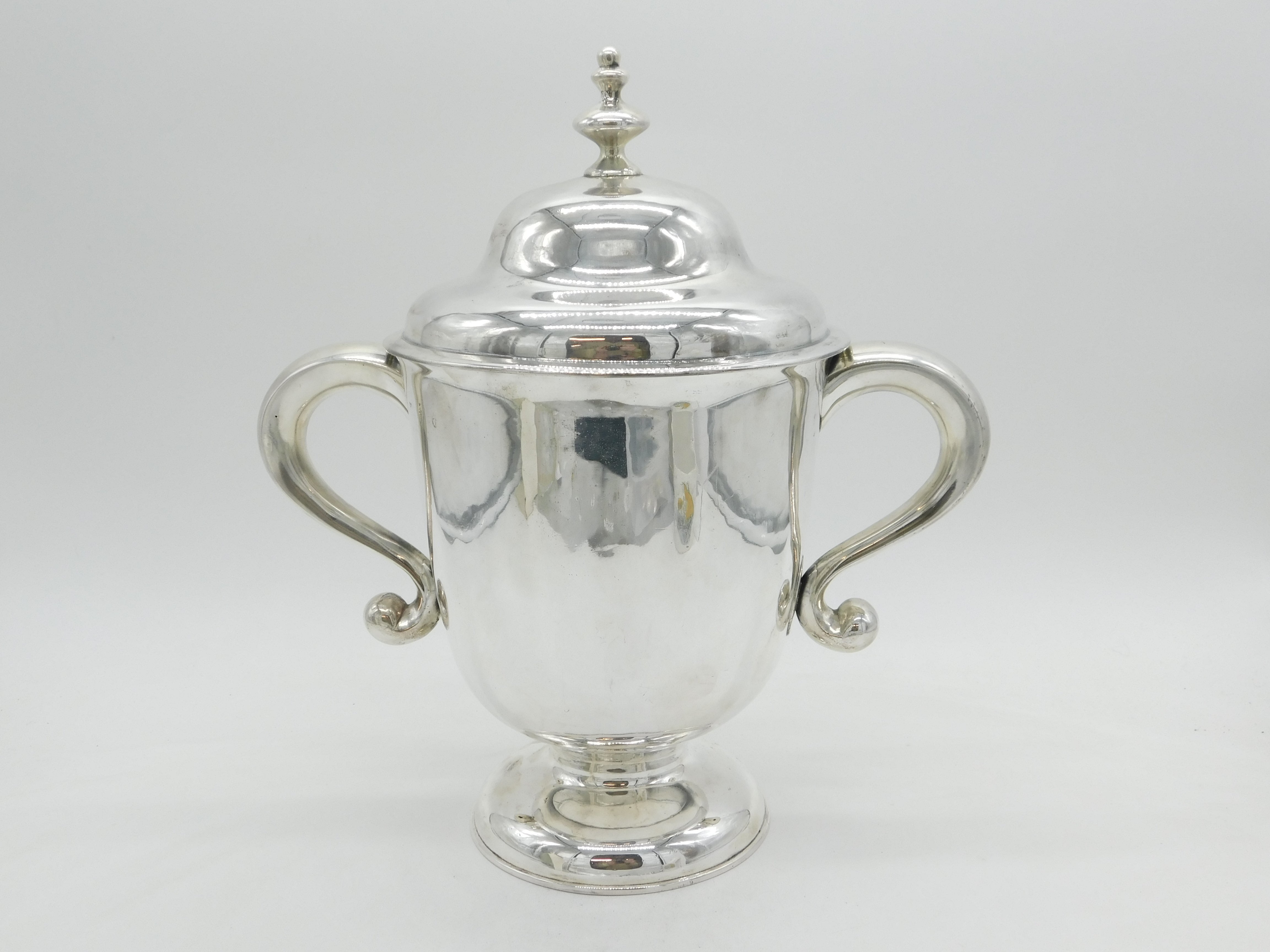 Details: A truly superb antique early-georgian Irish large sterling silver two-handled lidded trophy or loving cup with scrolled handles and cast finial. Classical georgian minimalist design throughout with no prior engravings or inscriptions. The cup is in perfect condition with no repairs or later tampering. Both the lid and the trophy are nicely hallmarked for Dublin 1732 by Erasmus Cope of Skinner's Row, Dublin (1706-1748). This is a extremely striking cup that would make an amazing addition to the collection of any astute Irish silverware collector or silver collector generally.