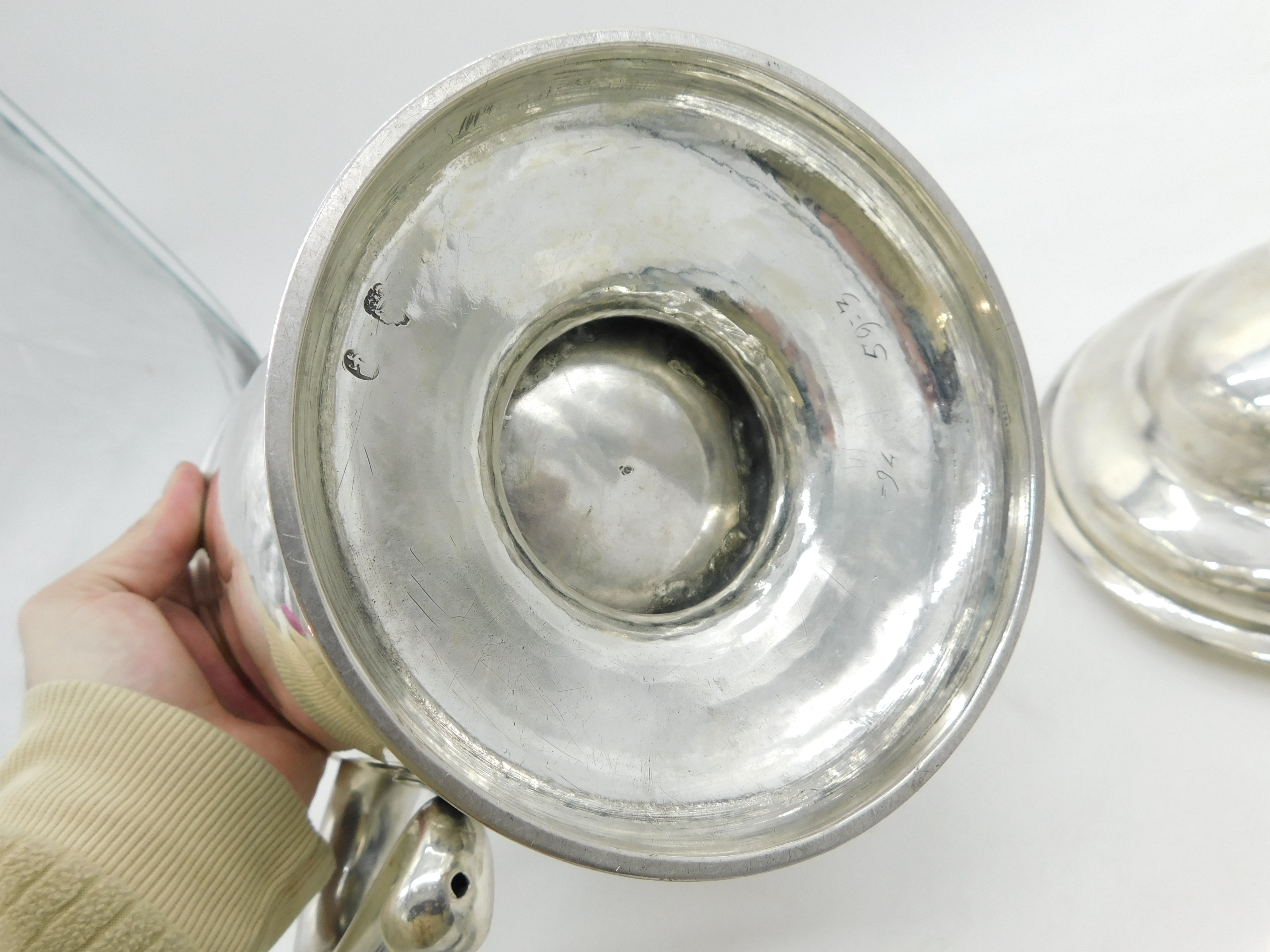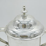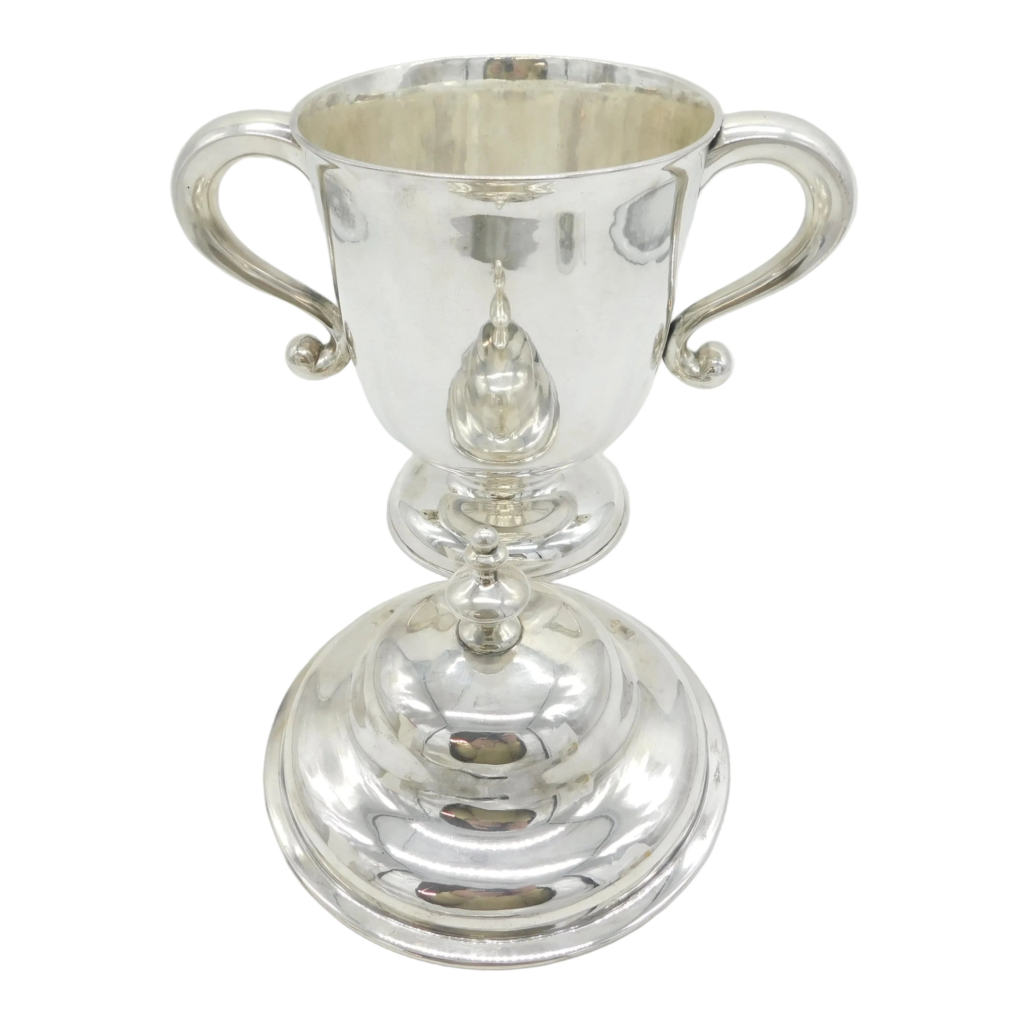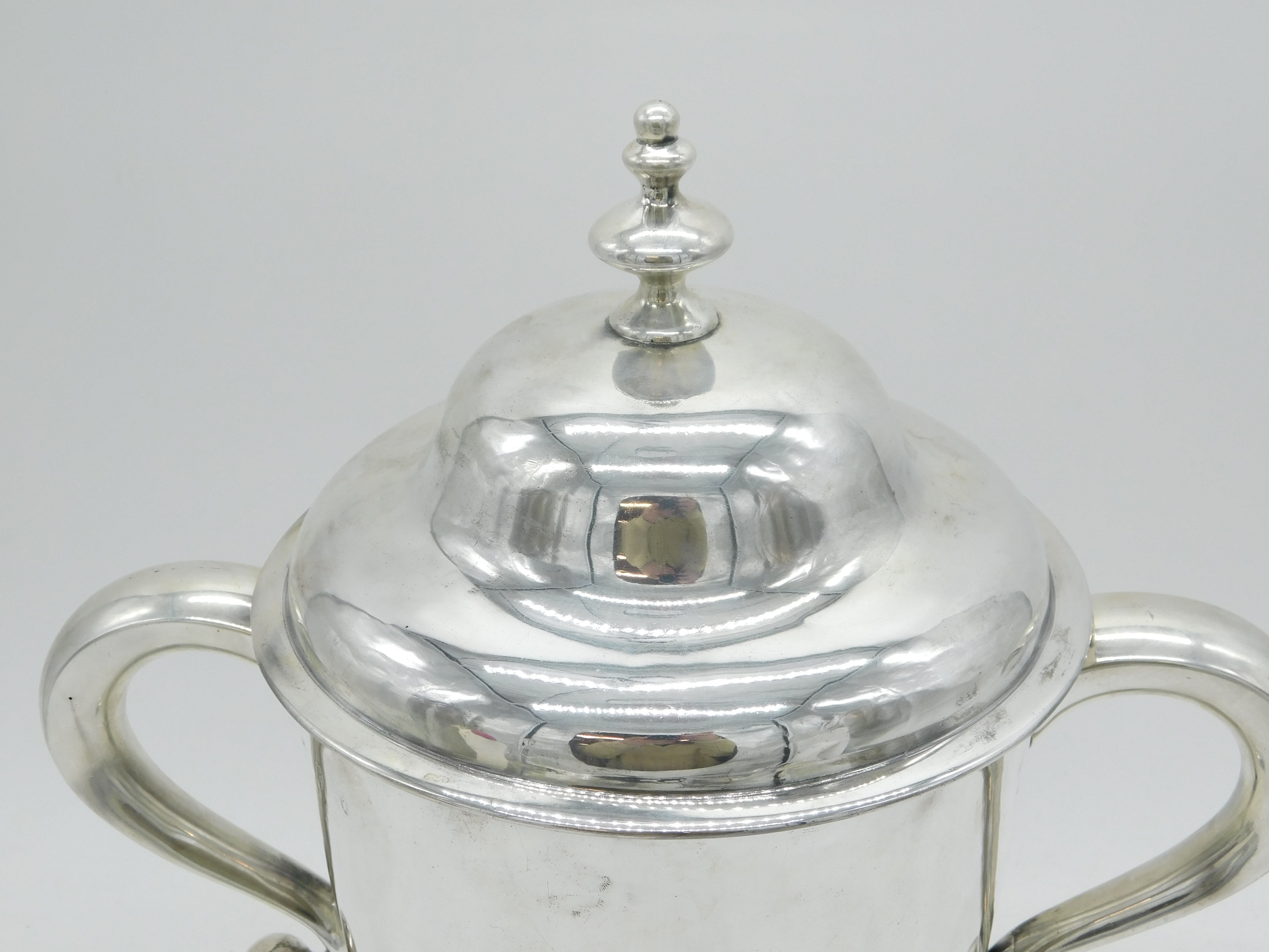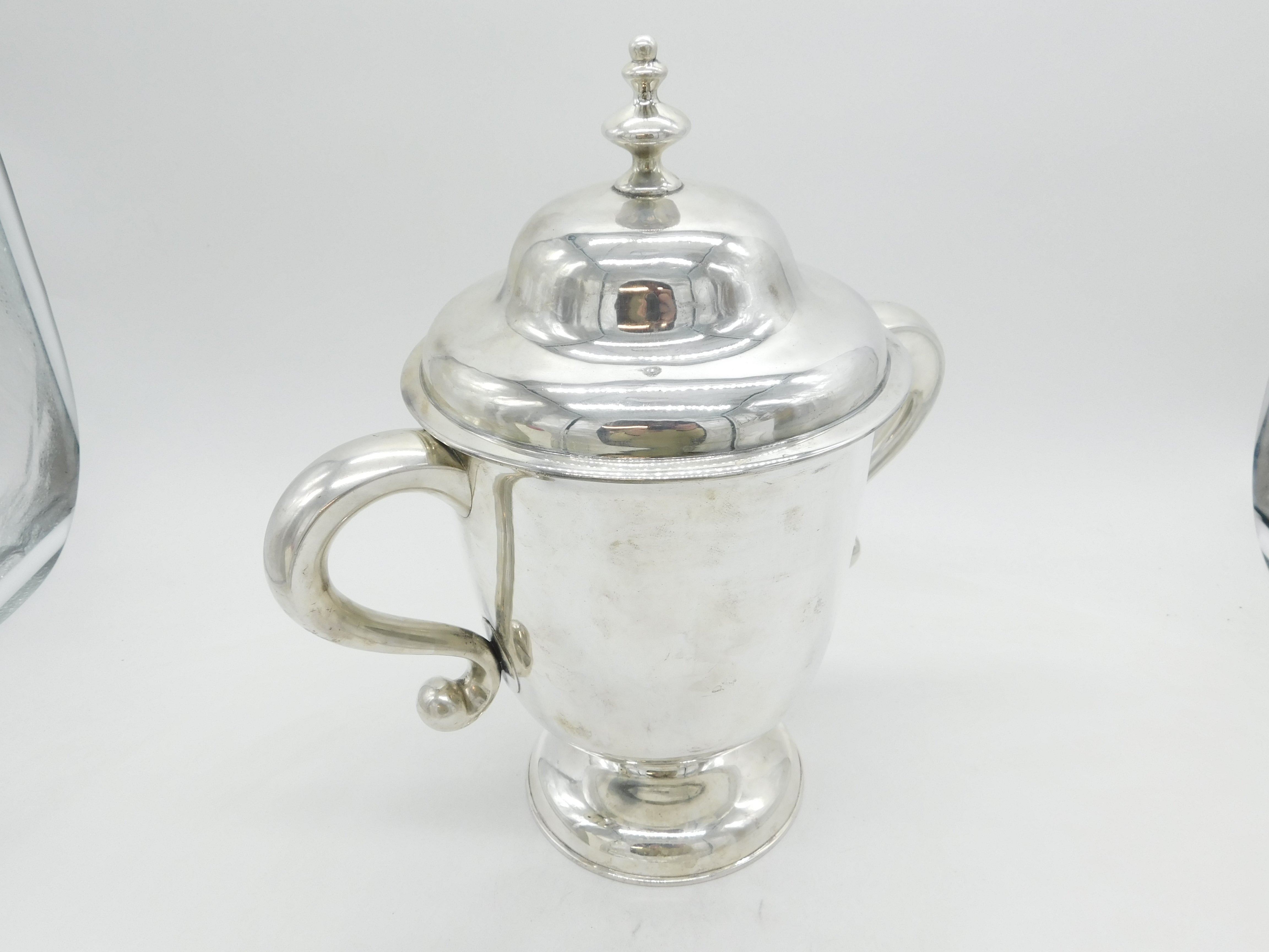 Details: A truly superb antique early-georgian Irish large sterling silver two-handled lidded trophy or loving cup with scrolled handles and cast finial. Classical georgian minimalist design throughout with no prior engravings or inscriptions. The cup is in perfect condition with no repairs or later tampering. Both the lid and the trophy are nicely hallmarked for Dublin 1732 by Erasmus Cope of Skinner's Row, Dublin (1706-1748). This is a extremely striking cup that would make an amazing addition to the collection of any astute Irish silverware collector or silver collector generally.