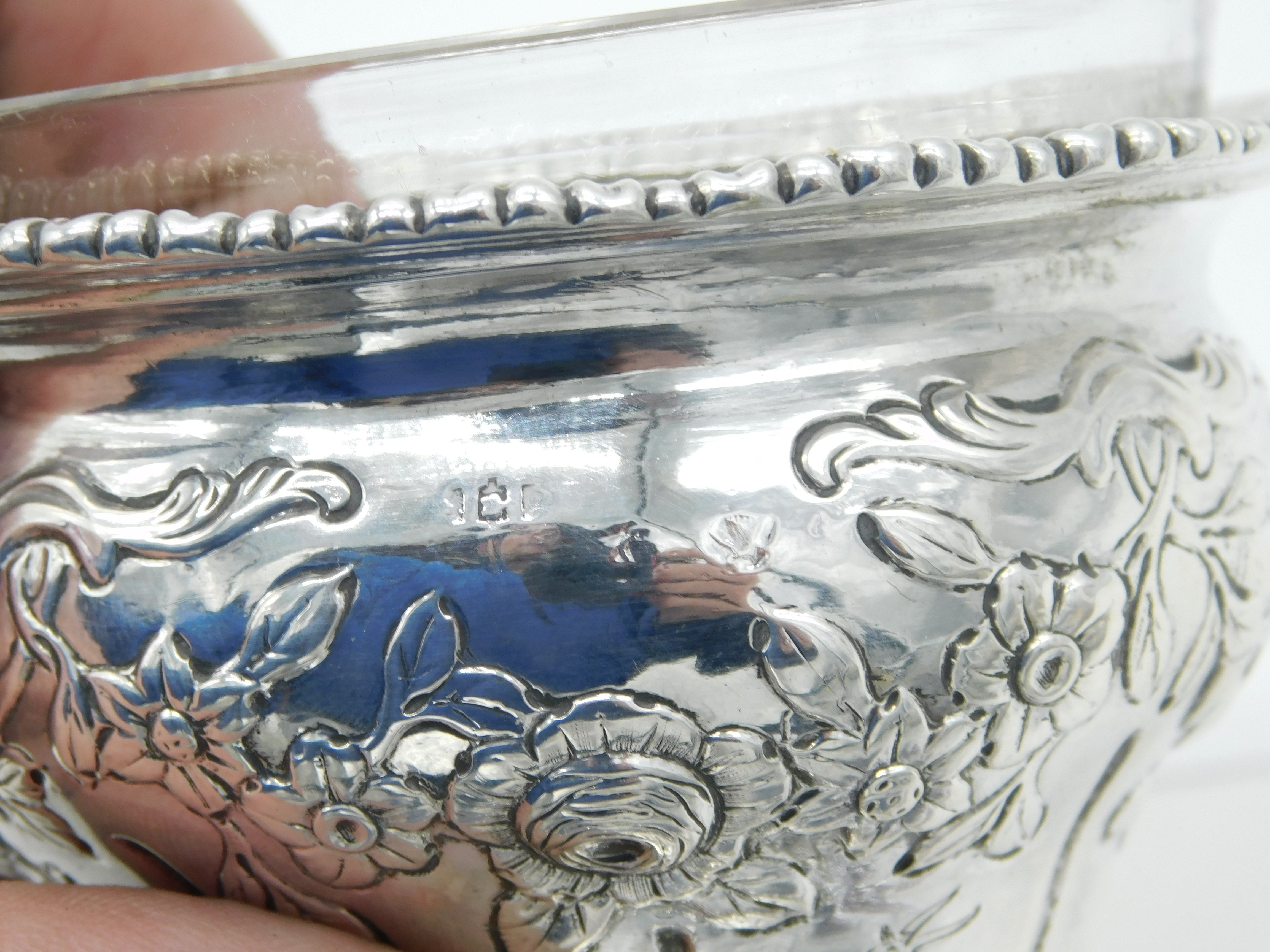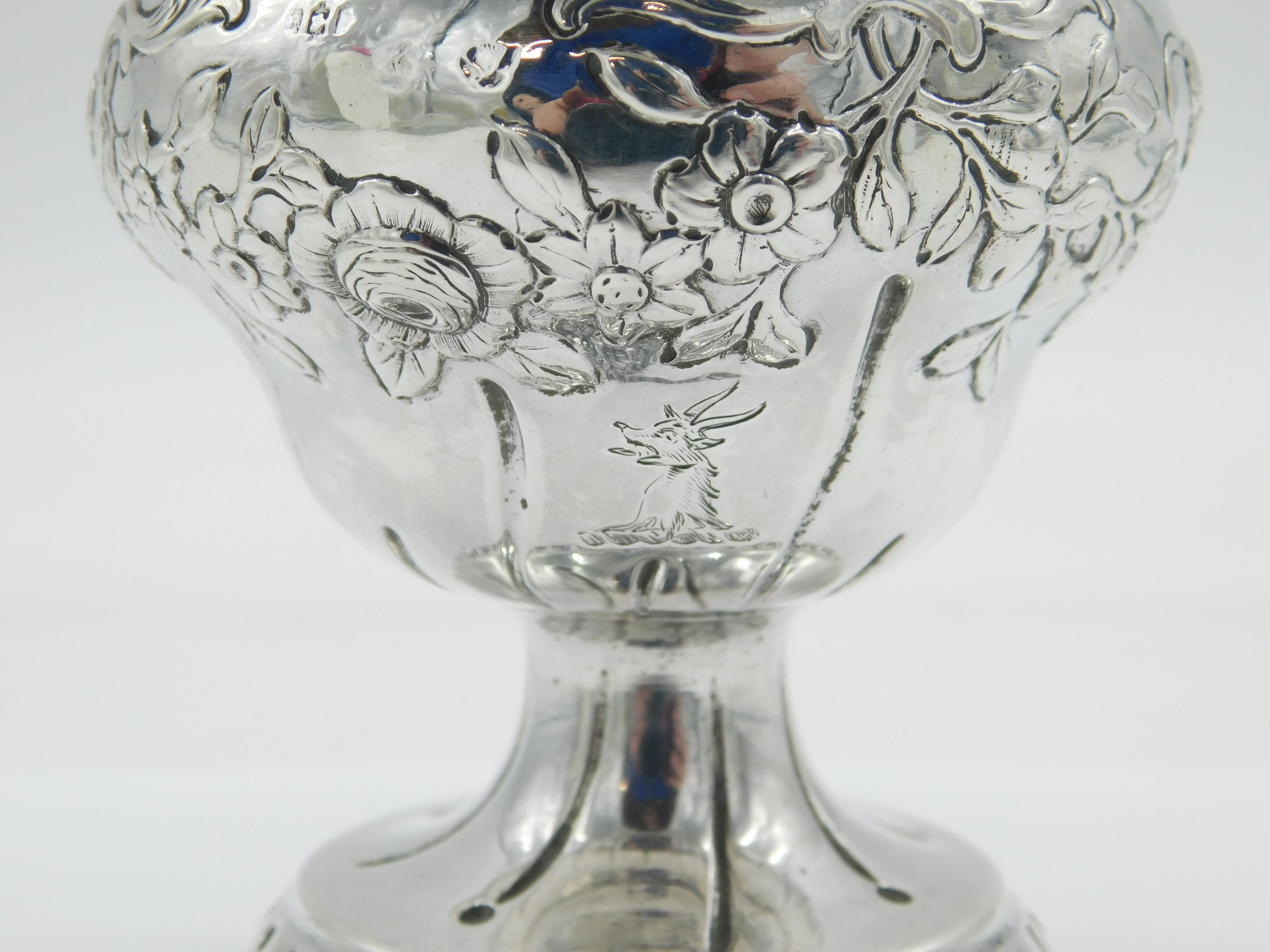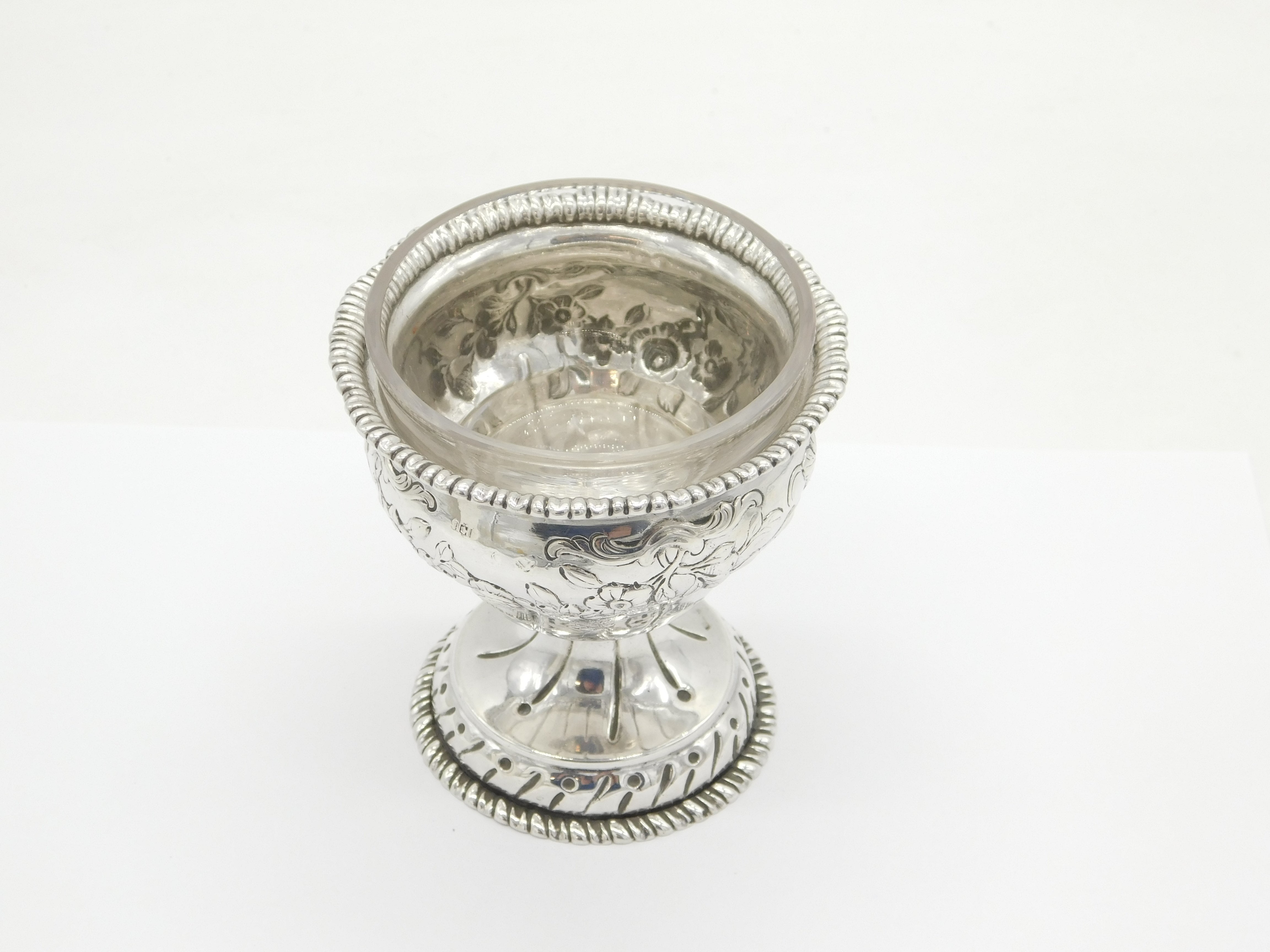 Details: A fantastic and wonderfully designed antique early-georgian Irish sterling silver pedestal salt cellar with charming floral embossed decoration throughout, lovely heraldic crest to the cartouche, hallmarked Dublin c1750 by John Laughlin Senior. Includes a glass liner although this is slightly too large and not original. This is a wonderful item that would make a perfect gift or addition to any collection. We are more than happy to provide XRF reports for items upon request.