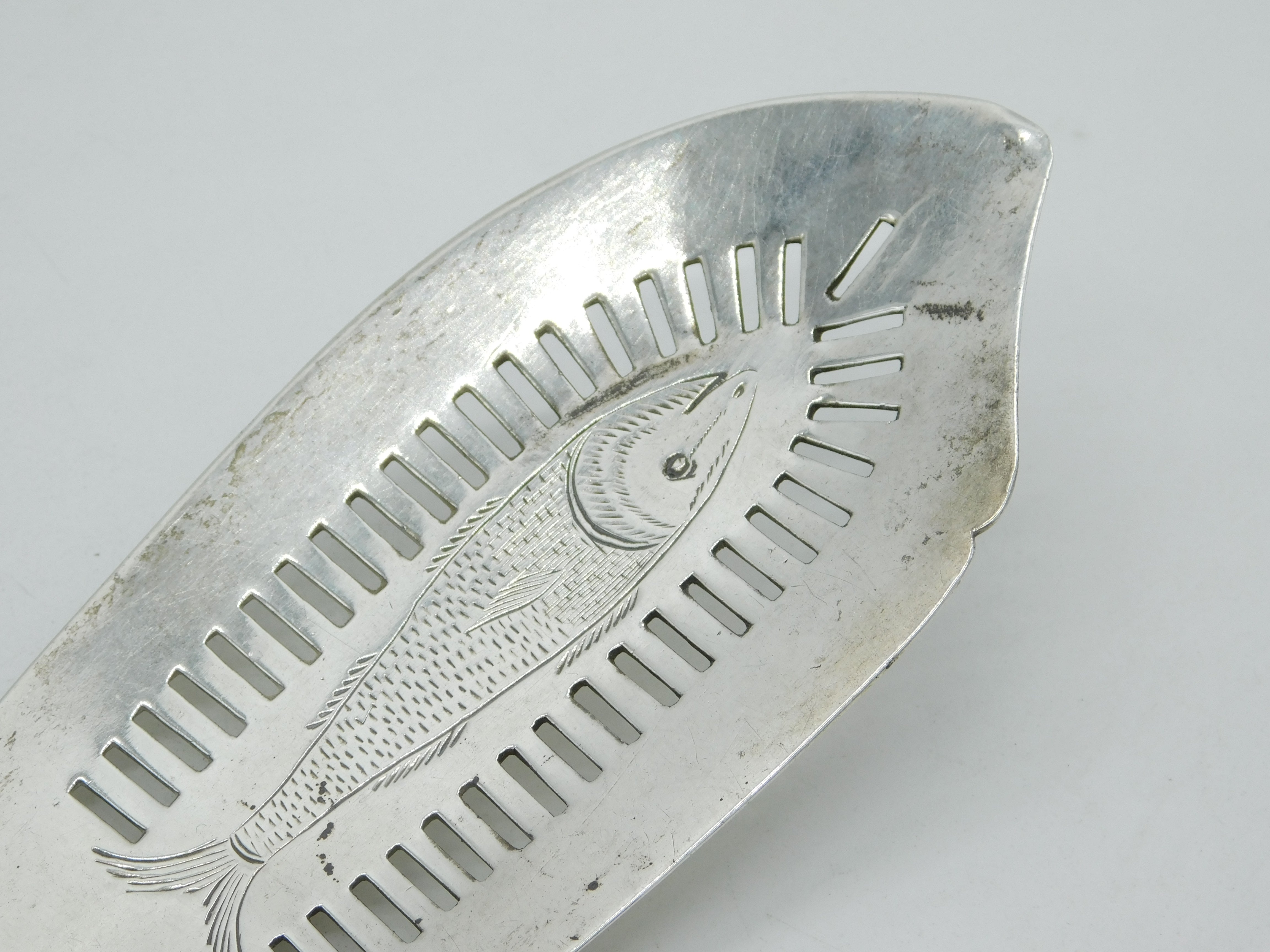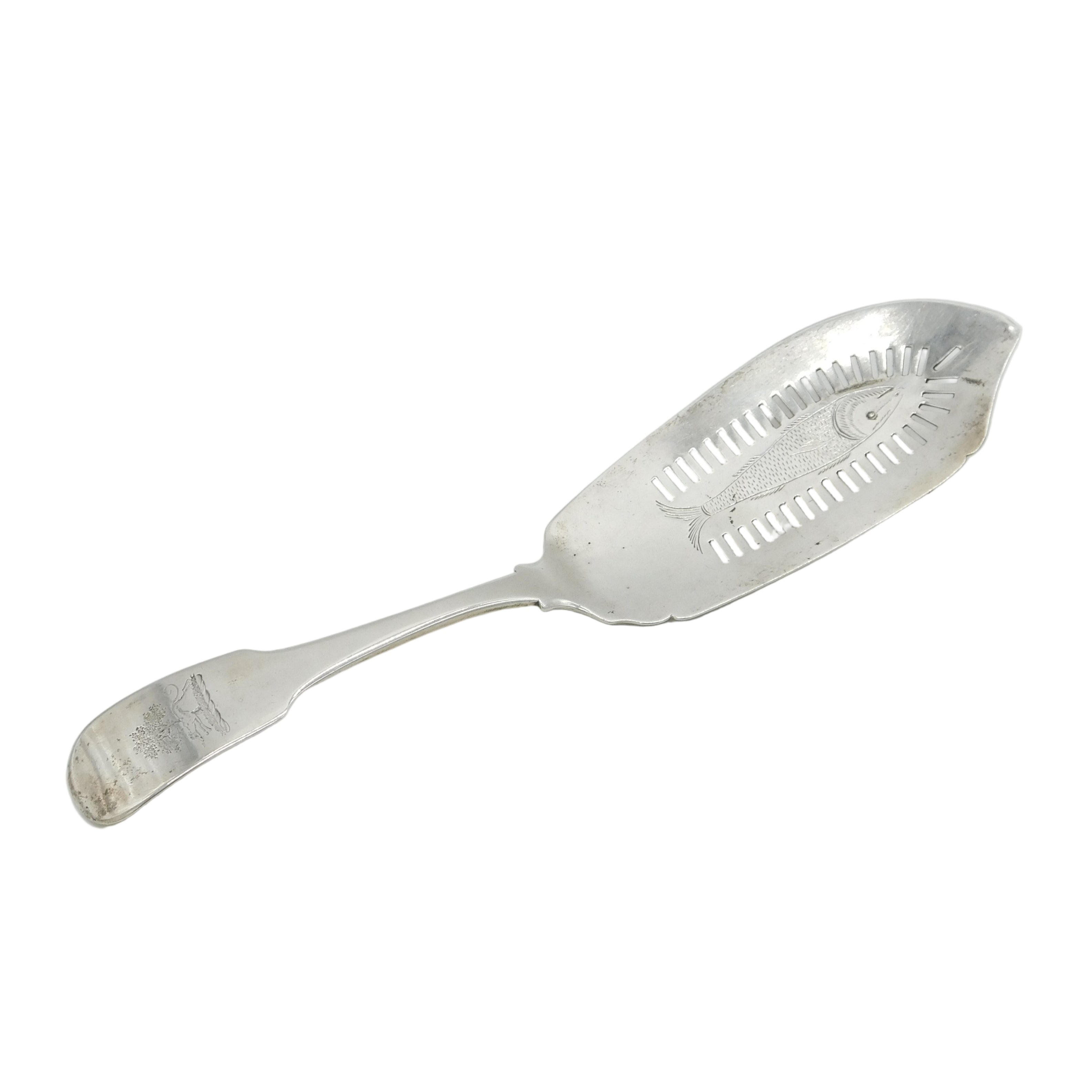 Details: A fantastic and wonderfully designed antique early Irish georgian sterling silver fish server with charming greyhound running heraldic crest to the terminal, engraved with an image of a fish to the bowl, clearly hallmarked Dublin 1806 to the reverse by maker 'J.D. This is a wonderful item that would make a perfect gift or addition to any collection.