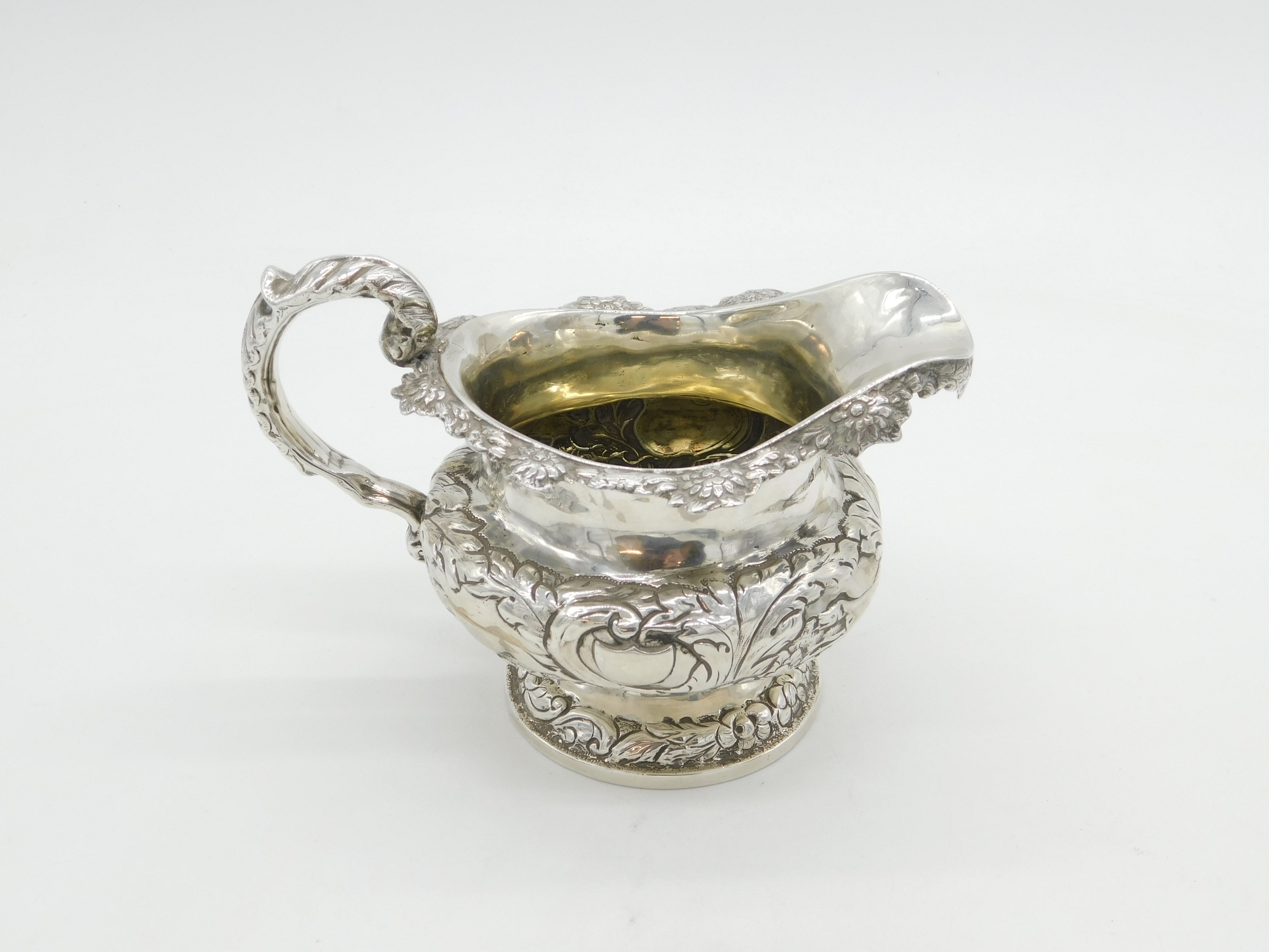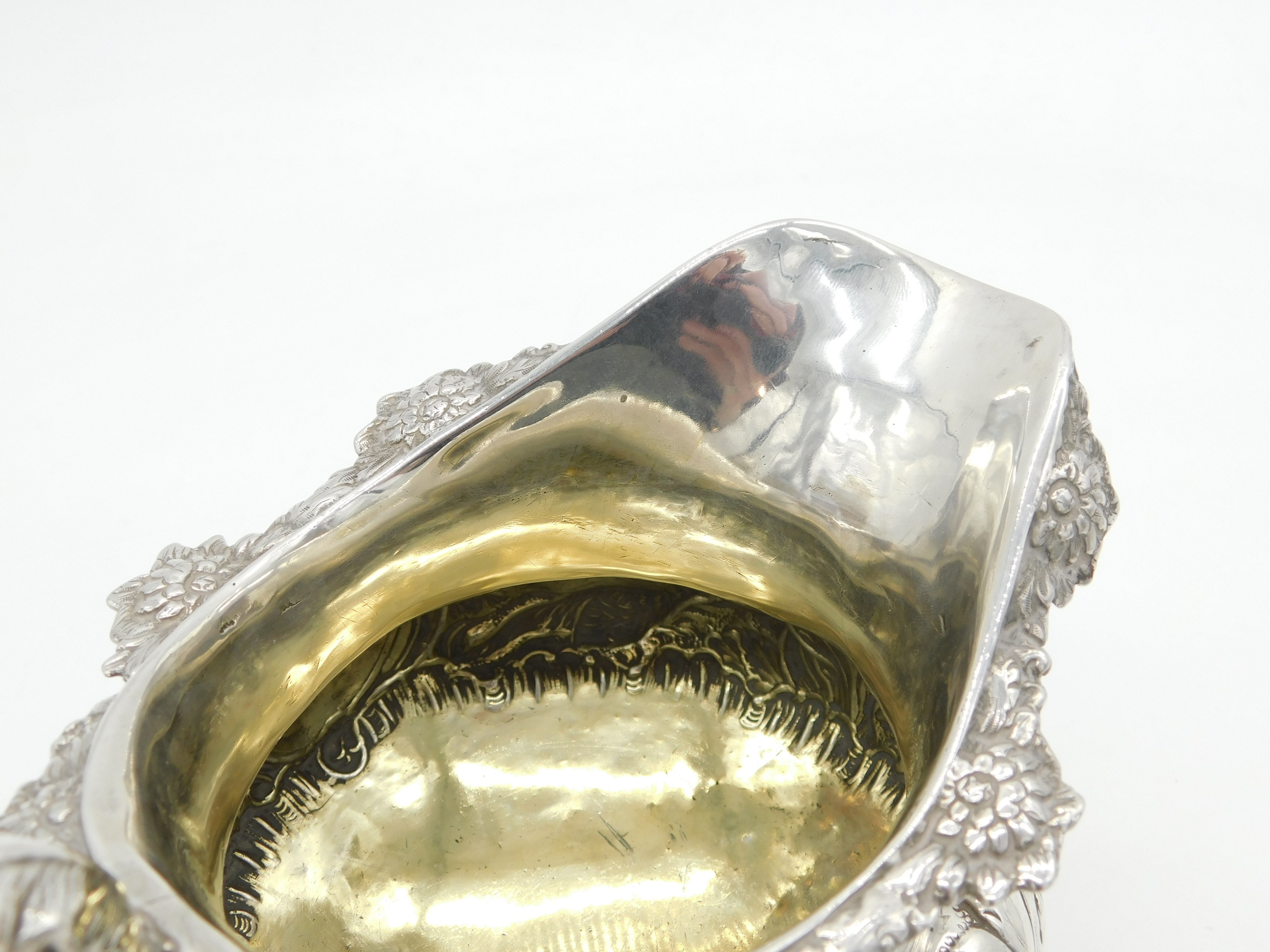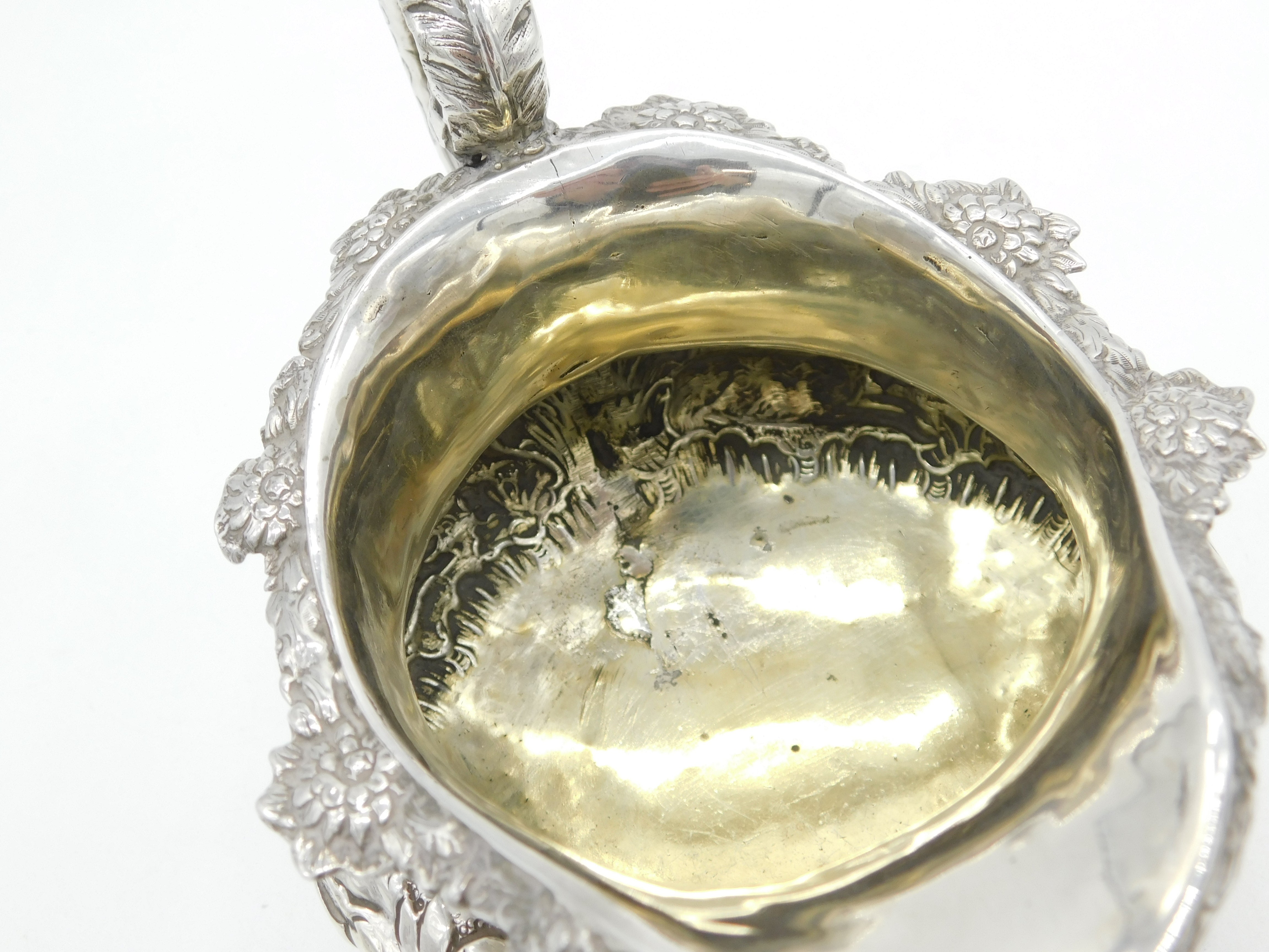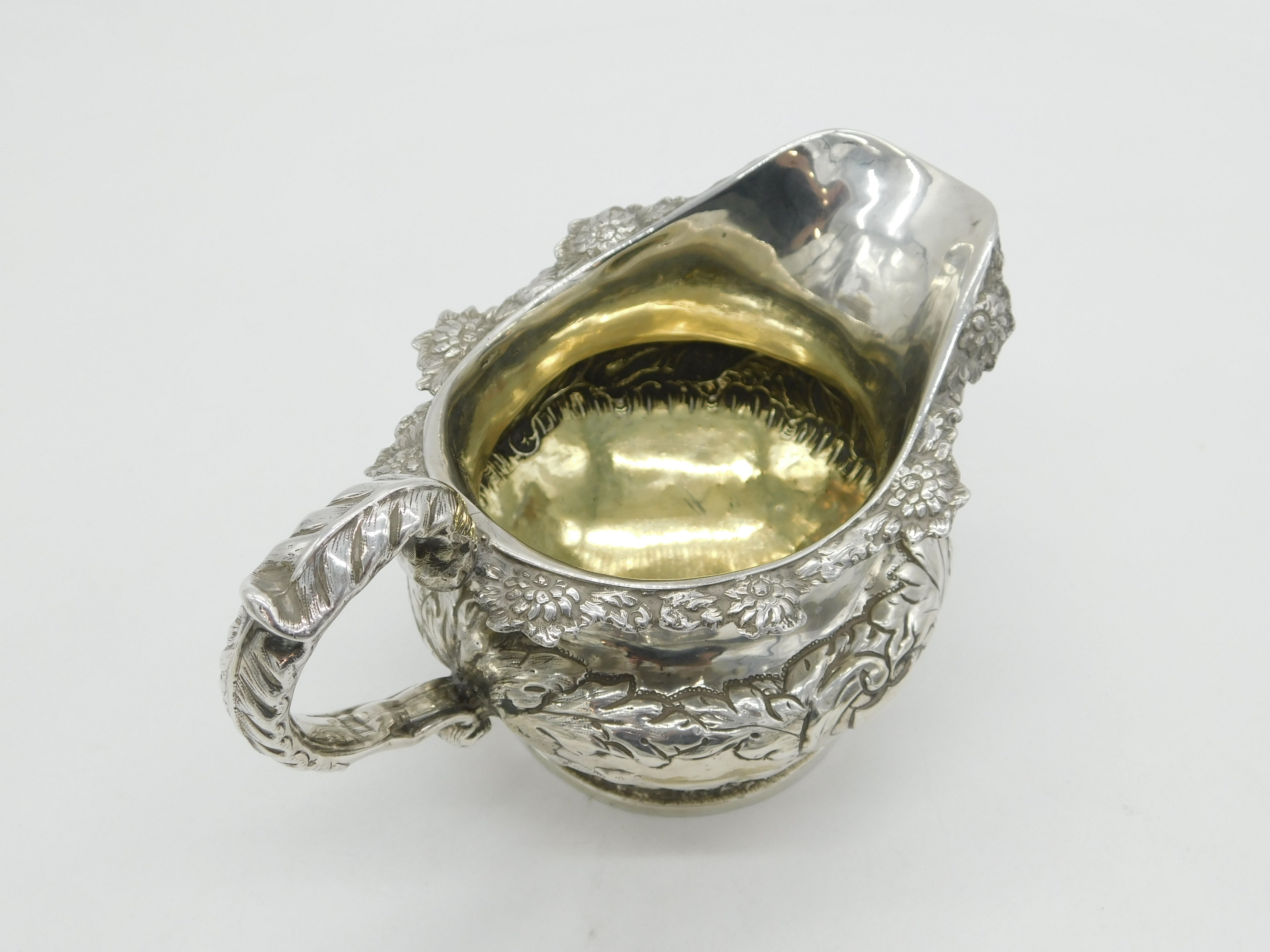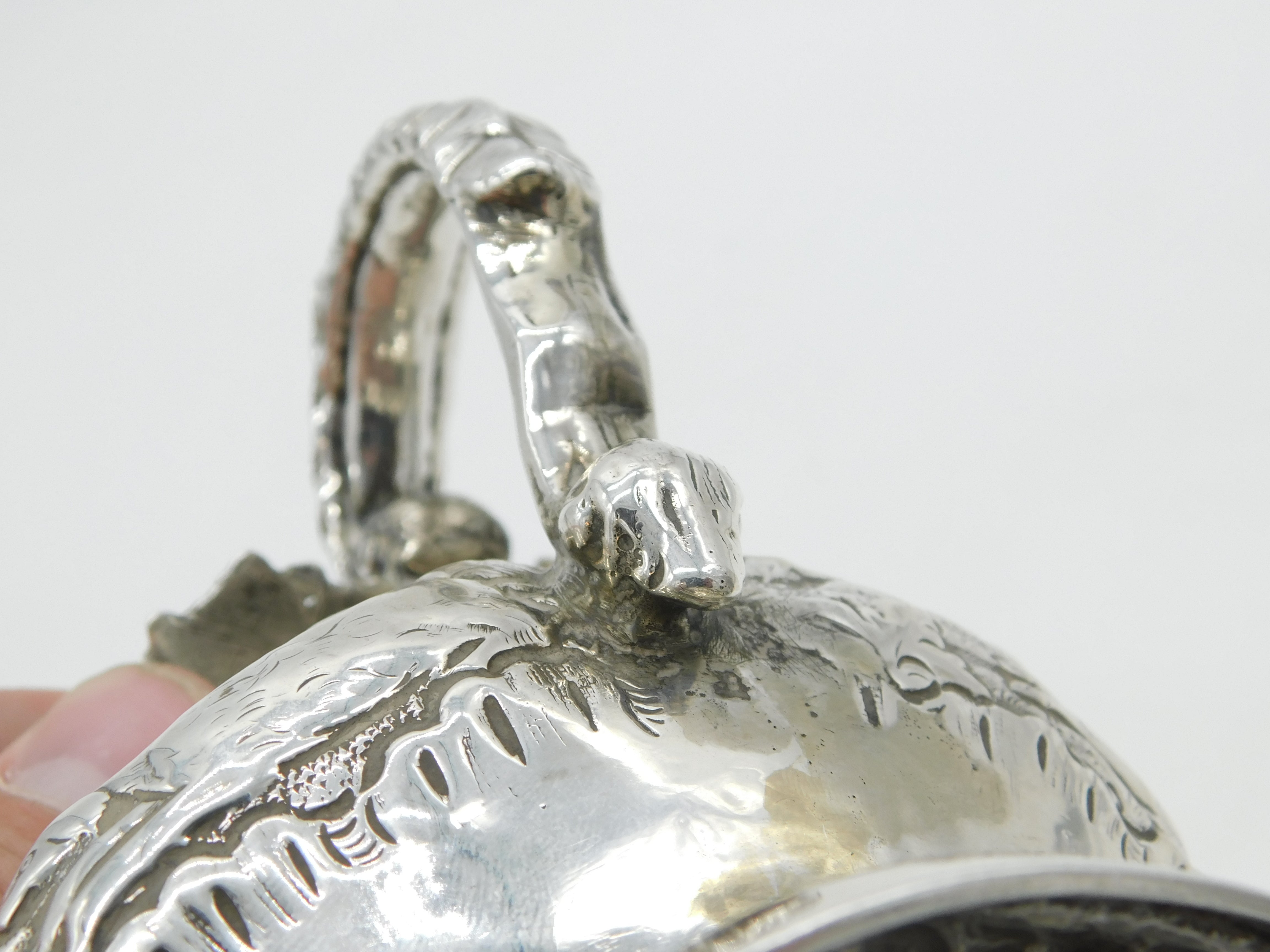Details: A fantastic and wonderfully designed antique William IV sterling silver Irish cream jug with gilt interior decorated with superb hunting scene throughout showing two hounds chasing after a pheasant, hallmarked Dublin 1832 by James Scott to the base. Superb snake form handle. This is a wonderful item that would make a perfect gift or addition to any collection. The BOX pictured is for PRESENTATION ONLY and is NOT included in the listings but used to frame the pictures unless specifically stated otherwise.