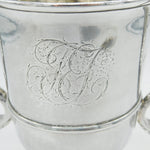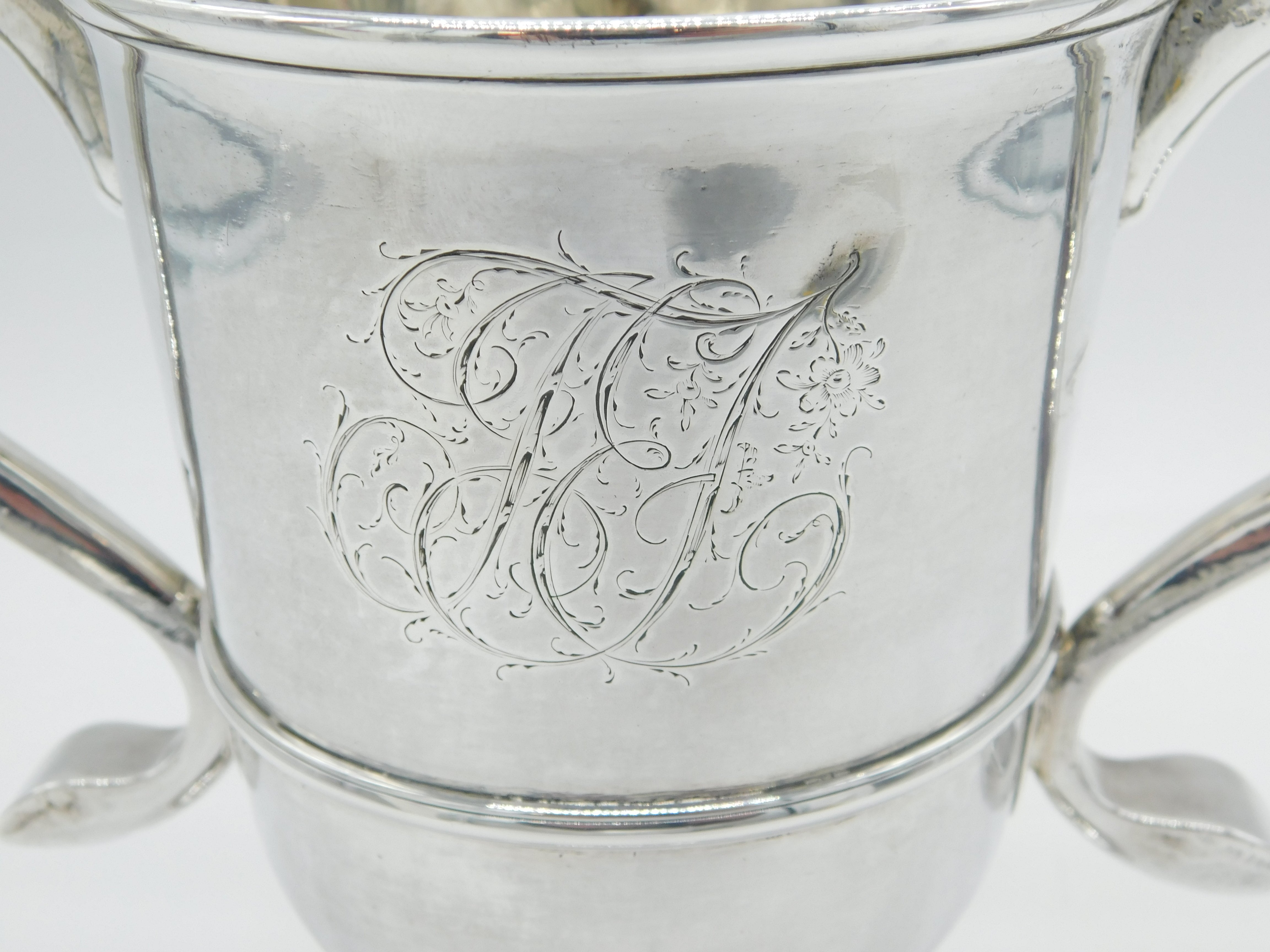 Details: A fantastic and wonderfully designed antique early-georgian Newcastle assay sterling silver two-handled loving cup with lovely clean design, applied floral decorative monogram engraving, hallmarked to the top edge for Newcastle 1779 by John Langlands I & John Robertson I. Small dent to the reverse edge that could easily be removed. This is a wonderful item that would make a perfect gift or addition to any collection. We are more than happy to provide XRF reports for items upon request.