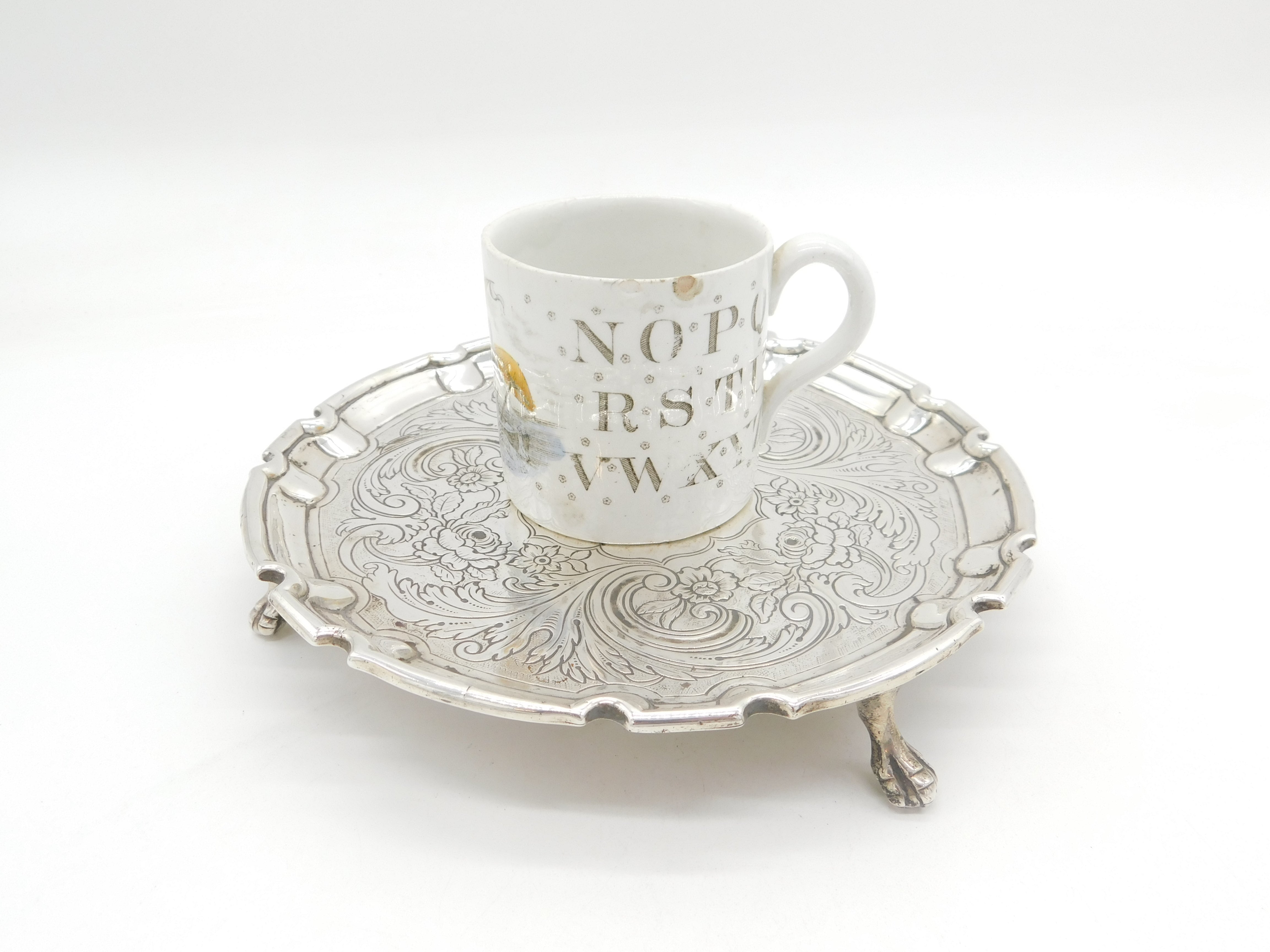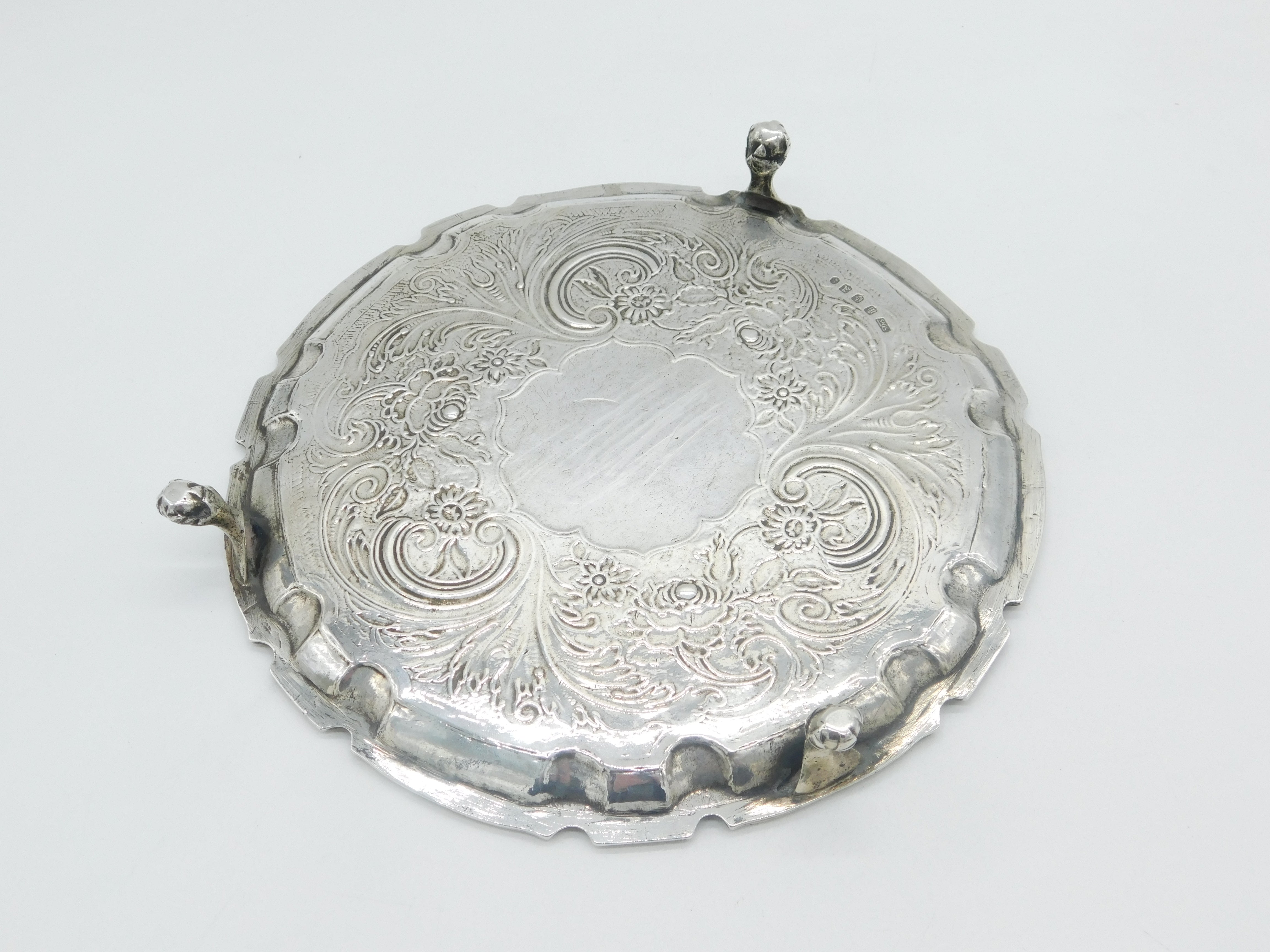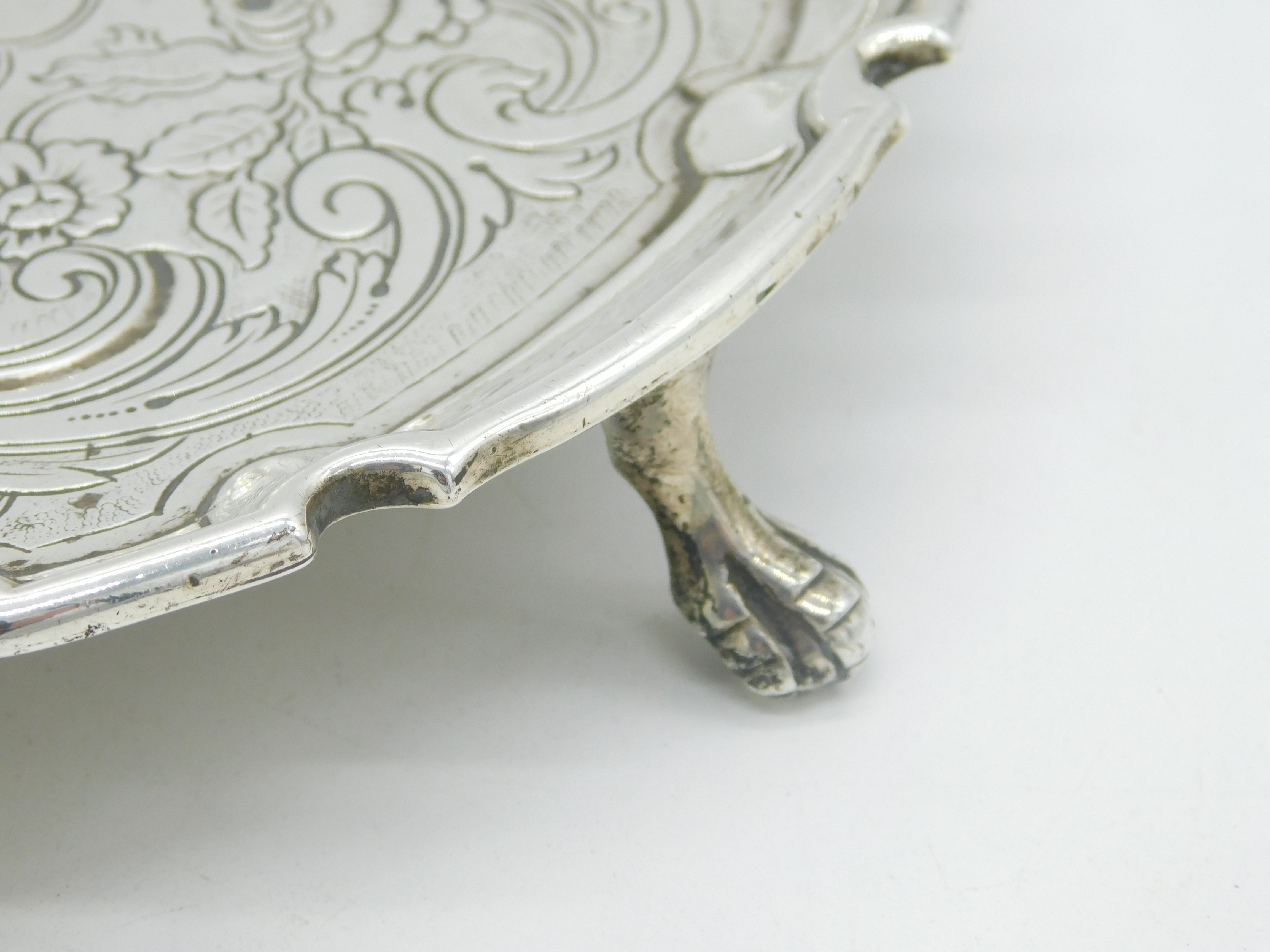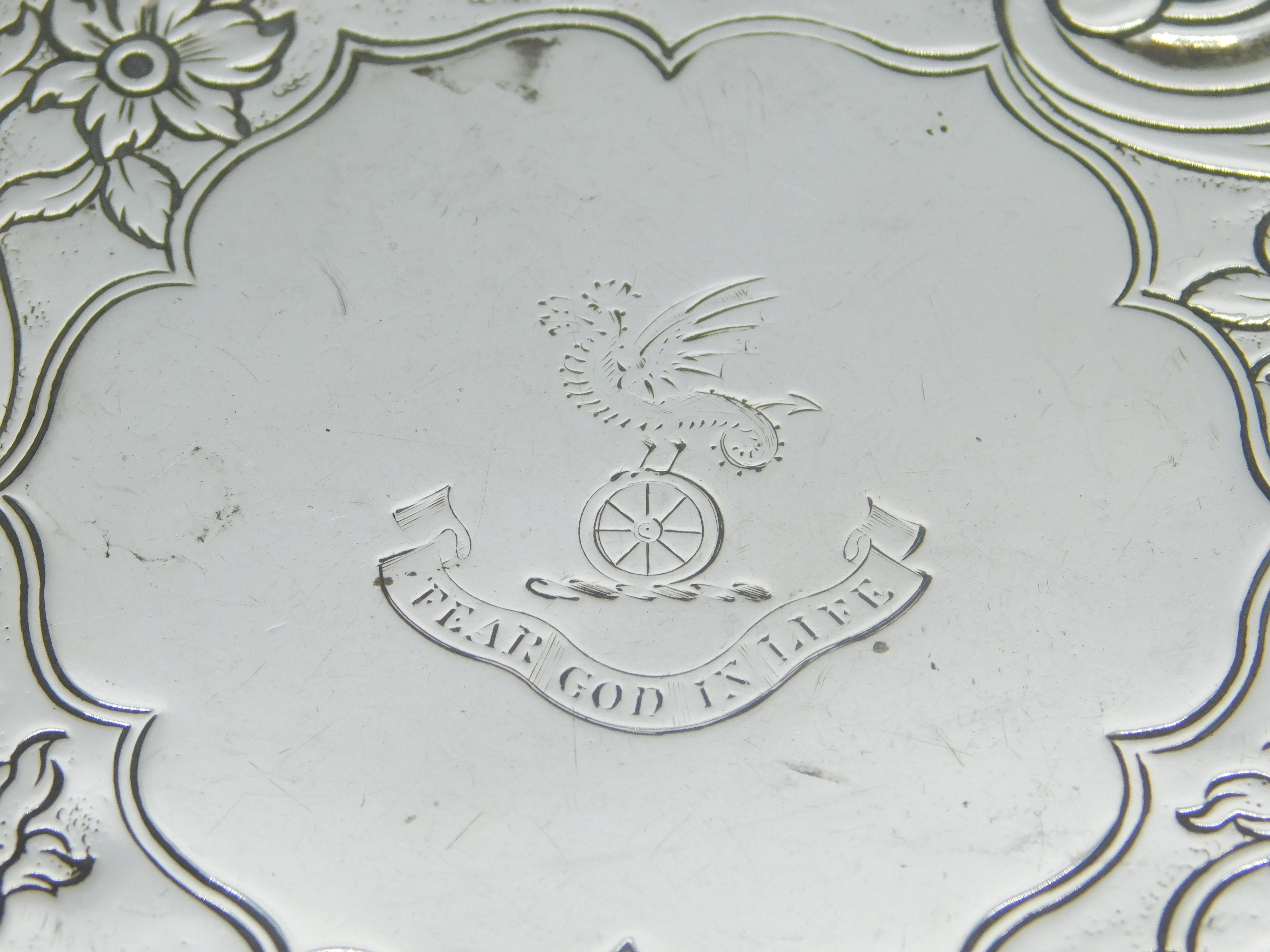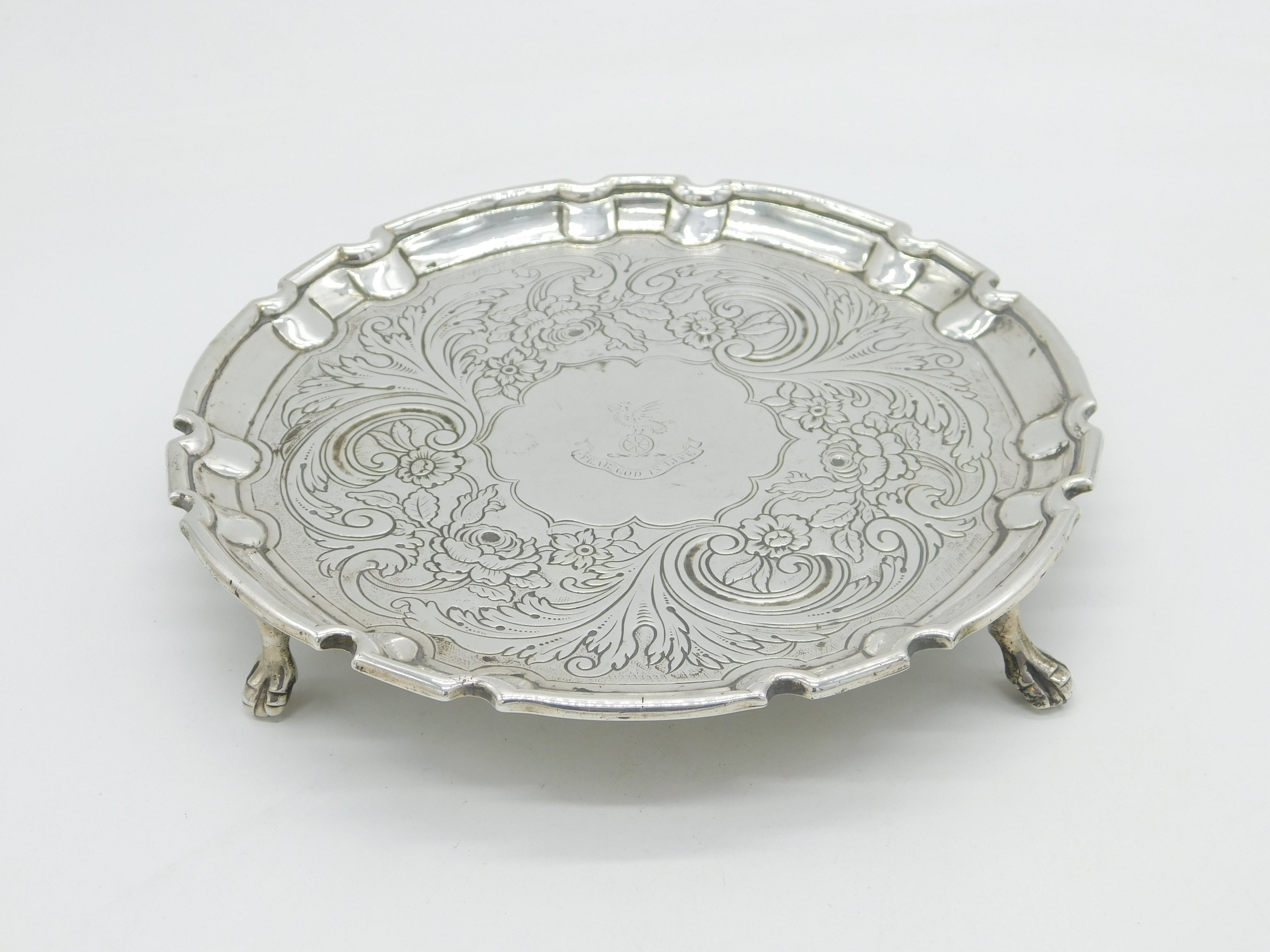 Details: A fantastic and wonderfully designed antique georgian sterling silver eight inch claw footed salver with pie crust edge and applied heraldic crest to the centre reading 'Fear God In Life'. Further embossed floral decoration and presented in lovely condition hallmarked to the base for Edinburgh 1832 by Mackay & Chisholm. This is a wonderful item that would make a perfect gift or addition to any collection. We are more than happy to provide XRF reports for items upon request.