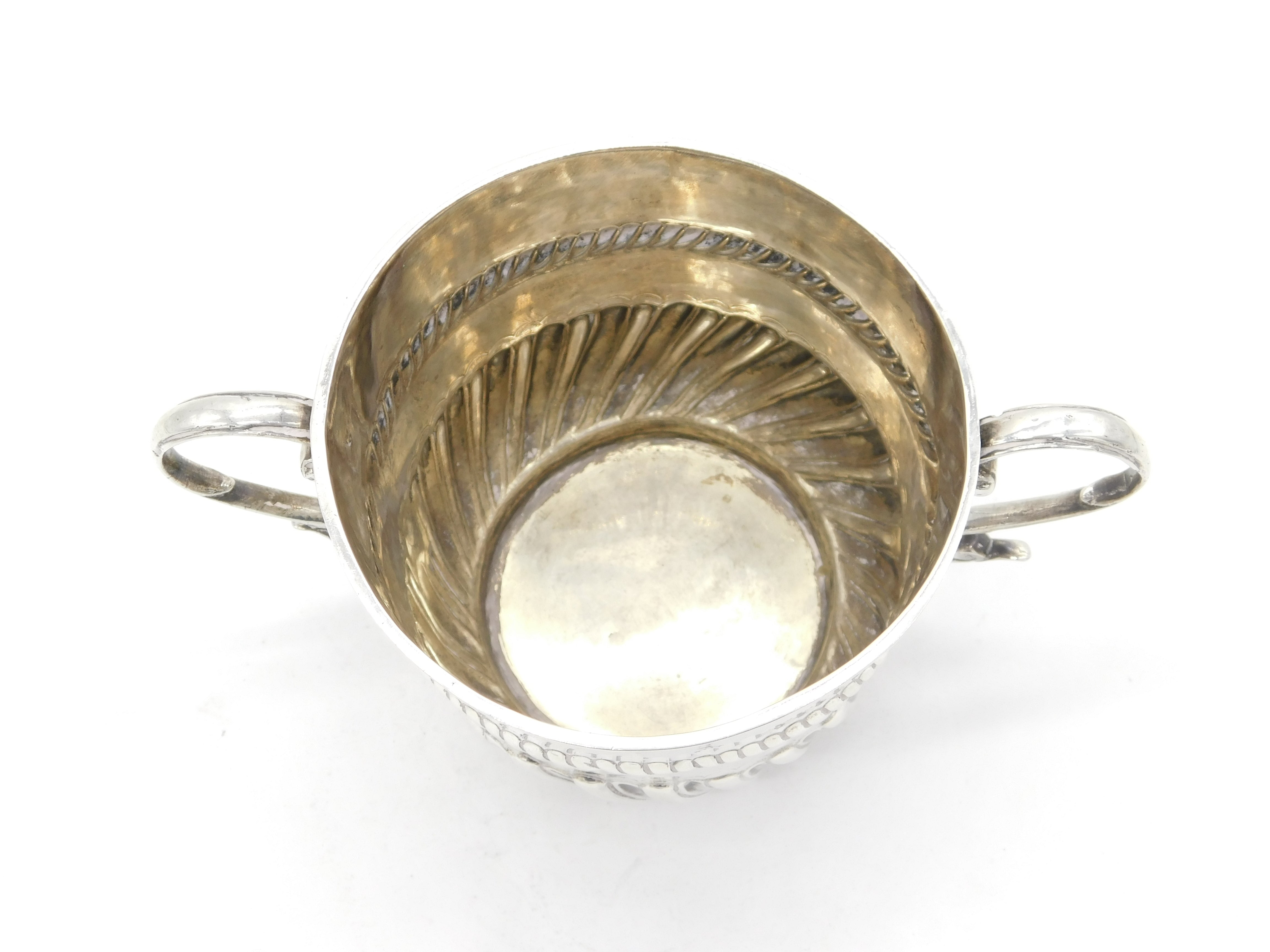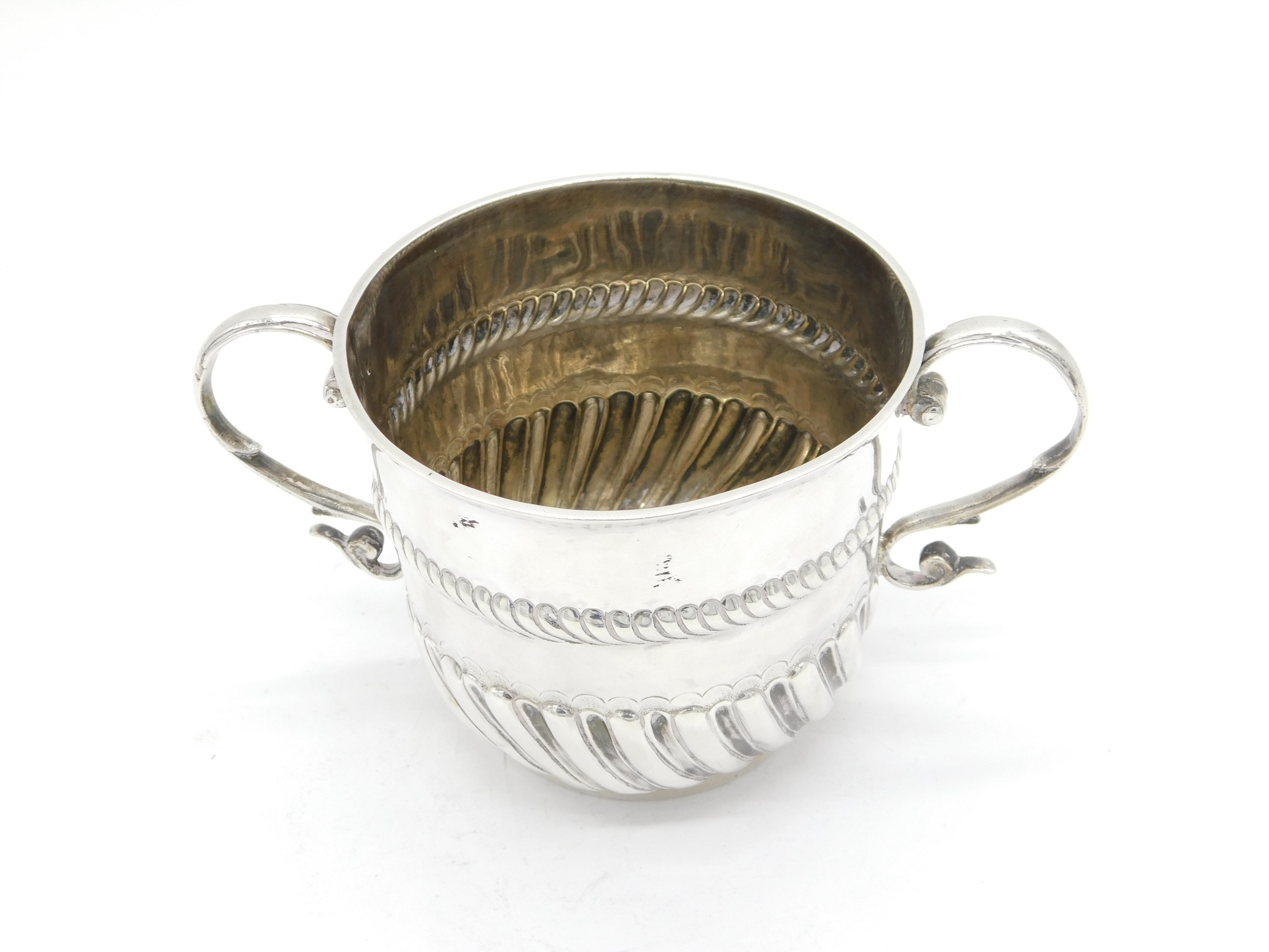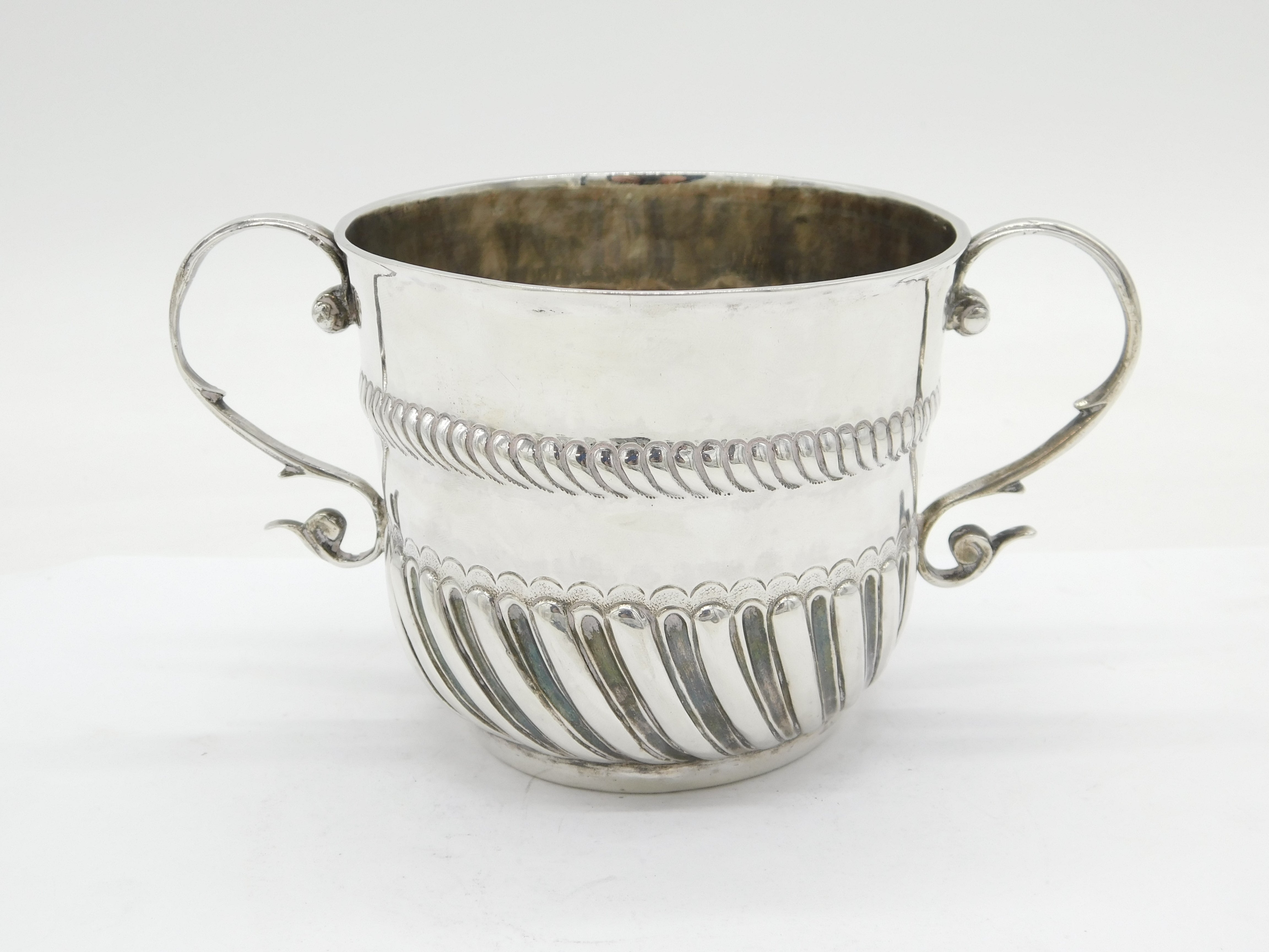 Details: A fantastic and wonderfully designed antique early sterling silver two-handled porringer with lovely fluted detailing throughout, hallmarked to the base London 1690 by Jonah Kirke. Nice clear marks to the base, a superior quality porringer in lovely condition with no evidence of repairs or damage. This is a wonderful item that would make a perfect gift or addition to any collection. We are more than happy to provide XRF reports for items upon request.