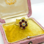 Details: A fantastic and wonderfully designed antique 14ct yellow gold floral cluster ring possibly austro-hungarian set with almandine garnet and water opal marked 14k to the interior c1920. This is a wonderful item that would make a perfect gift or addition to any collection. The BOX pictured is for PRESENTATION ONLY and is NOT included in the listings but used to frame the pictures unless specifically stated otherwise.
