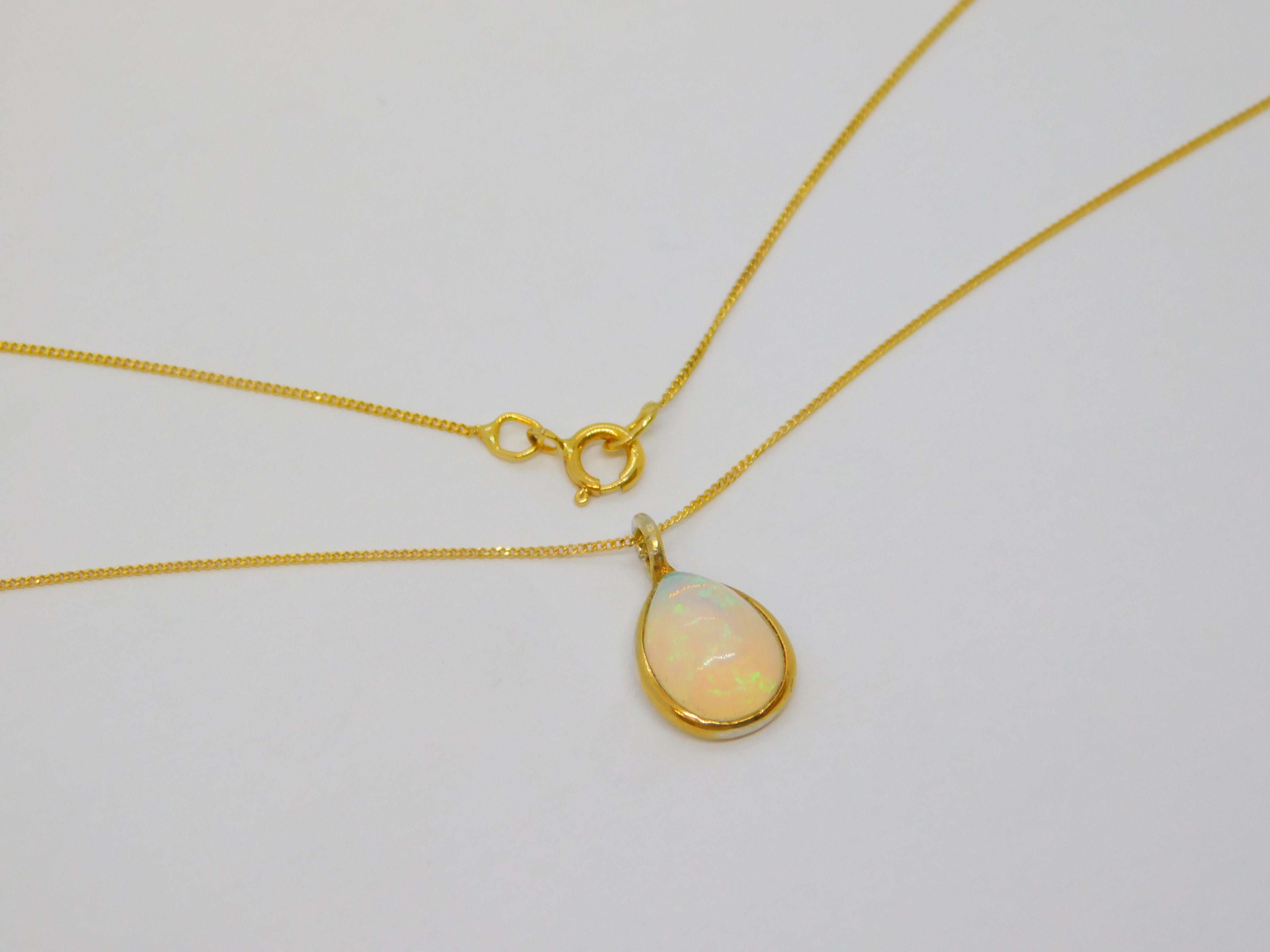 Details: A fantastic and wonderfully designed vintage gilt metal mounted pear cut white opal pendant set on a fine curb link 14ct yellow gold chain necklace hallmarked '585' to the bale c1970. This is a wonderful item that would make a perfect gift or addition to any collection.