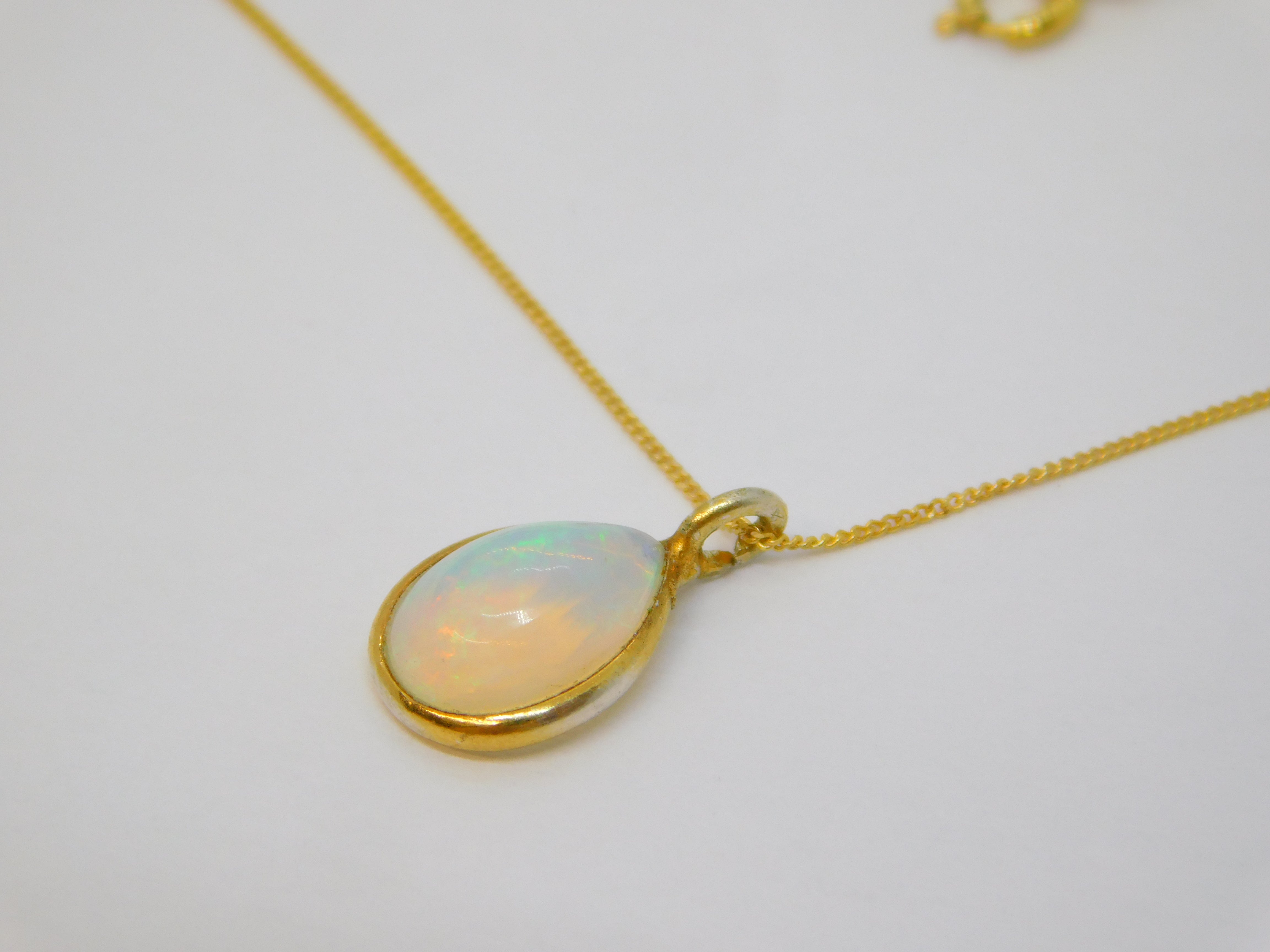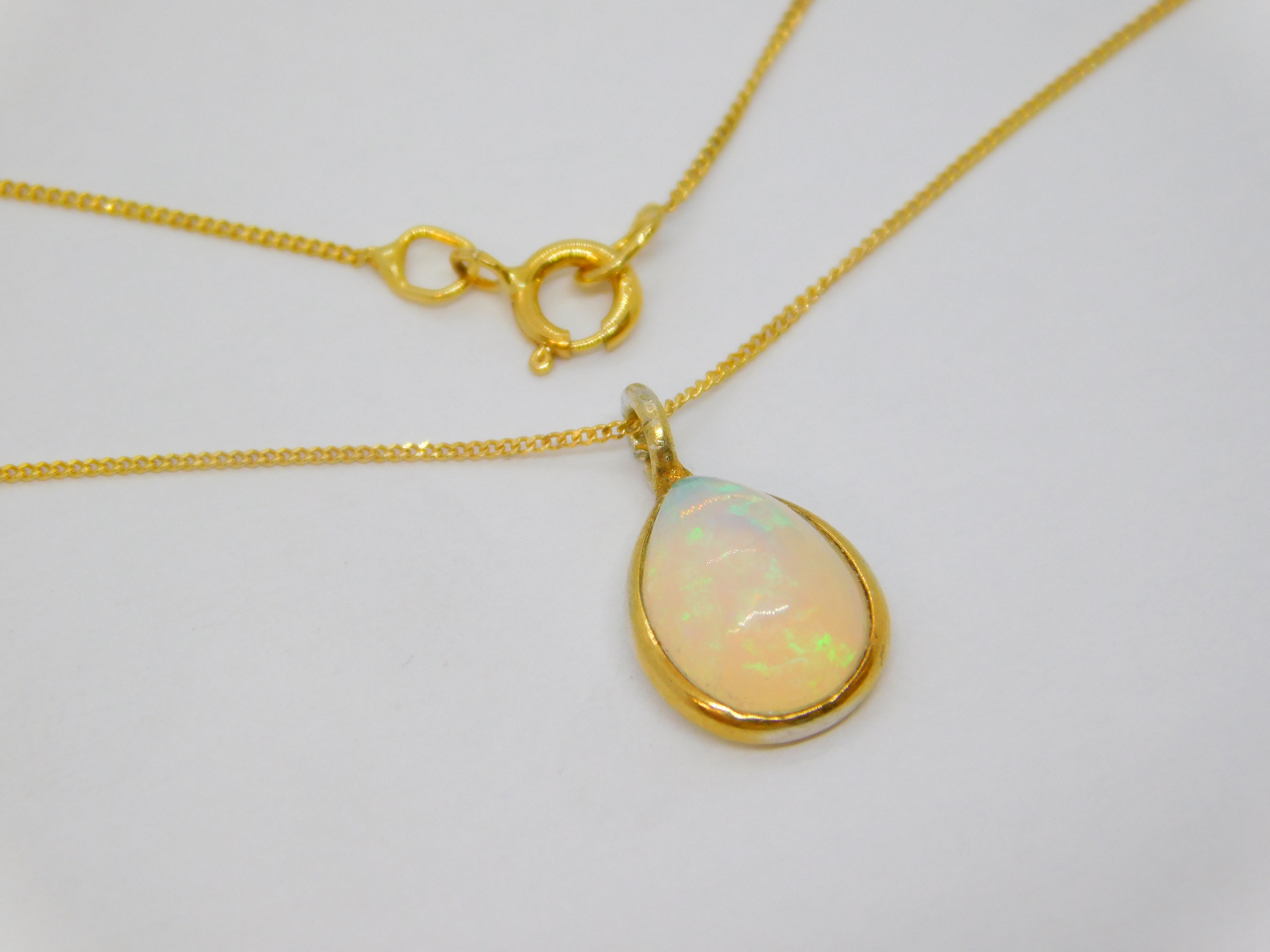 14ct Yellow Gold & Gilt Set Cabochon Opal Pendant Necklace Vintage c1970