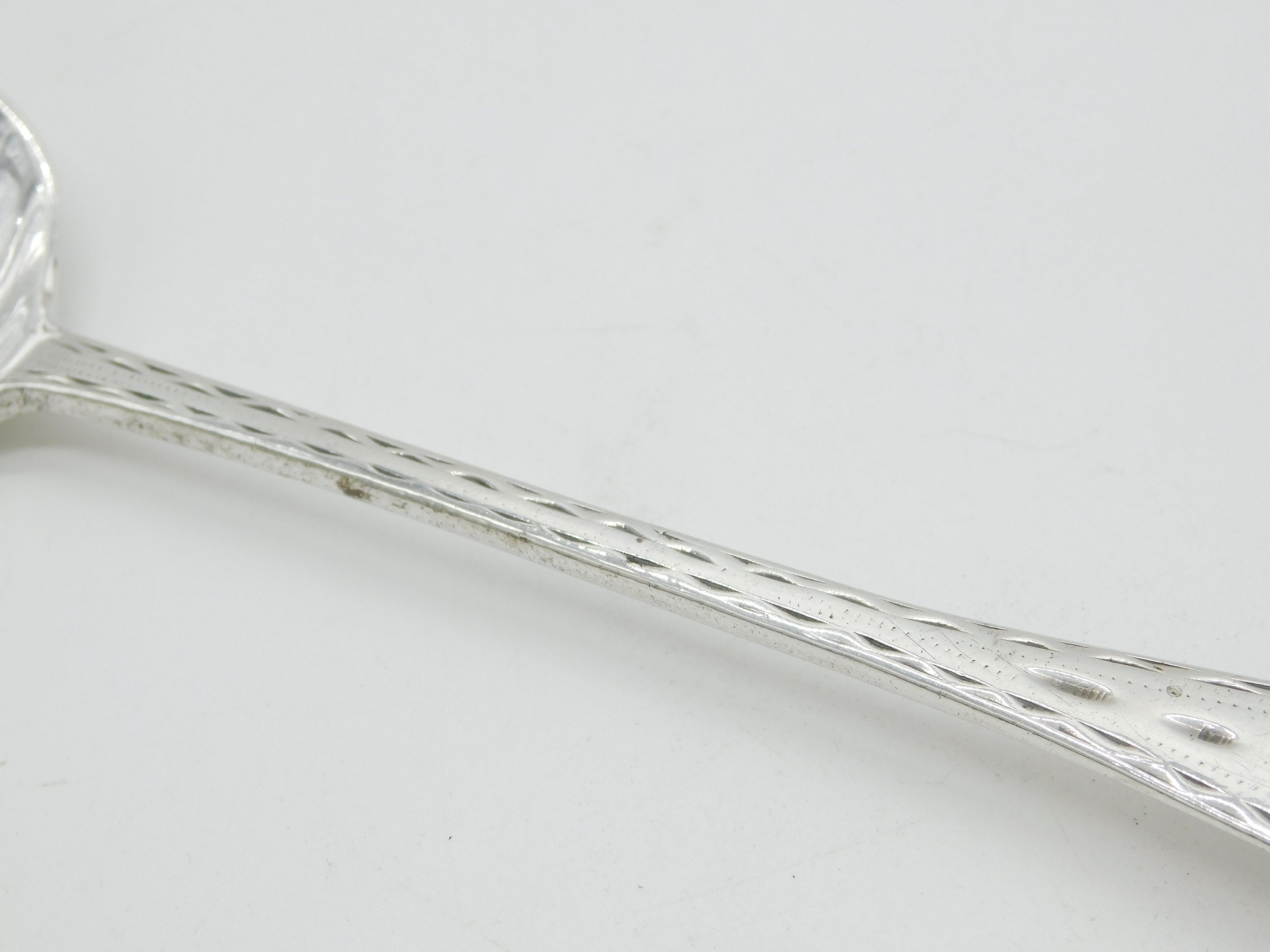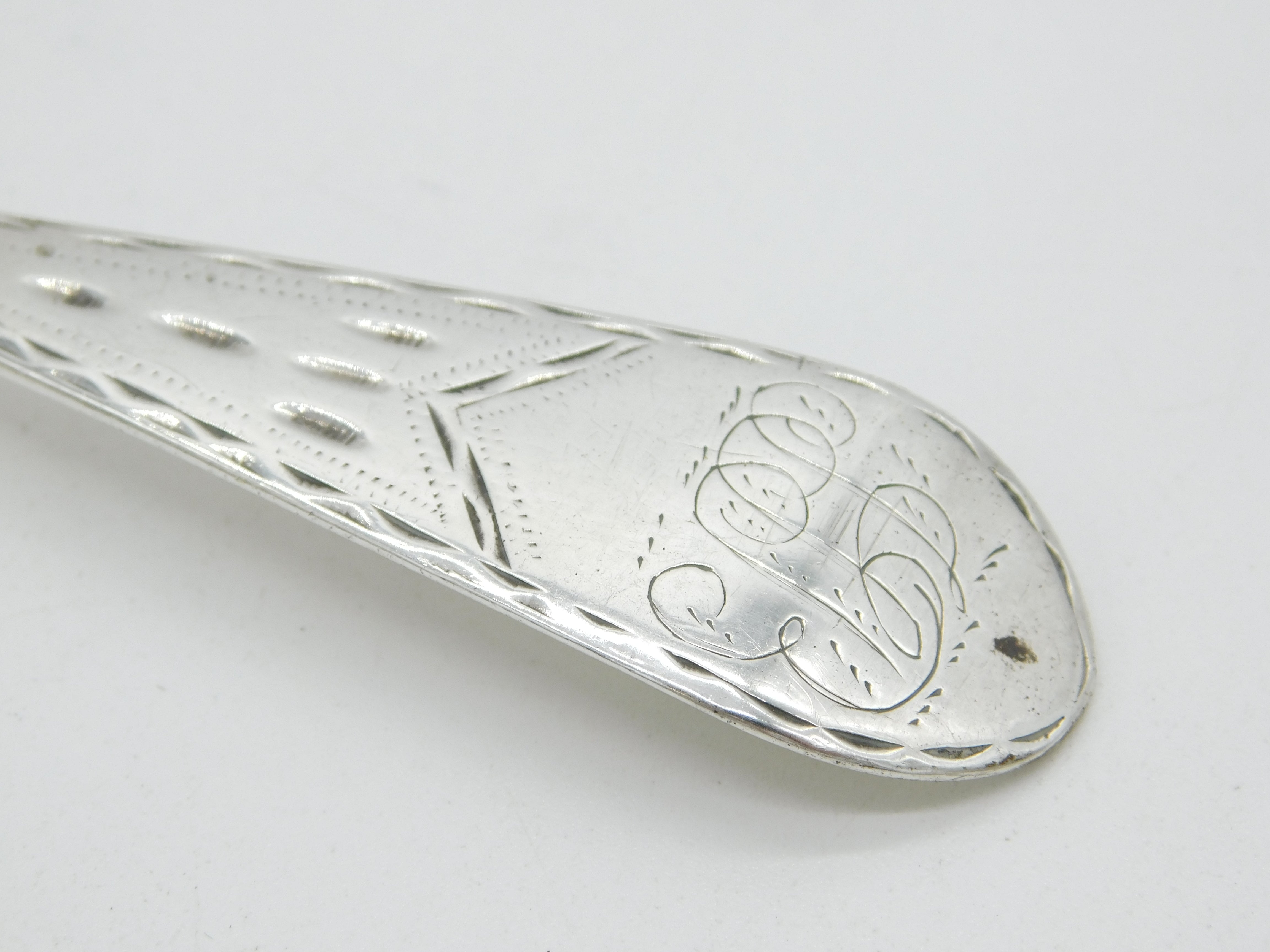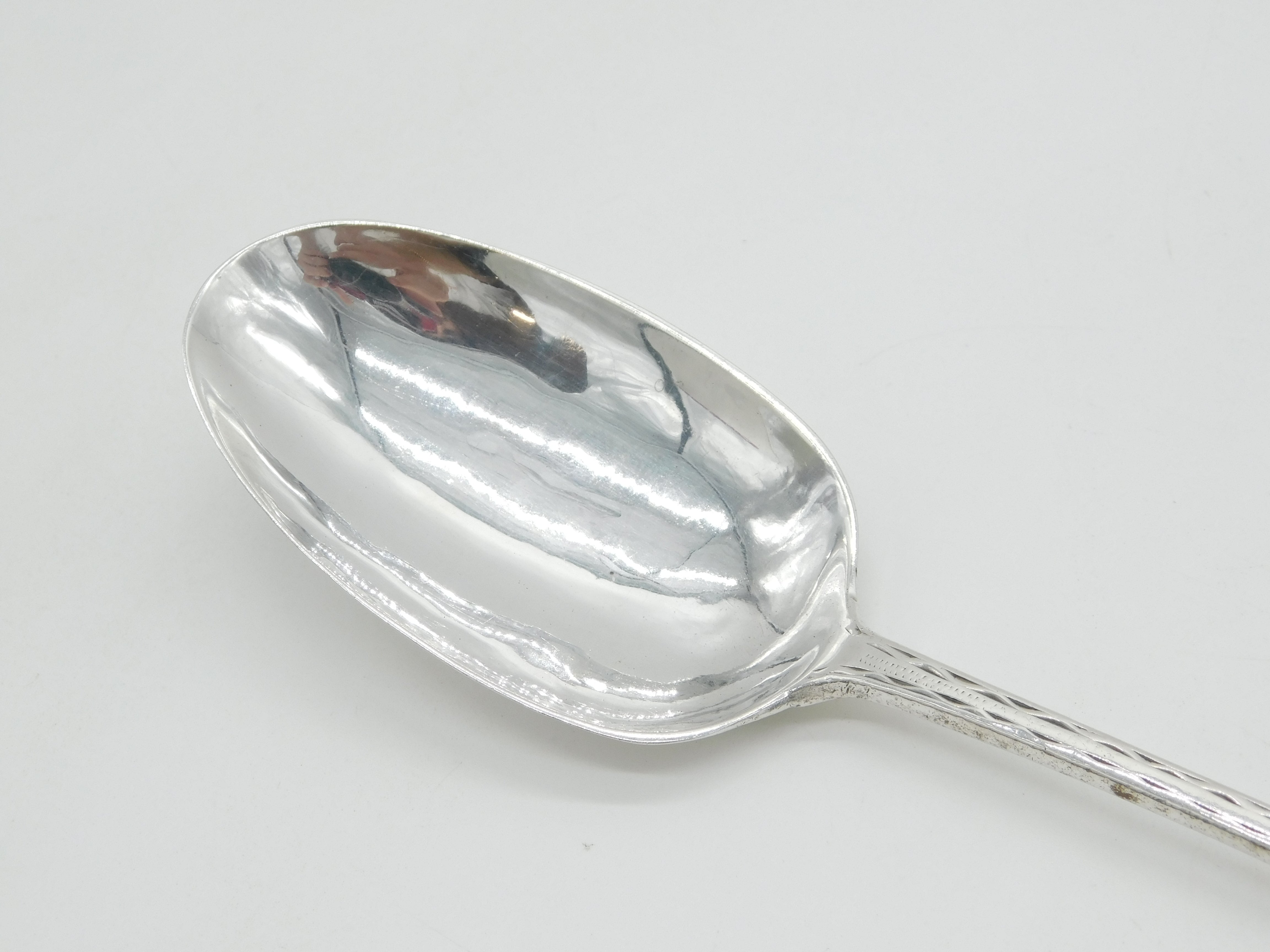 Details: A fantastic and wonderfully designed antique 18th century American sterling silver serving spoon with bright cut engraving throughout hallmarked to the reverse with double 'WB' makers marks believed to be by prestigious Philadelphia silversmith William Ball c1760. Although he often used 'W. Ball' named marks there also present examples of the simple WB impressed mark. This is a wonderful item that would make a perfect gift or addition to any collection.