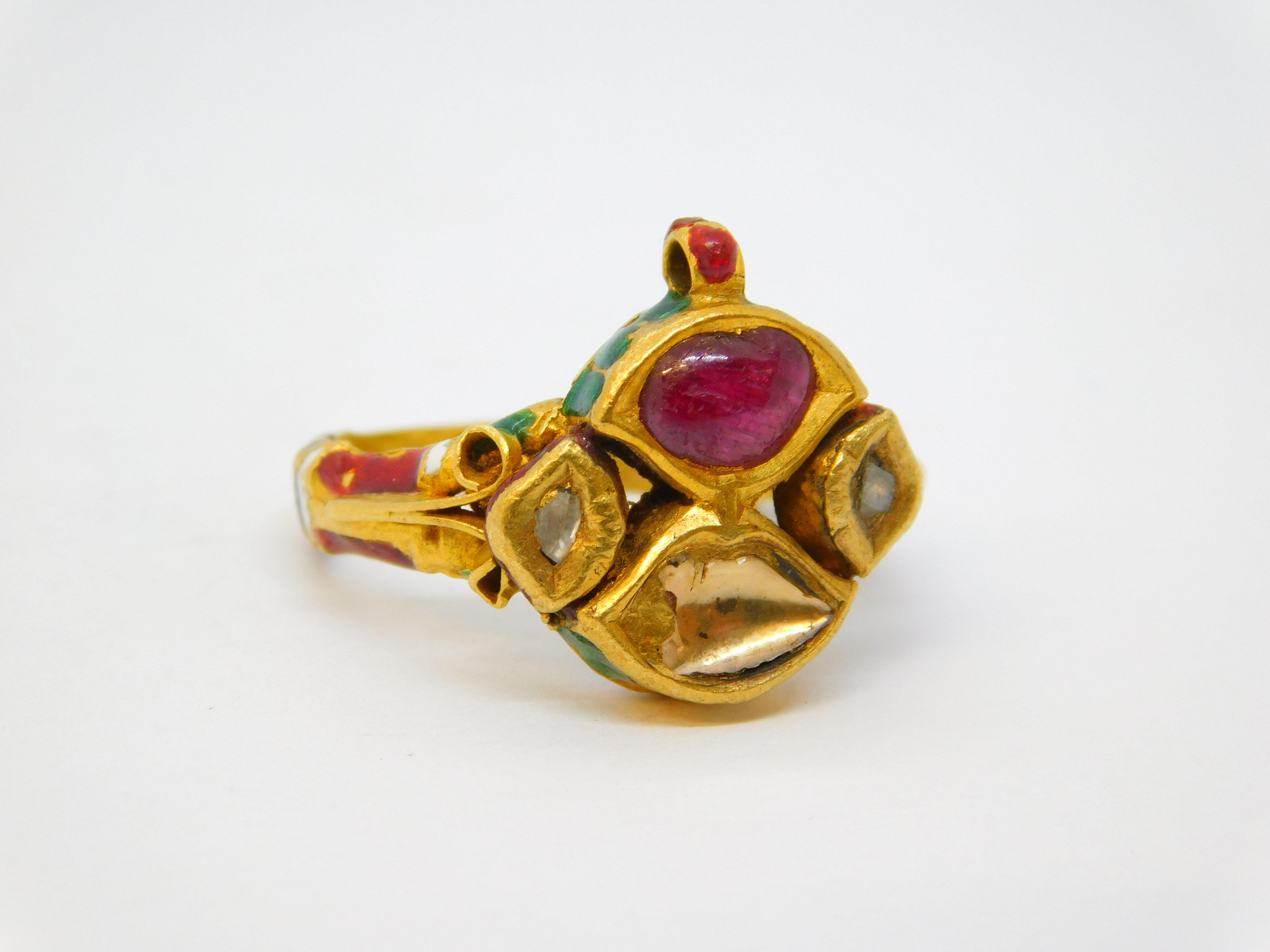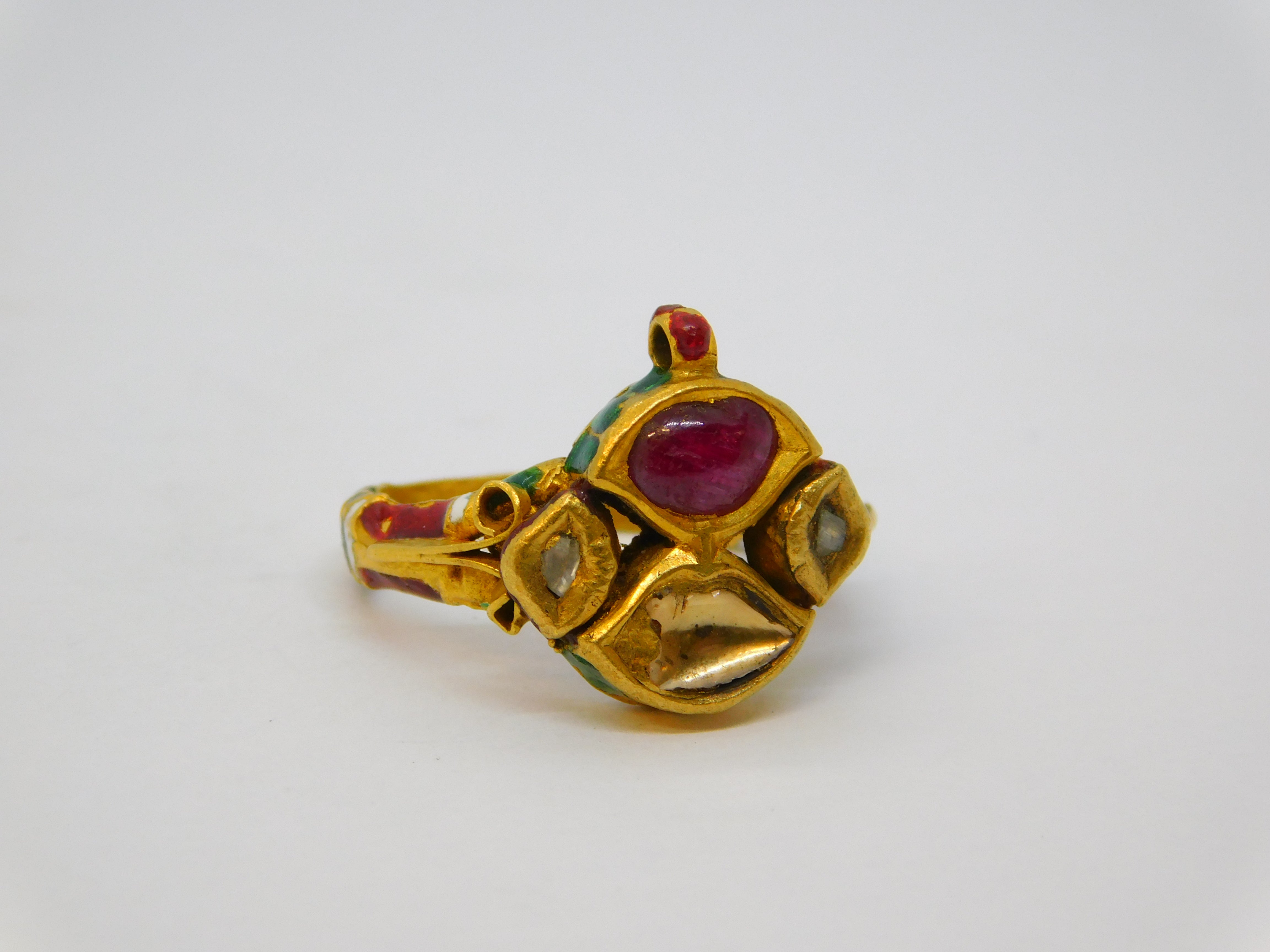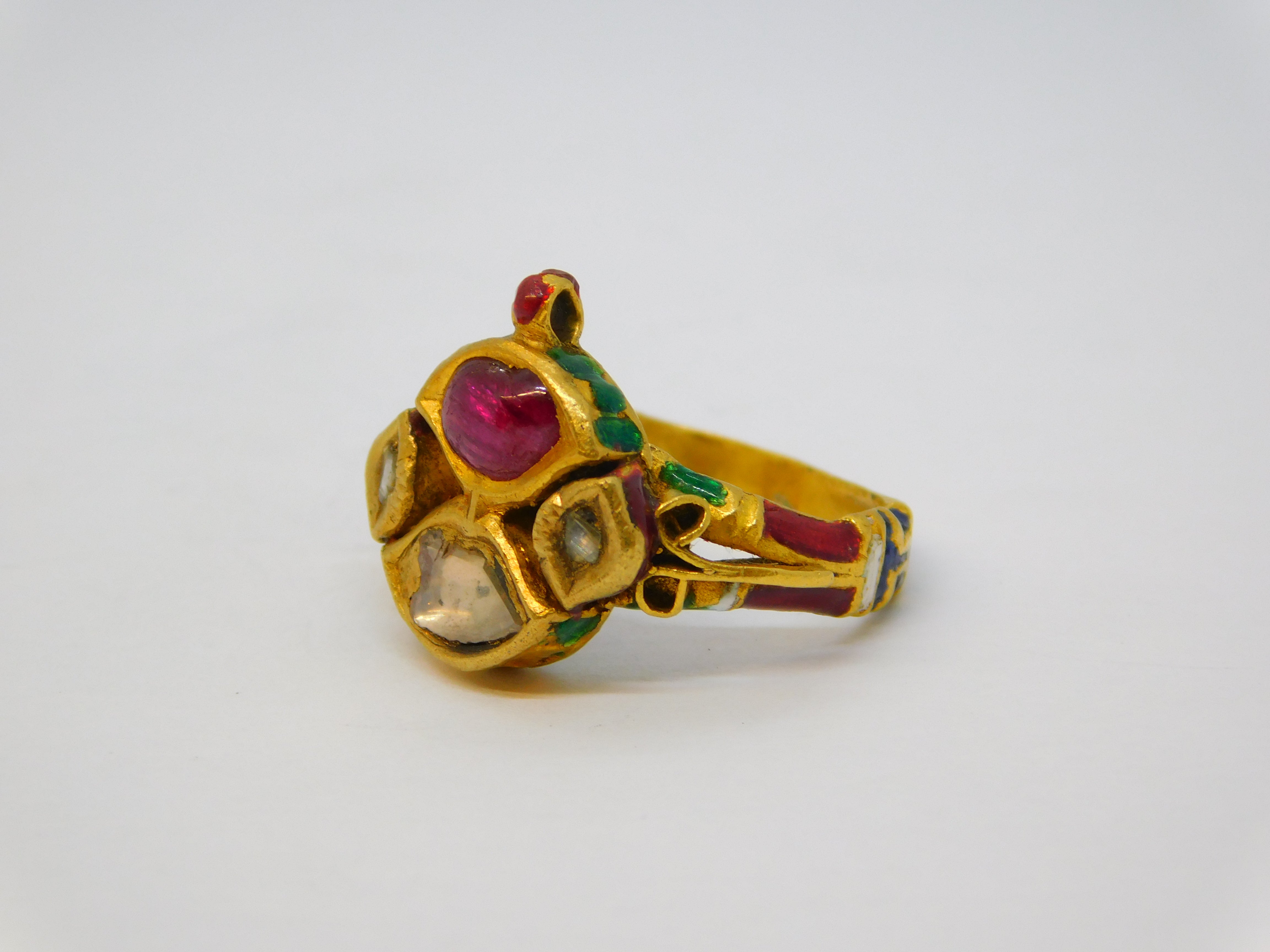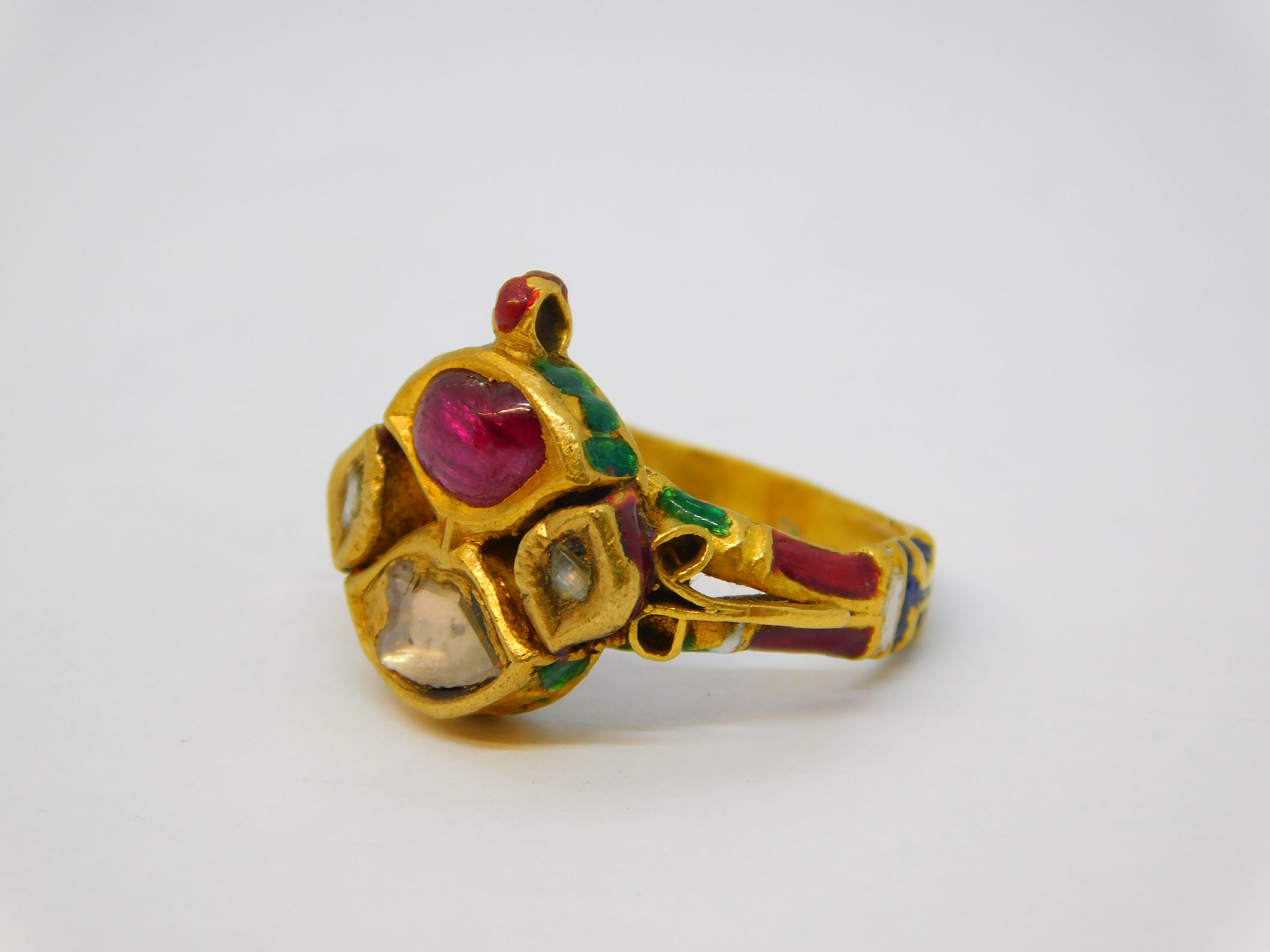 18th Century Mughal High-Carat Gold, Diamond, Ruby & Enamel Ring Antique Indian