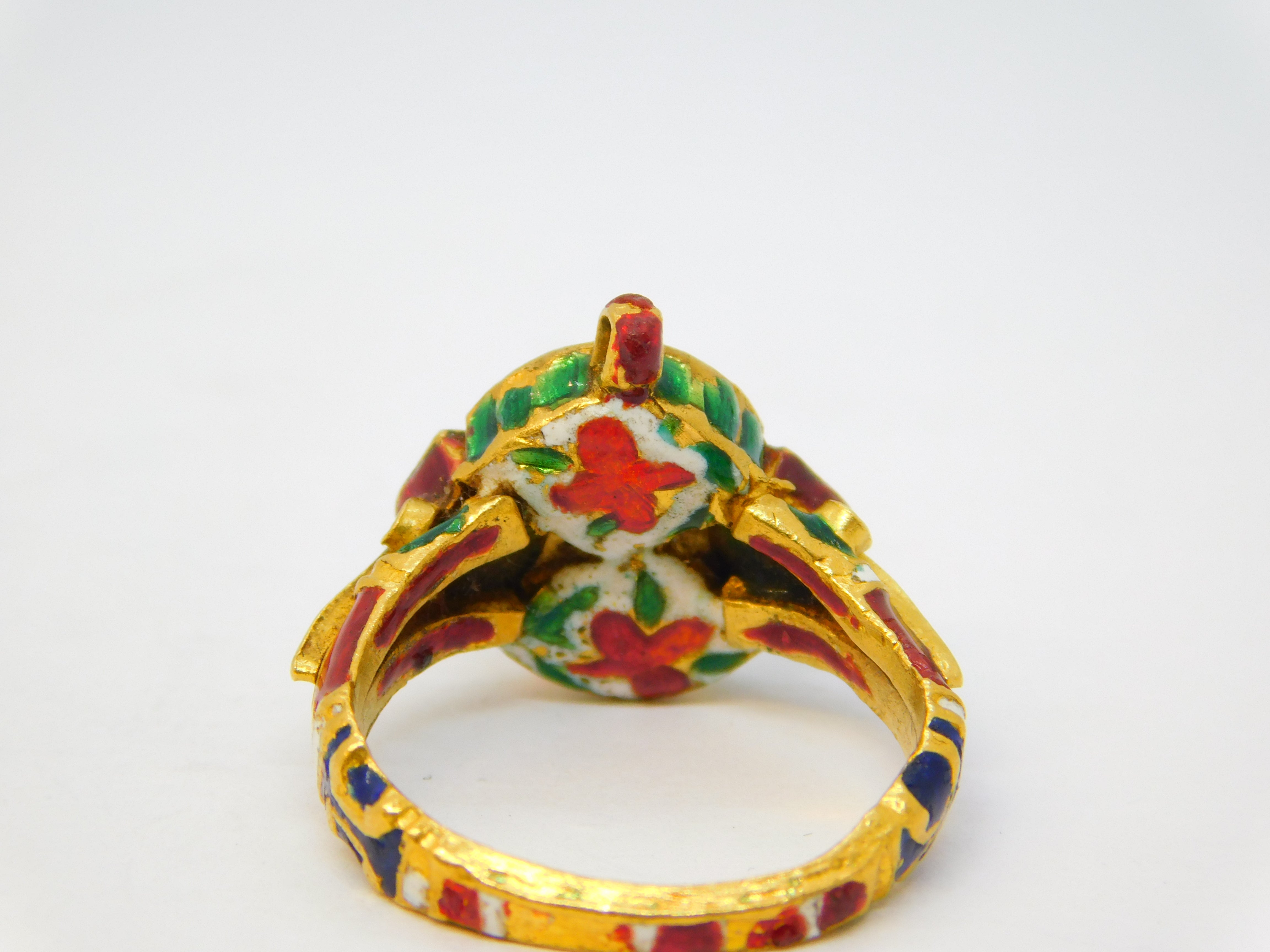 Details: A fantastic and wonderfully designed antique mid-18th century Indian Mughal period high carat gold (22ct-24ct) set with cabochon ruby over large old-cut diamond flanked by two smaller diamonds, adorned throughout with colourful enamel decoration including the reverse. The gold has been XRF tested as it is unmarked, the stones have all been tested. A superb antique example finished with exceptional quality. This is a wonderful item that would make a perfect gift or addition to any collection.