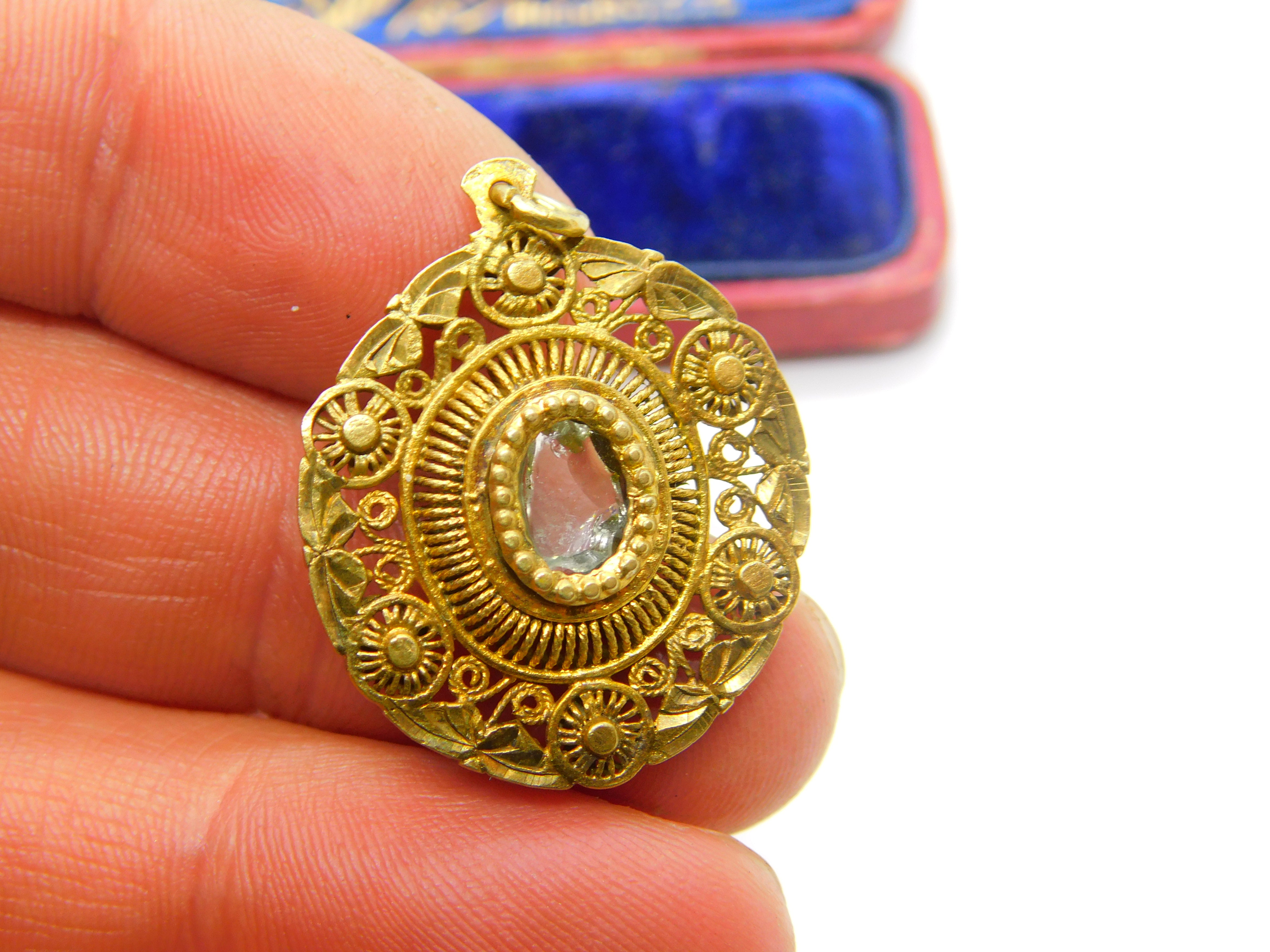 Details: A fantastic and wonderfully designed antique 18th century Spanish Colonial Philippines sterling silver gilt filigree form reliquary locket pendant with gorgeous detail c1780 - the central glass is a little cracked but a lovely early example nonetheless. This is a wonderful item that would make a perfect gift or addition to any collection. The BOX pictured is for PRESENTATION ONLY and is NOT included in the listings but used to frame the pictures unless specifically stated otherwise.