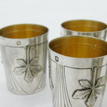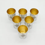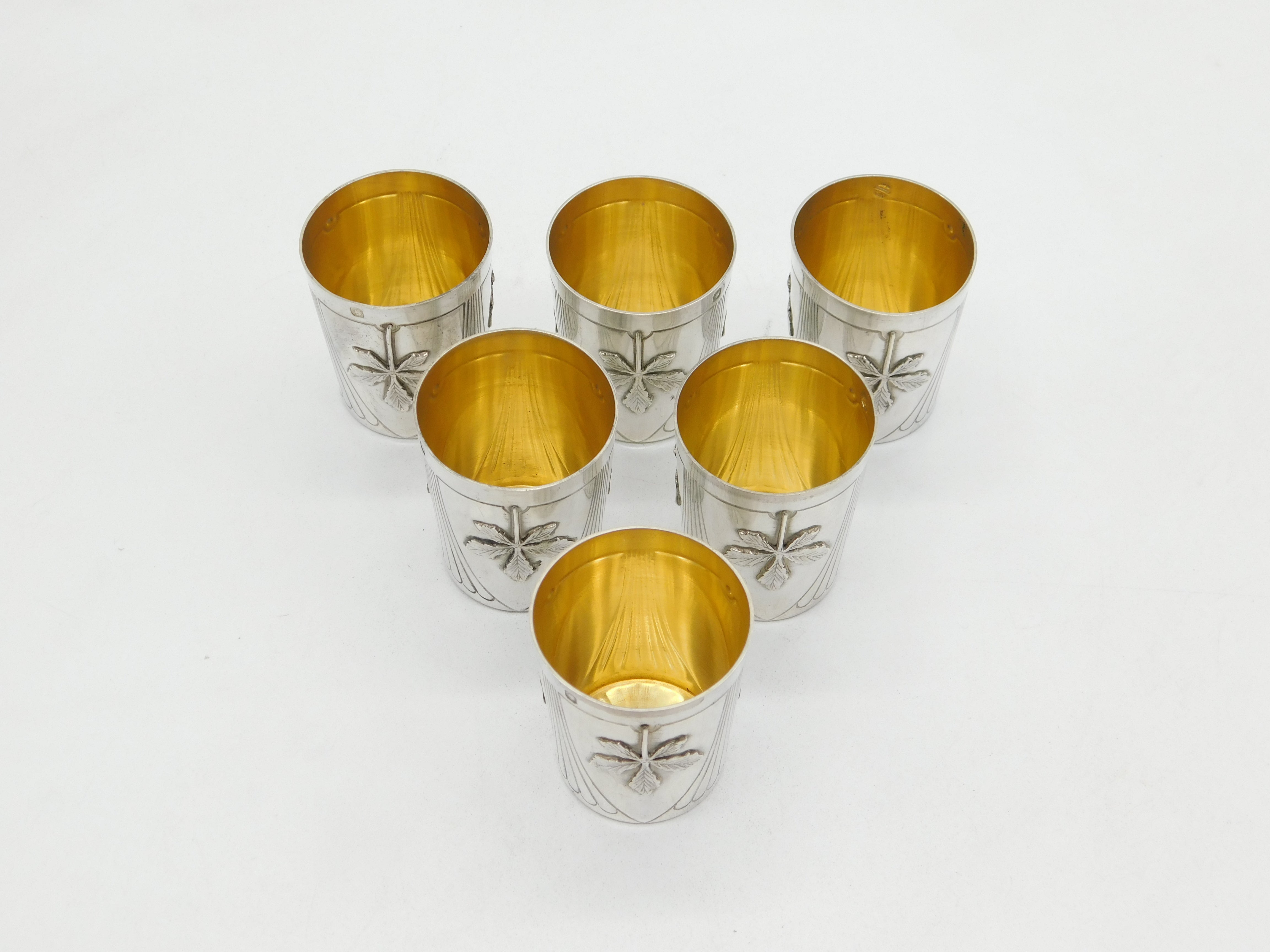 Details: A fantastic and wonderfully designed antique French 19th century set of six .950 grade silver shot goblets each gilded to the interior and adorned with charming art nouveau patterns, hallmarked with minerva head purity marks by Parisian marker Alphonse Debain. This is a wonderful item that would make a perfect gift or addition to any collection.