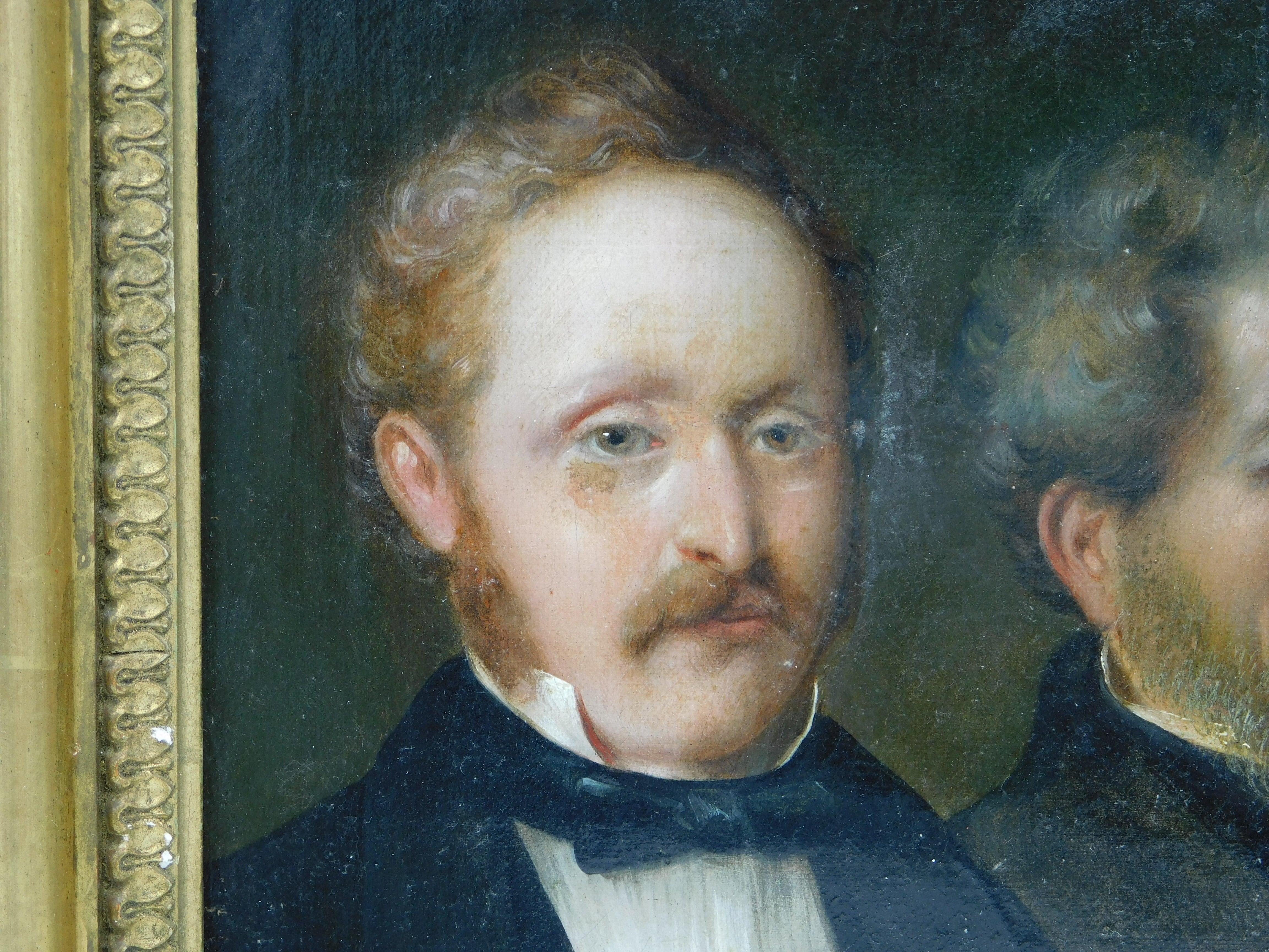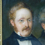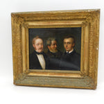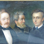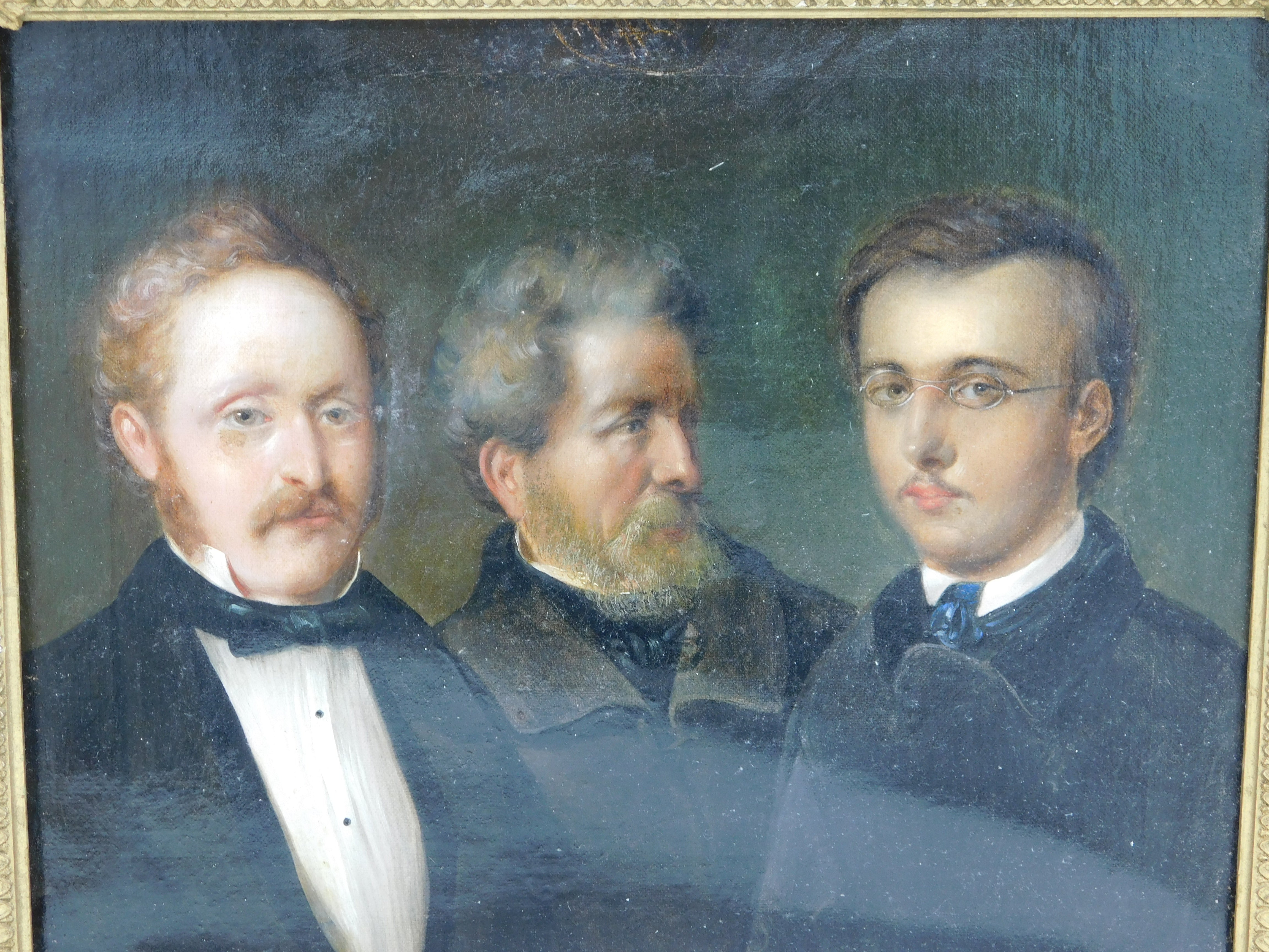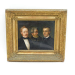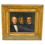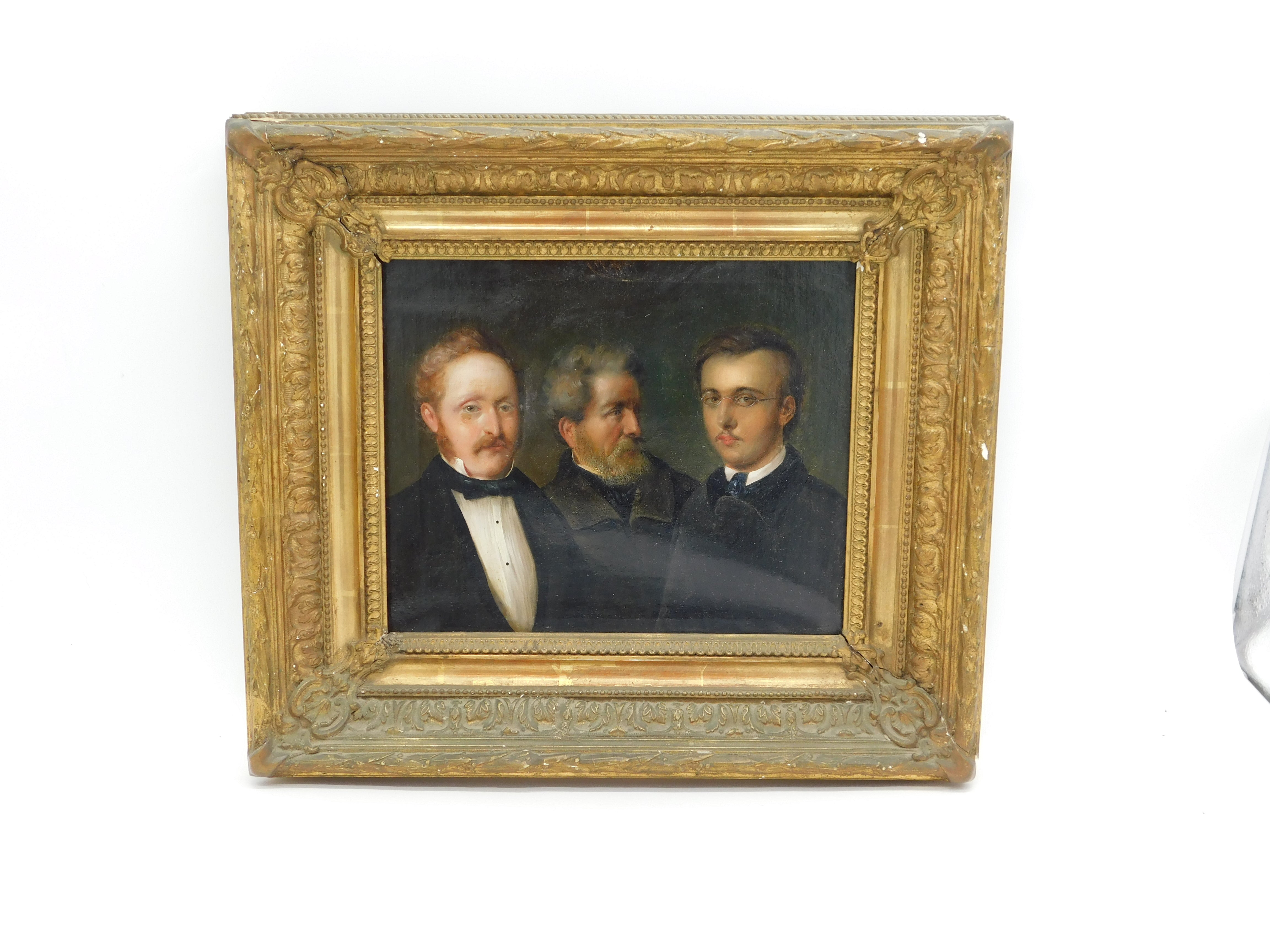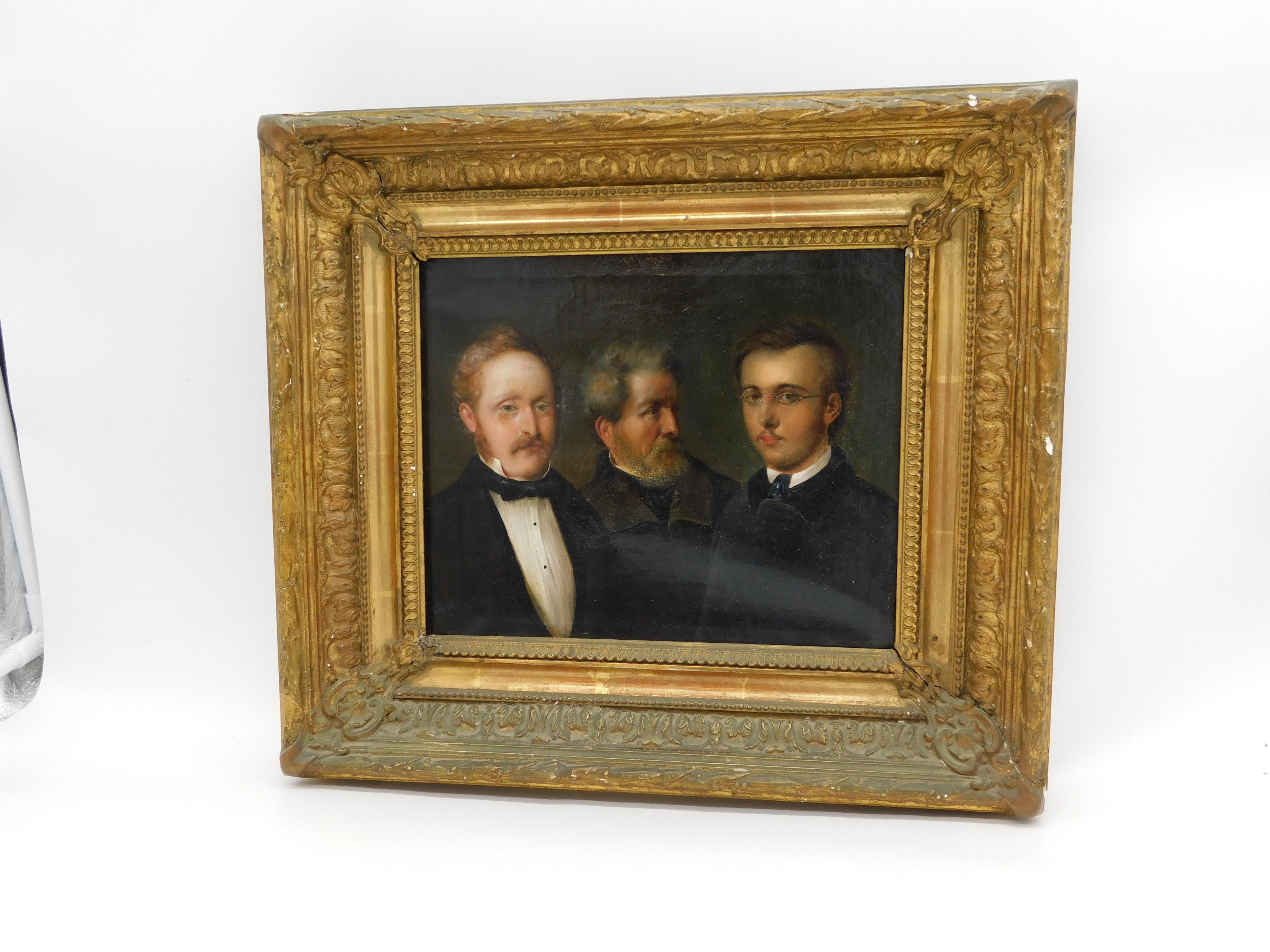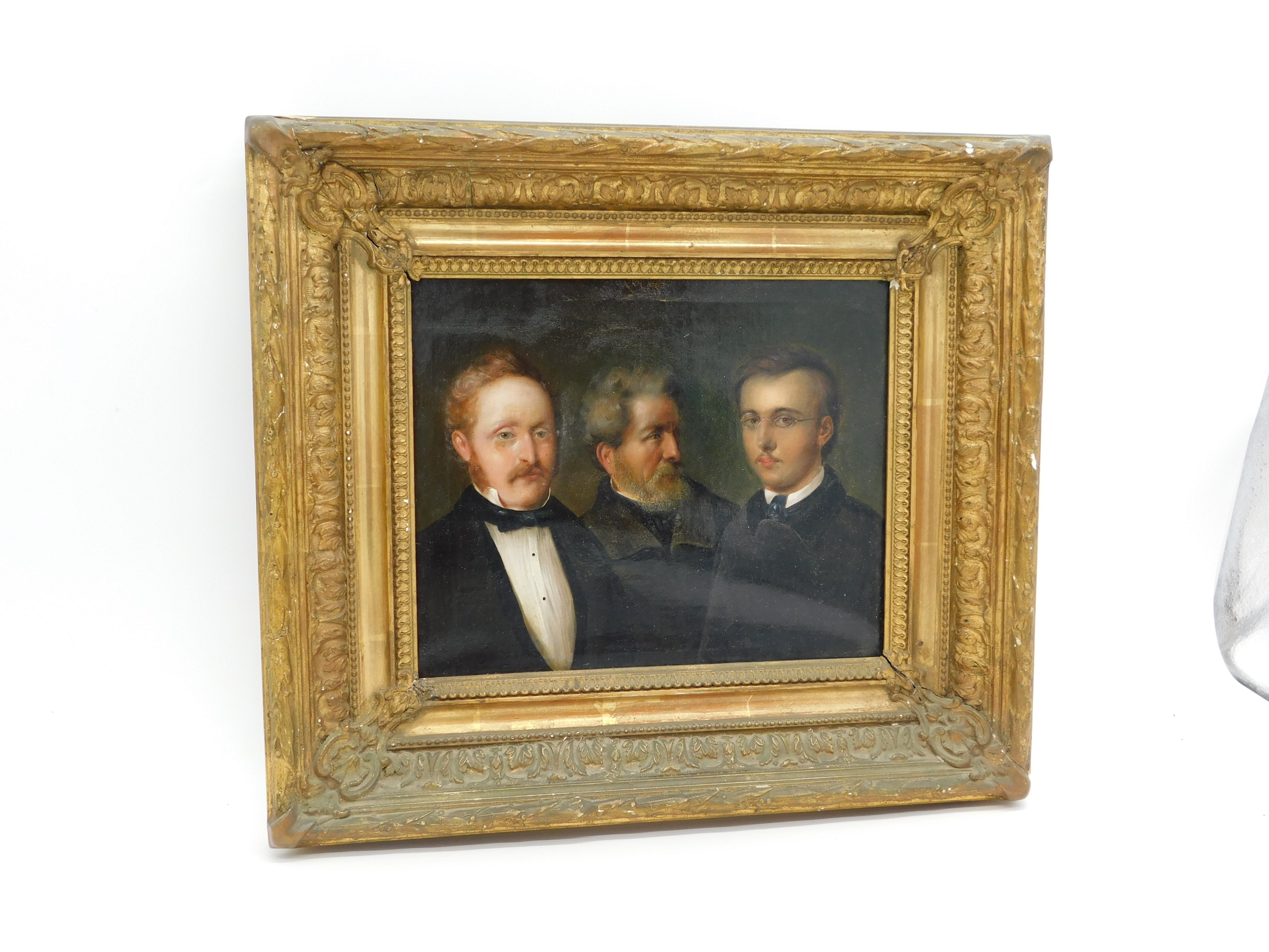 Details: A fantastic and wonderfully designed antique 19th century German school oil on canvas scarce triple family portrait believed to depict a grandfather, father and son, each member of the portrait dress in their finest clothing all looking wistfully in different directions. The portrait is well finished and set in a period gilt & gesso frame. Unsigned although the outer sections of the portrait are obscured by the frame. Potentially repaired to the reverse of the canvas please see pictures. This is a wonderful item that would make a perfect gift or addition to any collection.
