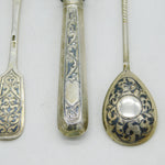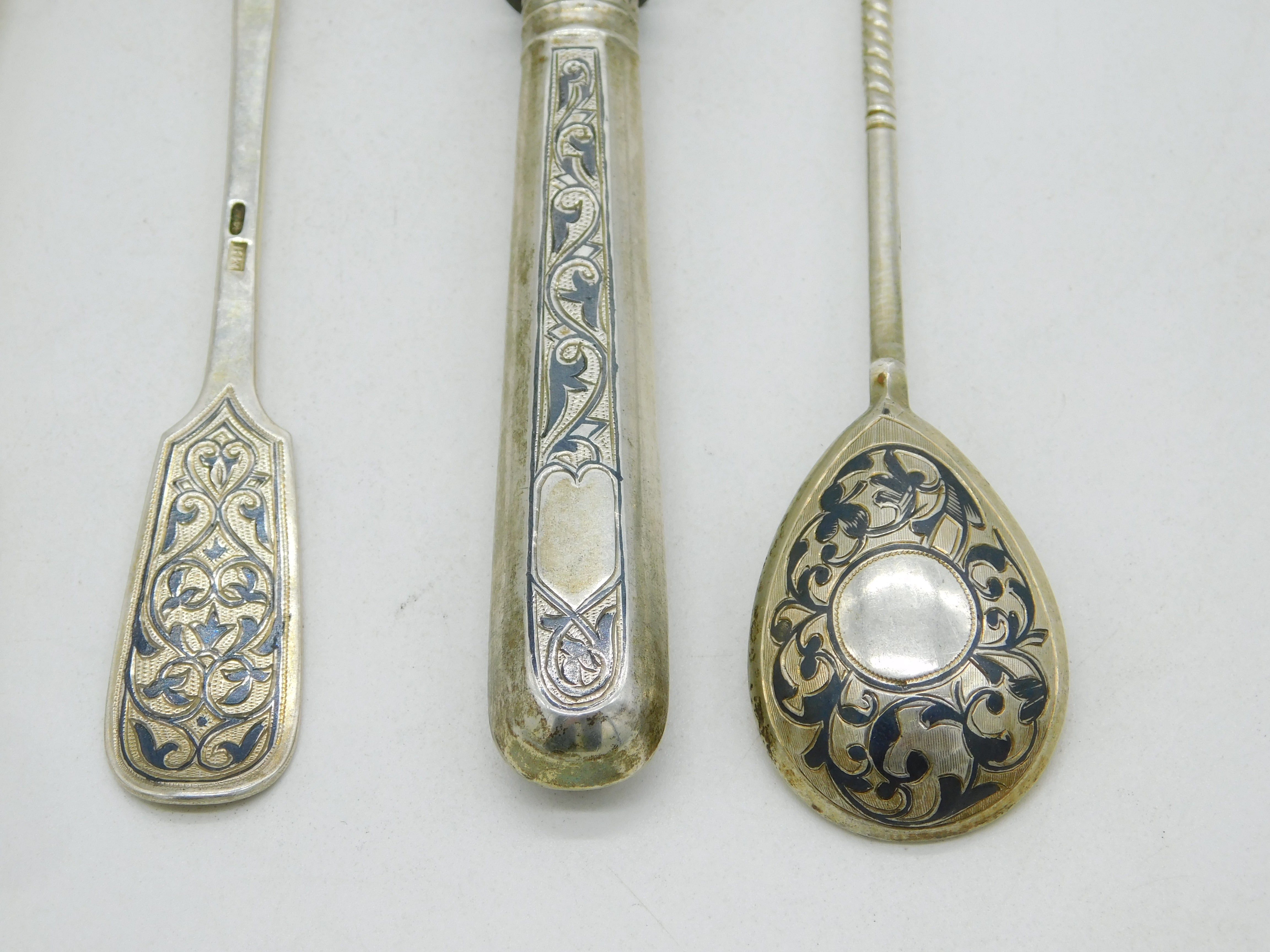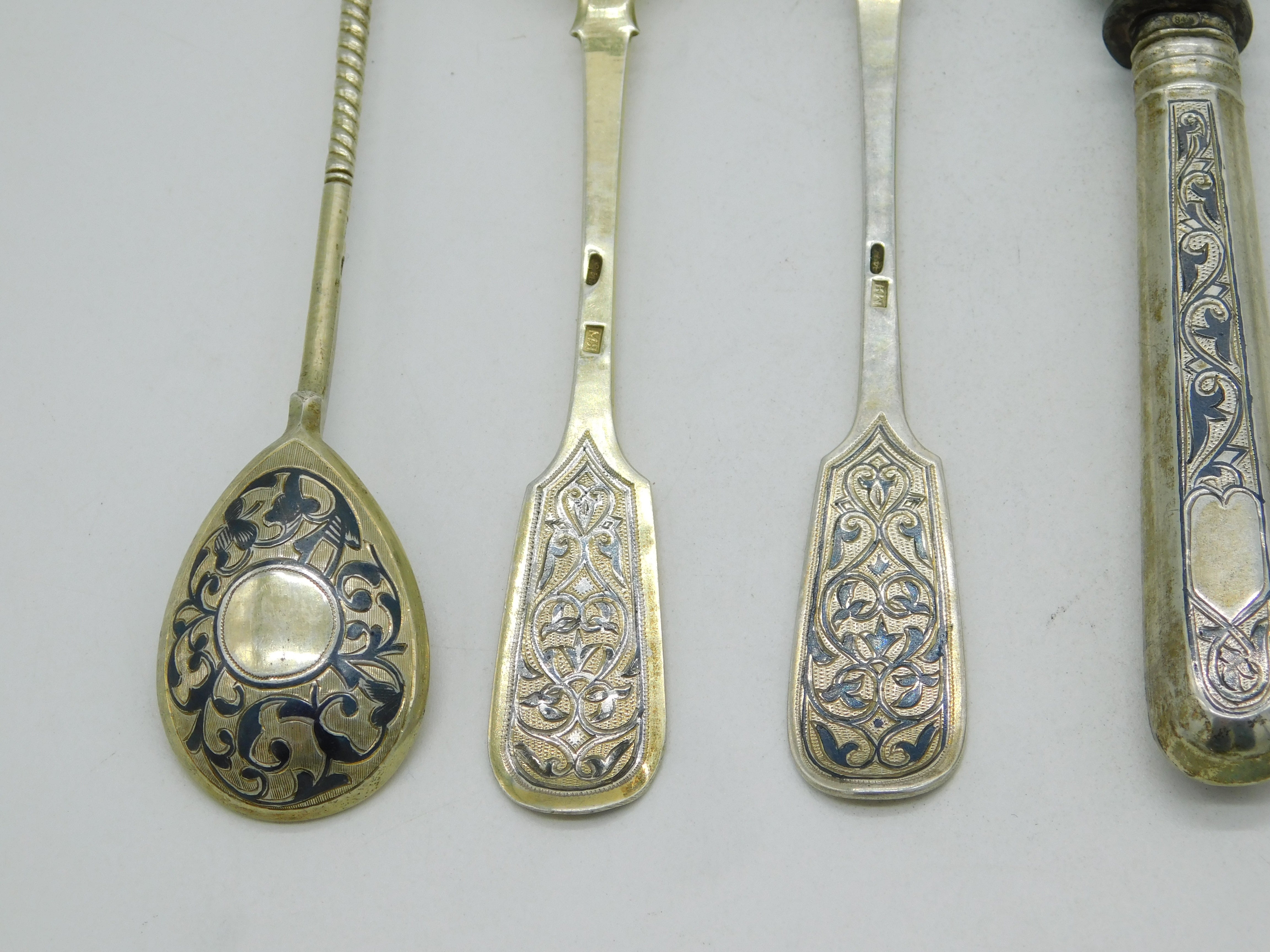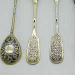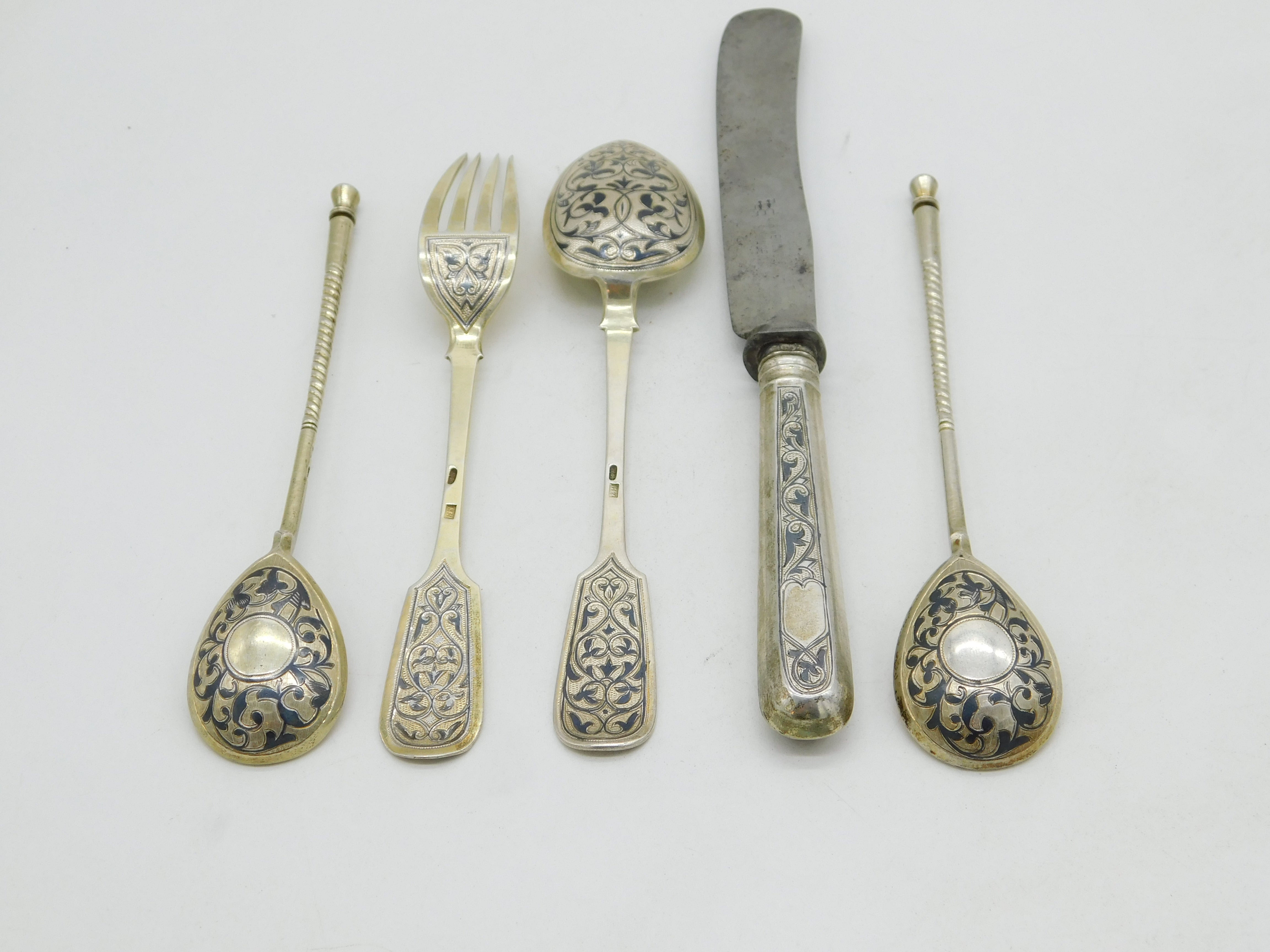 Details: A fantastic and wonderfully designed antique 19th century Imperial Russian set of .84 silver & niello enamel cutlery to include knife, fork & tablespoons and two further teaspoons all fully hallmarked and all adorned with lovely patterns c1880s. This is a wonderful item that would make a perfect gift or addition to any collection. We are more than happy to provide XRF reports for items upon request.
