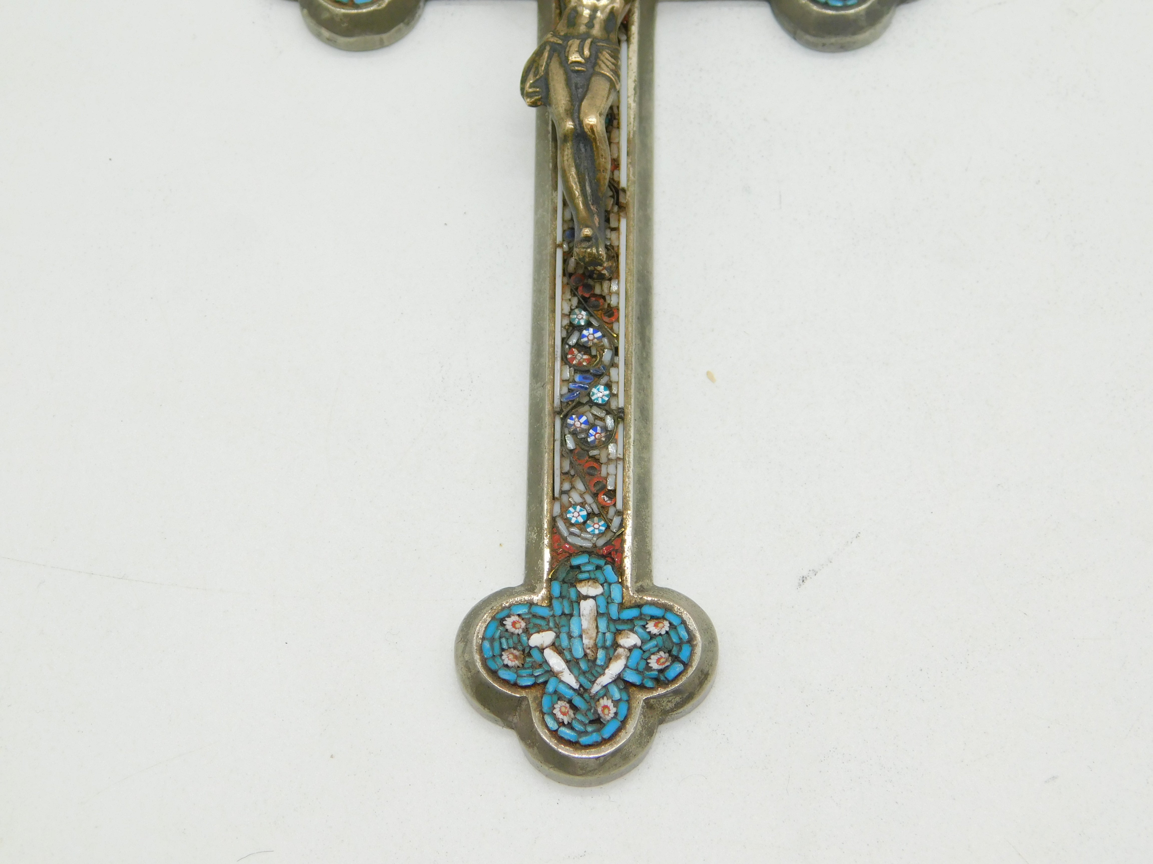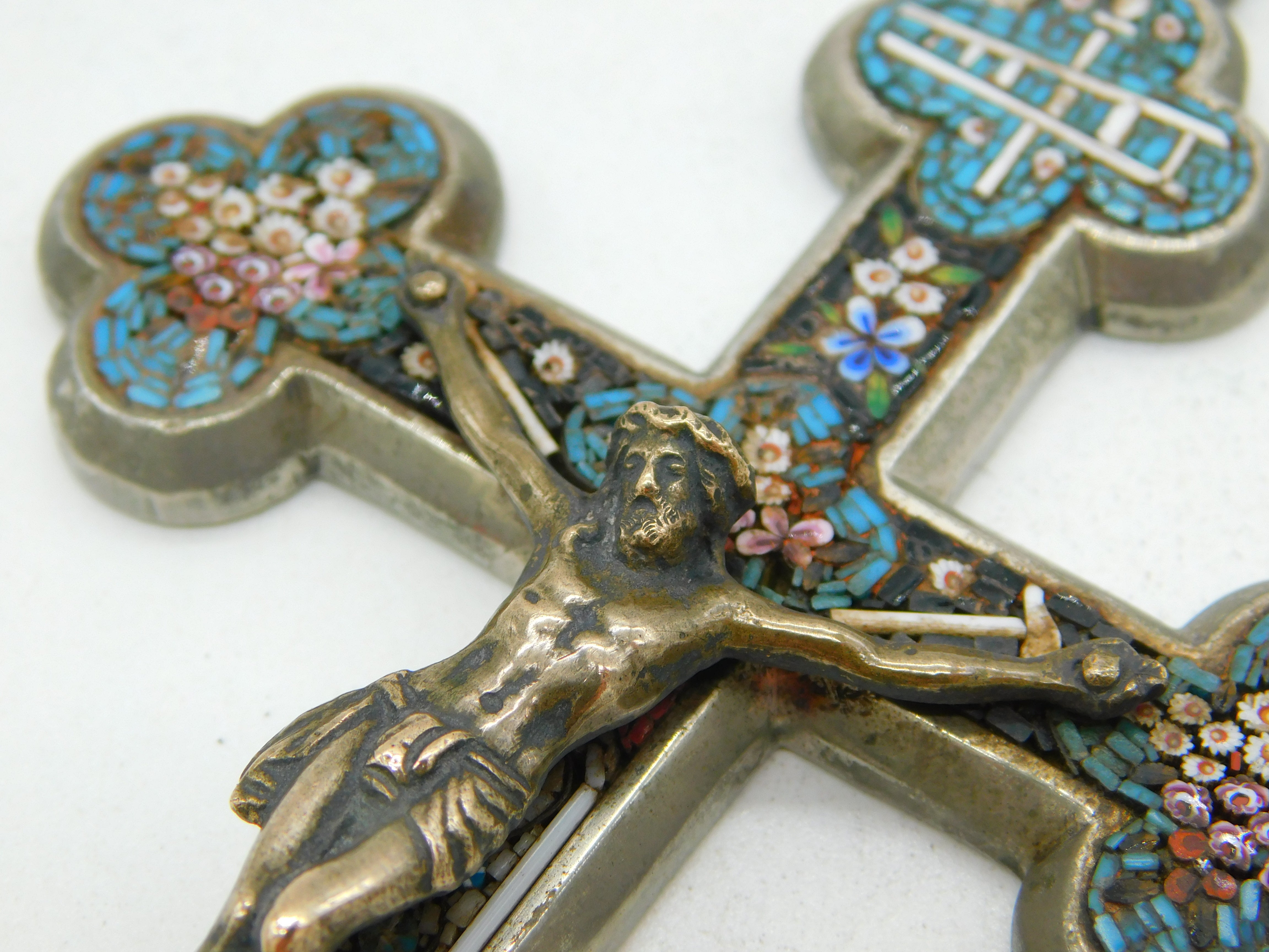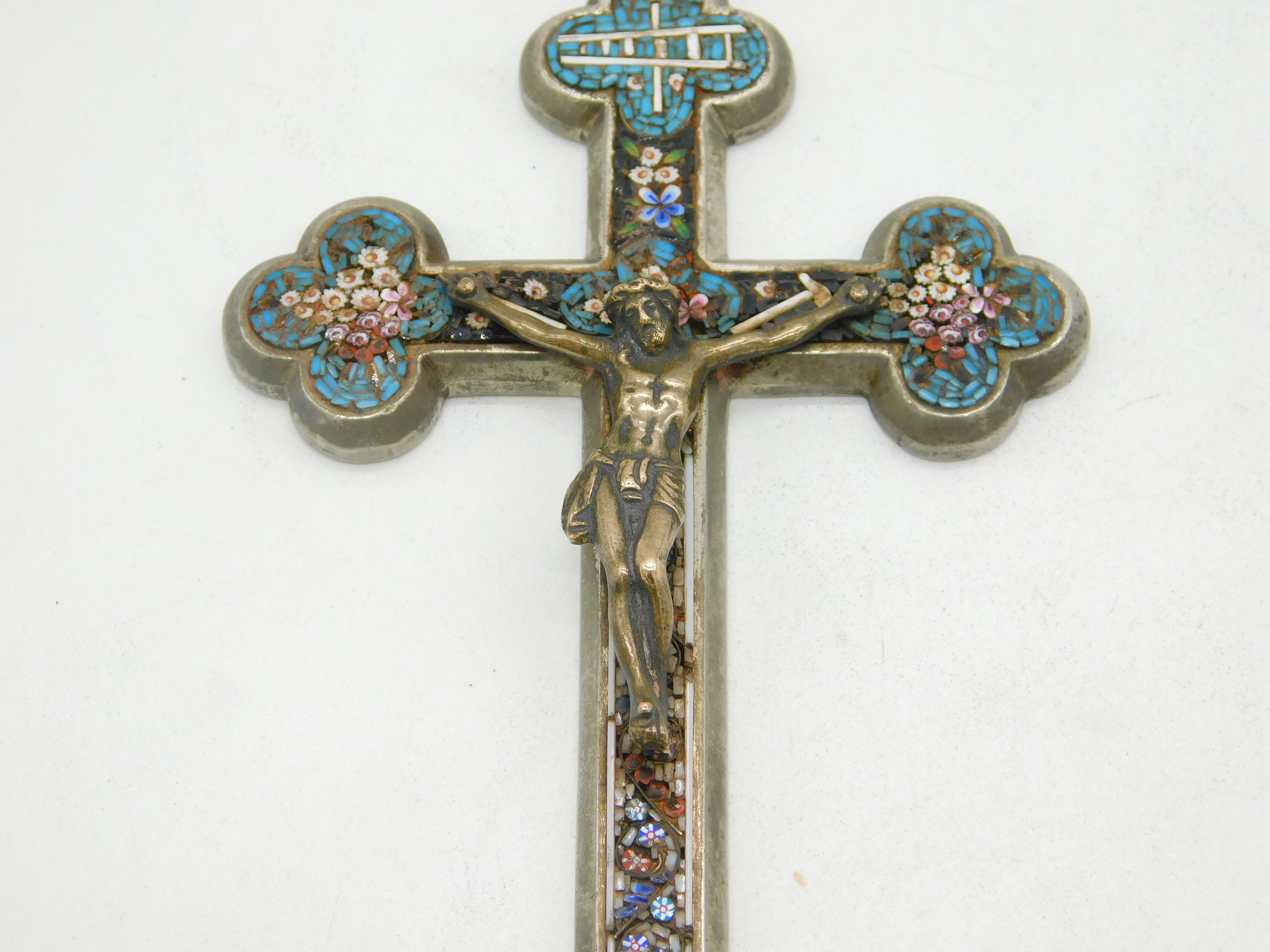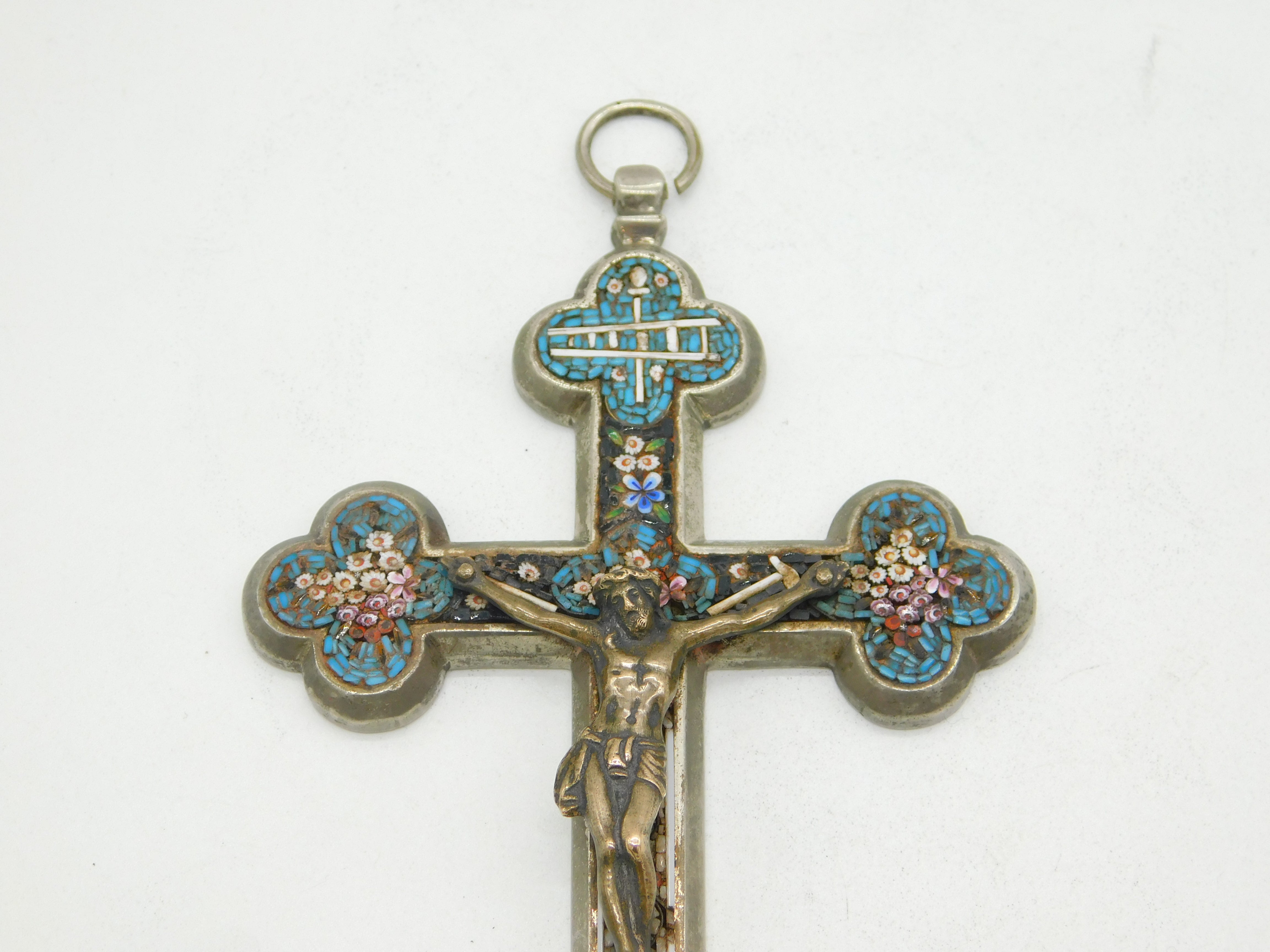Details: A fantastic and wonderfully designed antique 19th century Italian large white metal corpus christi crucifix with silvered bronze christ to the front adorned throughout with superb floral micro mosaic decorations c1880. Bale ring to the top so could be hung as a decoration or worn as a large medallion. This is a wonderful item that would make a perfect gift or addition to any collection.