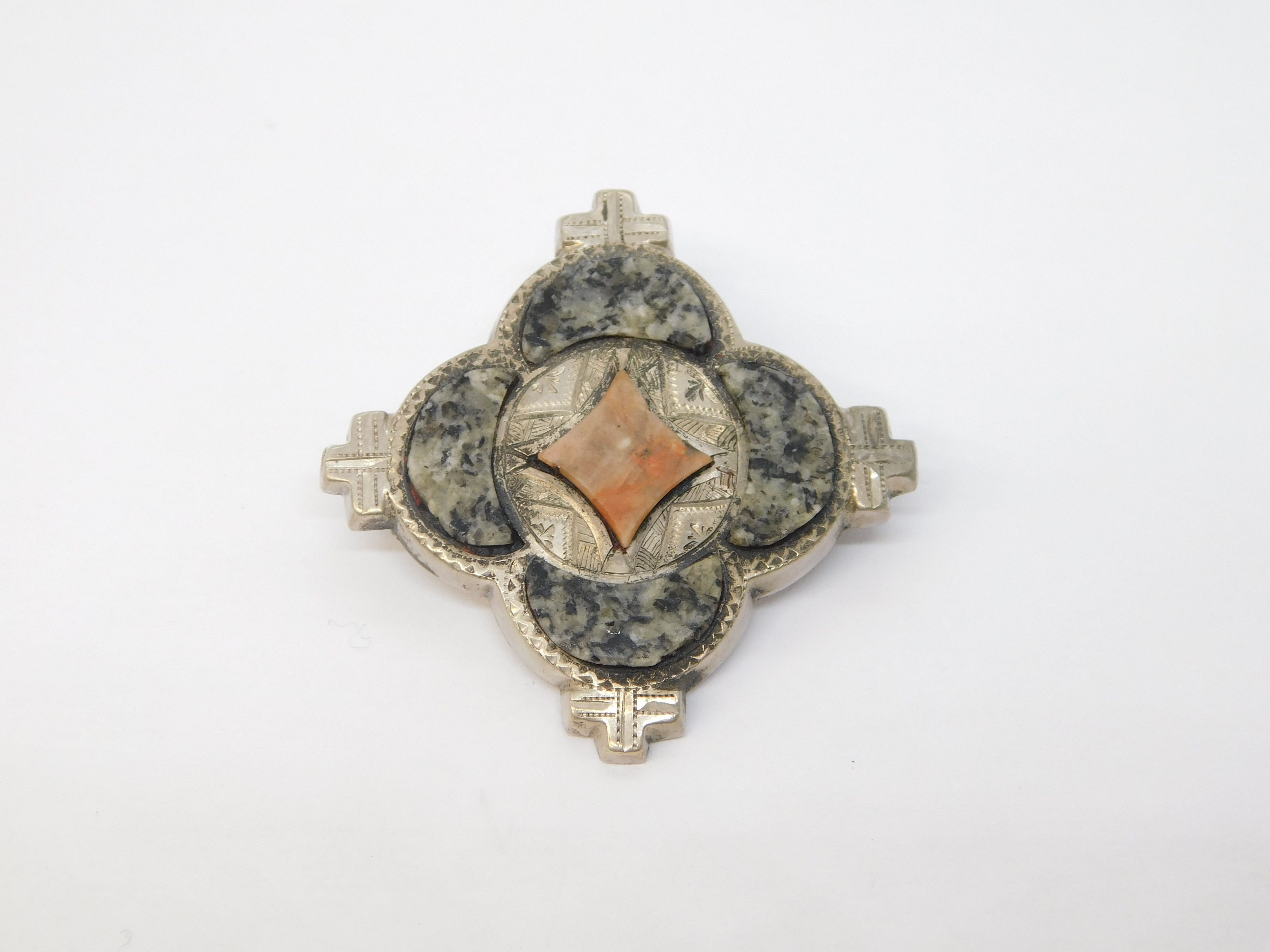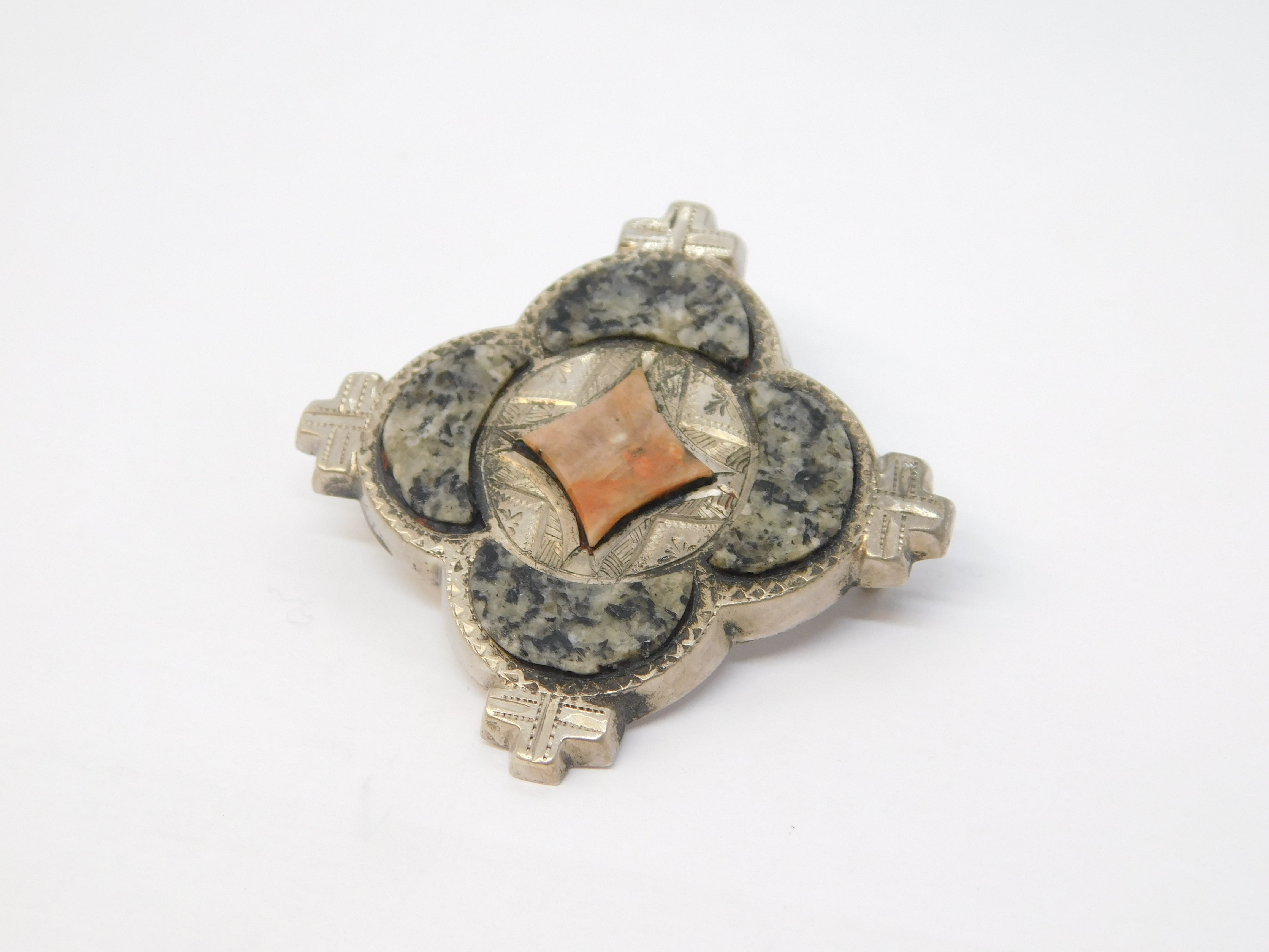 Details: A fantastic and wonderfully designed antique Victorian Scottish sterling silver cross pattern brooch set with sections of granite surrounding a central carnelian agate panel c1860, the silver has been XRF tested as it is unmarked. This is a wonderful item that would make a perfect gift or addition to any collection.