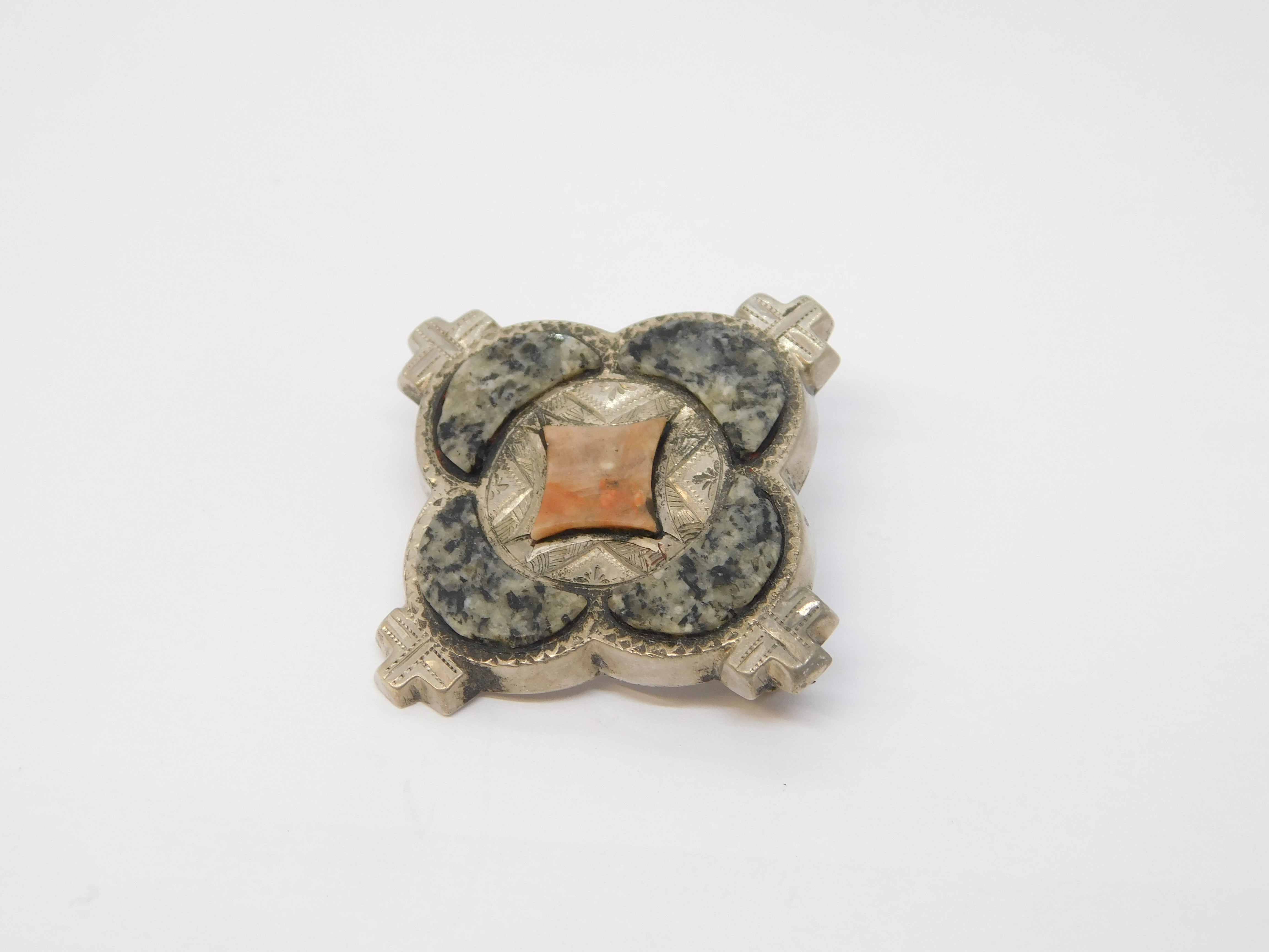 19th Century Scottish Sterling Silver, Granite & Carnelian Agate Brooch Antique