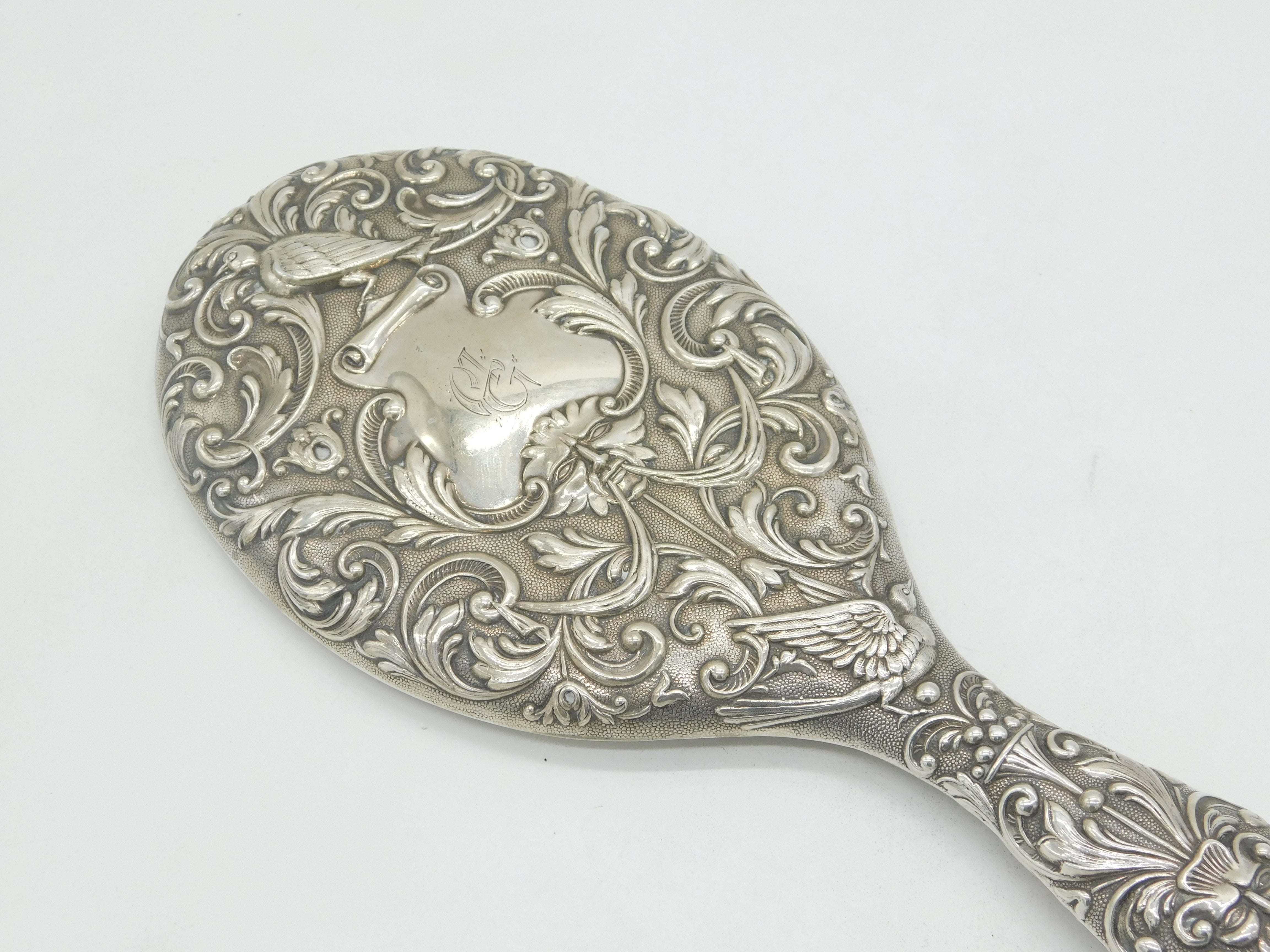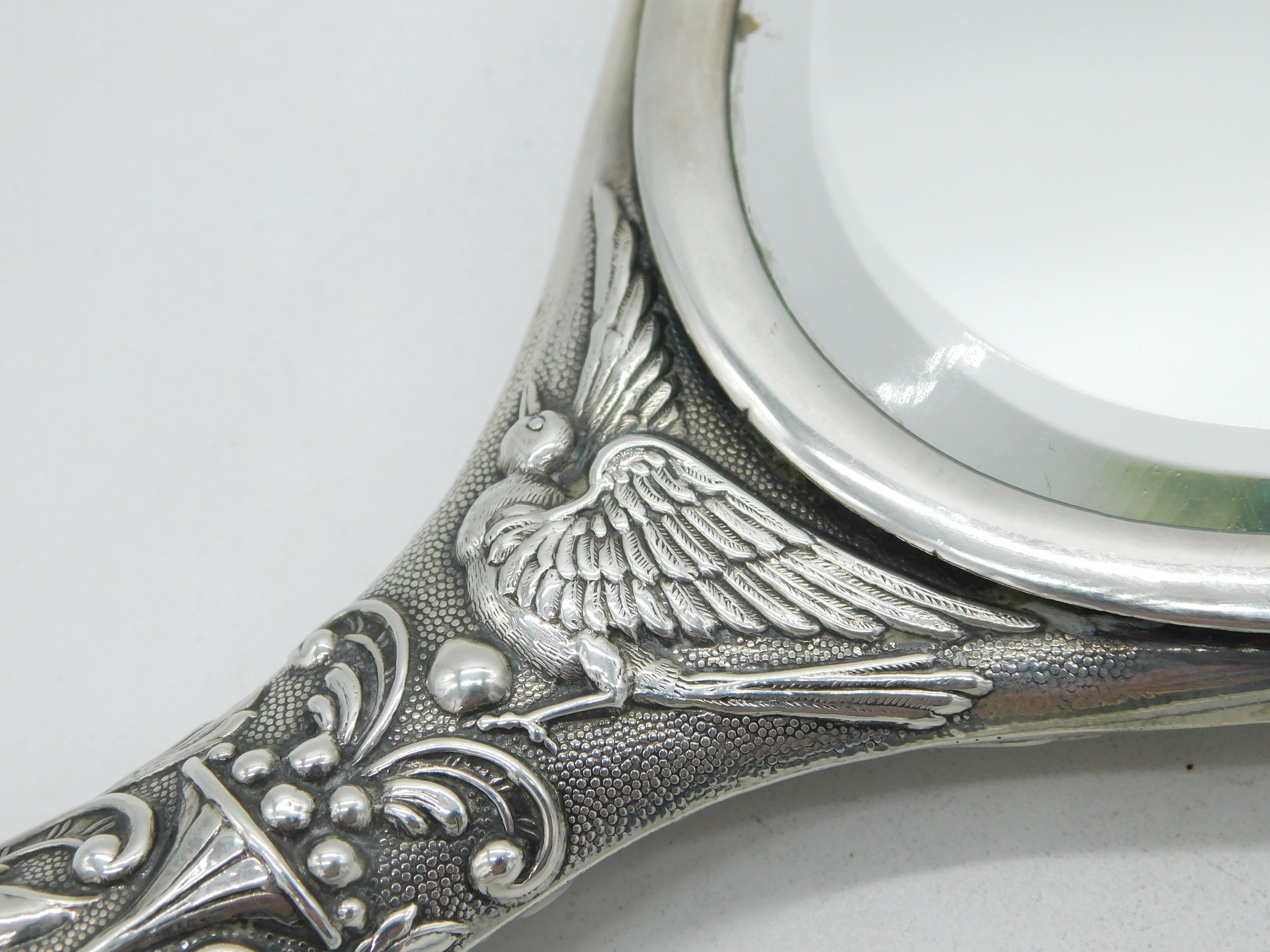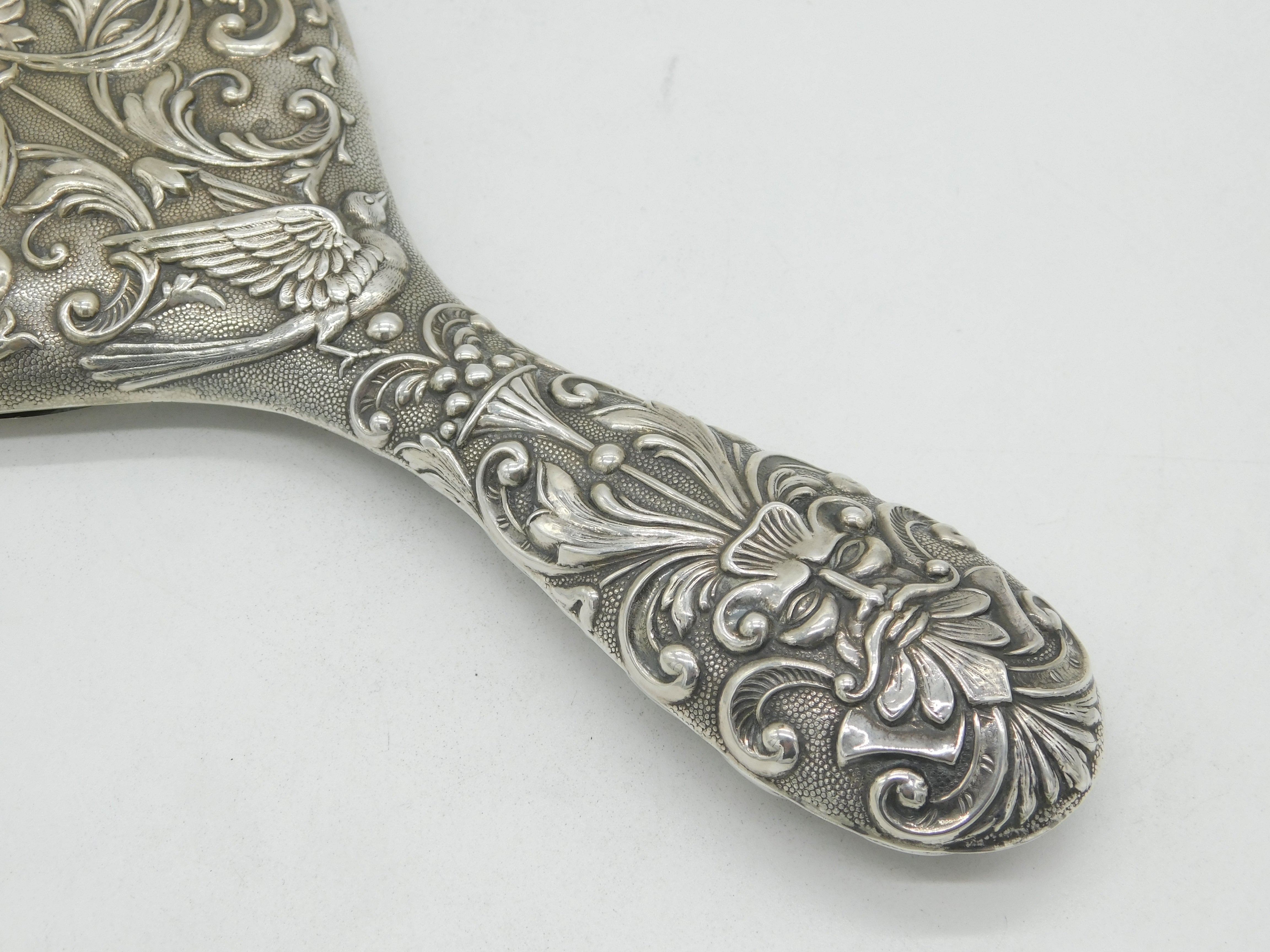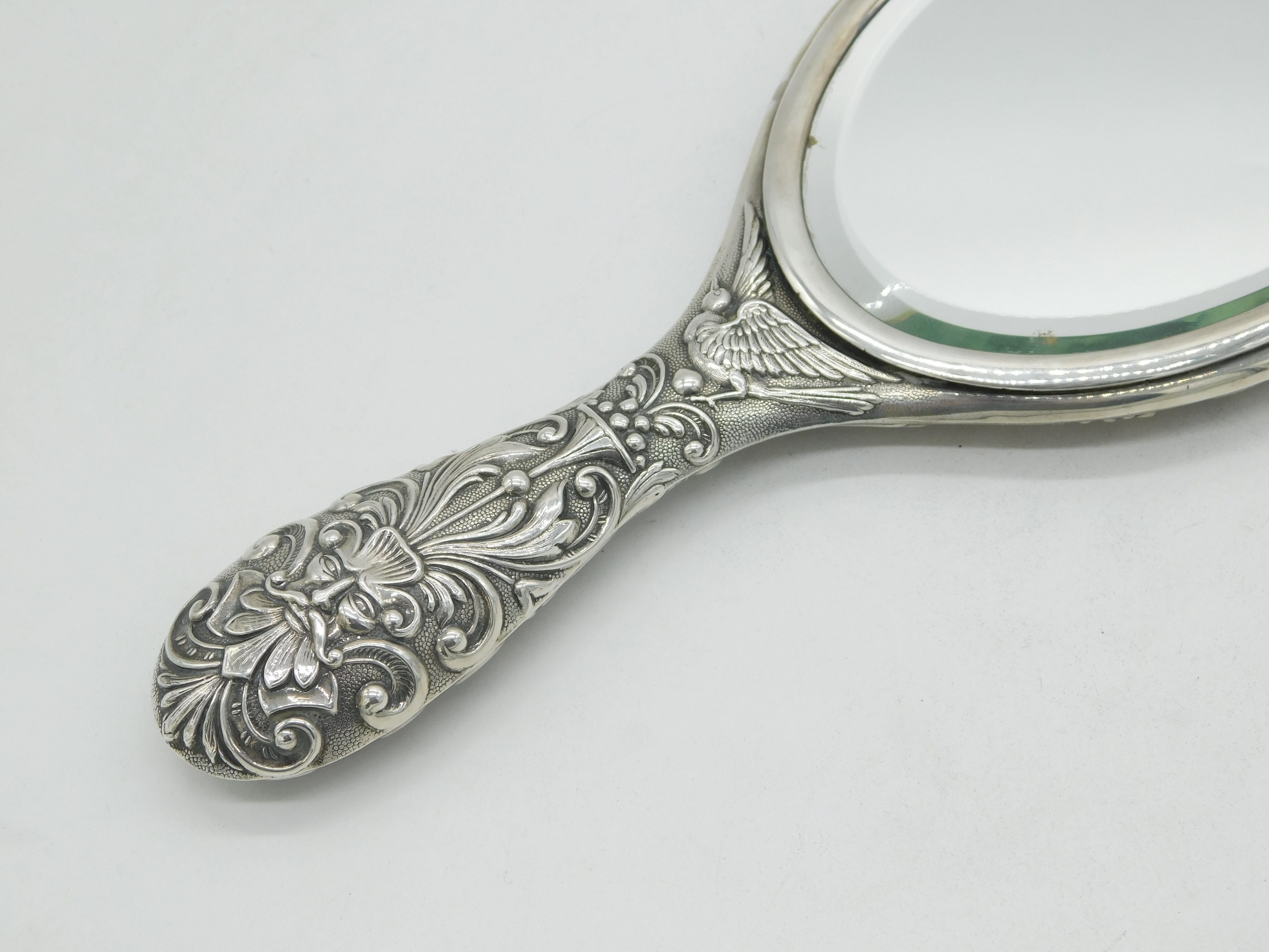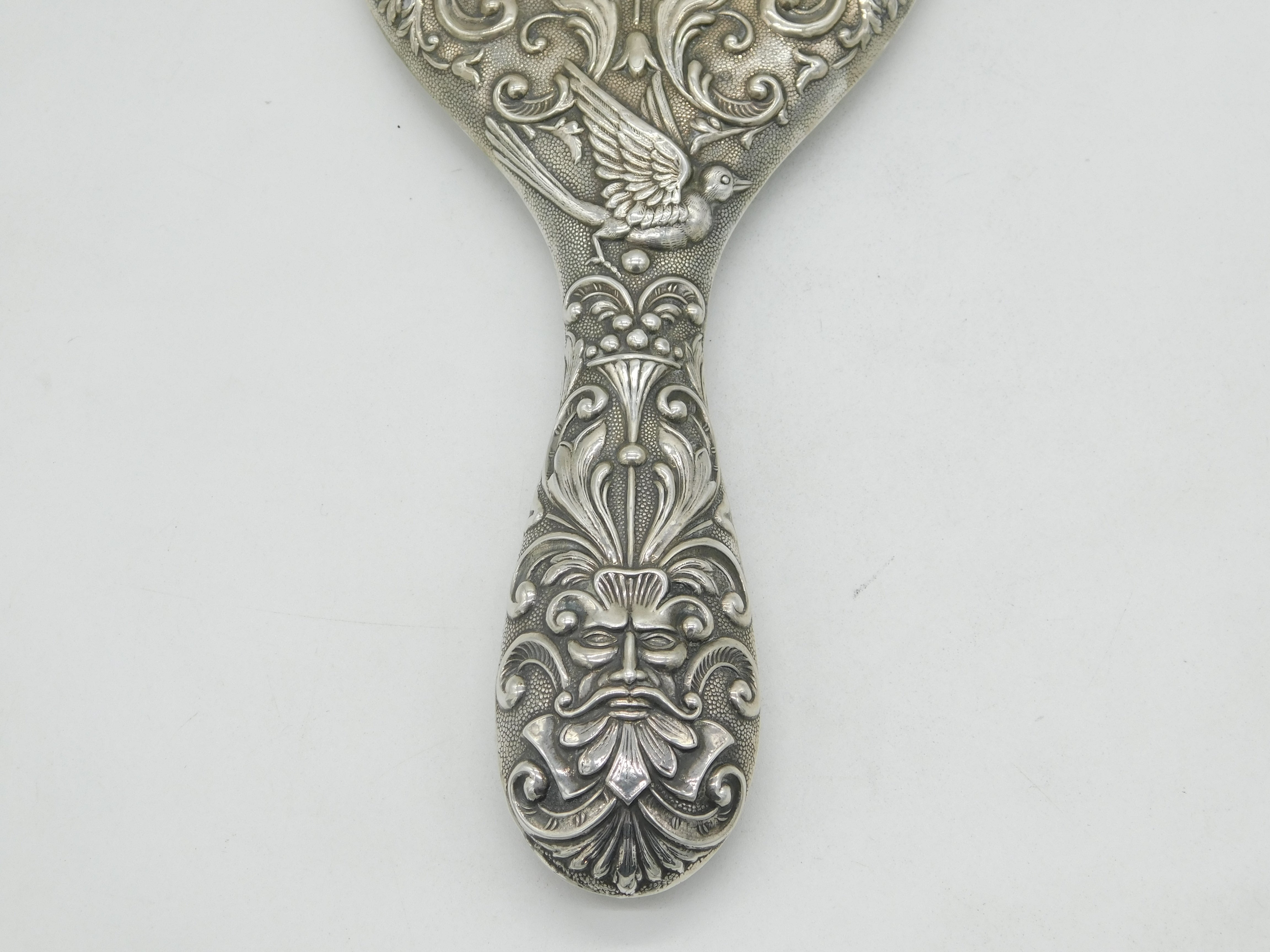 Details: A fantastic and wonderfully designed antique 19th century Spanish sterling silver mirror with superb art nouveau patterns throughout to include green man, birds & flowers hallmarked with Spanish marks c1890. This is a wonderful item that would make a perfect gift or addition to any collection.