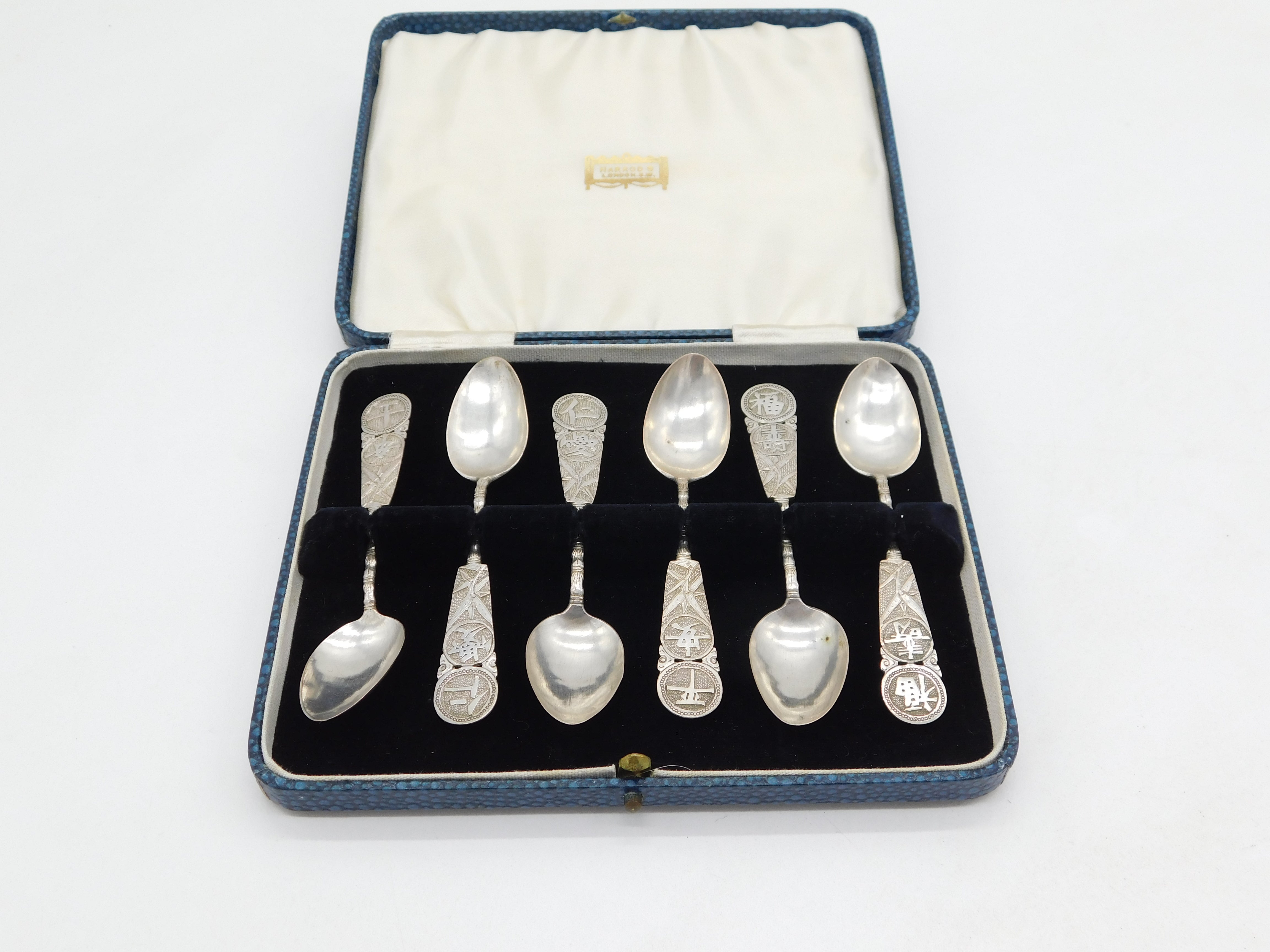 Details: A fantastic and wonderfully designed antique 20th century Chinese export sterling silver bamboo pattern teaspoons hallmarked to the reverse c1930, hallmarked with character marks to the reverse, included in a Harrods of London fitted box. This is a wonderful item that would make a perfect gift or addition to any collection. We are more than happy to provide XRF reports for items upon request.