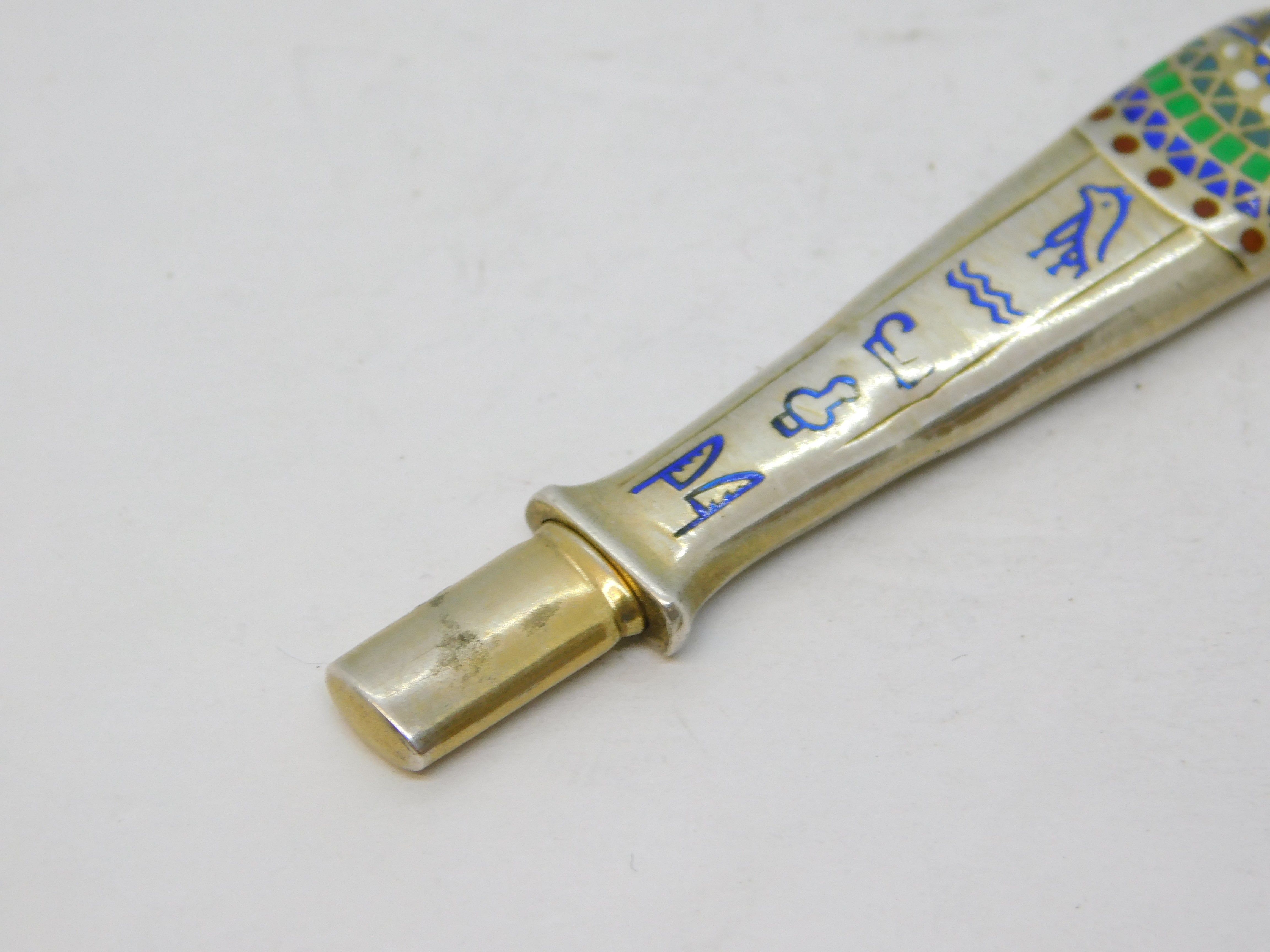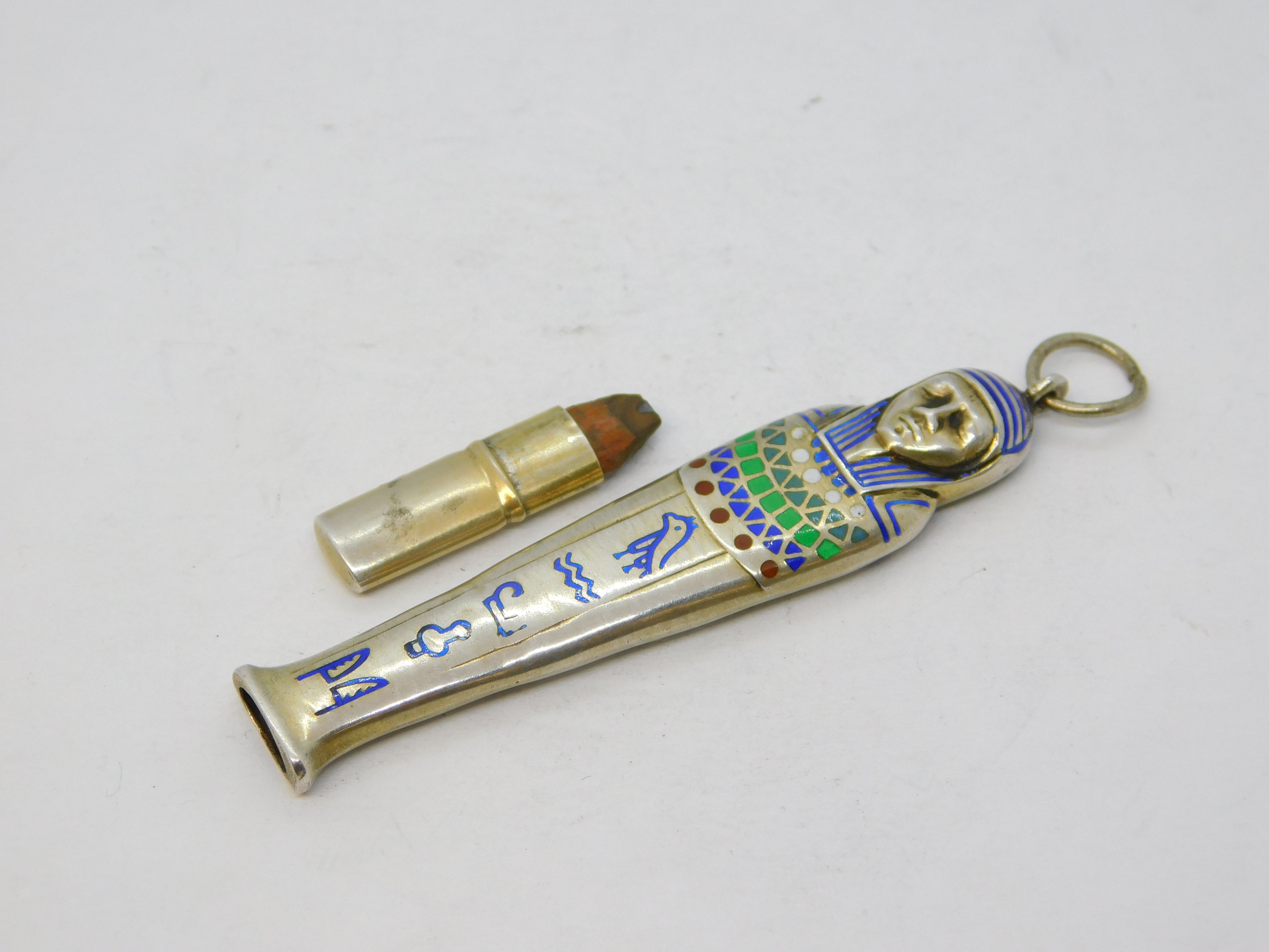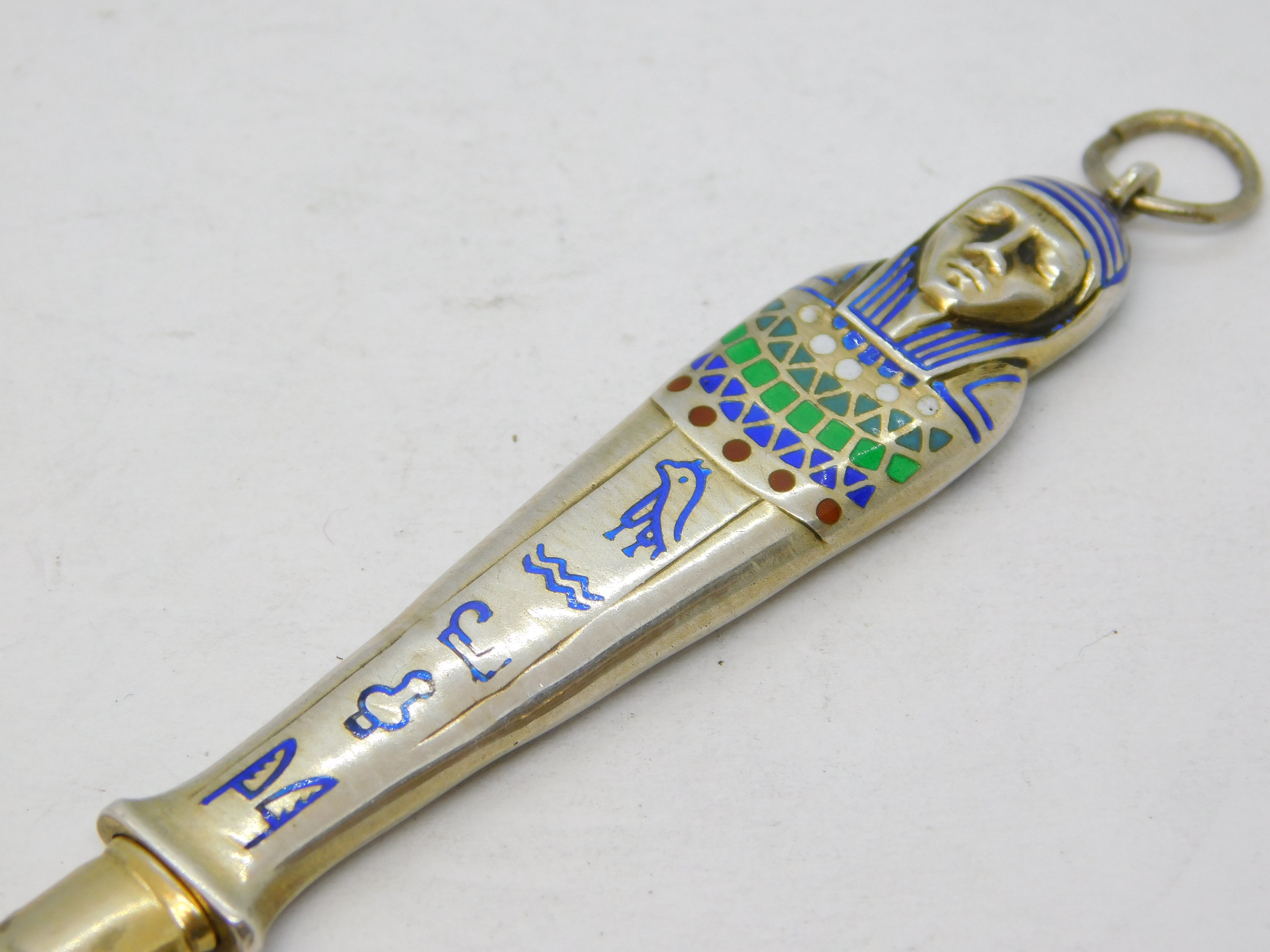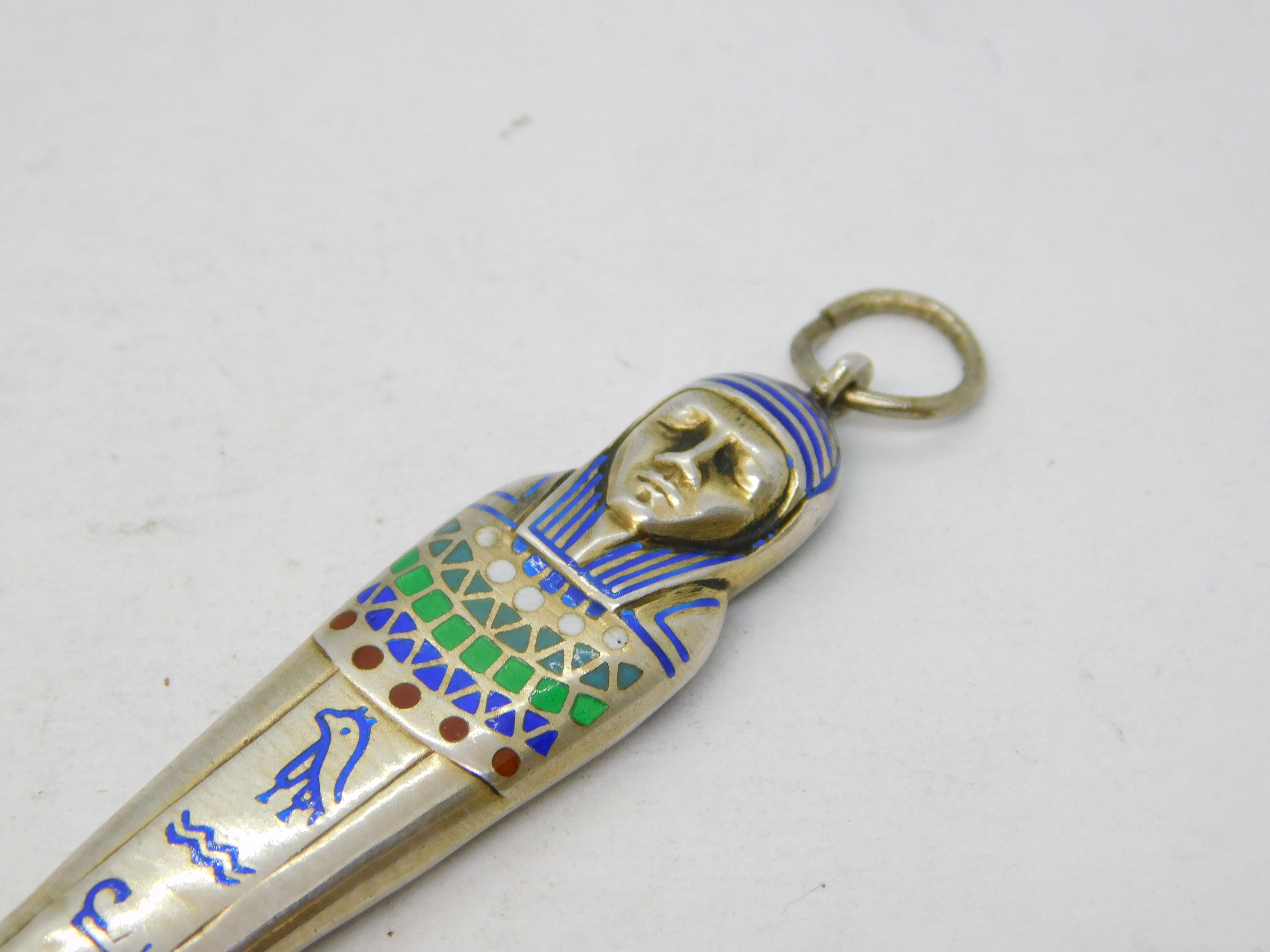 Details: A fantastic and wonderfully designed antique art deco Egyptian 800 silver pharaoh form pencil fob with superb enamel detailing throughout hallmarked to the bale c1920. This is a wonderful item that would make a perfect gift or addition to any collection.