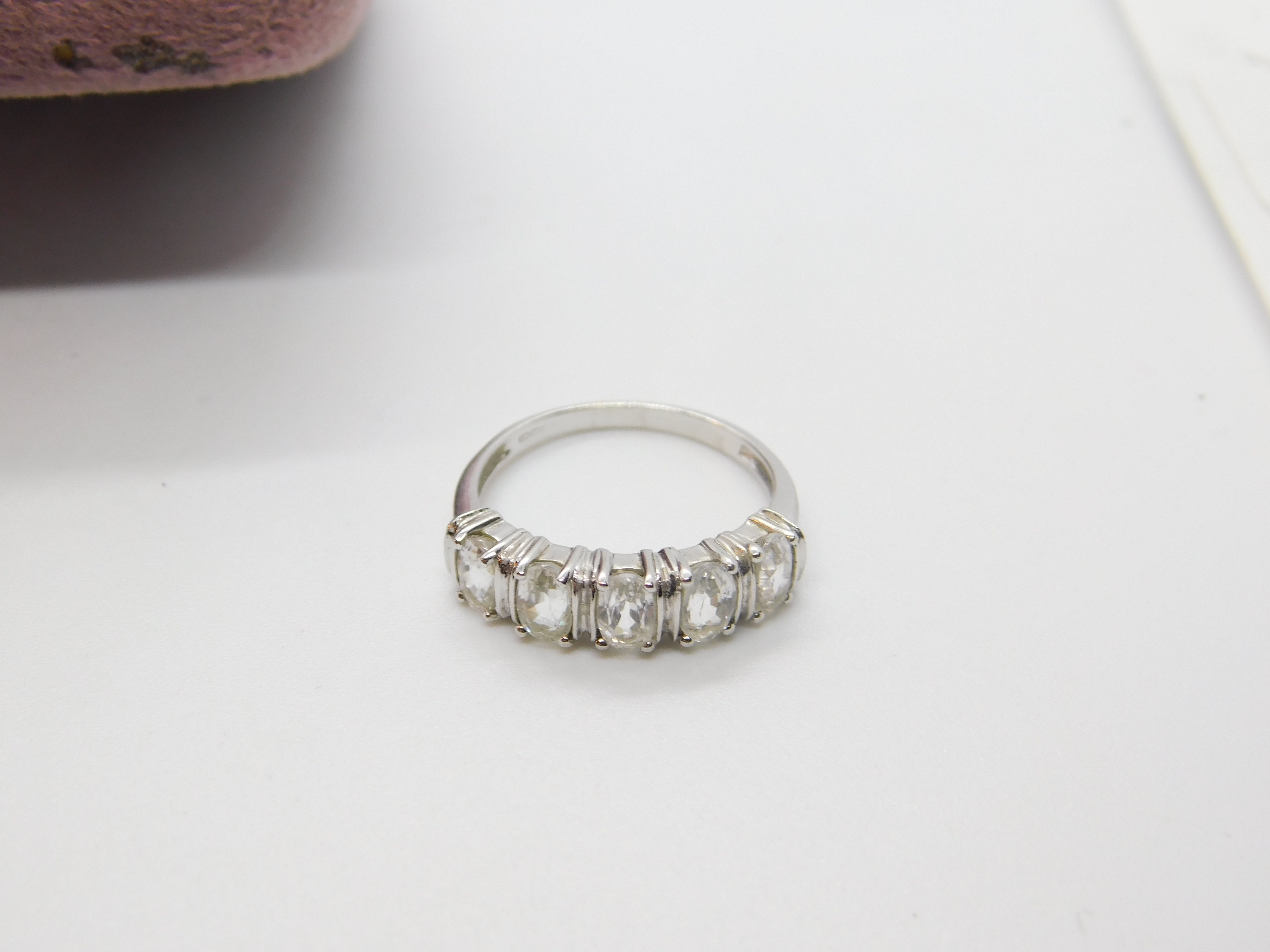 Details: A fantastic and wonderfully designed vintage 9ct white gold band ring set with five diamond paste stones hallmarked Birmingham 2006 to the interior band. This is a wonderful item that would make a perfect gift or addition to any collection. The BOX pictured is for PRESENTATION ONLY and is NOT included in the listings but used to frame the pictures unless specifically stated otherwise.