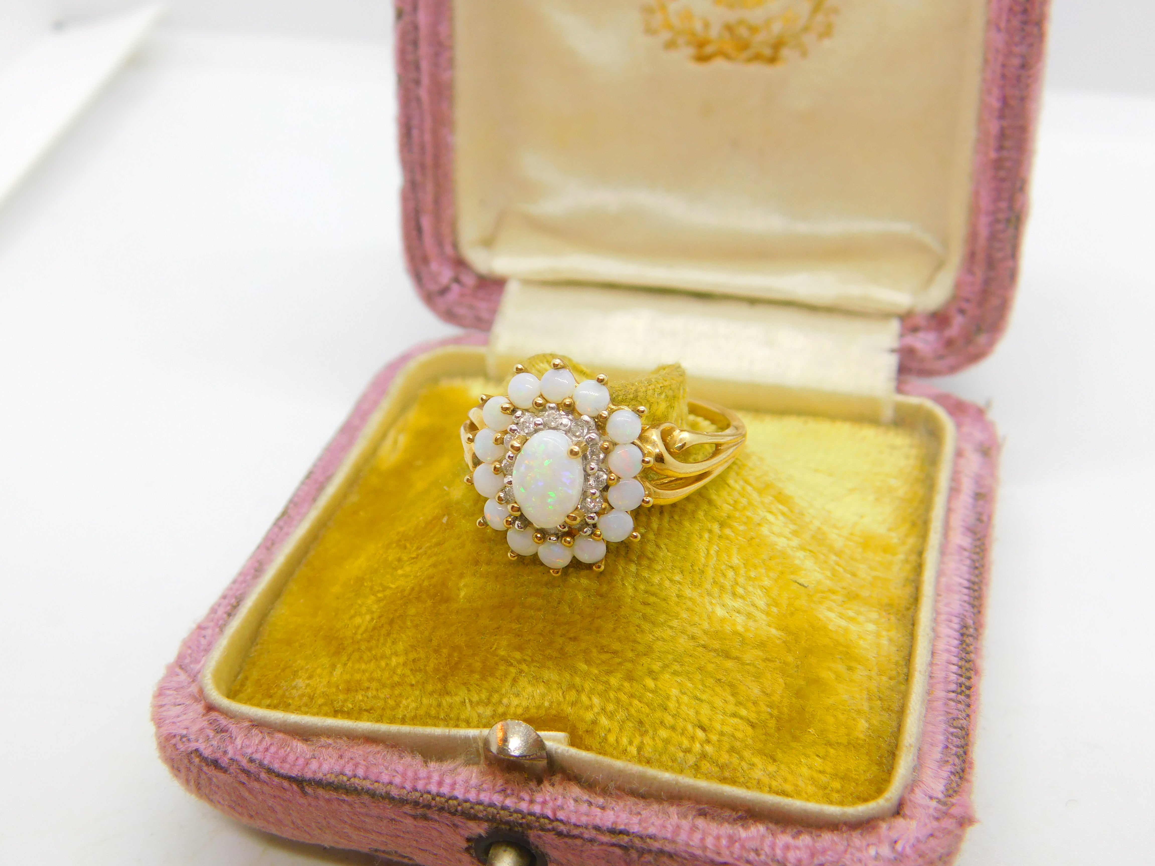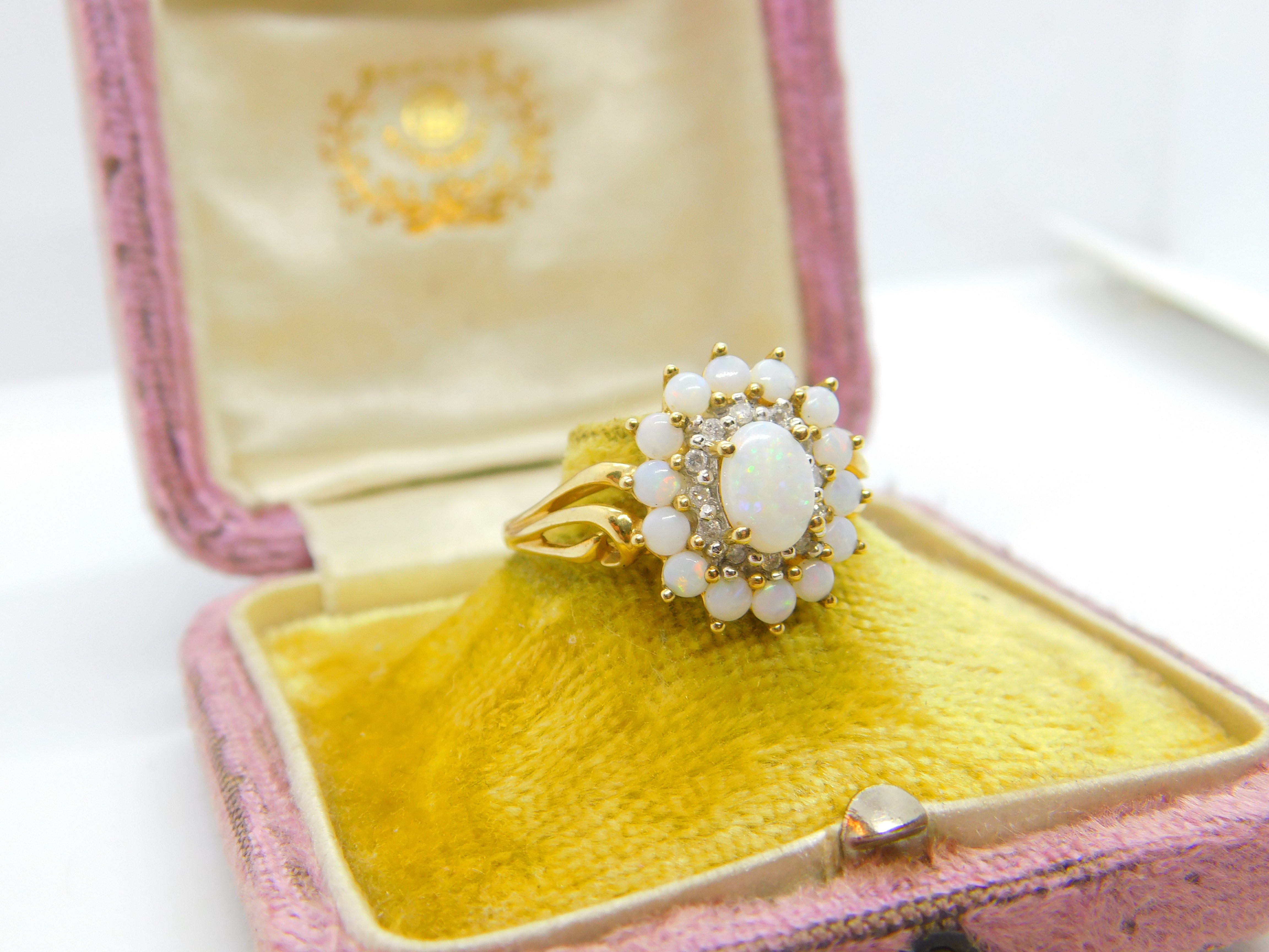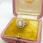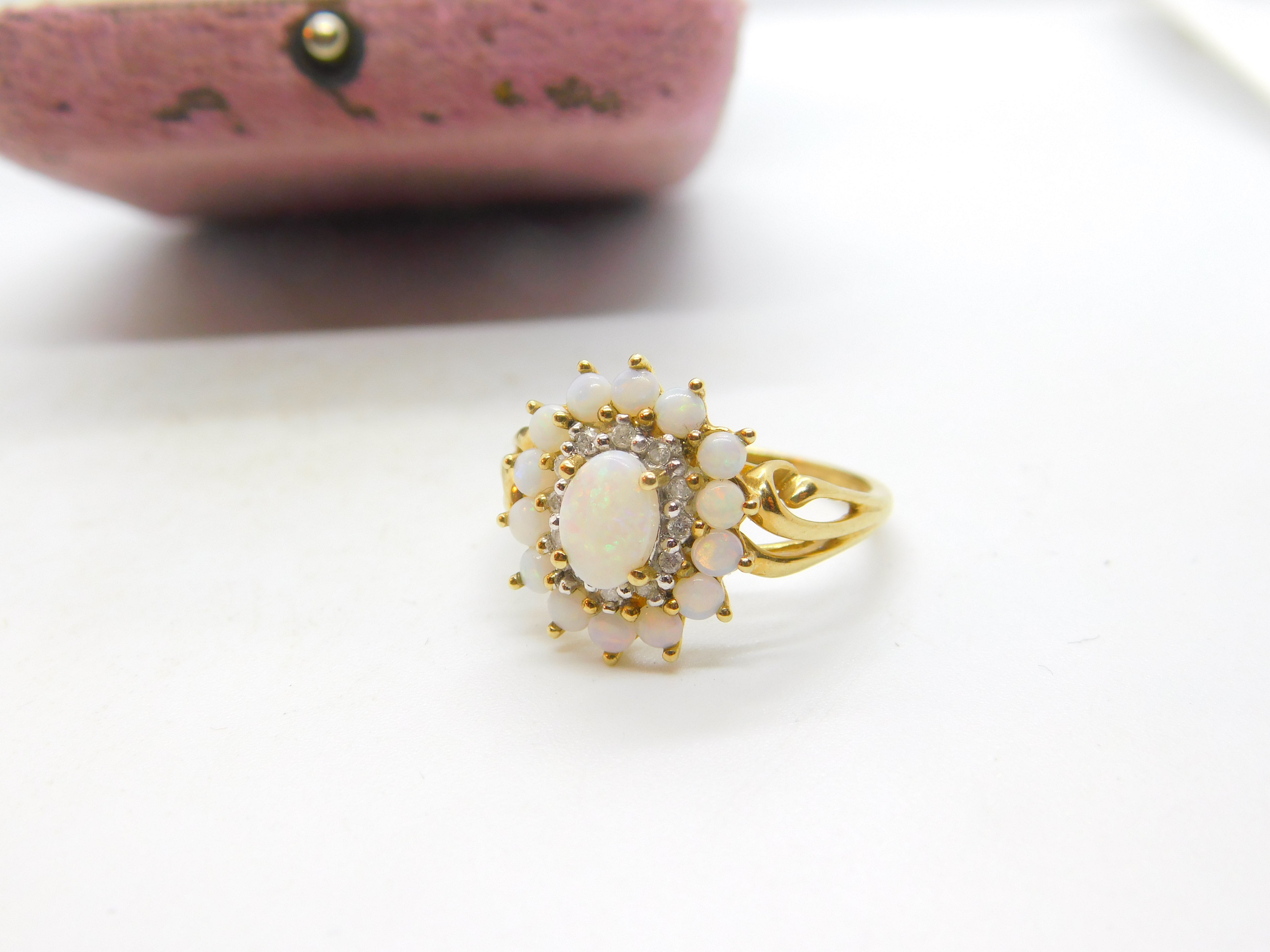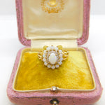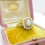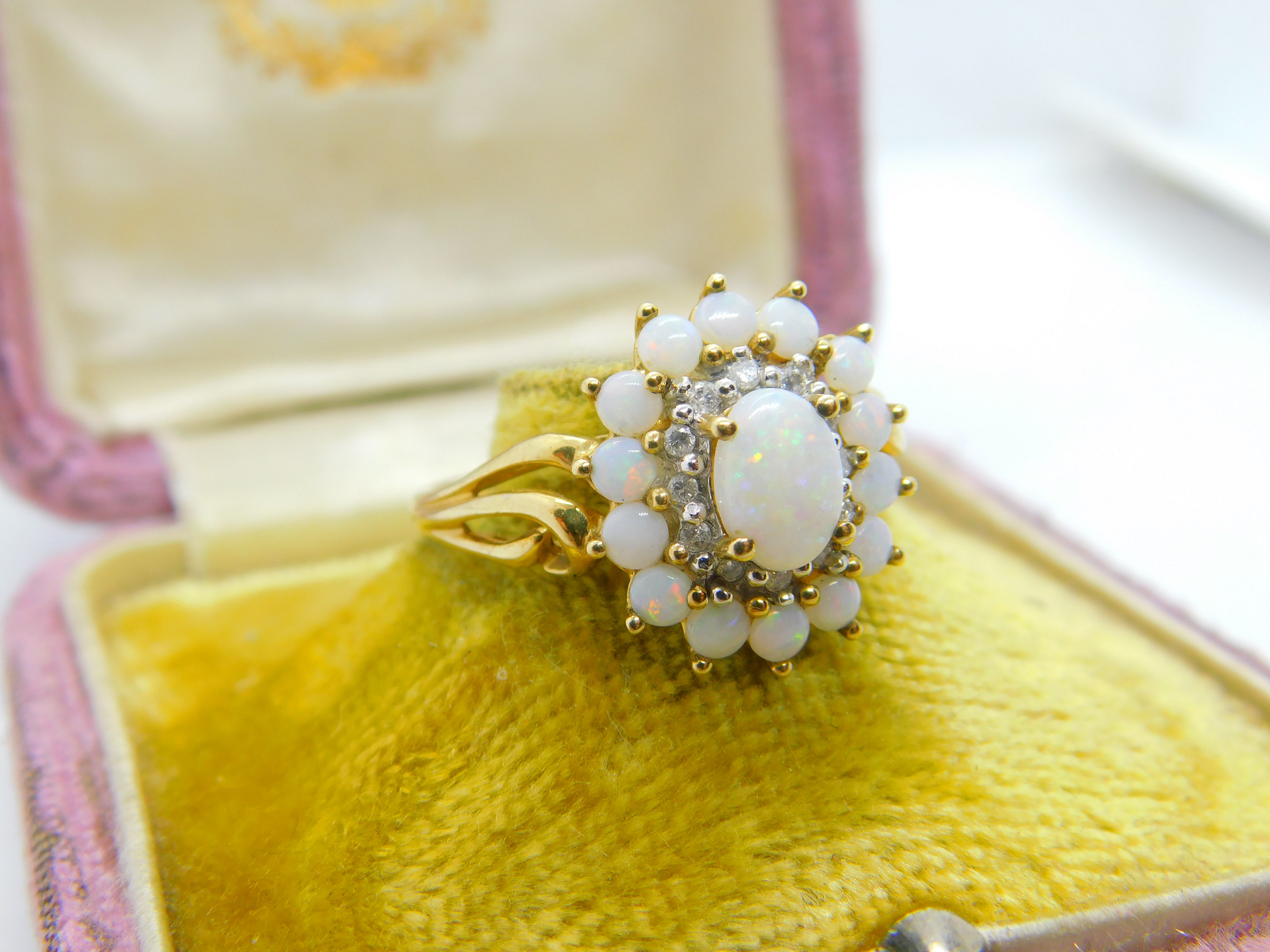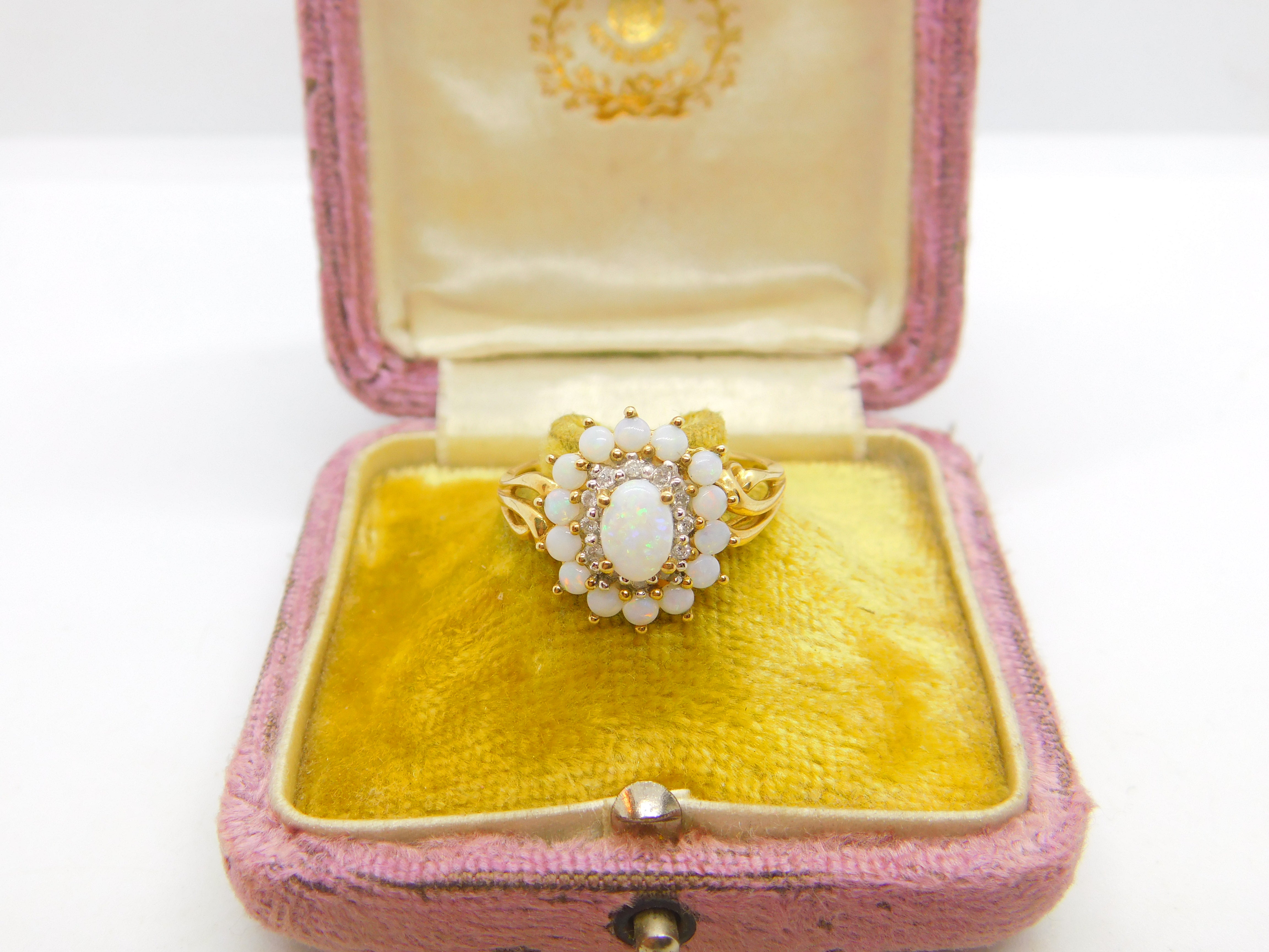 Details: A fantastic and wonderfully designed vintage 9ct yellow gold large floral cluster ring set with cabochon opals flanked by white spinels hallmarked Birmingham 2001 to the interior. This is a wonderful item that would make a perfect gift or addition to any collection. The BOX pictured is for PRESENTATION ONLY and is NOT included in the listings but used to frame the pictures unless specifically stated otherwise.
