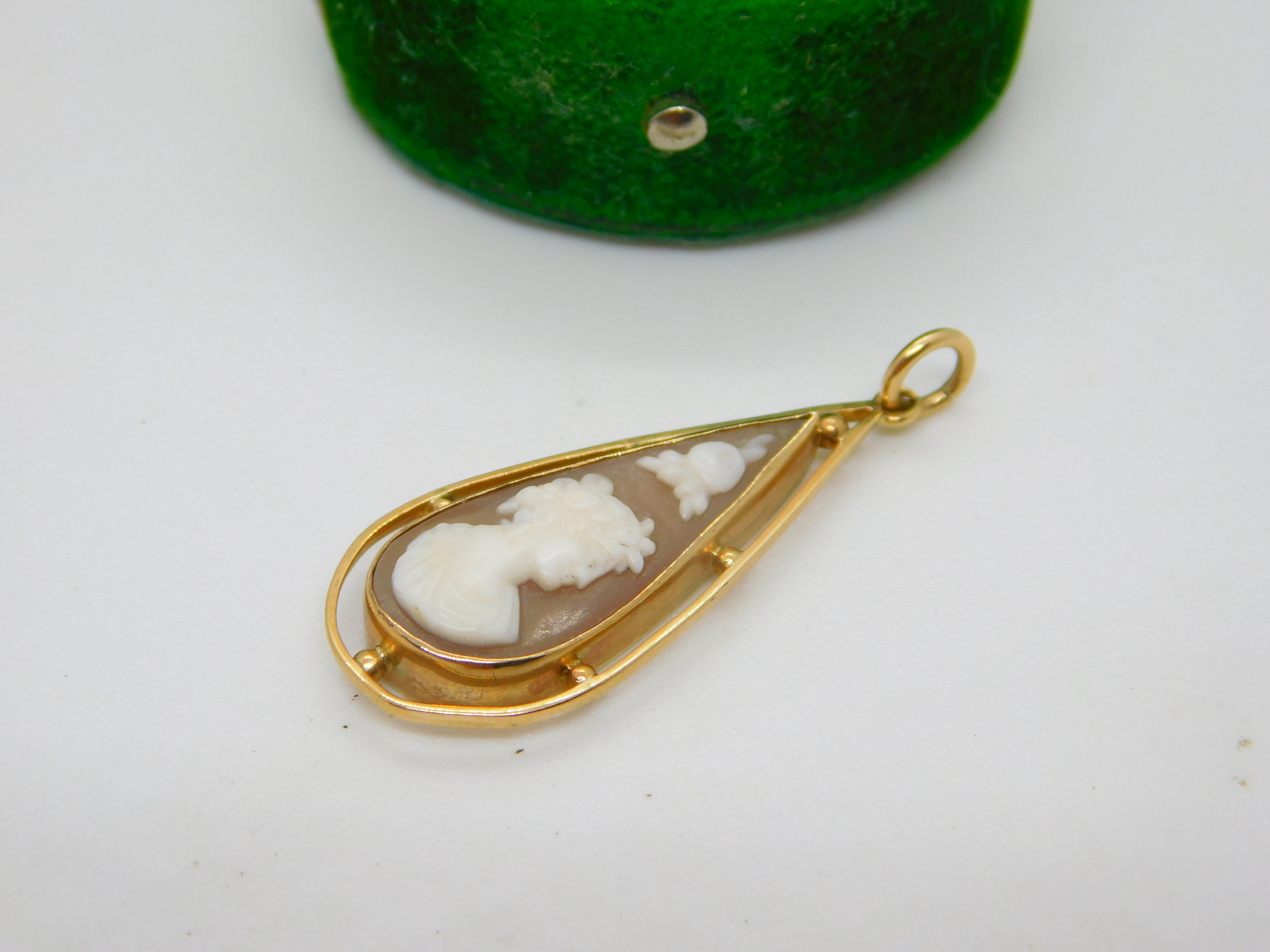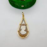9ct Yellow Gold Carved Shell Flower Over Cameo Drop Pendant Antique c1930