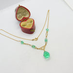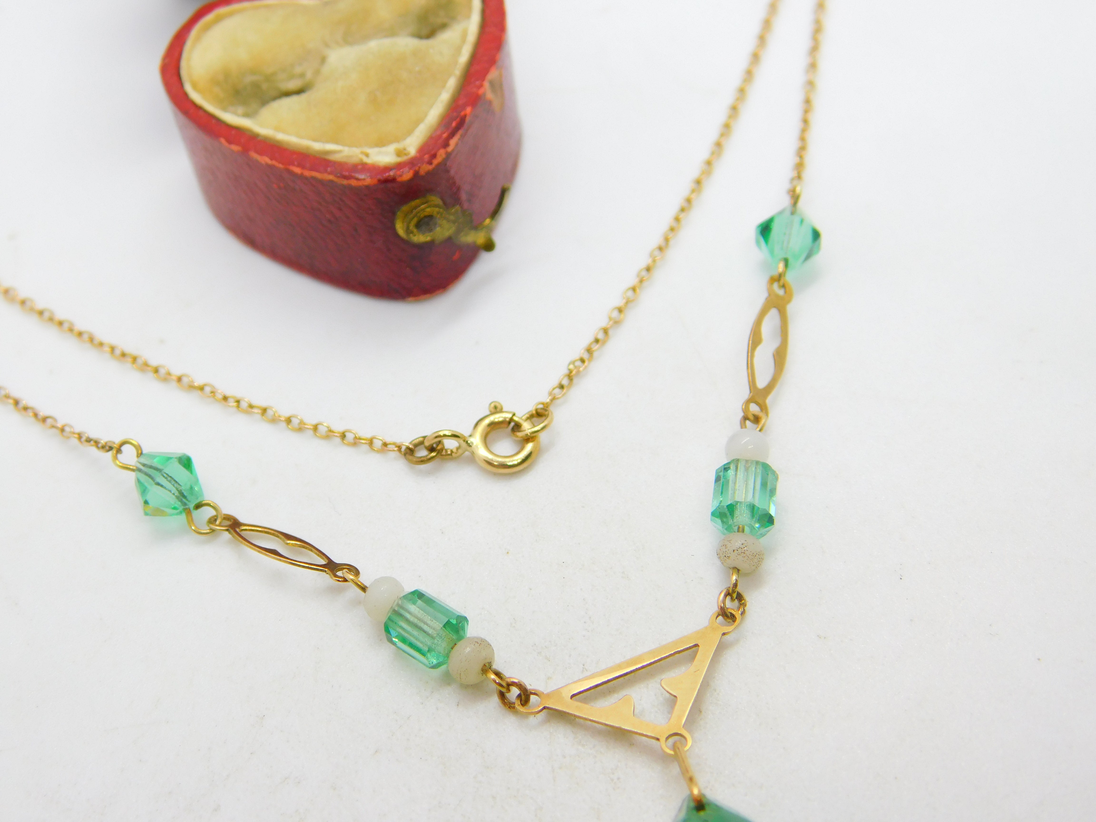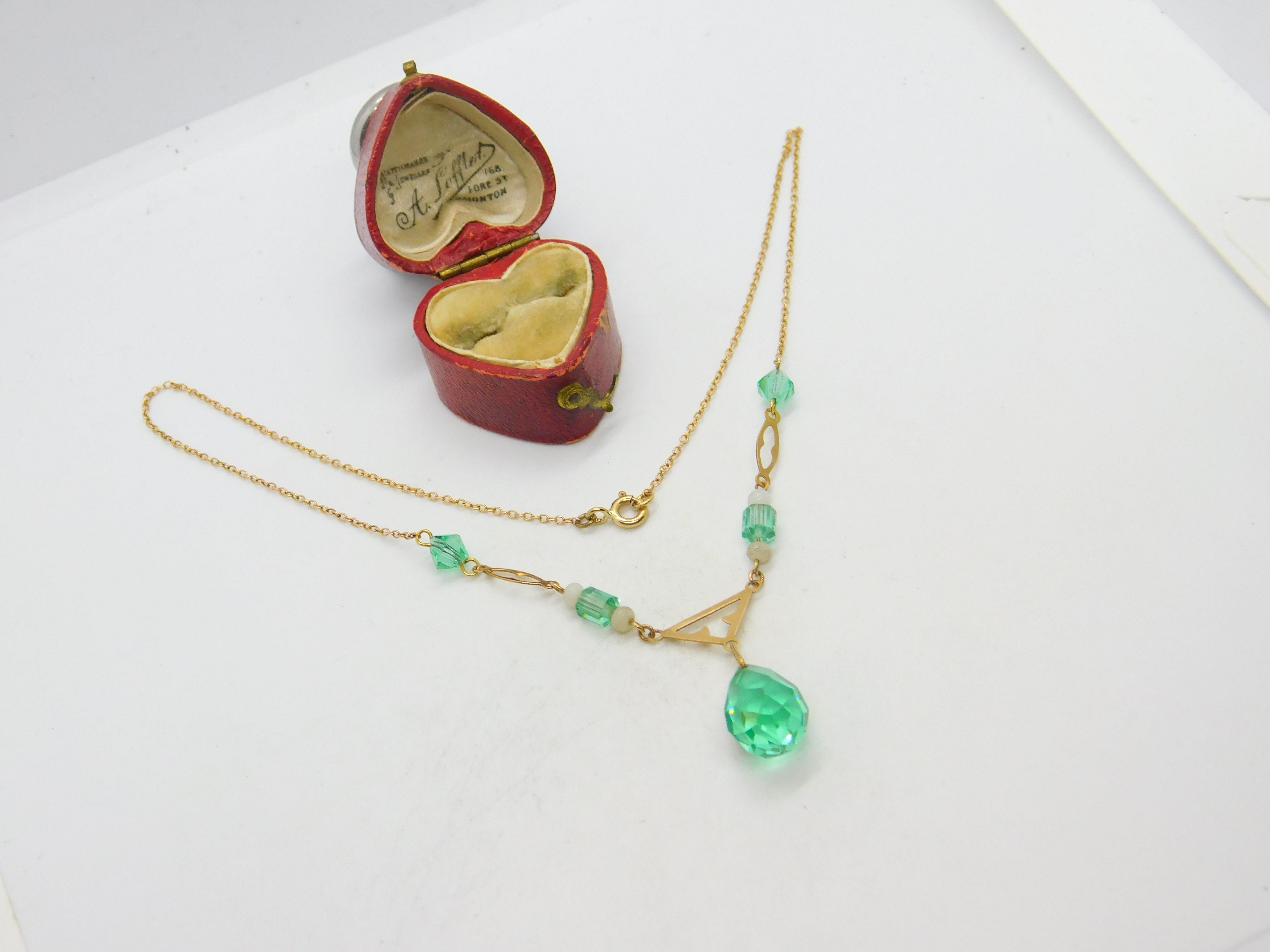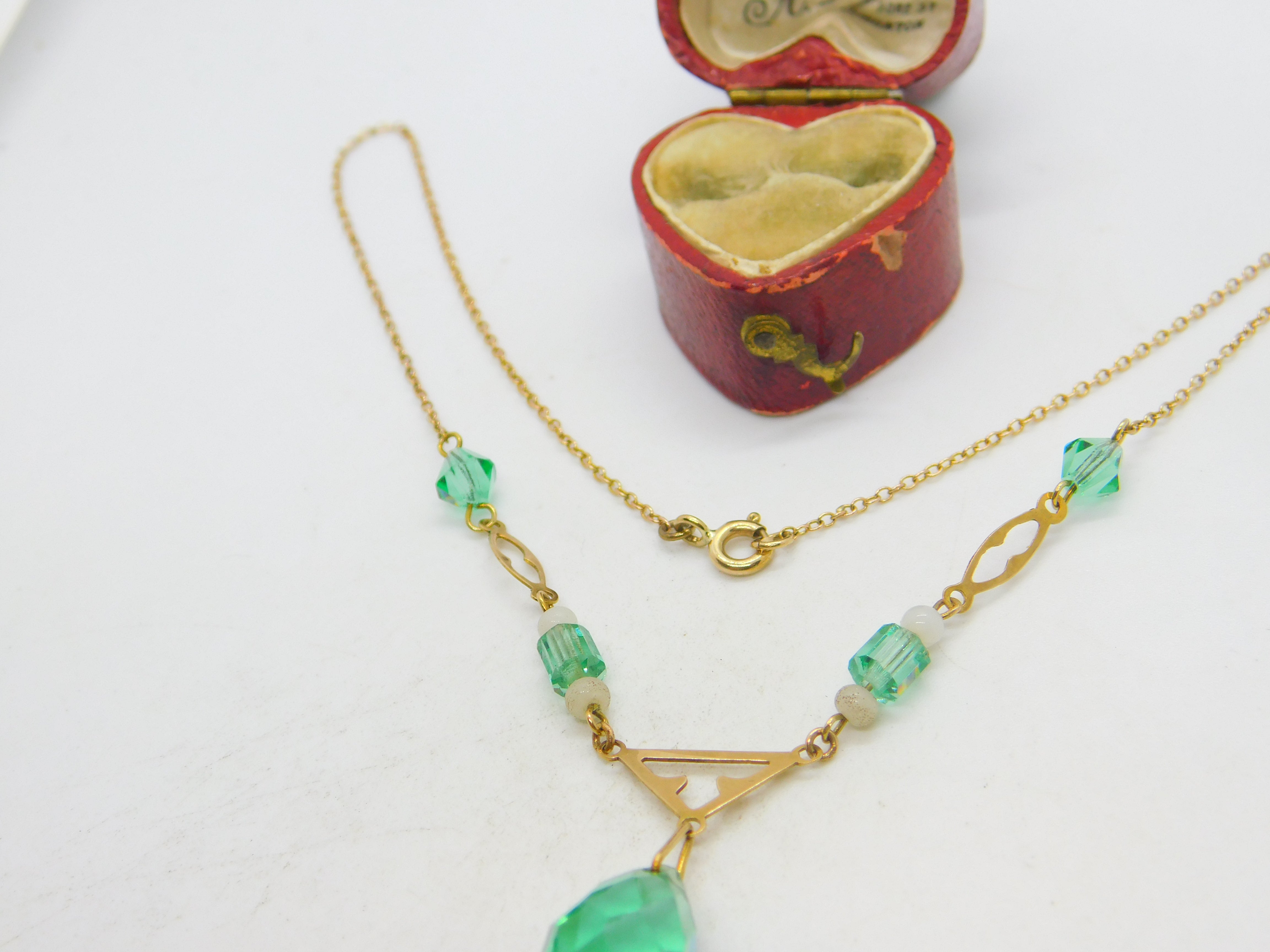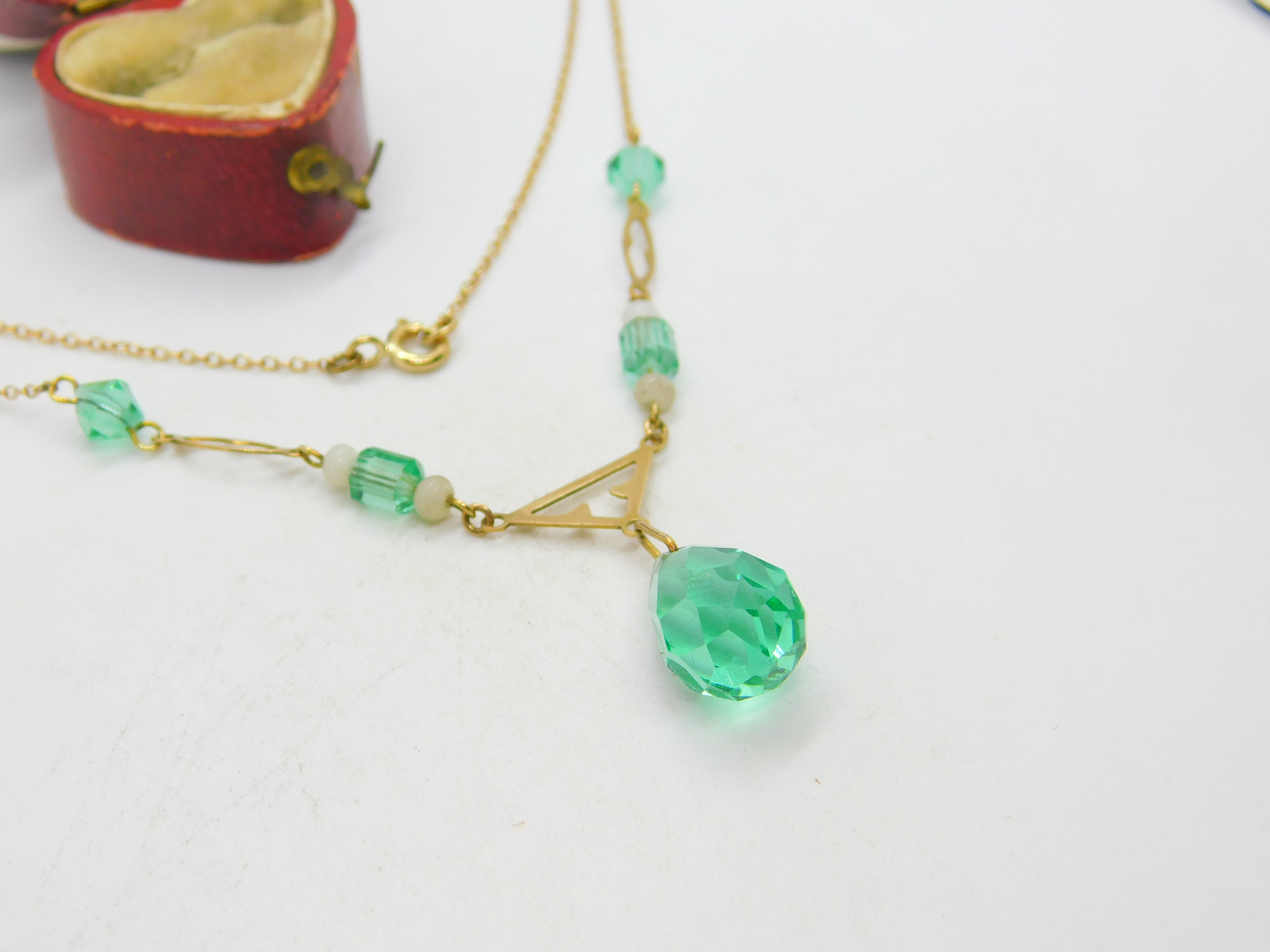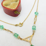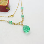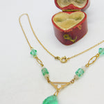9ct Yellow Gold & Faceted Green Glass Modernist Drop Necklace Art Deco c1940
