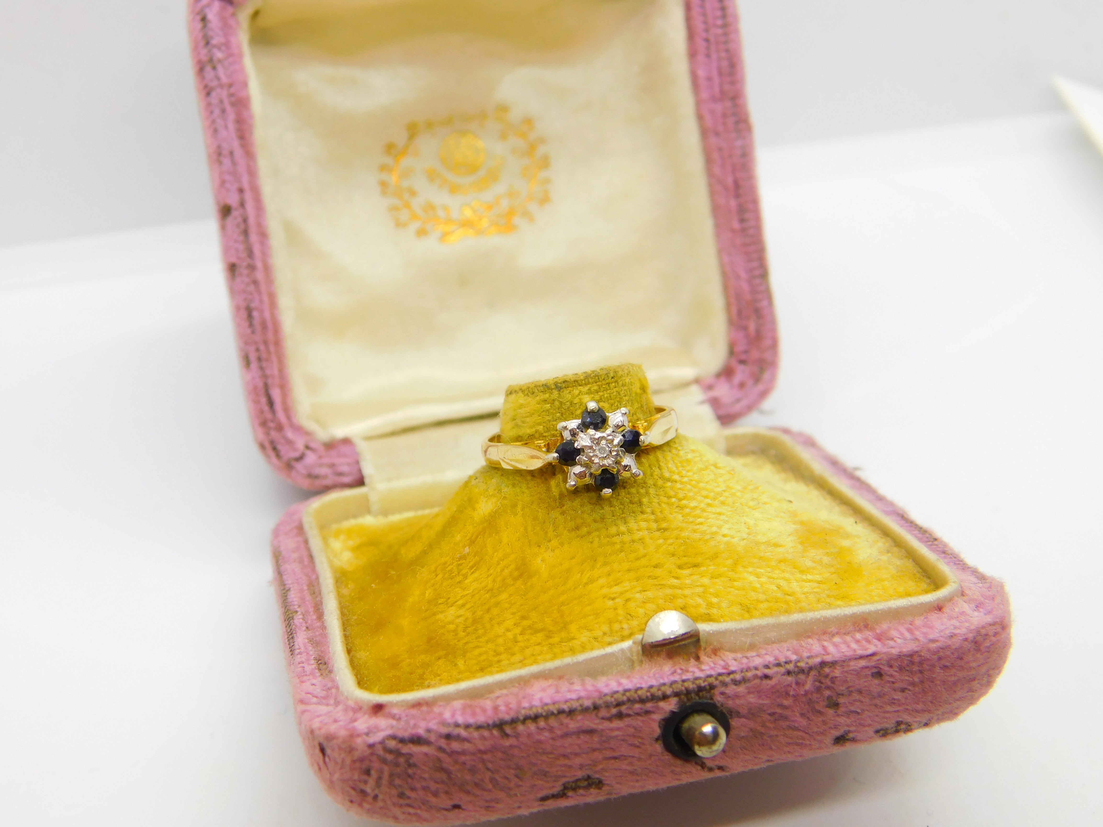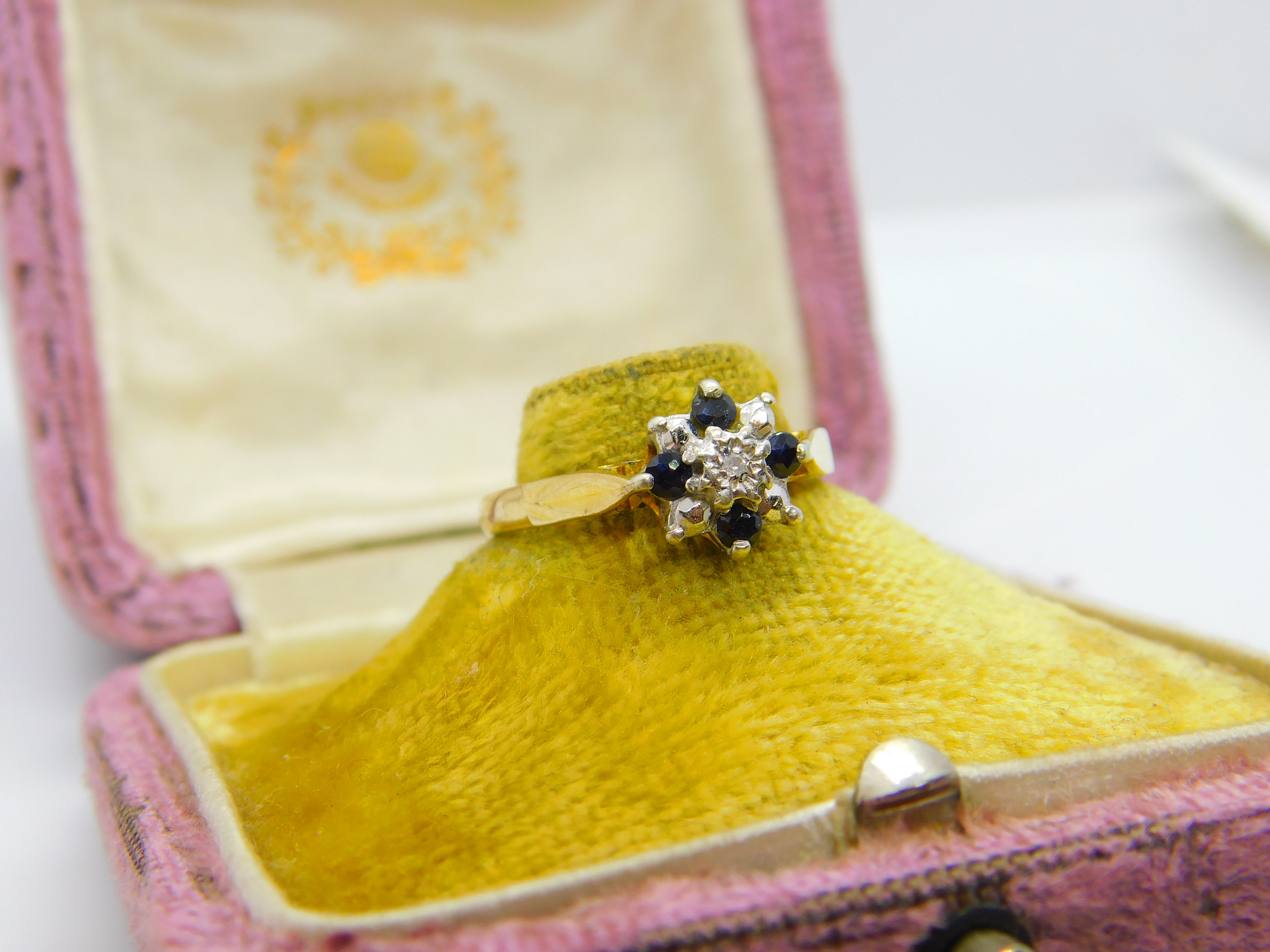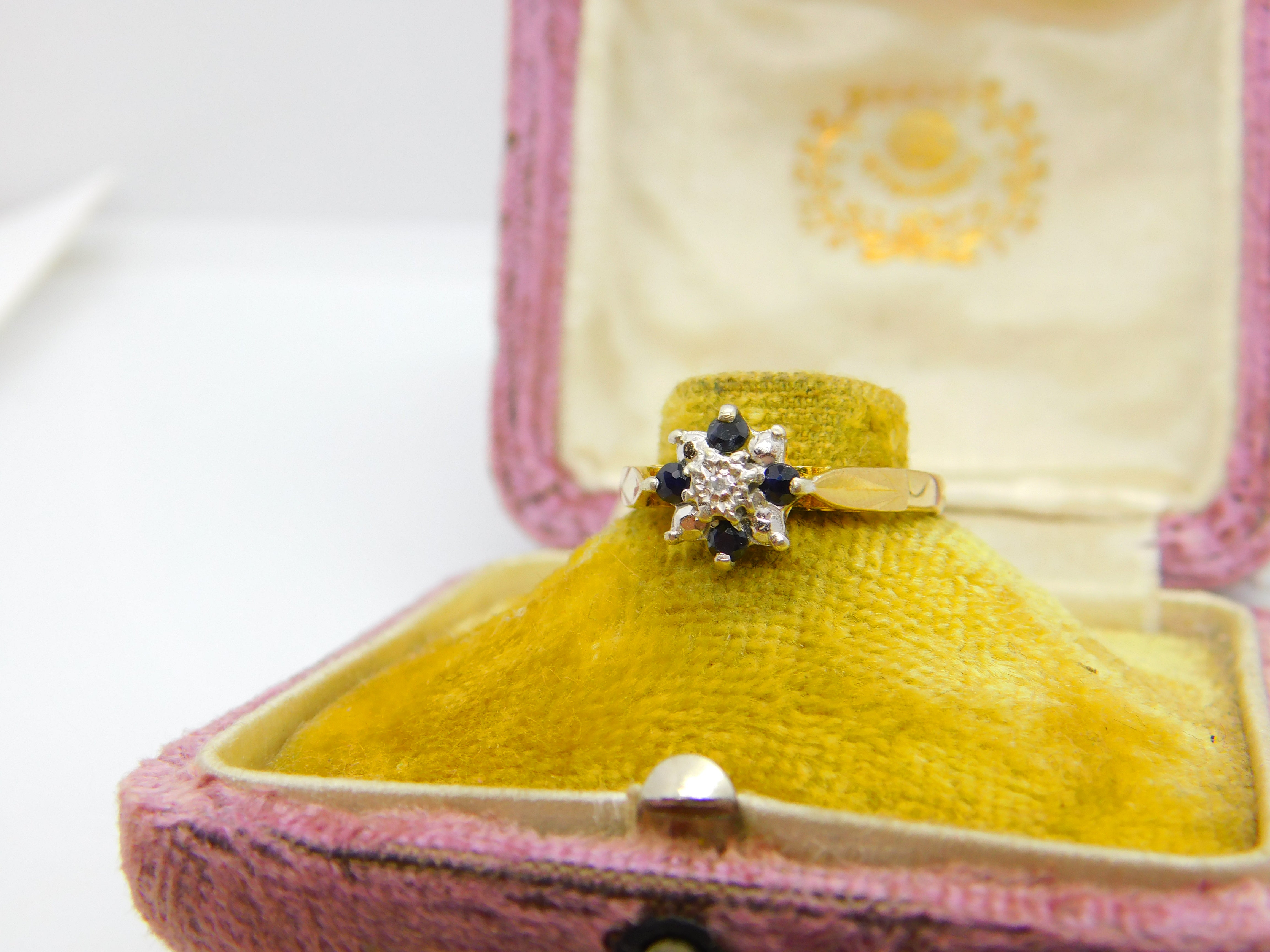 Details: A fantastic and wonderfully designed vintage 9ct yellow gold floral cluster ring set with sapphires & diamond stone hallmarked Birmingham 1979. This is a wonderful item that would make a perfect gift or addition to any collection. The BOX pictured is for PRESENTATION ONLY and is NOT included in the listings but used to frame the pictures unless specifically stated otherwise.