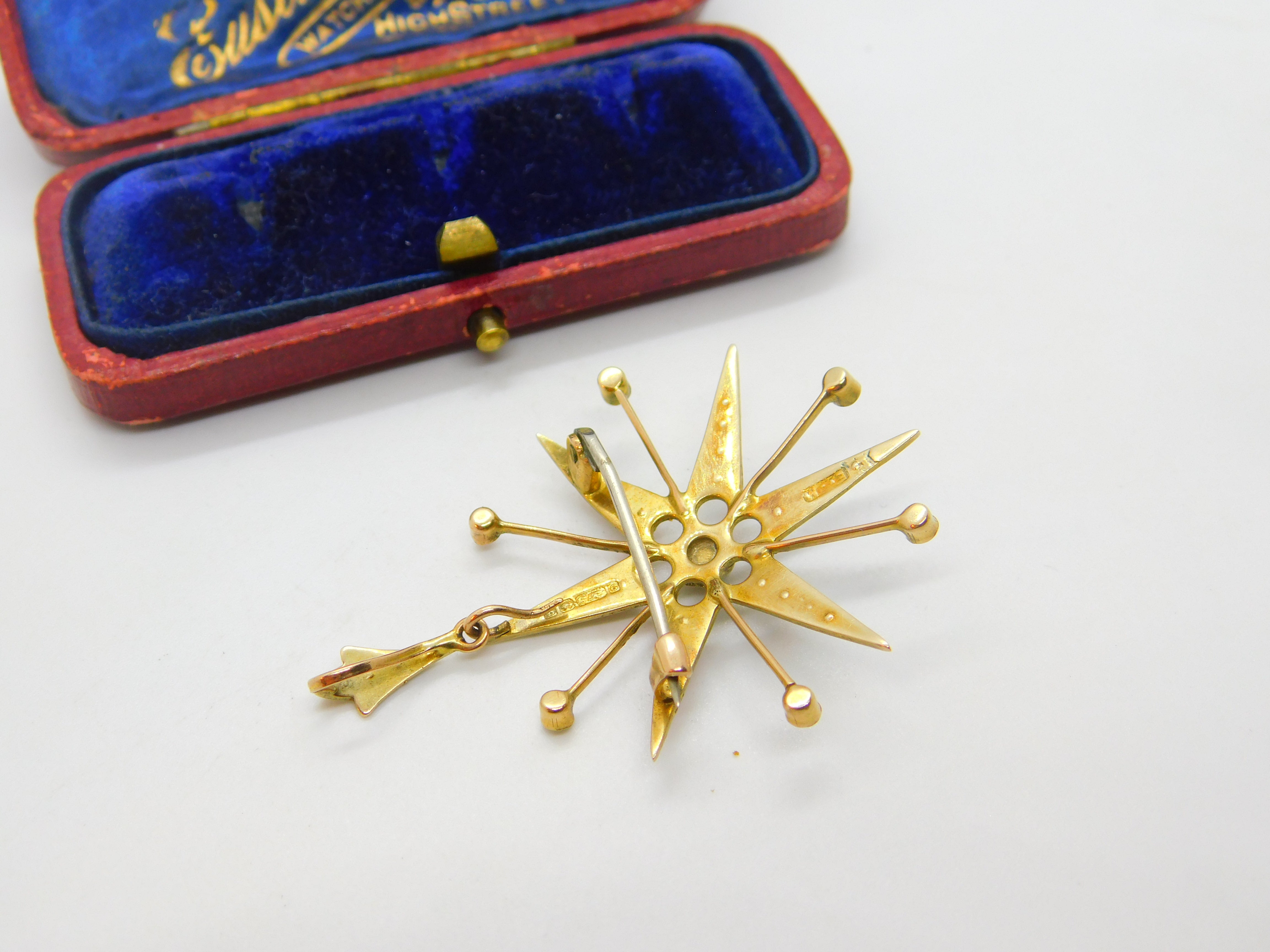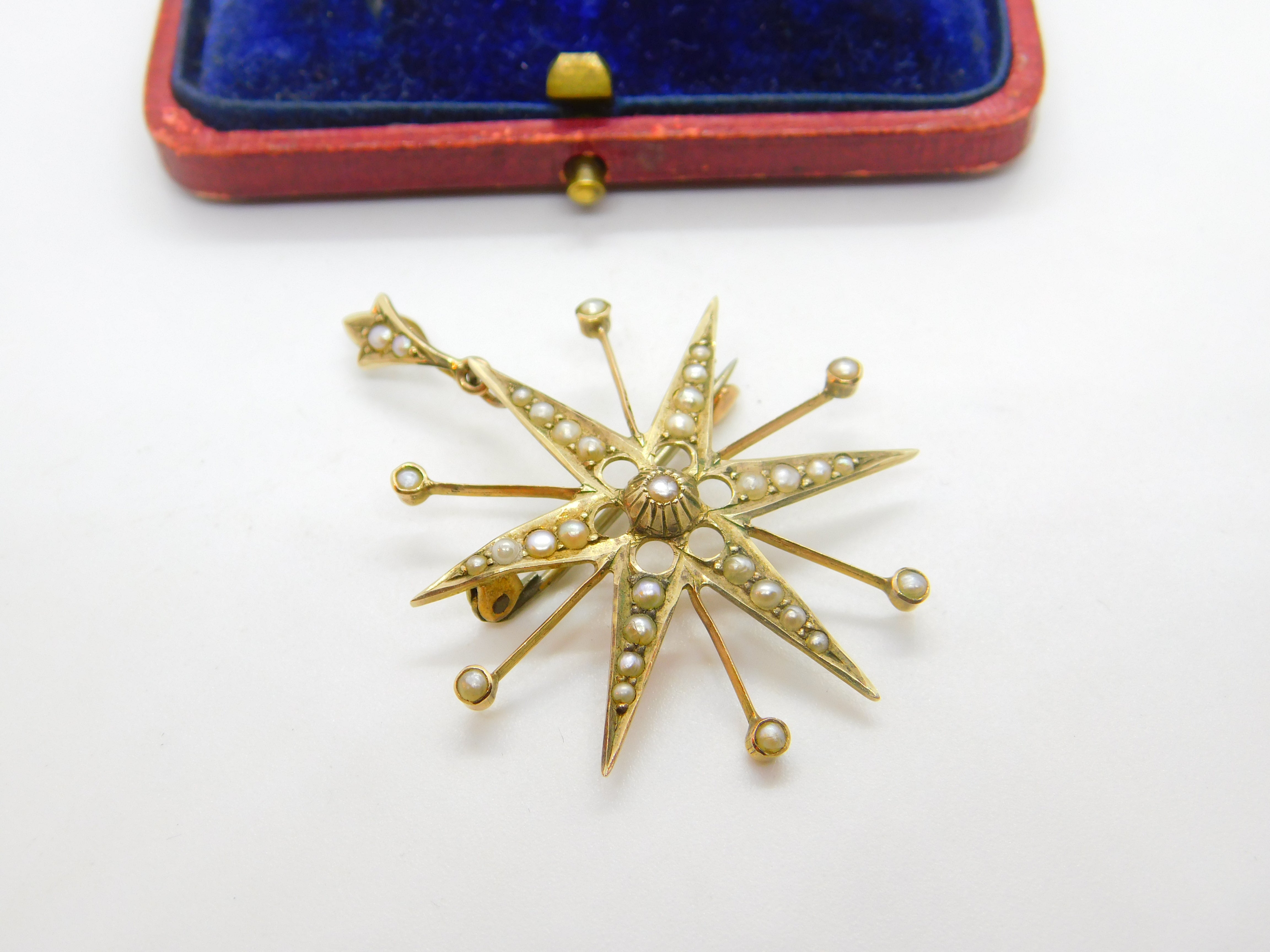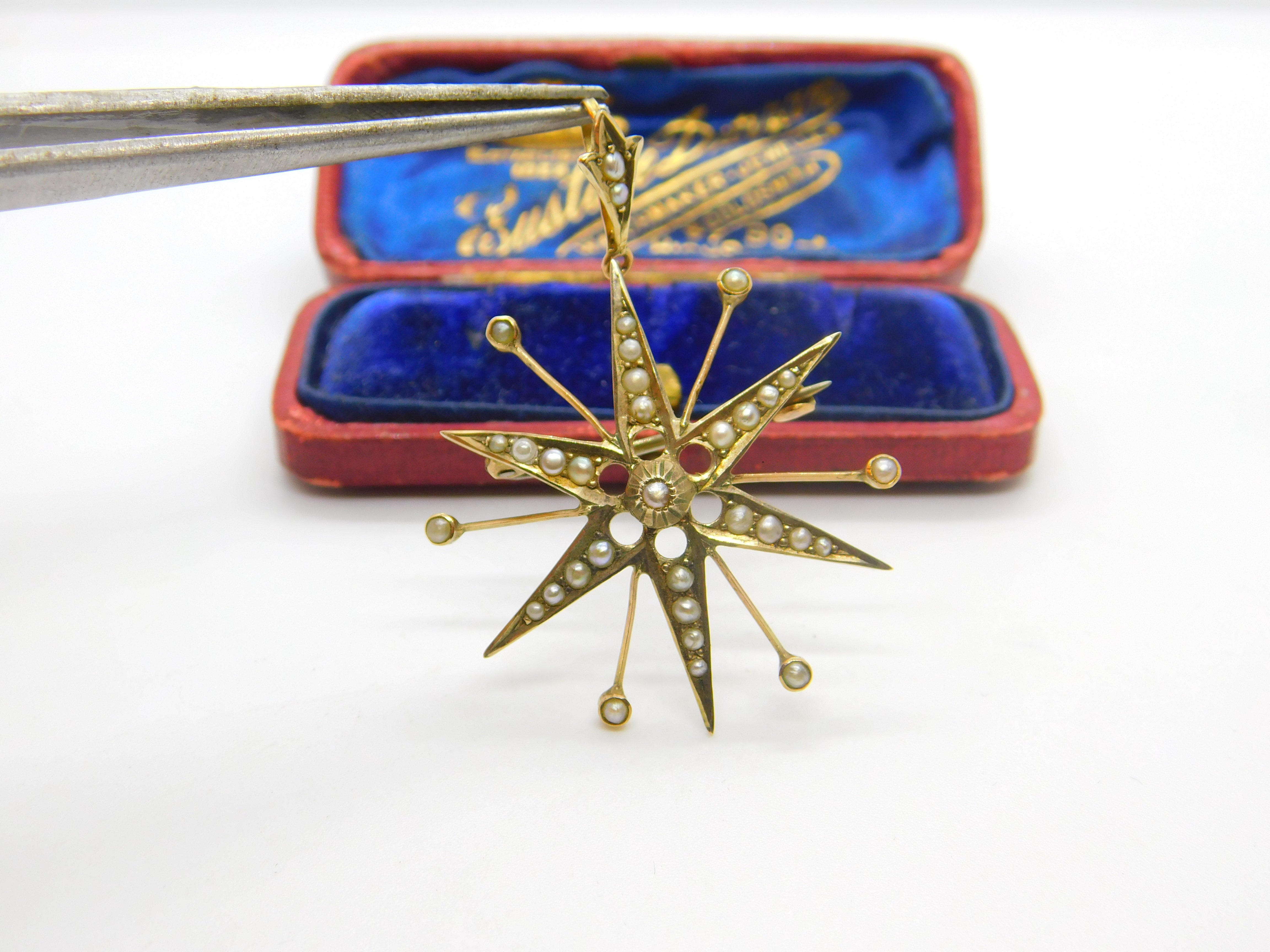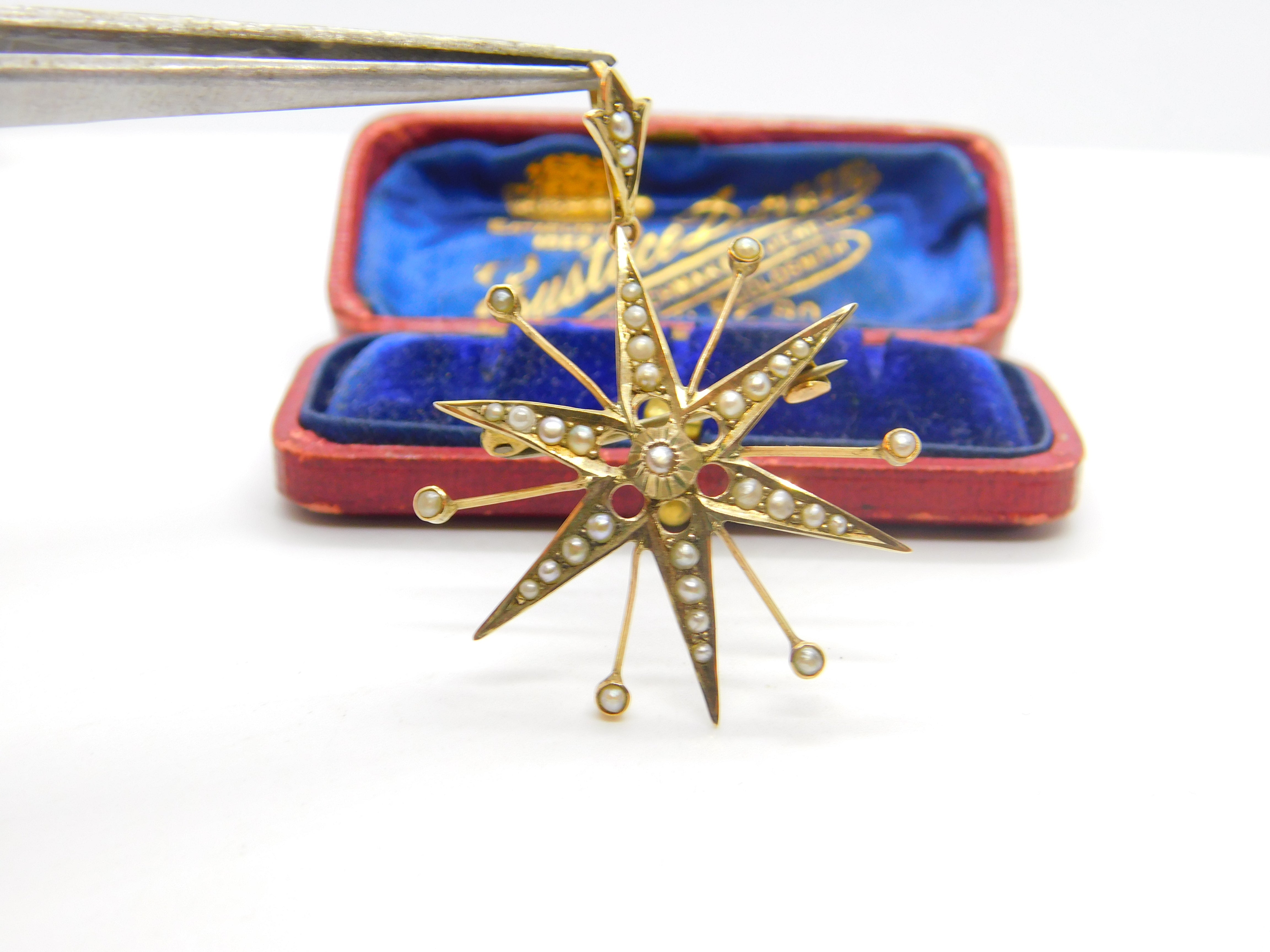 Details: A fantastic and wonderfully designed antique art deco large 9ct yellow gold starburst shooting star pendant set with seed pearls throughout hallmarked Birmingham 1915 to the reverse - the item can also be worn as a brooch. A stunning example. This is a wonderful item that would make a perfect gift or addition to any collection. The BOX pictured is for PRESENTATION ONLY and is NOT included in the listings but used to frame the pictures unless specifically stated otherwise.
