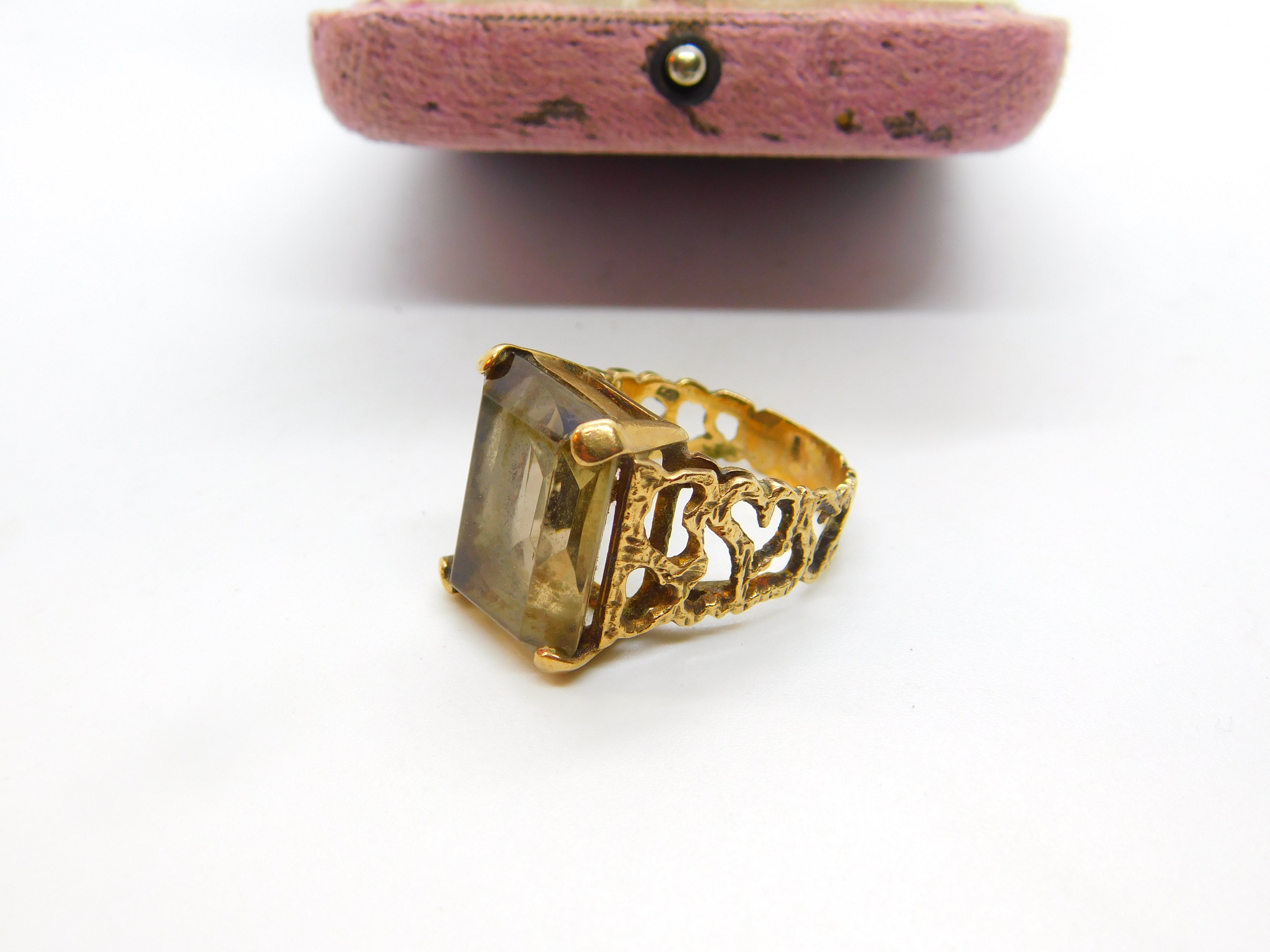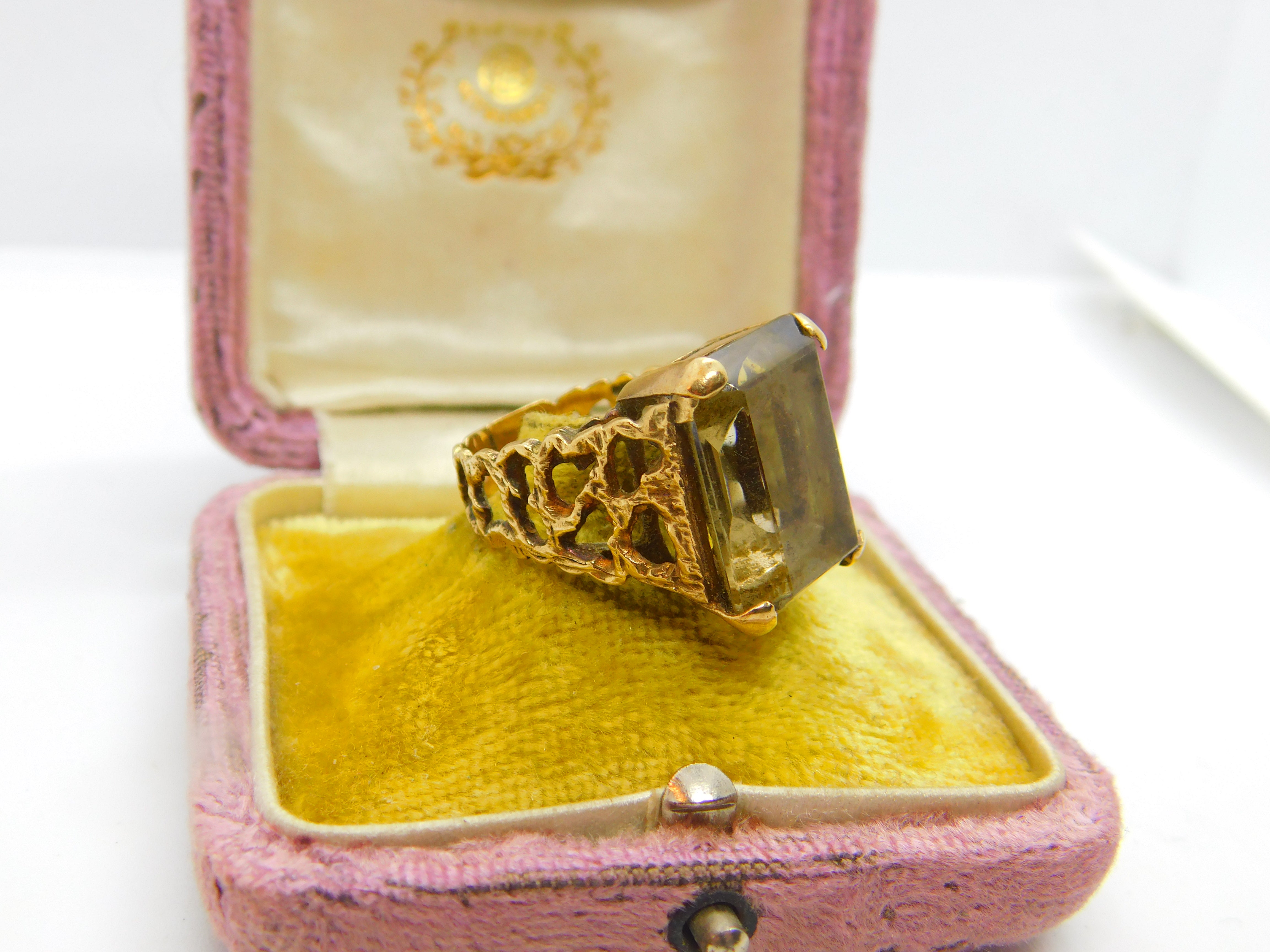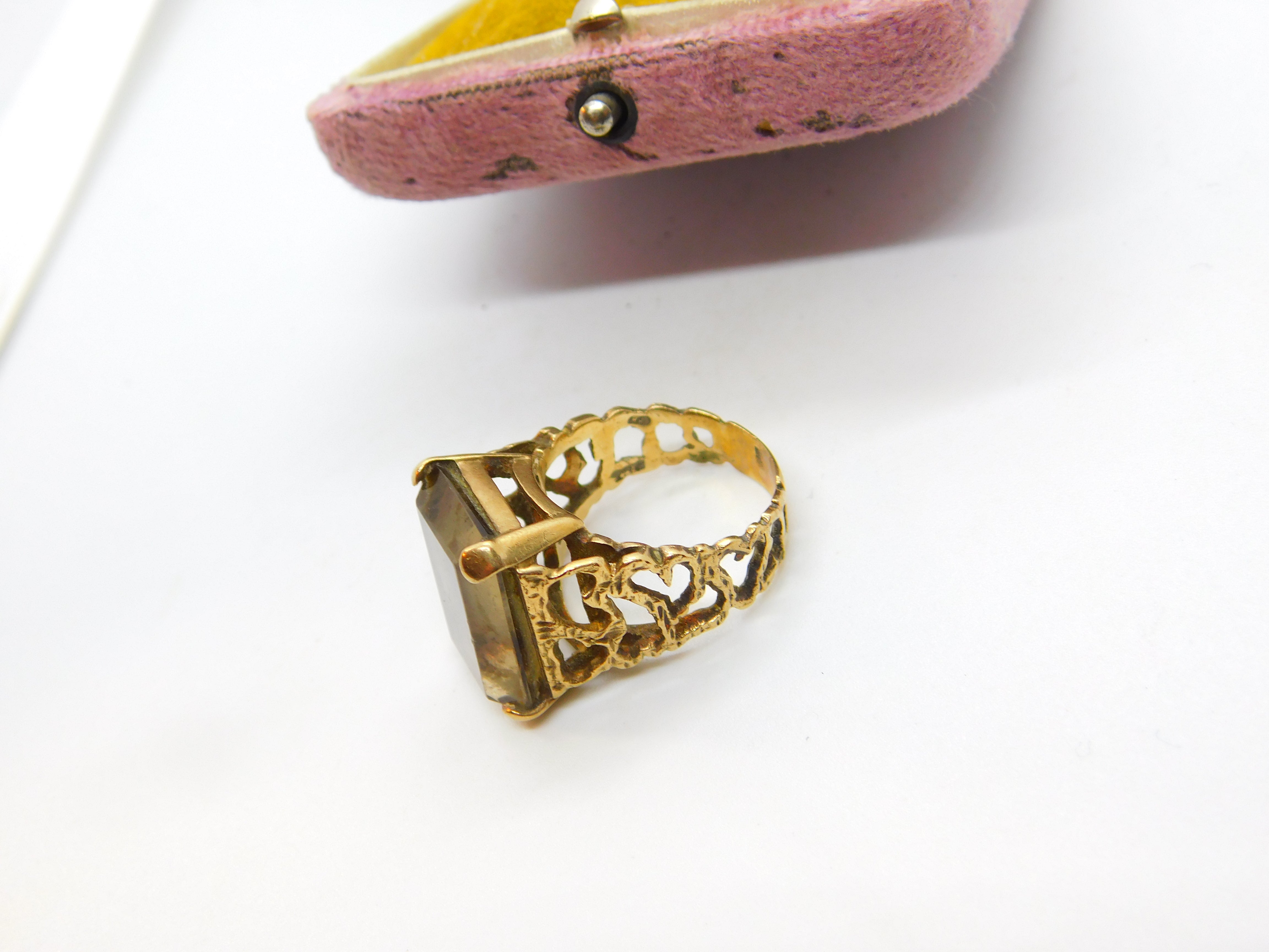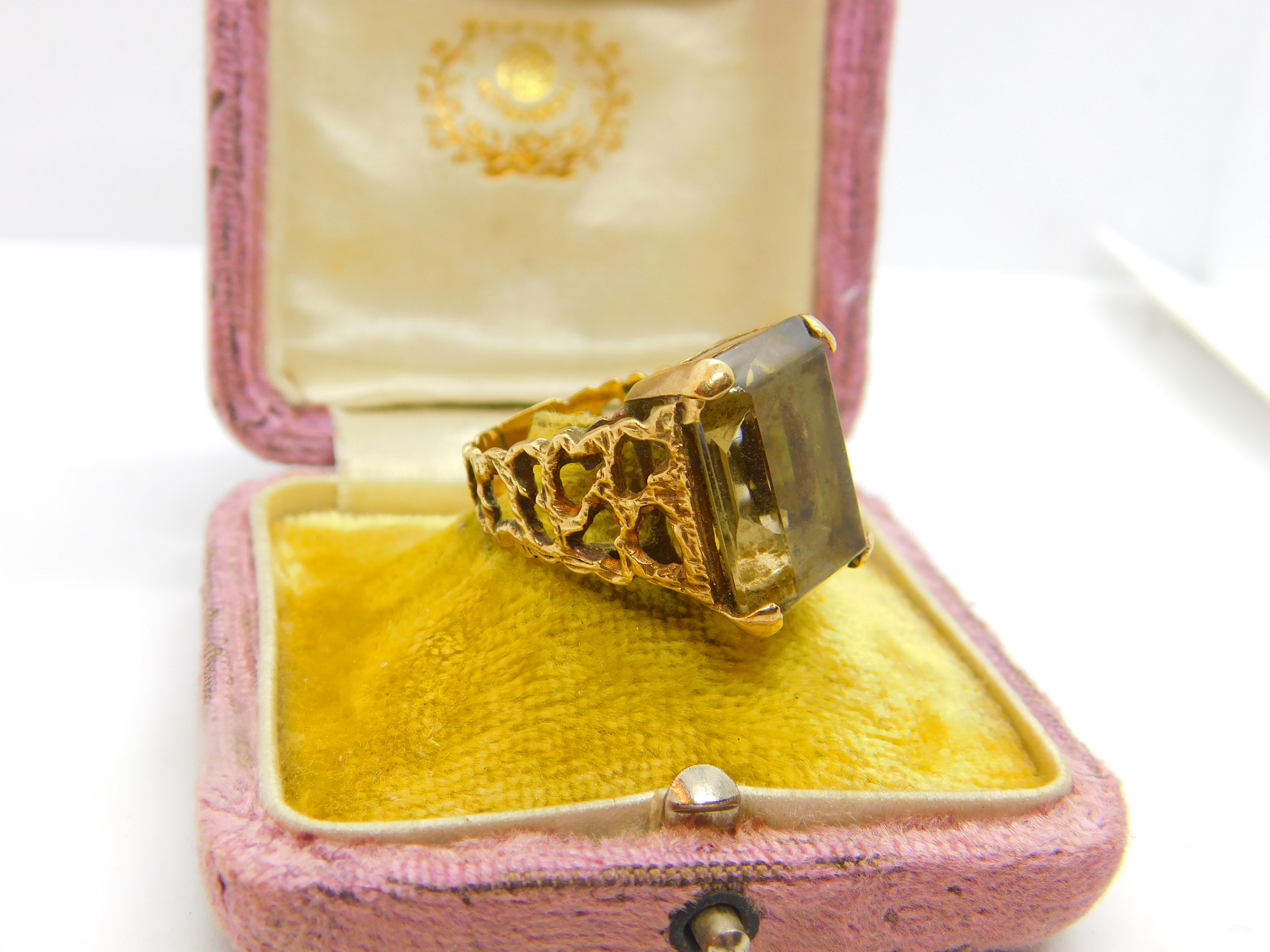 9ct Yellow Gold Textured Bark Pattern Smoky Quartz Cocktail Ring c1970 Vintage