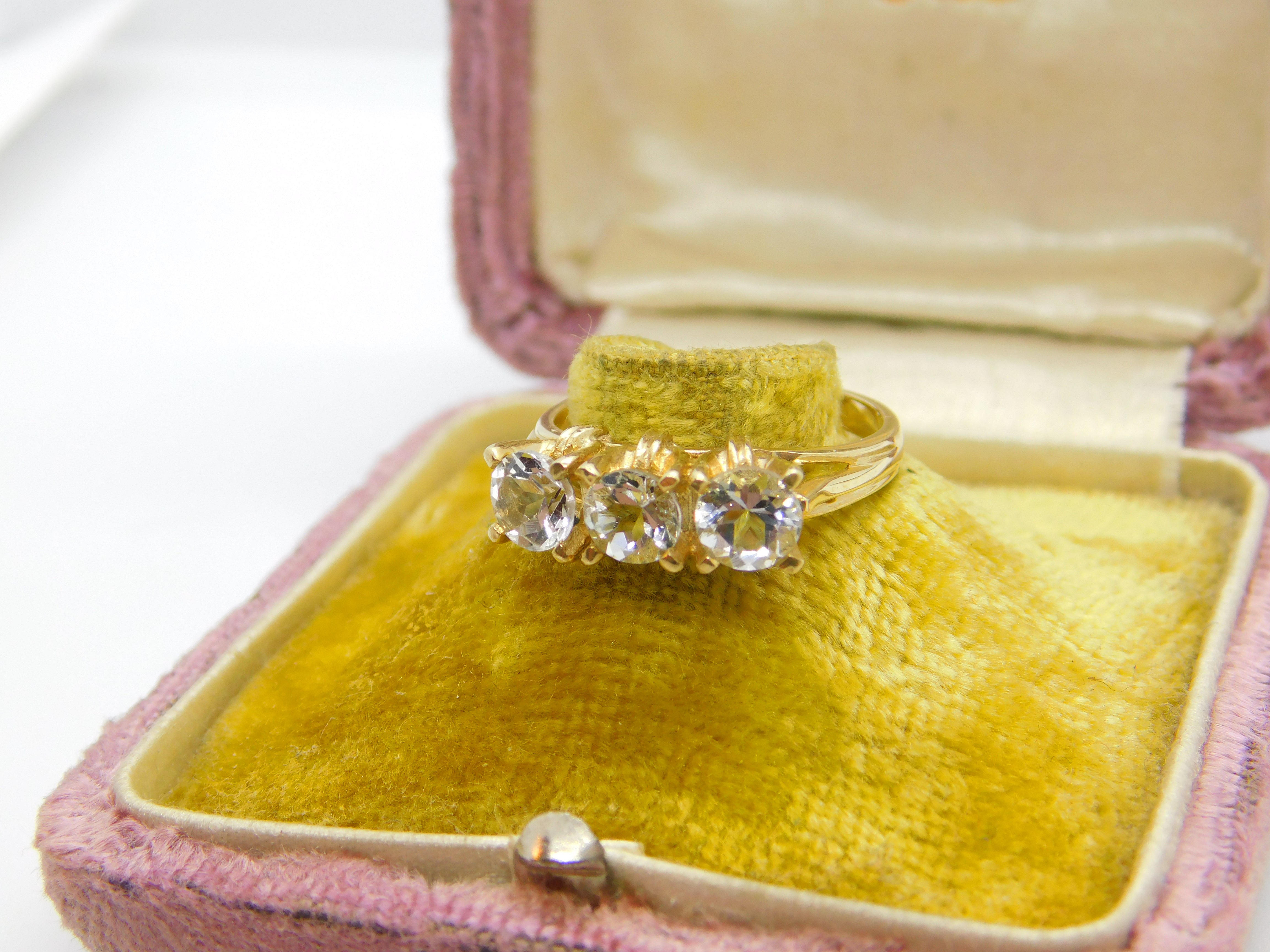 Details: A fantastic and wonderfully designed vintage 9ct yellow gold and diamond paste three-stone band ring with lovely detail hallmarked Birmingham c1990 to the interior band. This is a wonderful item that would make a perfect gift or addition to any collection. The BOX pictured is for PRESENTATION ONLY and is NOT included in the listings but used to frame the pictures unless specifically stated otherwise.