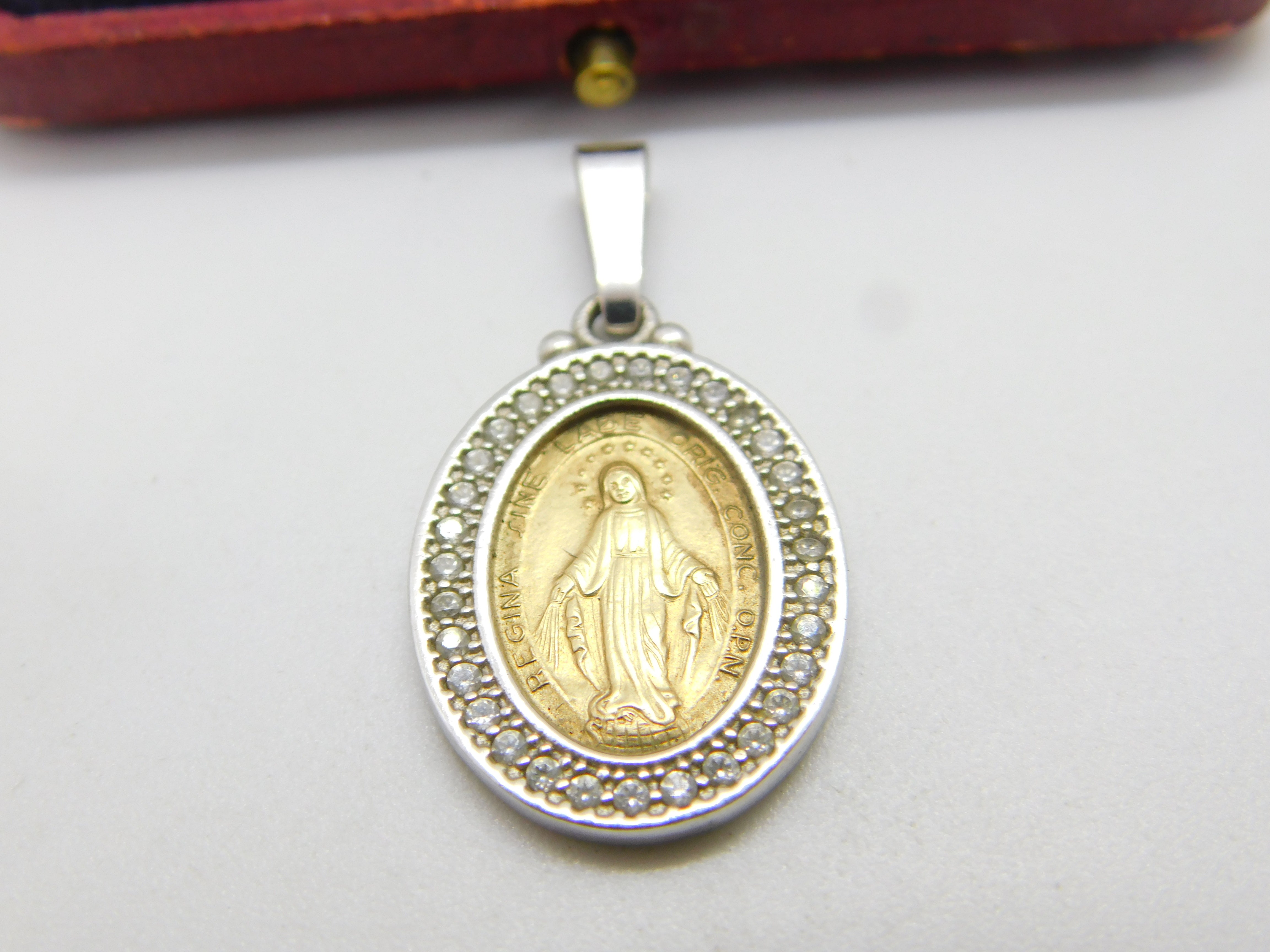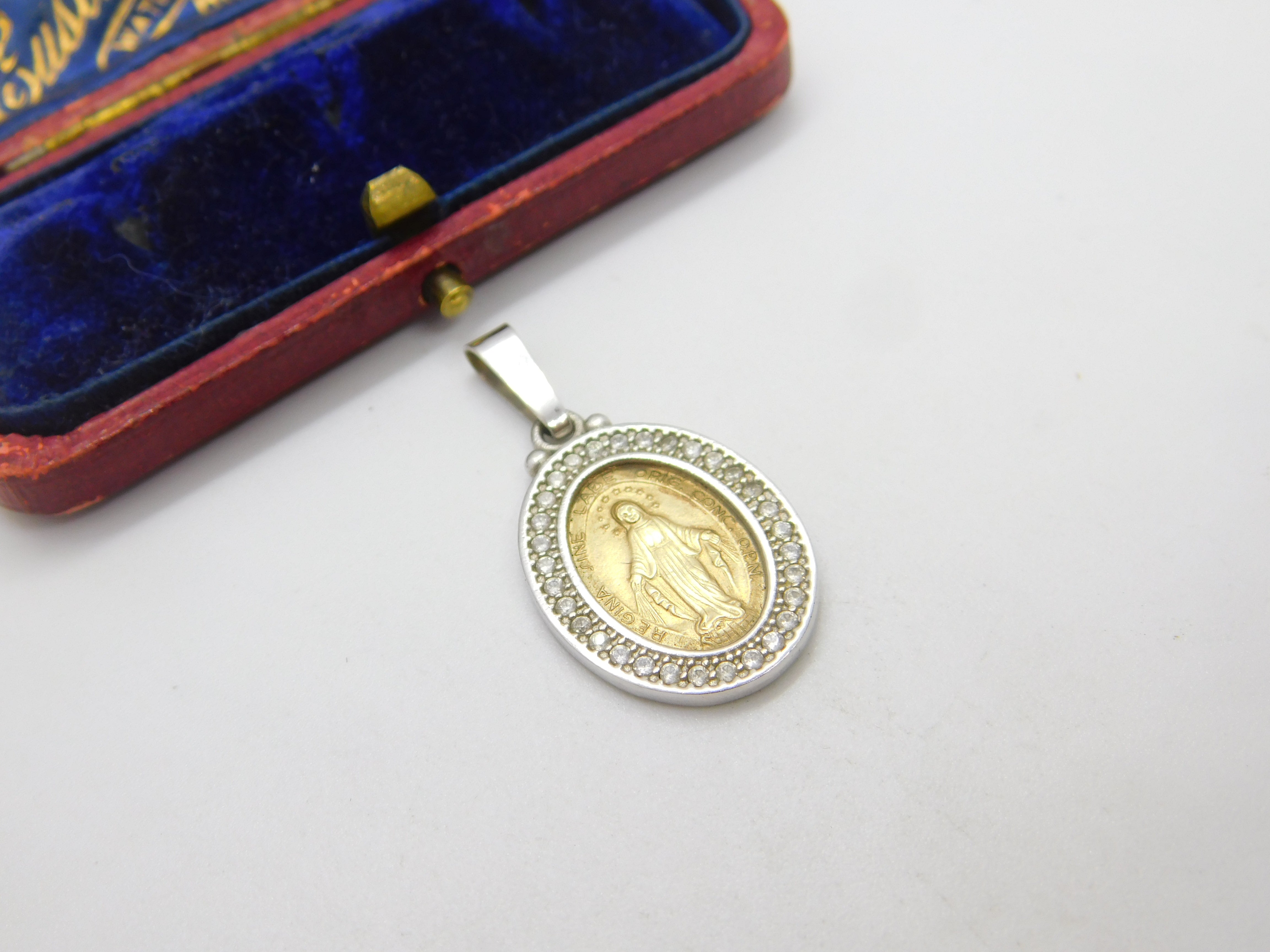 Charming religious 9ct yellow and white gold pendant dating from the 1980's. The centre section is yellow gold, the rim and bale white gold and set with clear diamond paste stones, all the stones are present and in good order please see the pictures. The gold is marked '.375' to both the yellow gold and to the white gold bale which has a partial hallmark but no dating information. Wonderful and unusual vintage gold pendant.