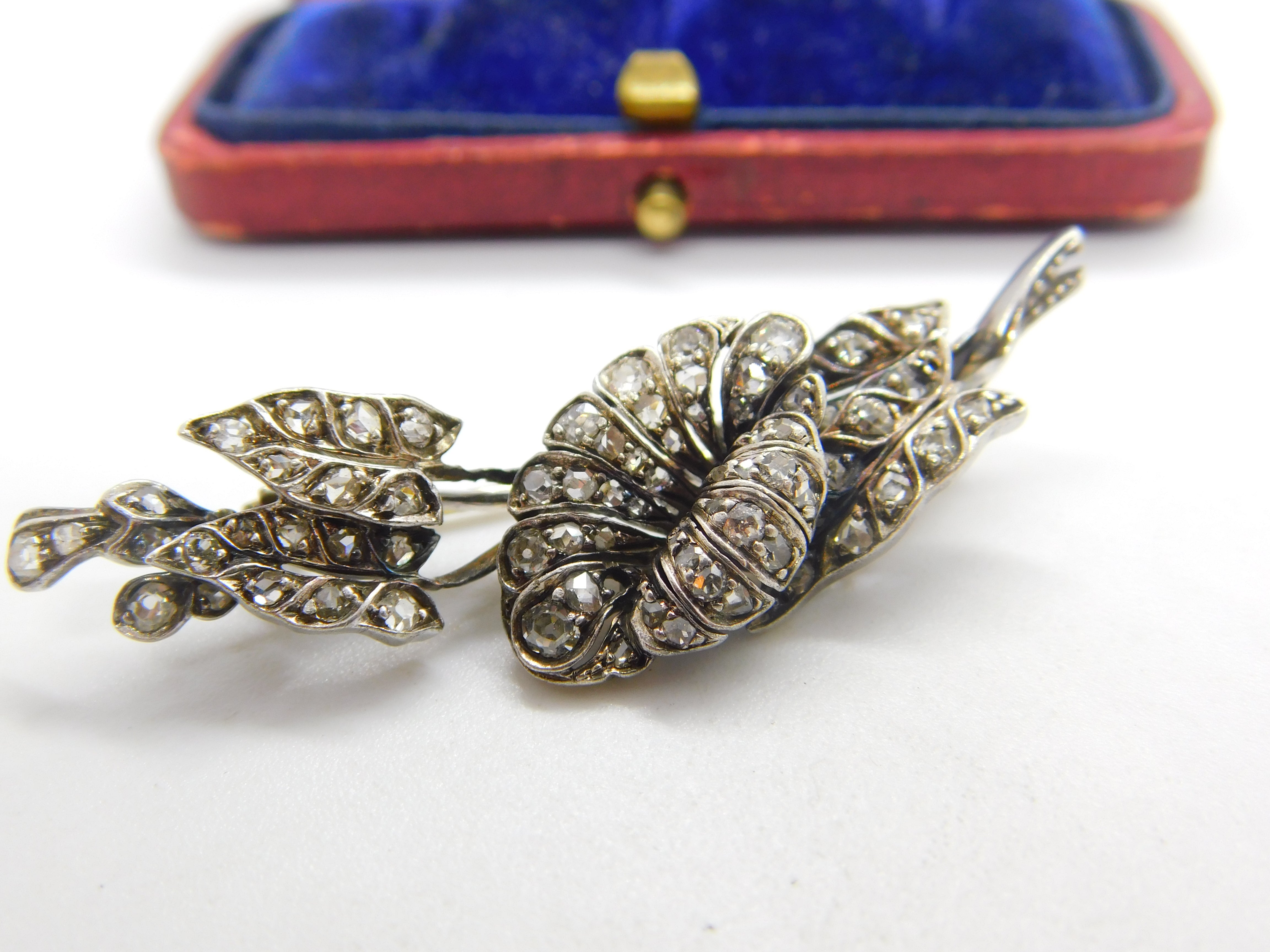 Details: A fantastic and wonderfully designed antique Victorian 14ct yellow gold art nouveau floral brooch adorned throughout with pave set natural diamonds ranging from between approx 0.1ct - 0.02ct with the total weight approx 1.1ct. The stones have all been tested and the brooch has been XRF tested. A beautiful unique example possibly Austro-Hungarian. This is a wonderful item that would make a perfect gift or addition to any collection. The BOX pictured is for PRESENTATION ONLY and is NOT included in the listings but used to frame the pictures unless specifically stated otherwise.