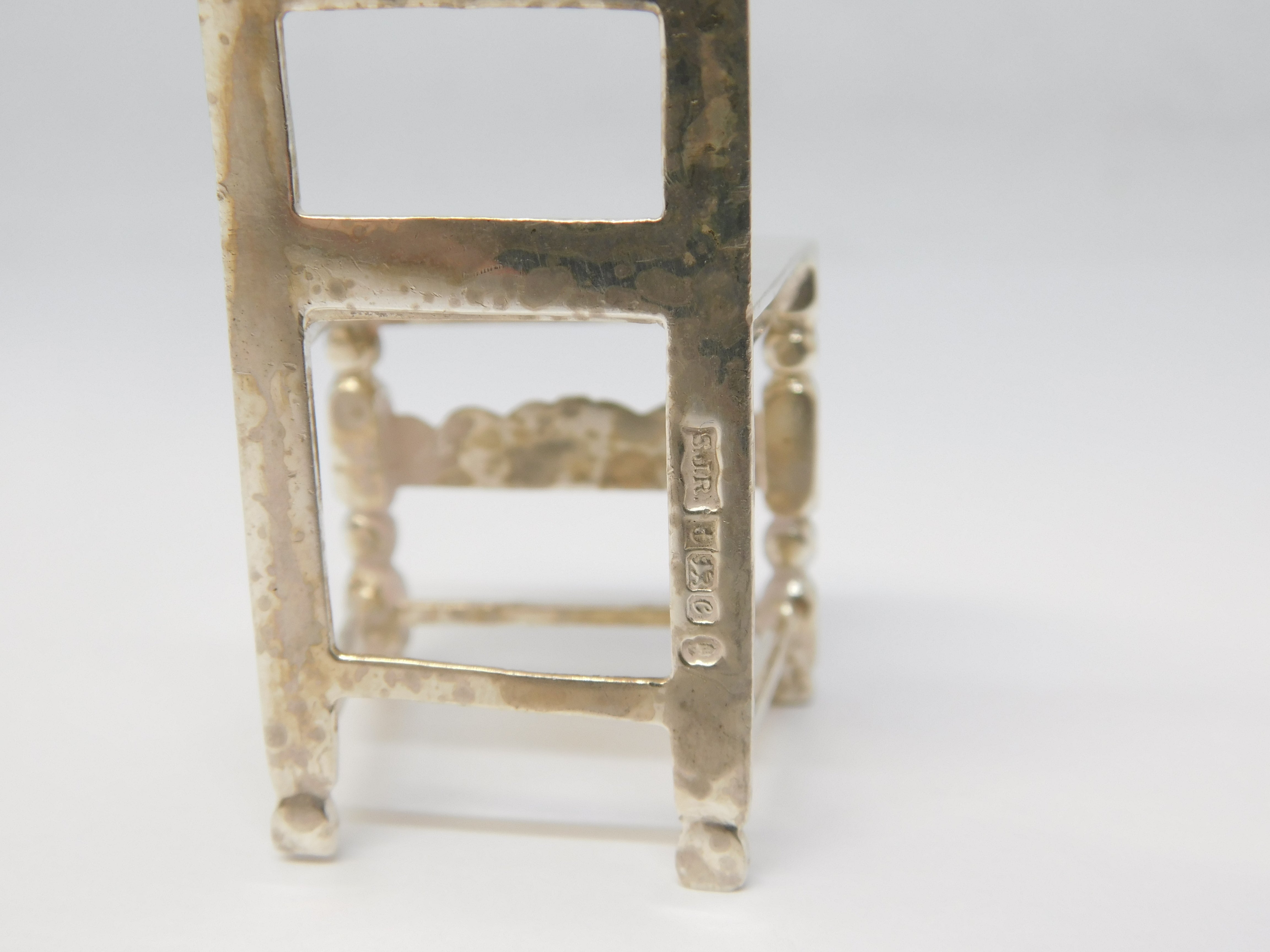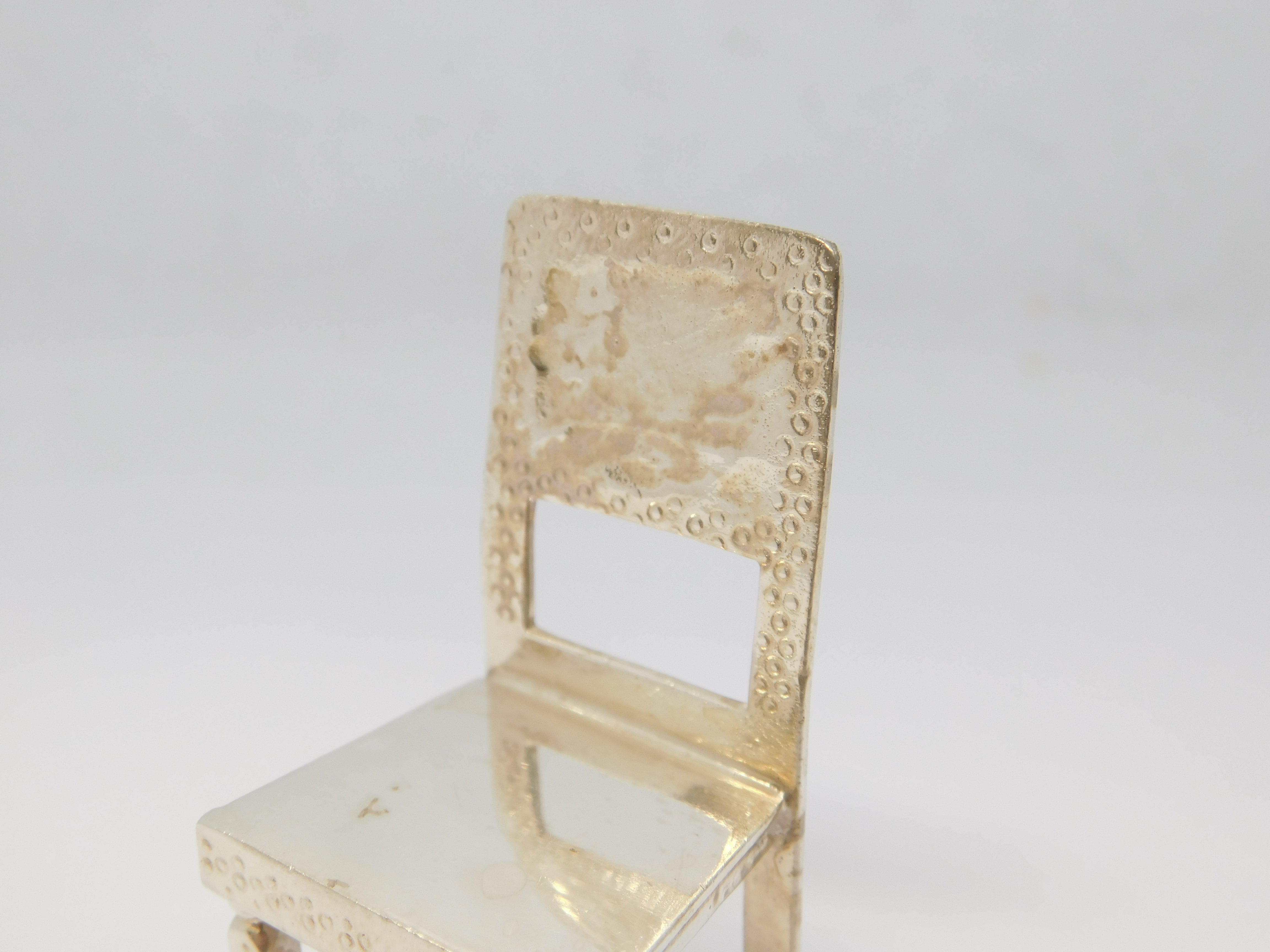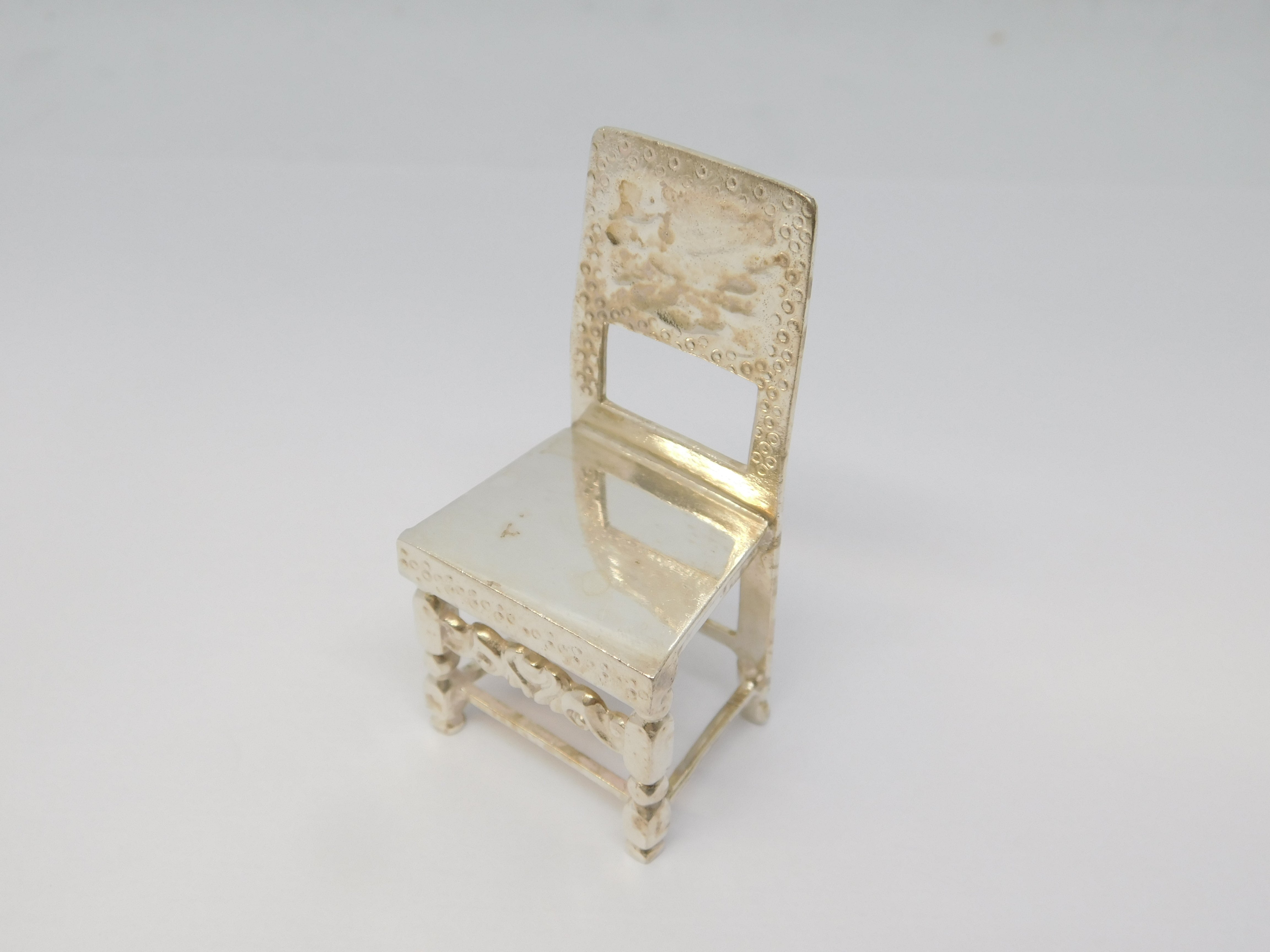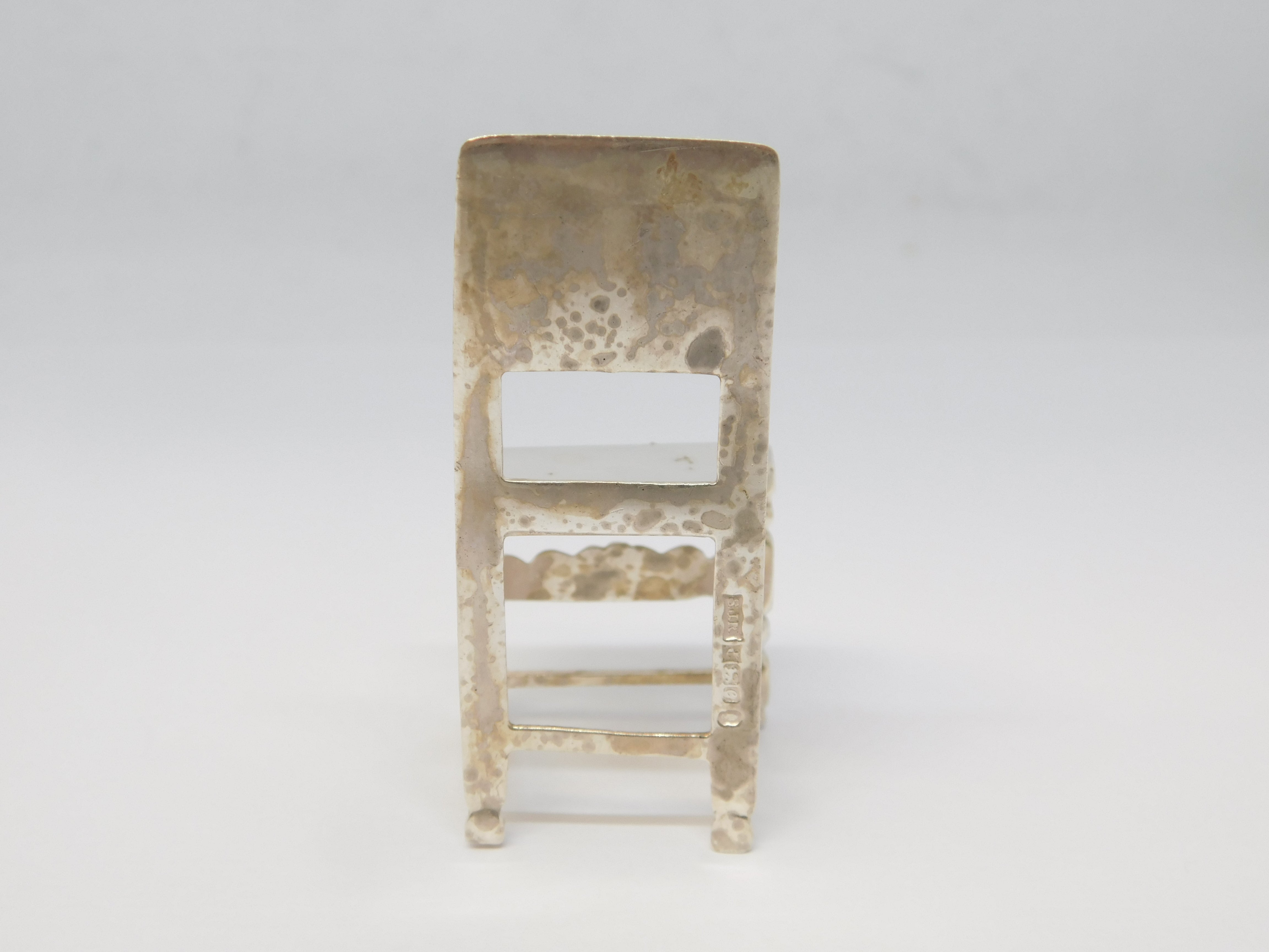 Details: A fantastic and wonderfully designed vintage sterling silver miniature dolls house dining room chair hallmarked Birmingham 1977 to the back edge. This is a wonderful item that would make a perfect gift or addition to any collection.