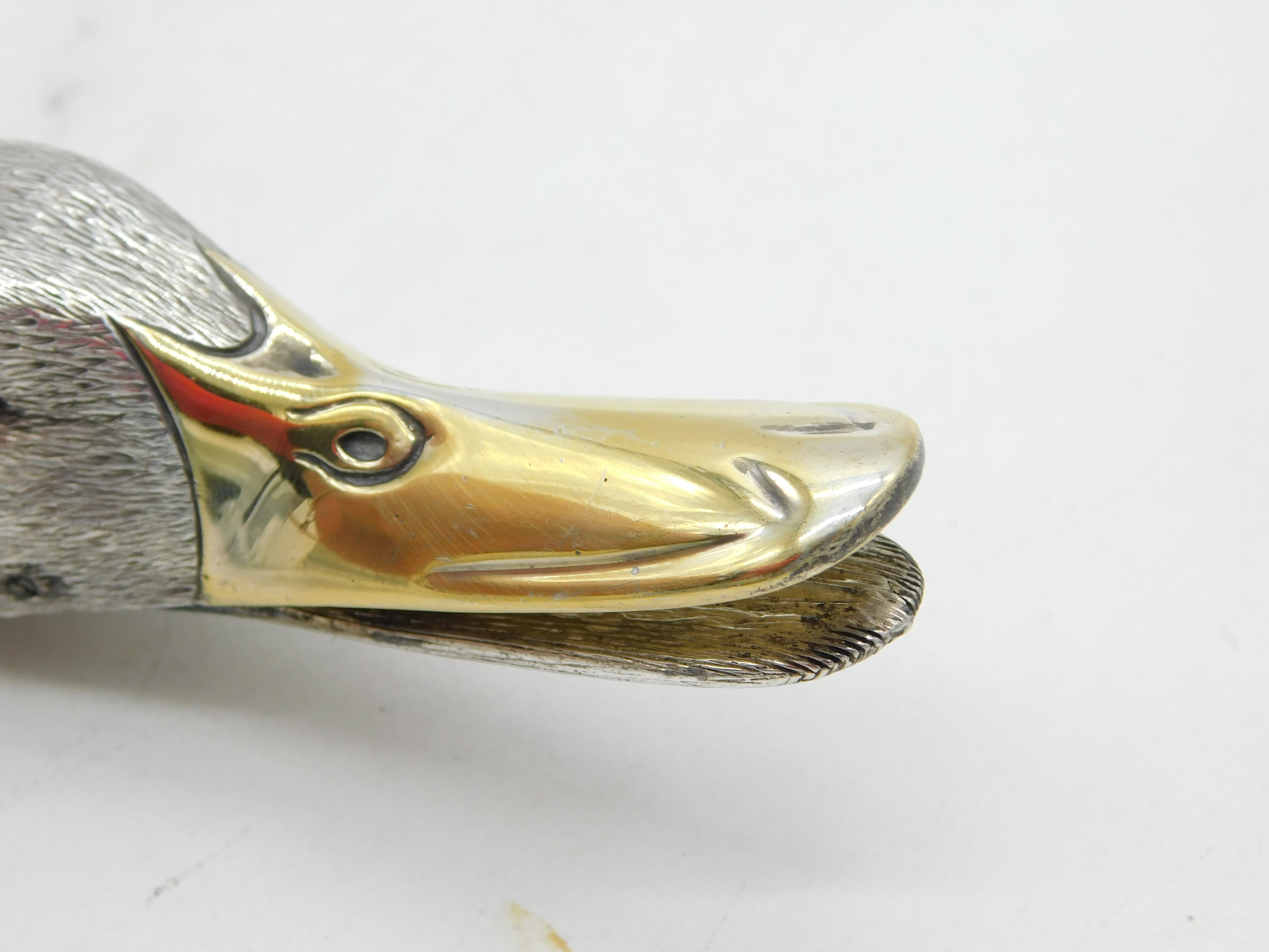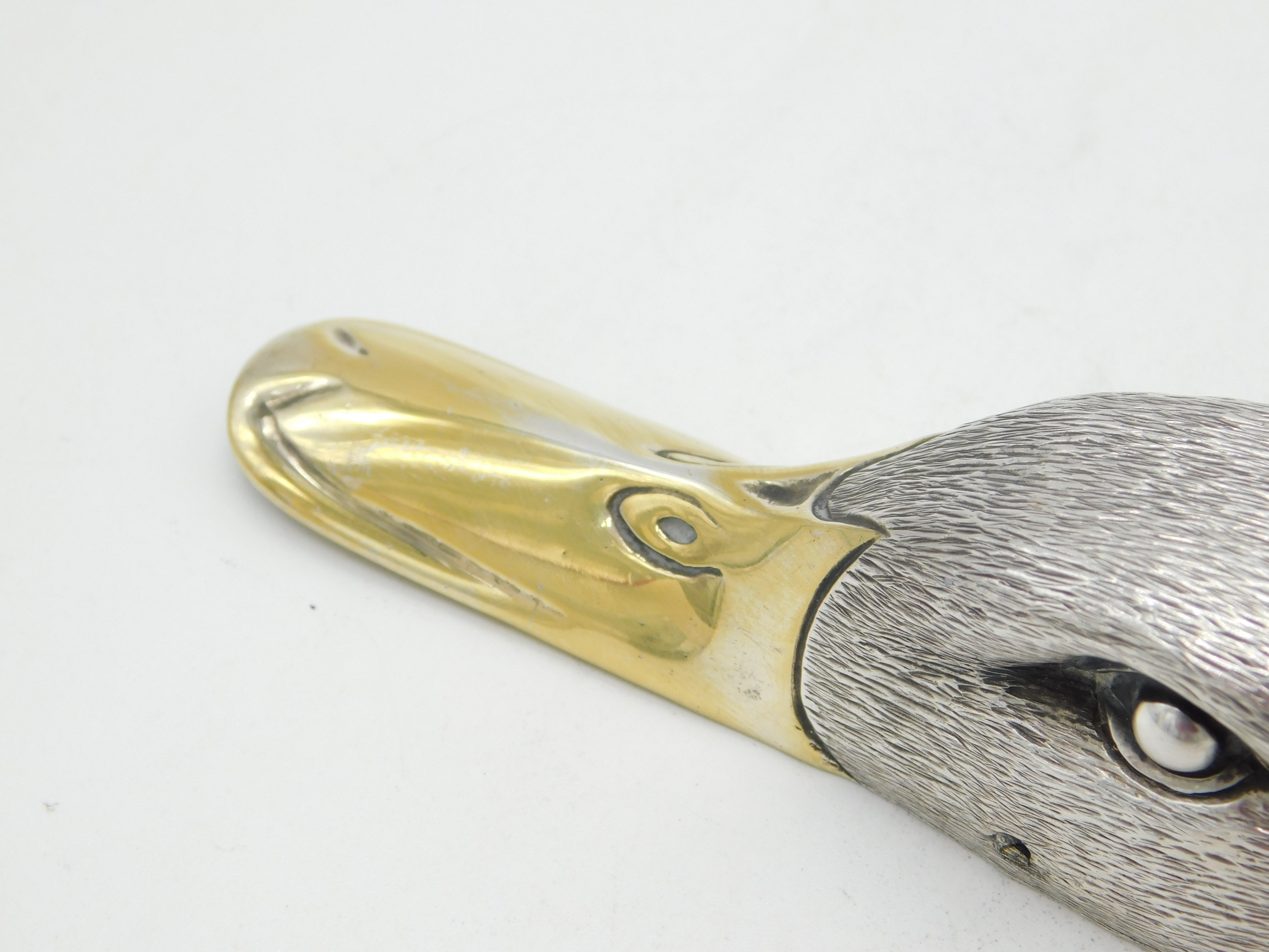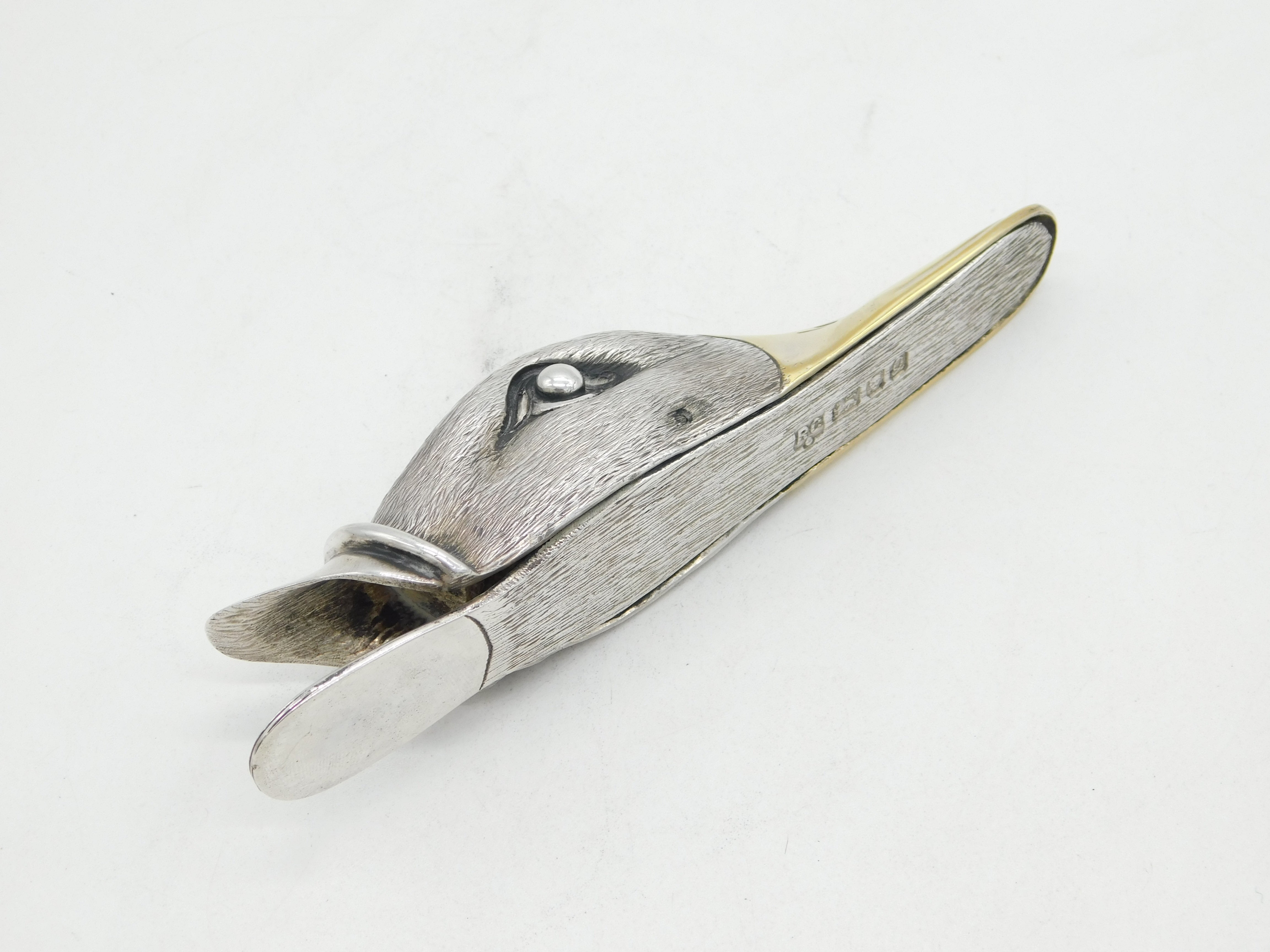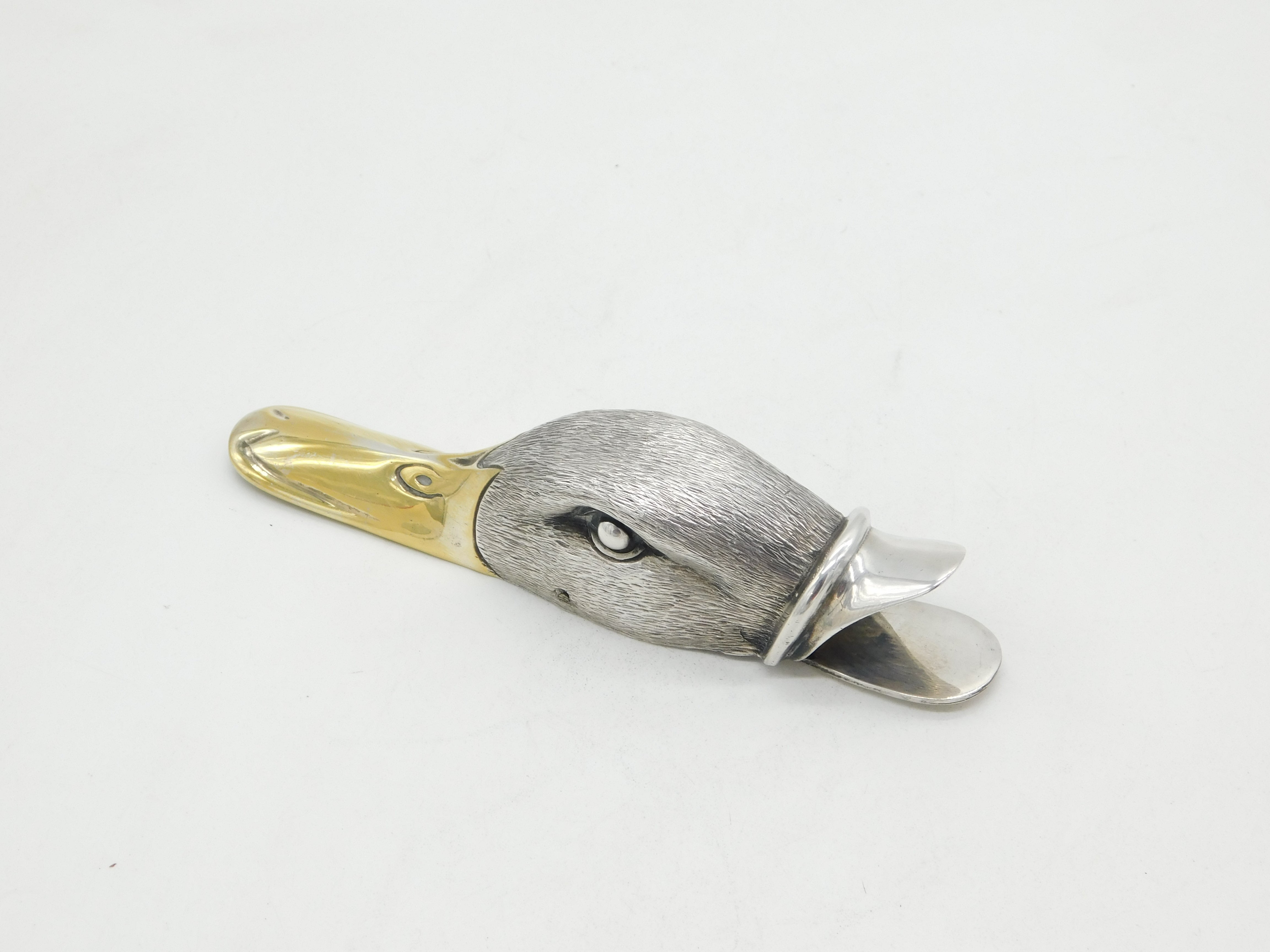 Details: A fantastic and wonderfully designed vintage large cast sterling silver novelty duck's head paper clip with superb gilded beak and textured detailing throughout, beautifully hallmarked London 1990 by William Comys. The mechanism is in perfect working order. This is a wonderful item that would make a perfect gift or addition to any collection. We are more than happy to provide XRF reports for items upon request.