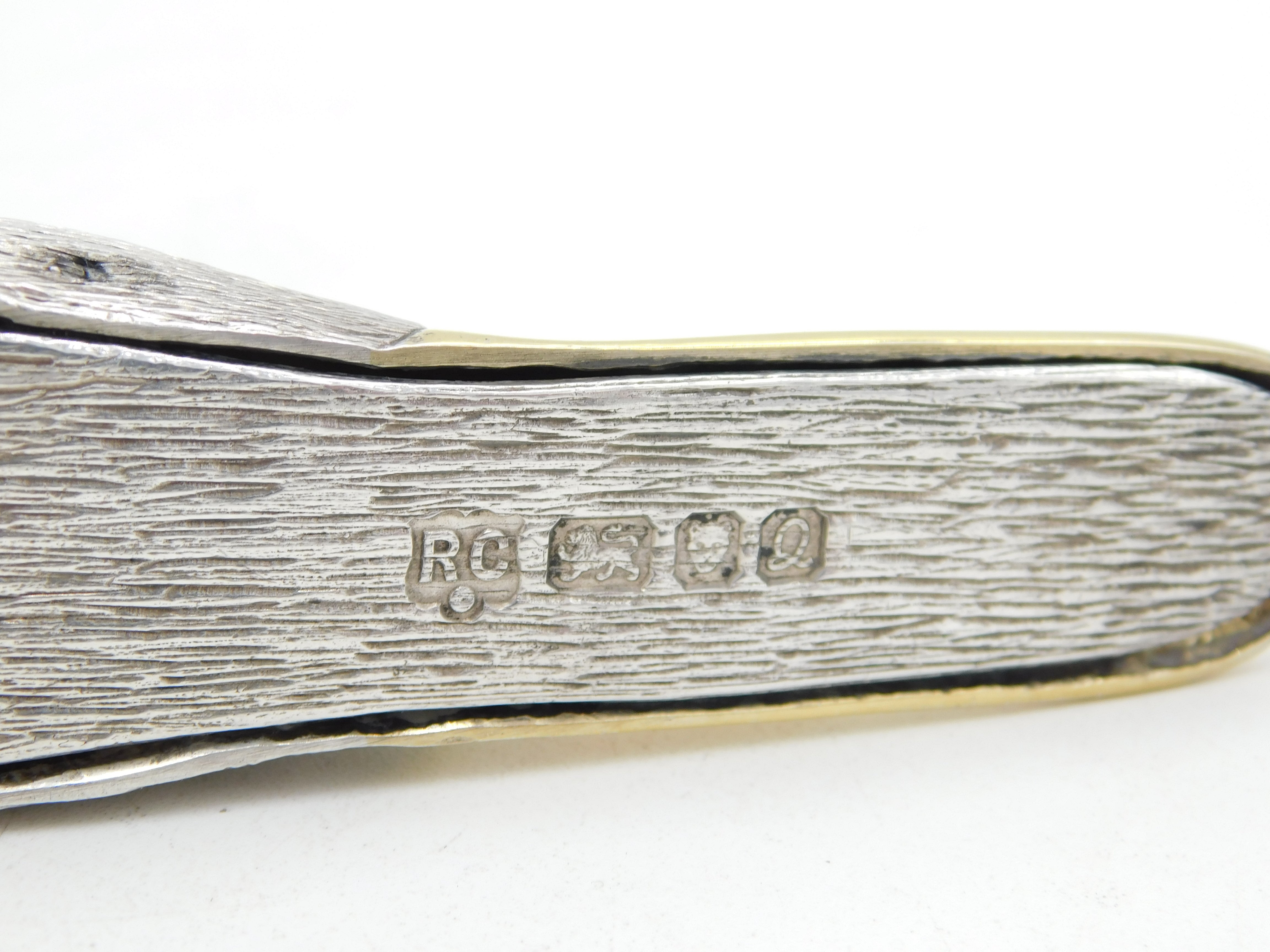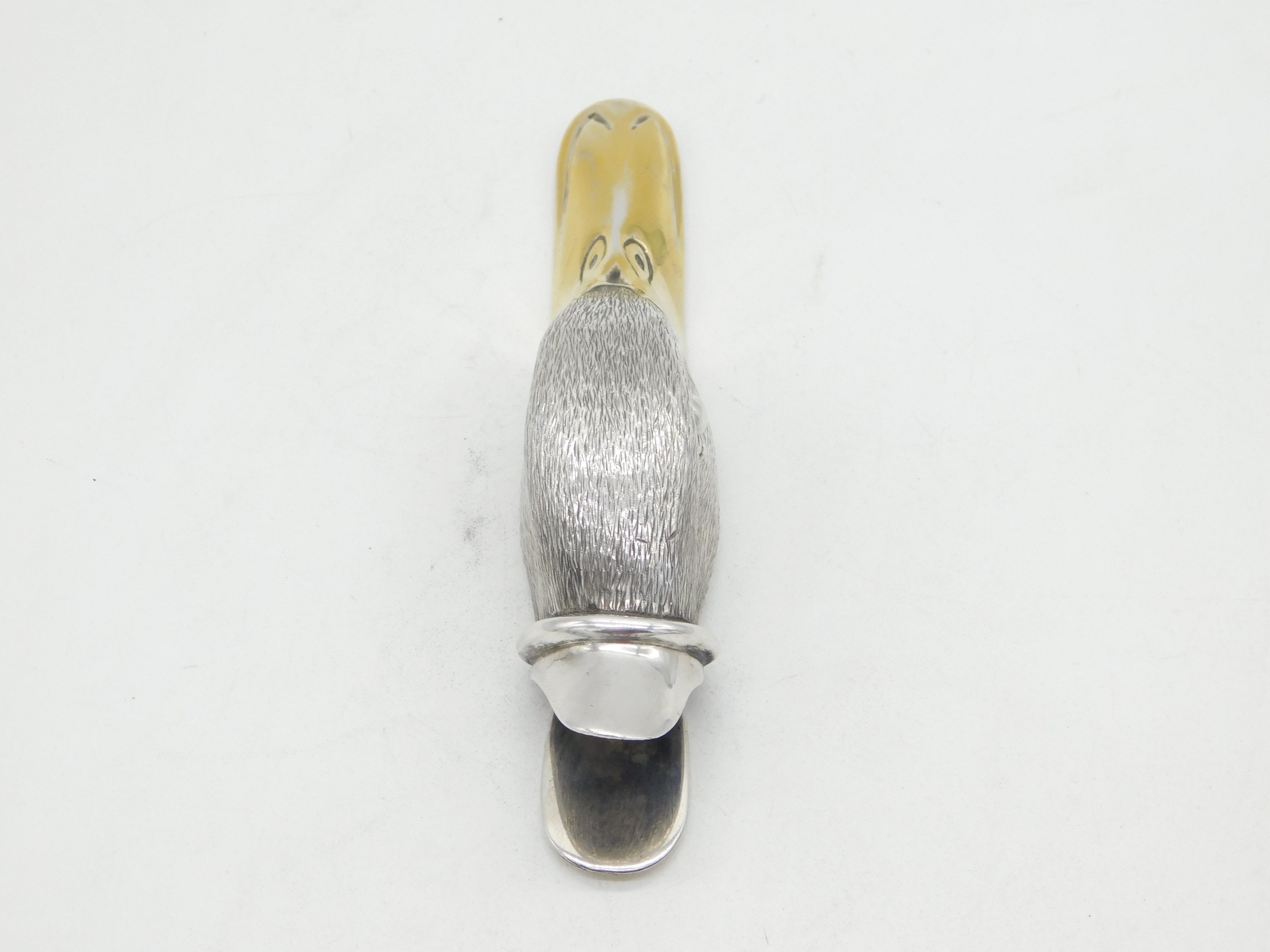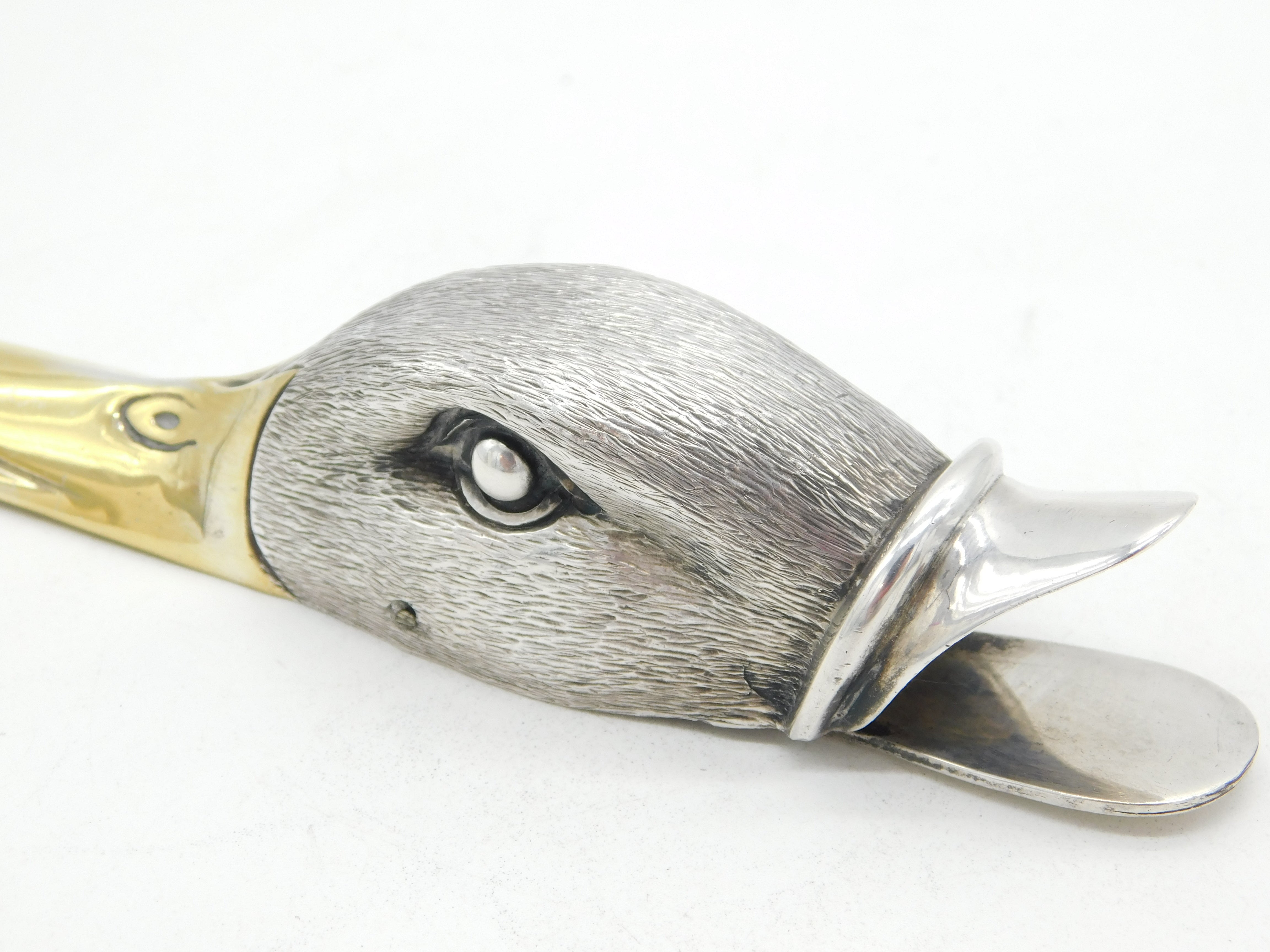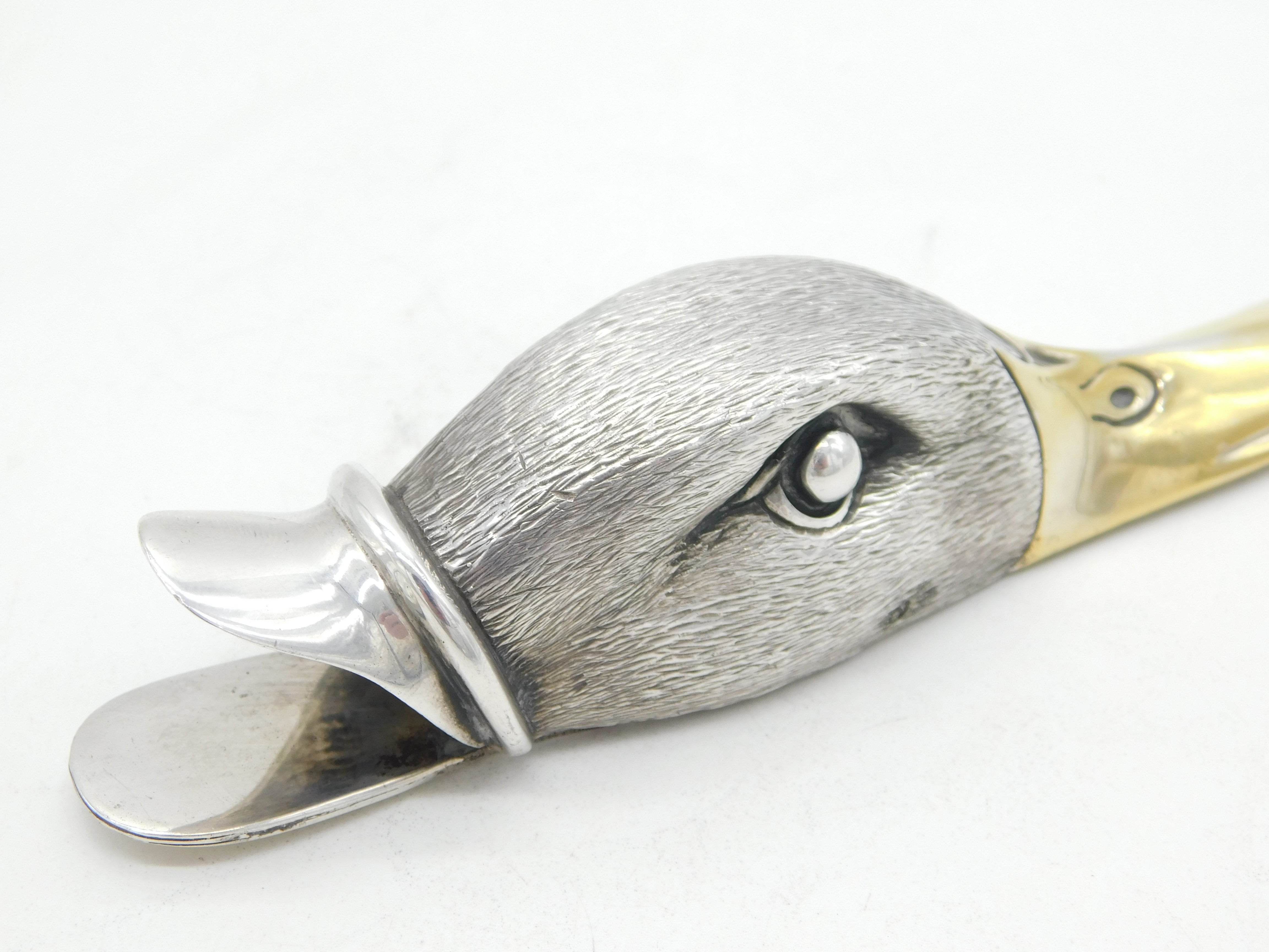 Details: A fantastic and wonderfully designed vintage large cast sterling silver novelty duck's head paper clip with superb gilded beak and textured detailing throughout, beautifully hallmarked London 1990 by William Comys. The mechanism is in perfect working order. This is a wonderful item that would make a perfect gift or addition to any collection. We are more than happy to provide XRF reports for items upon request.