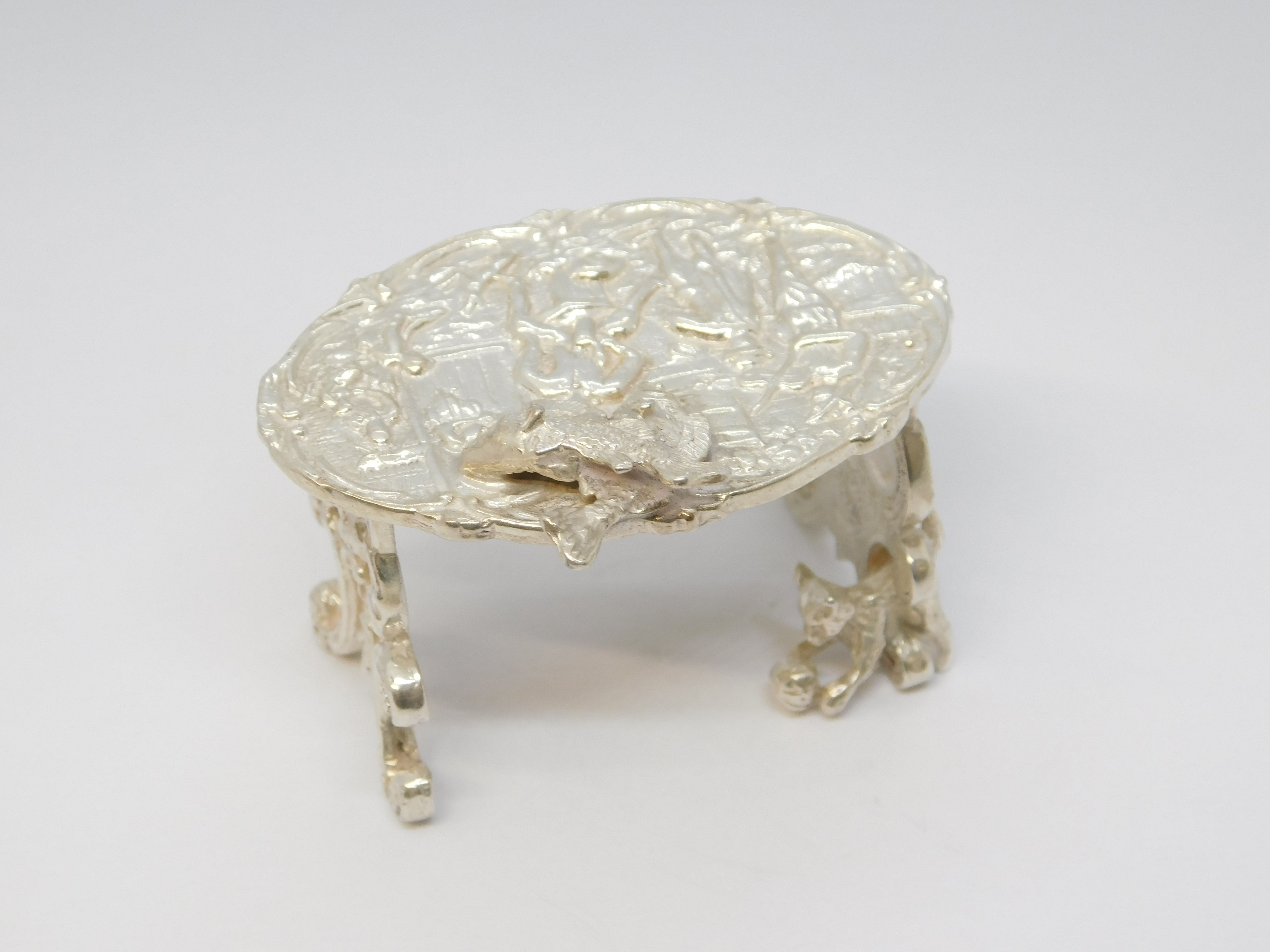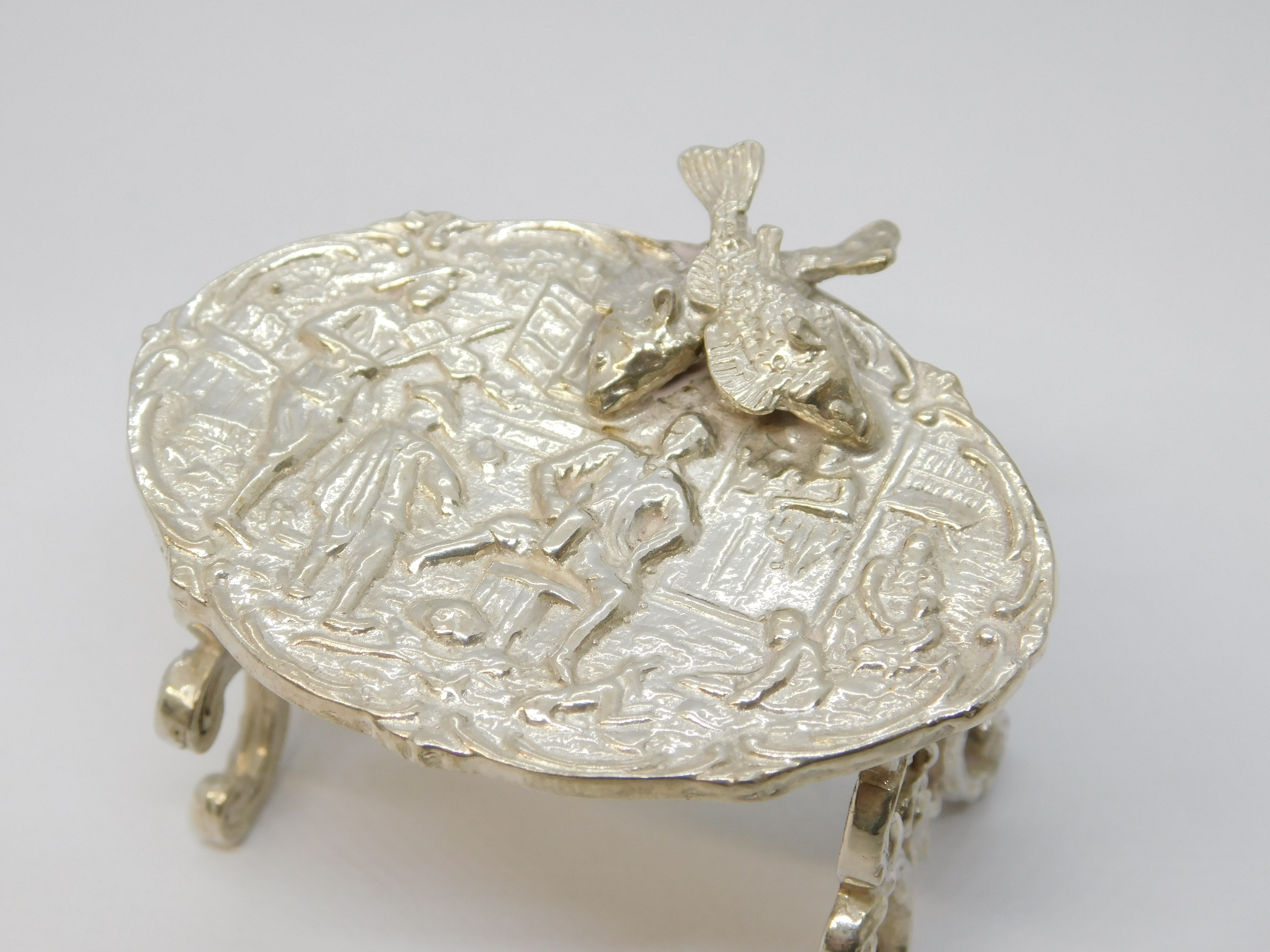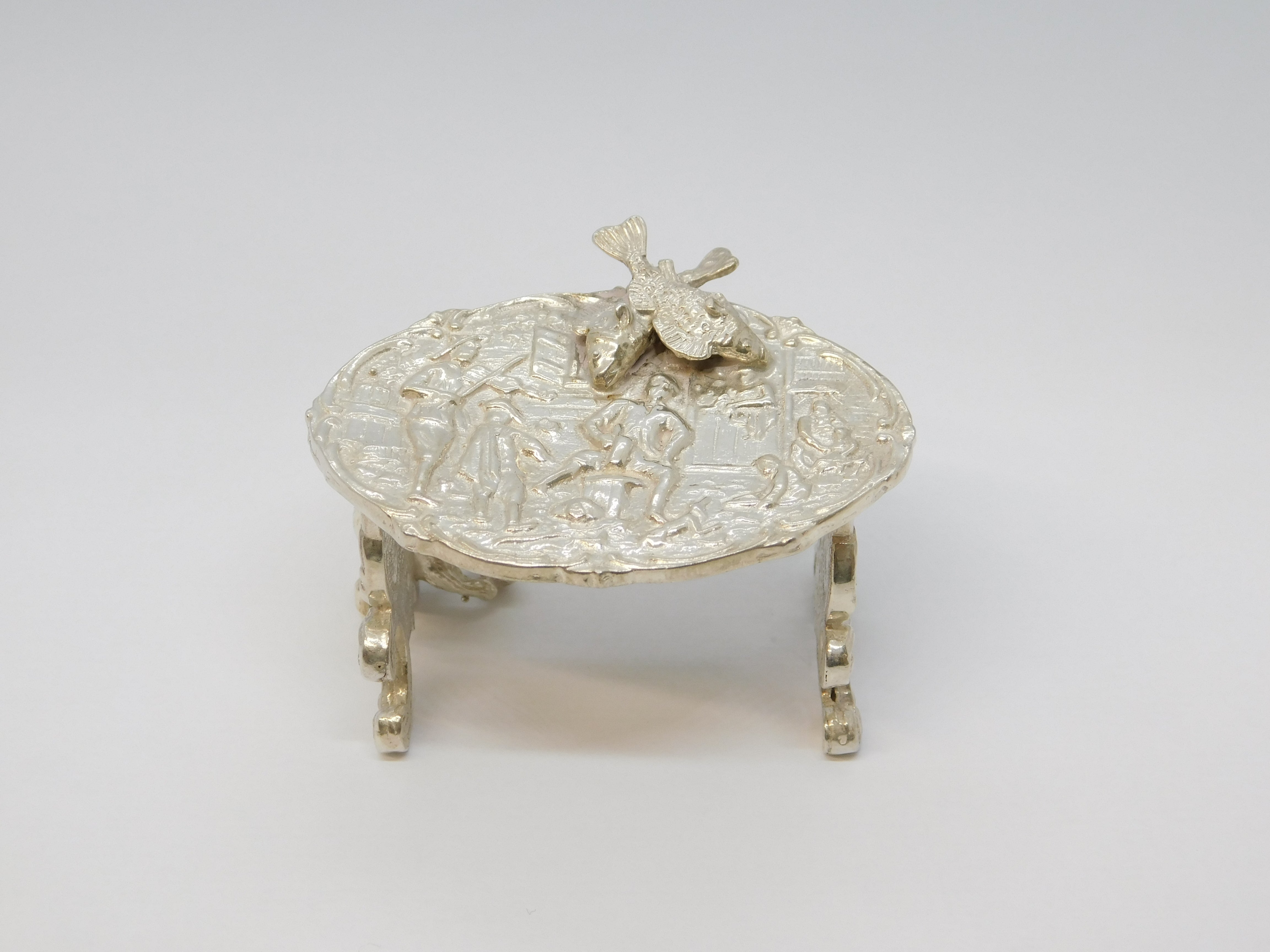 Details: A fantastic and wonderfully designed vintage cast sterling silver novelty miniature tavern pub table with charming scenes throughout set with two fish to the top hallmarked Birmingham 1973 to the side edge. This is a wonderful item that would make a perfect gift or addition to any collection.