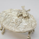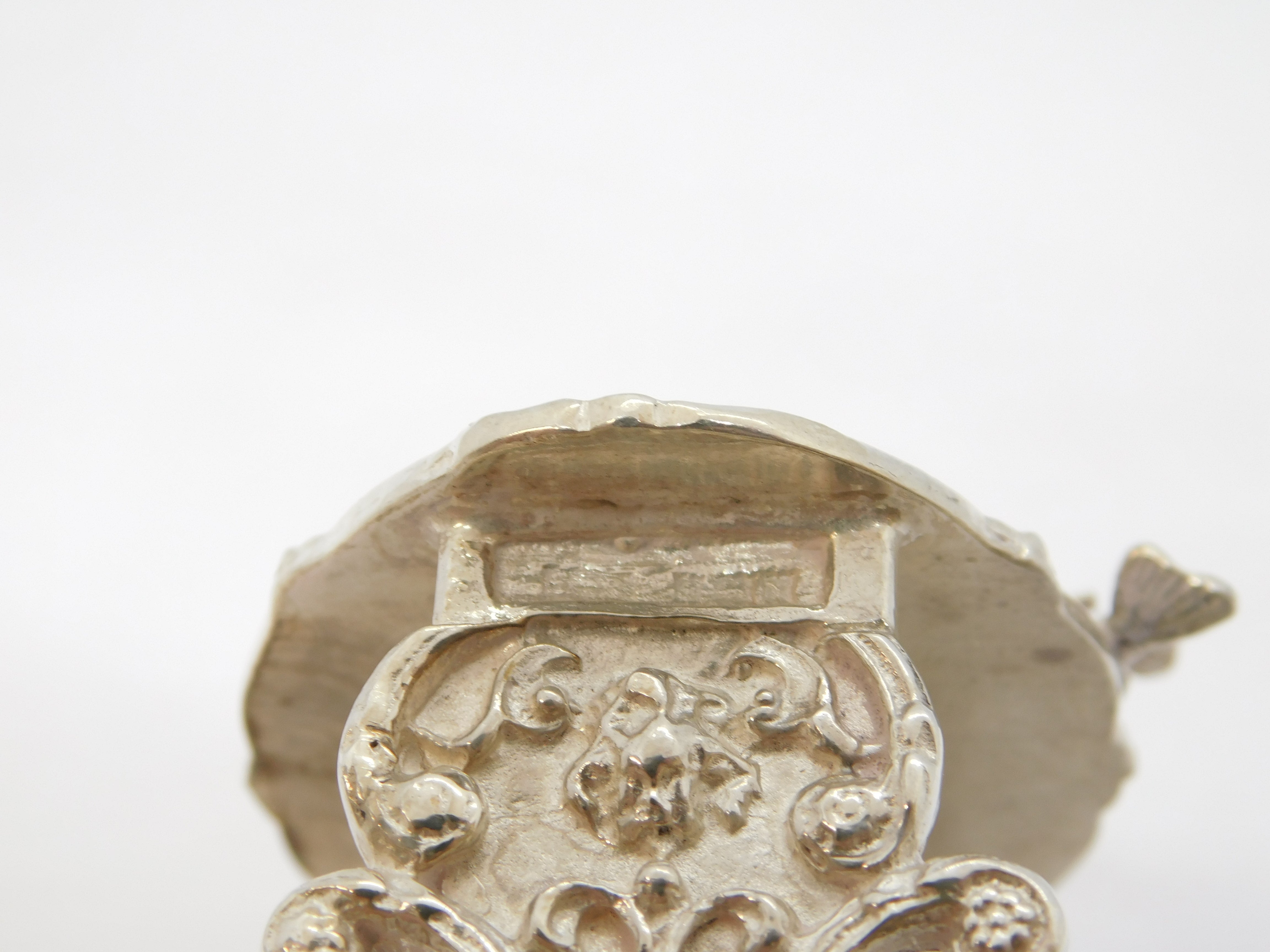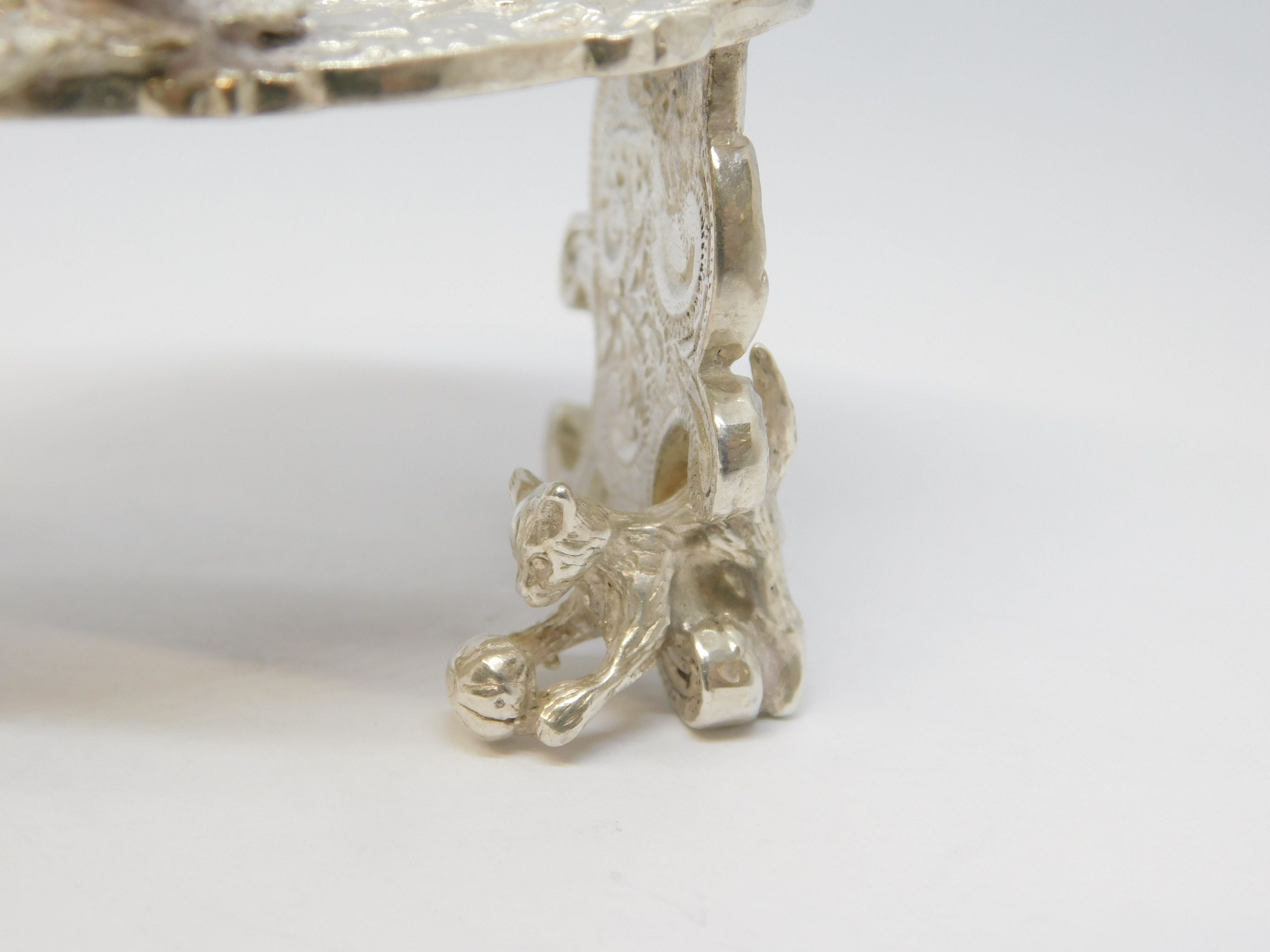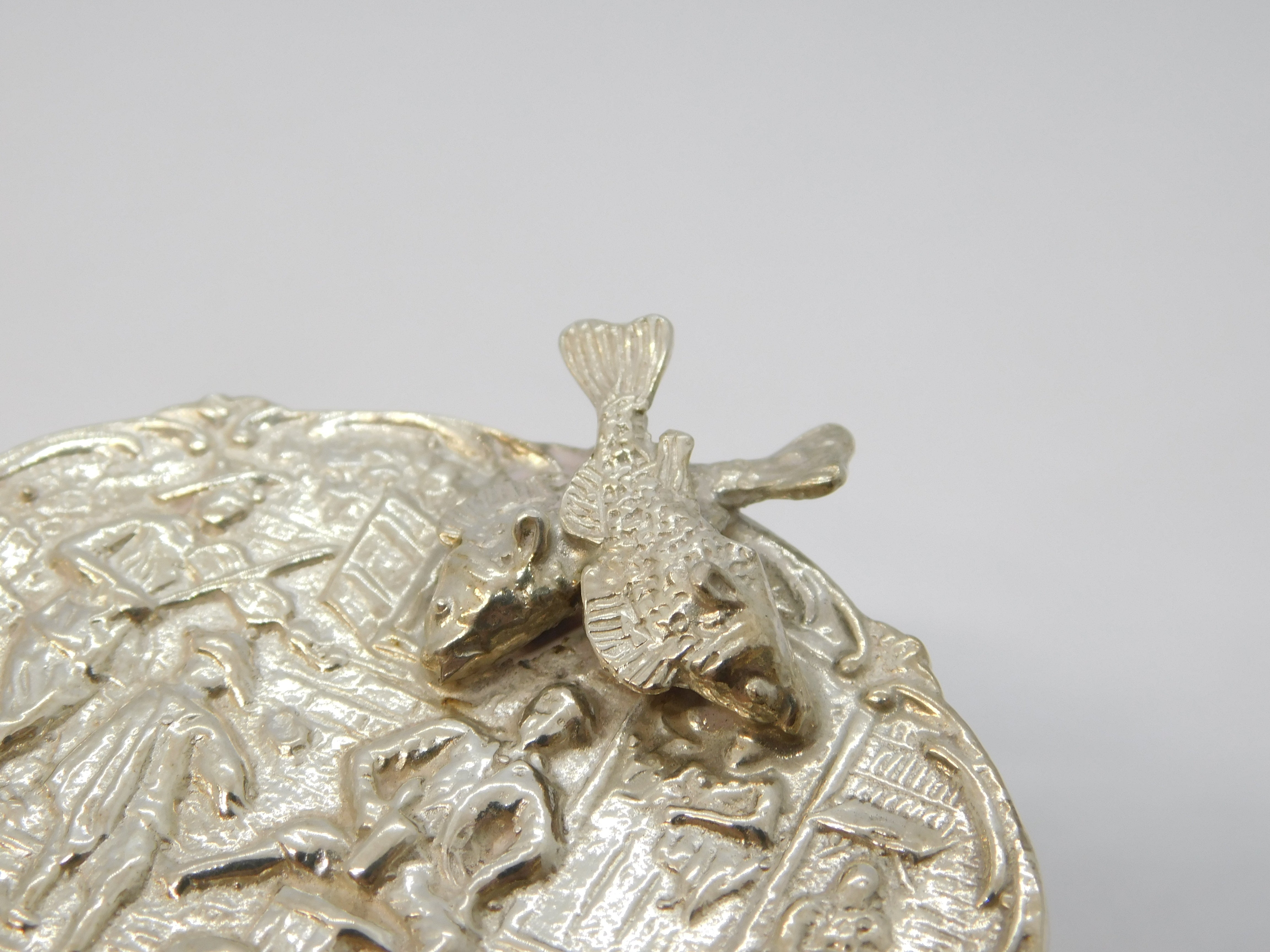 Details: A fantastic and wonderfully designed vintage cast sterling silver novelty miniature tavern pub table with charming scenes throughout set with two fish to the top hallmarked Birmingham 1973 to the side edge. This is a wonderful item that would make a perfect gift or addition to any collection.