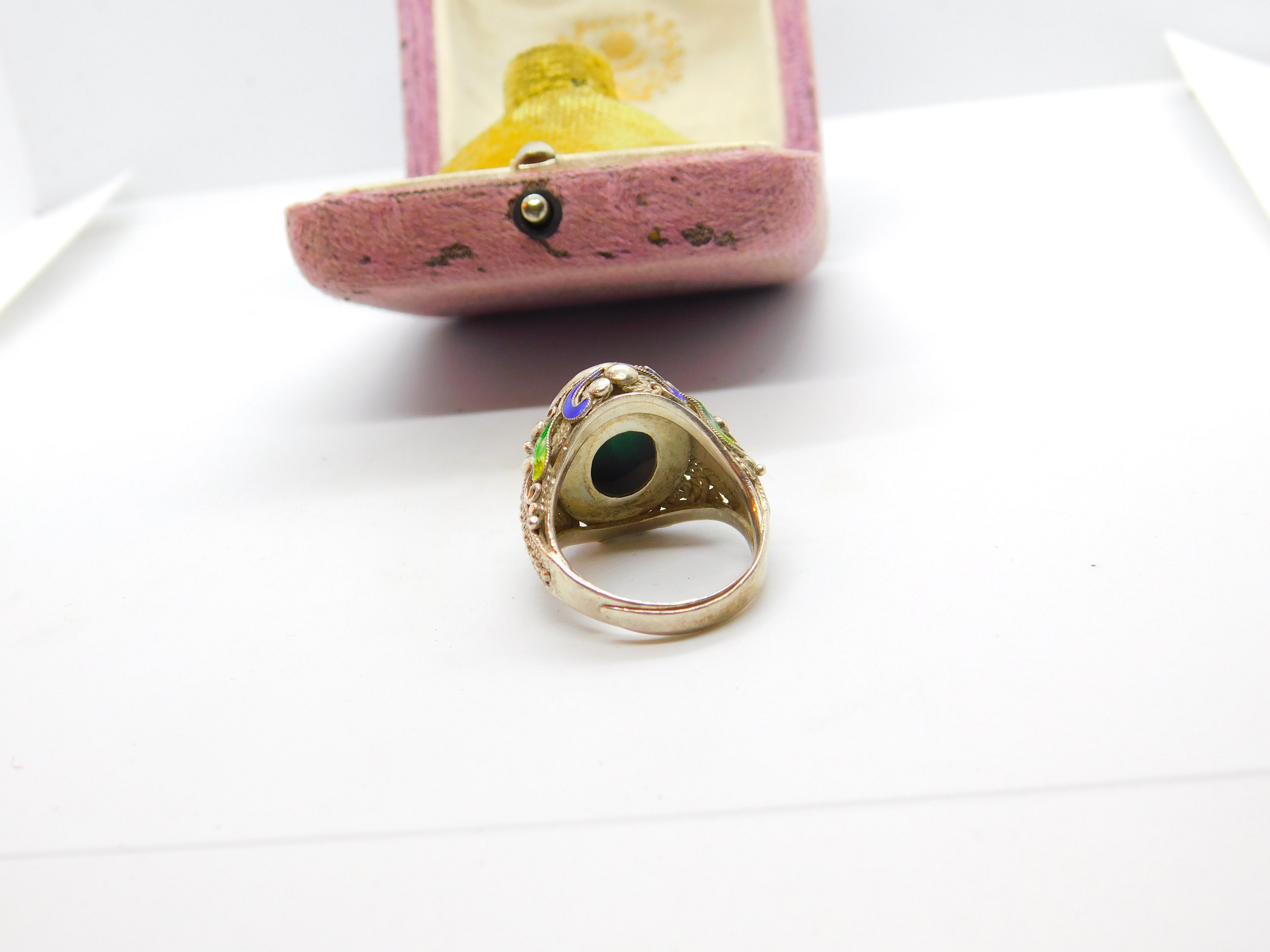 Details: A fantastic and wonderfully designed vintage Chinese sterling silver signet ring set with cabochon malachite adorned with colourful enamel c1960. This is a wonderful item that would make a perfect gift or addition to any collection. The BOX pictured is for PRESENTATION ONLY and is NOT included in the listings but used to frame the pictures unless specifically stated otherwise.