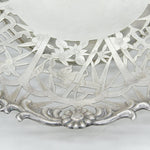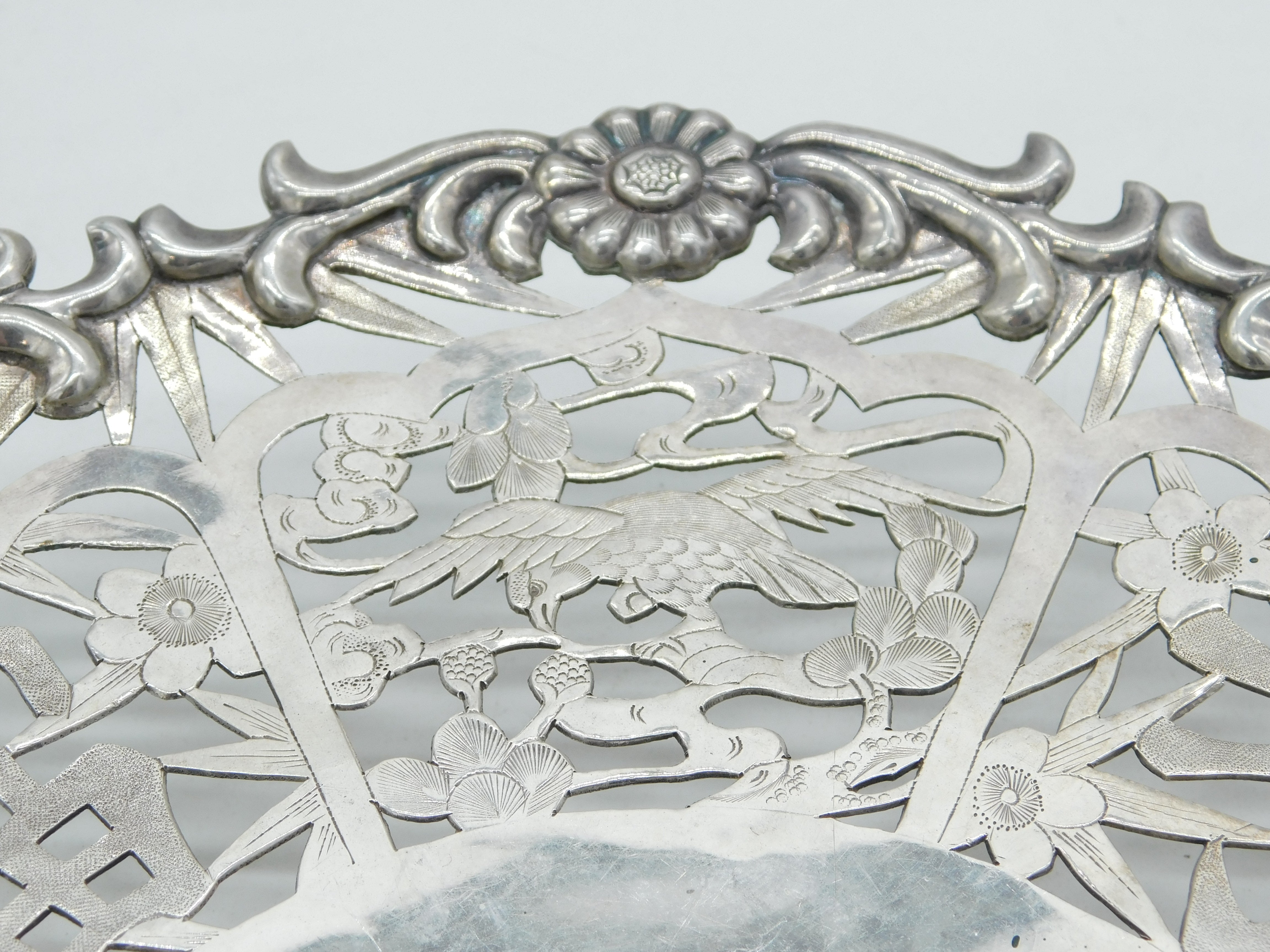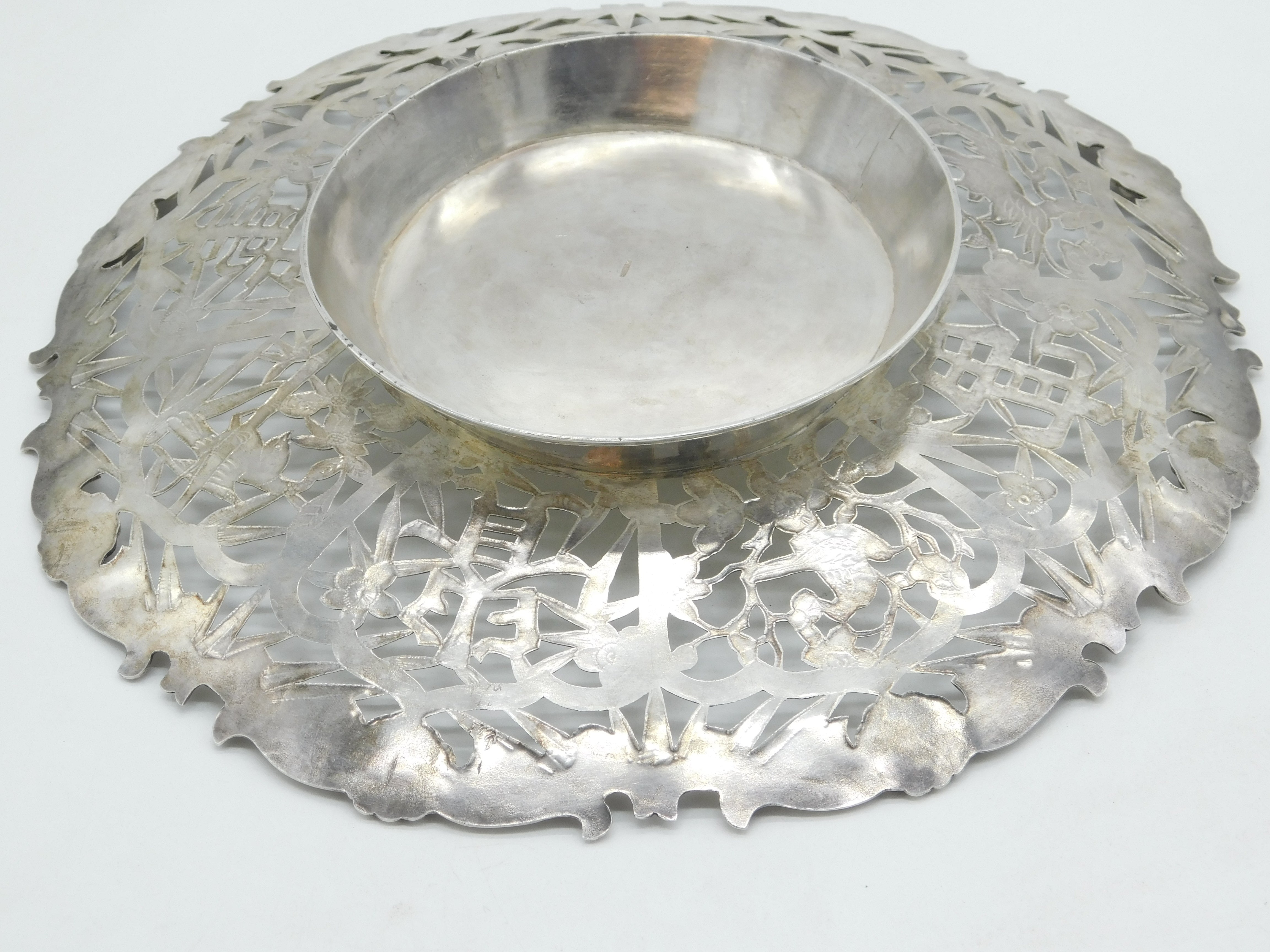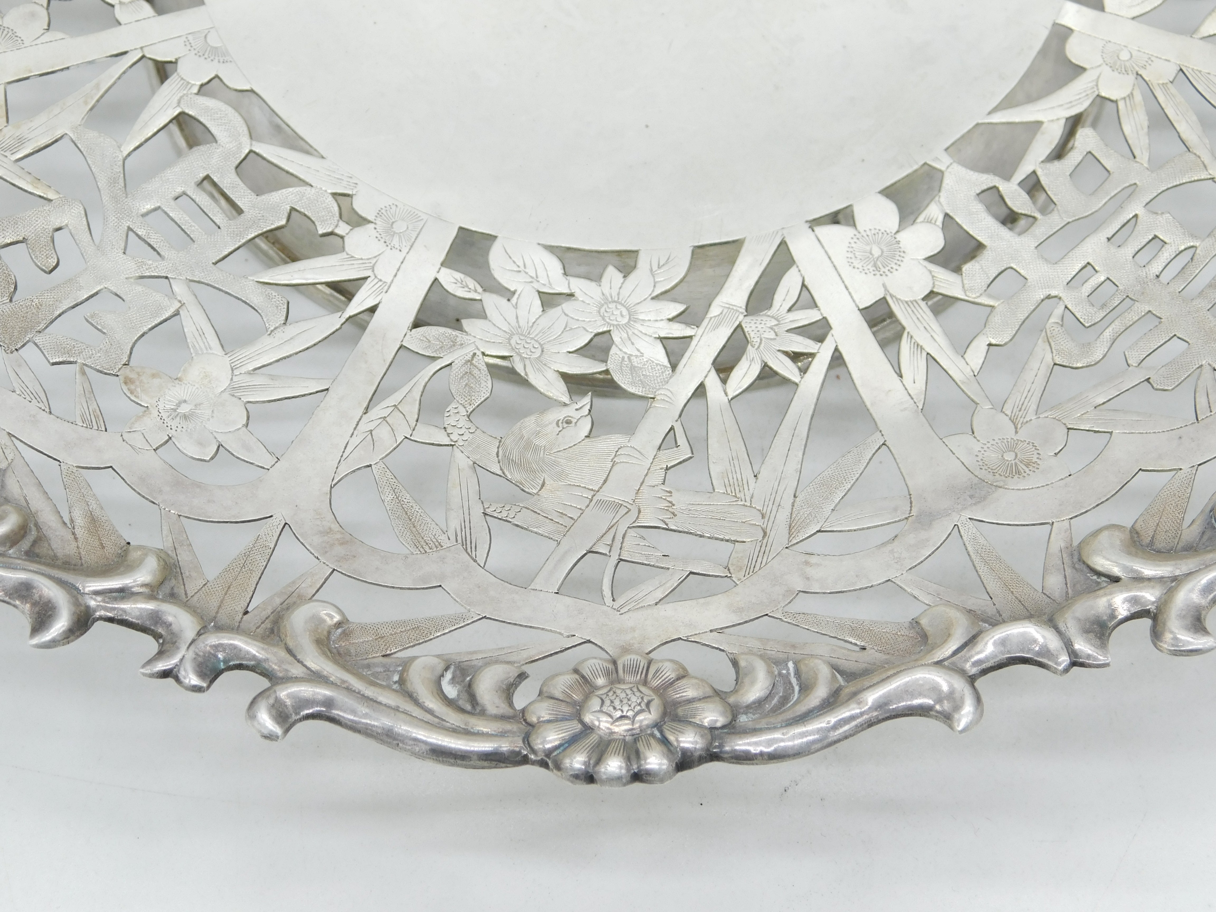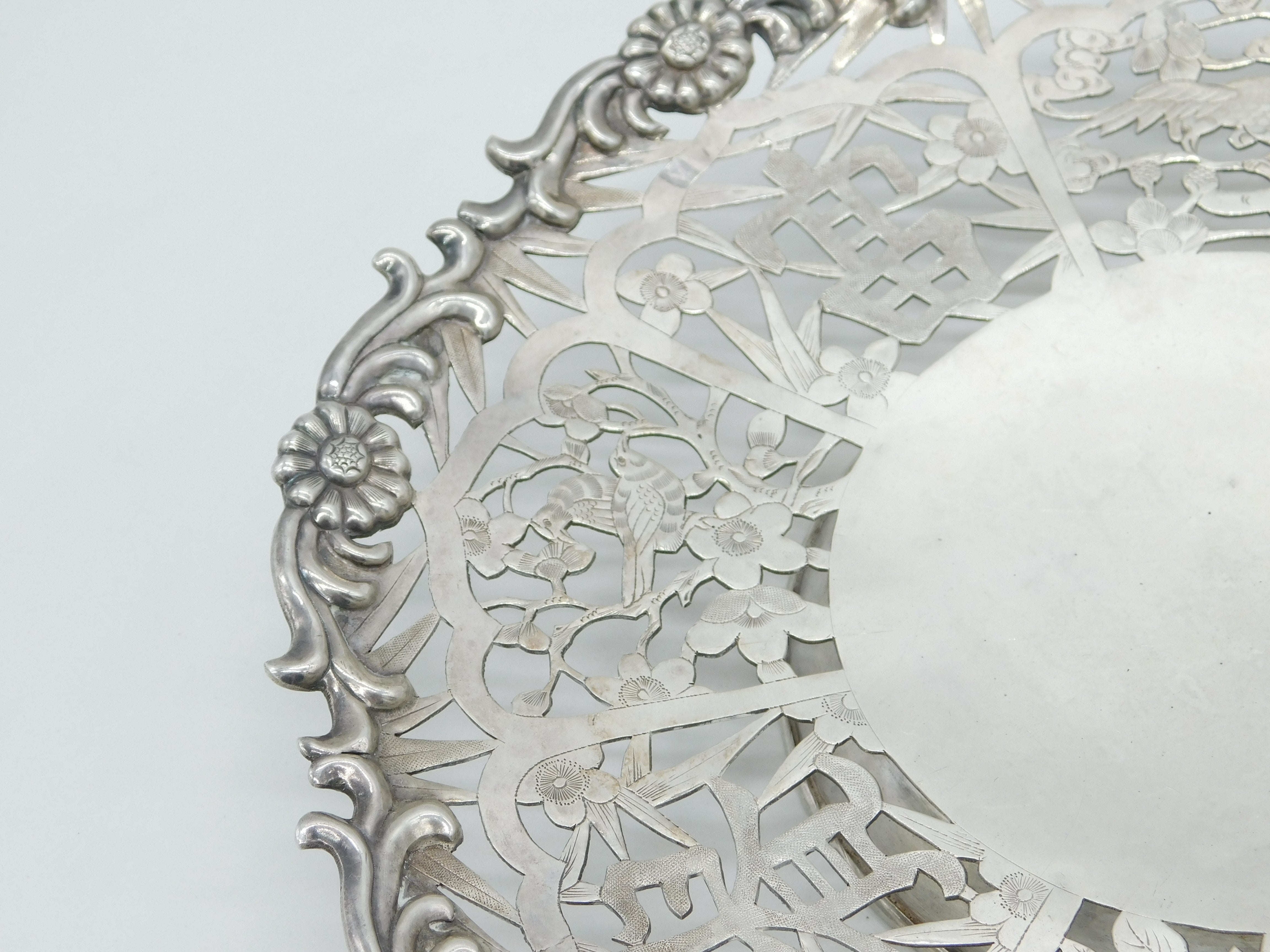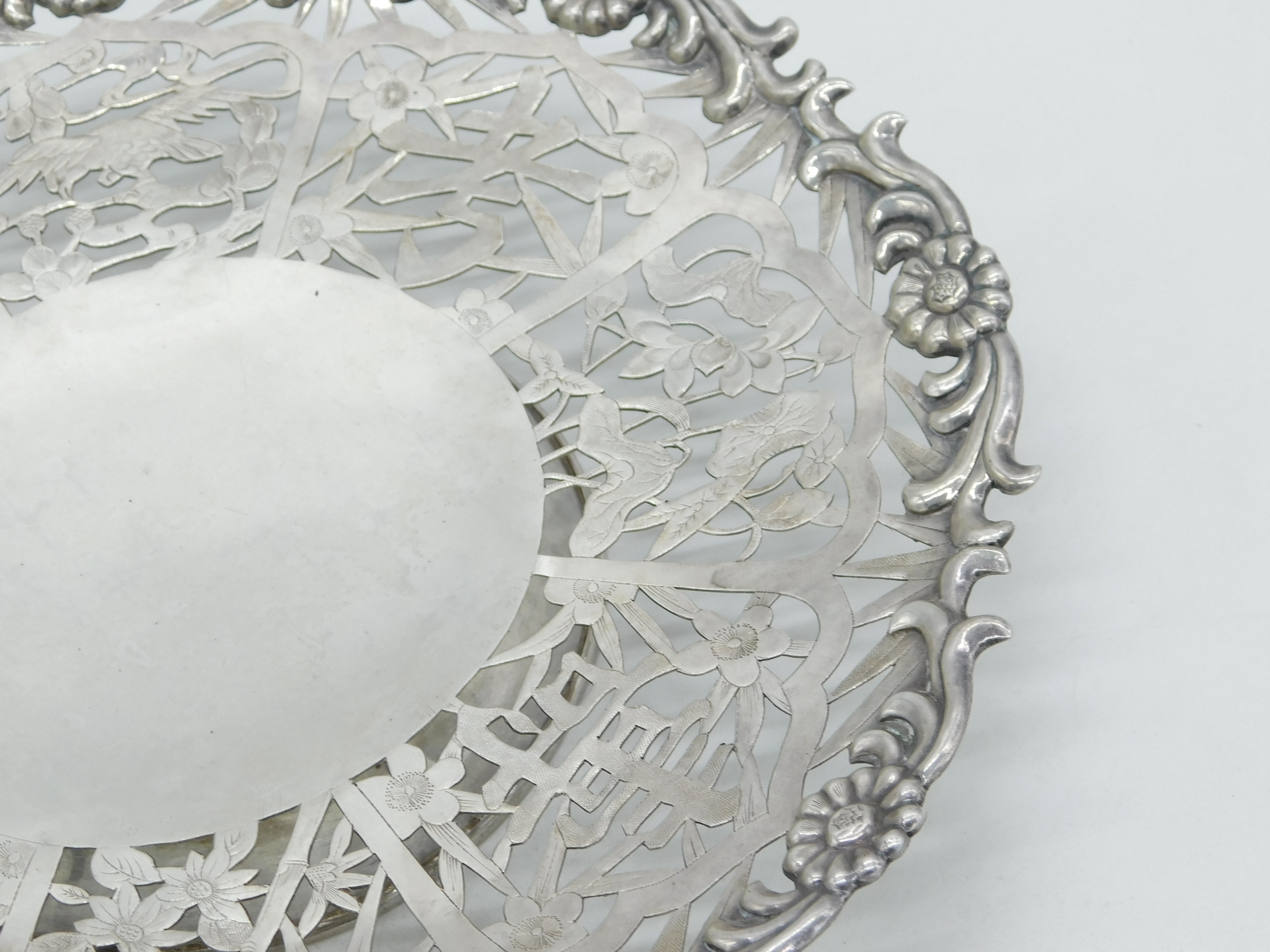 Chinese Export Sterling Silver Flower & Bird Pattern Salver Dish Antique c1930