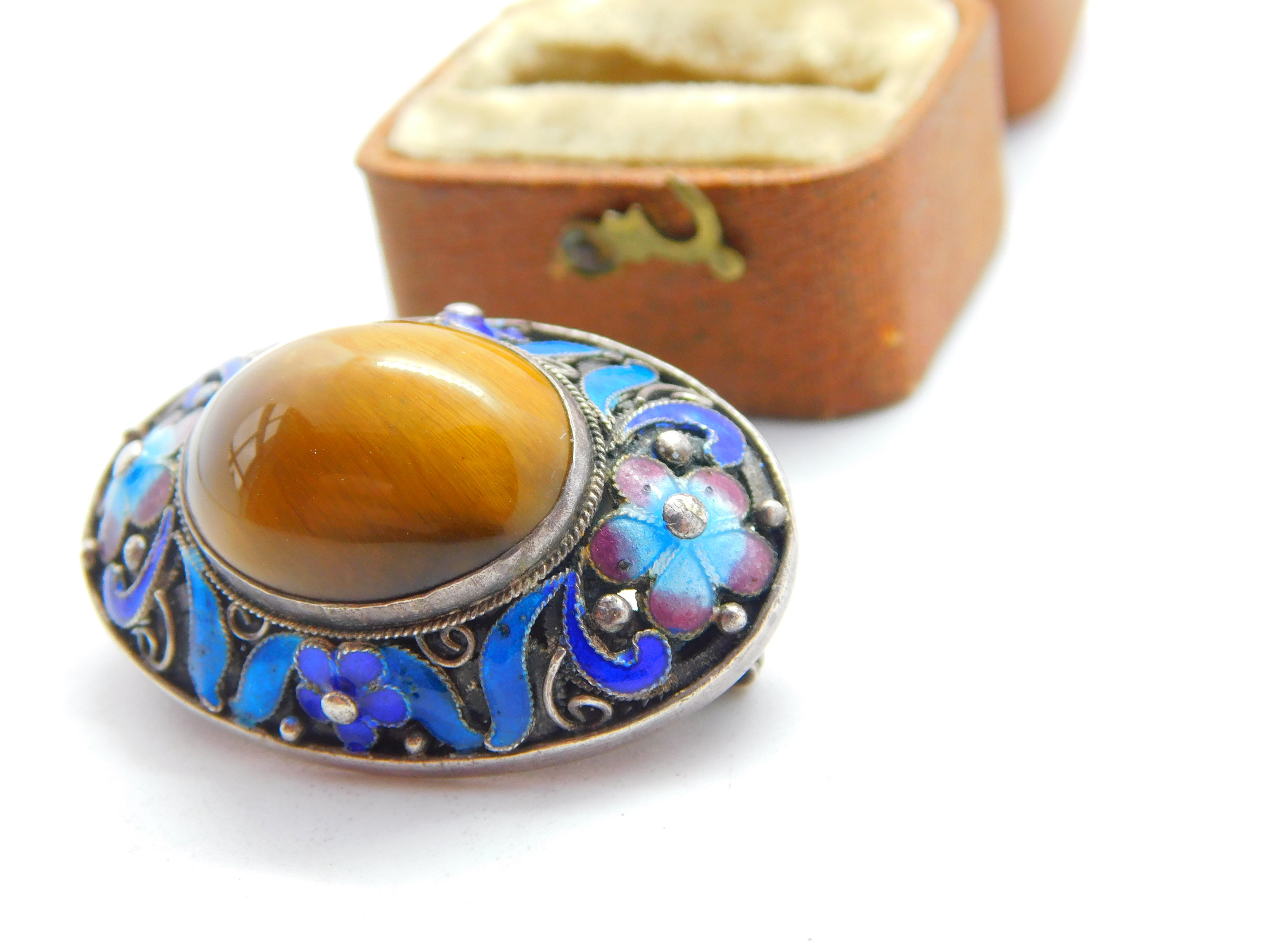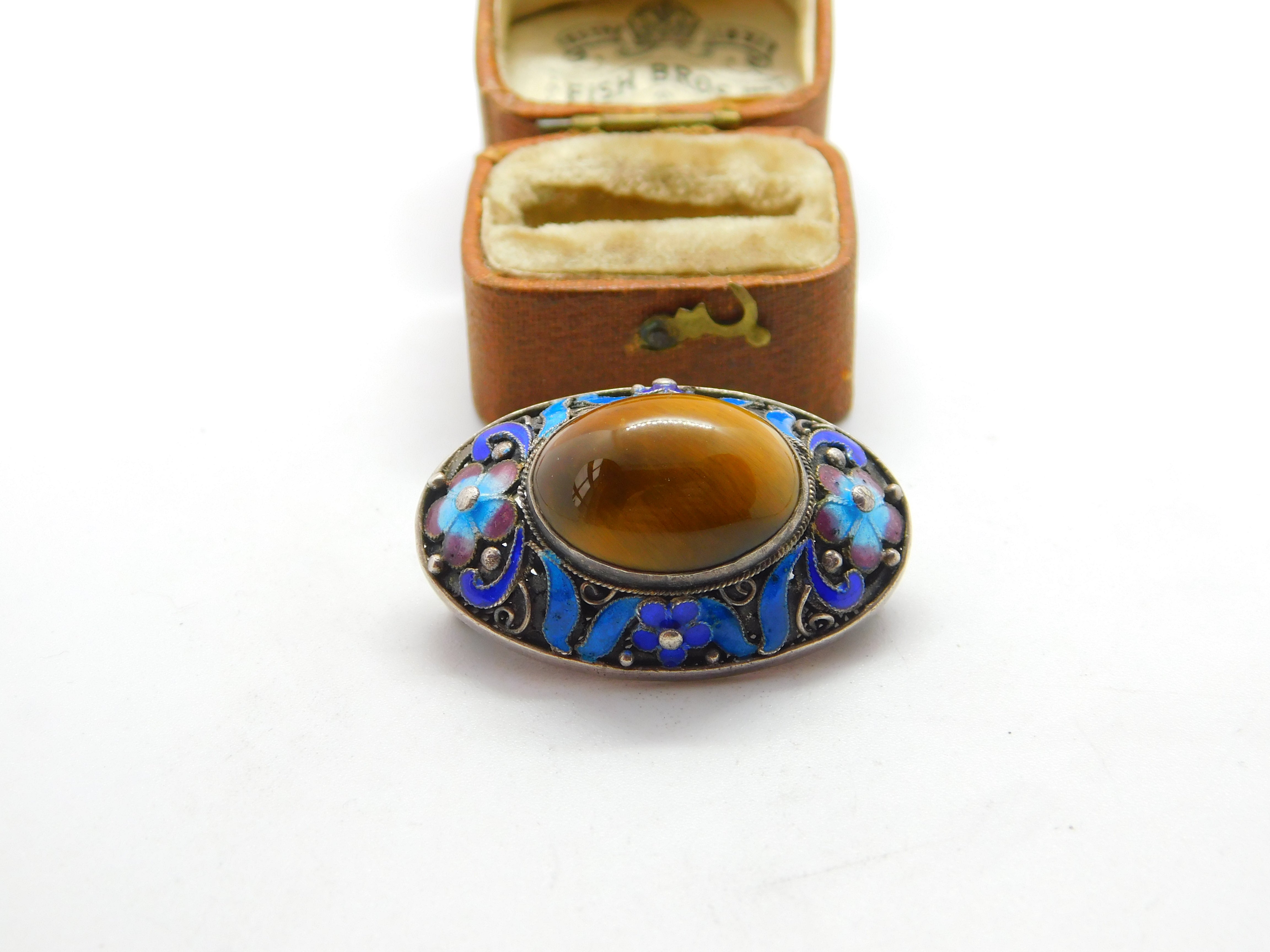 Chinese Sterling Silver, Enamel & Tiger's Eye Cabochon Brooch c1940 Antique